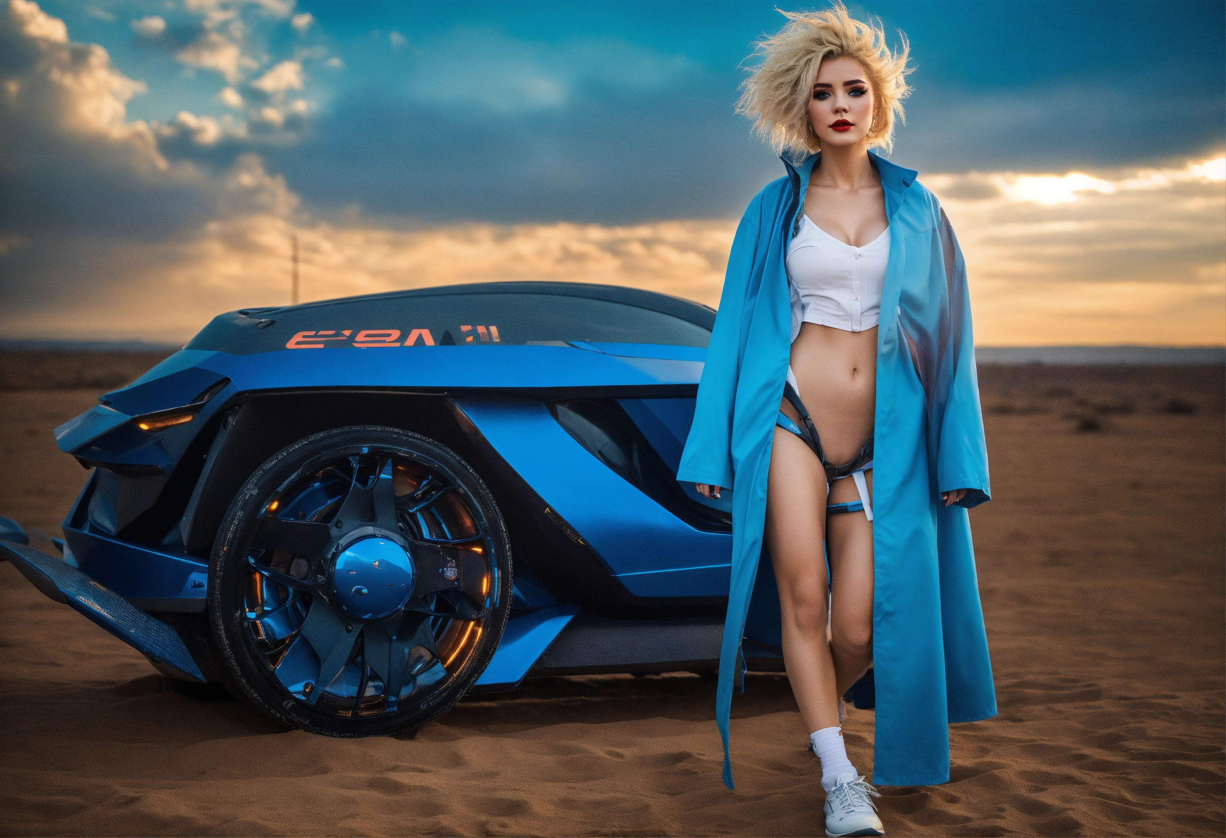 Full body, photo, sci-fi dream girl, futuristic, sunny weather, open shirt, wearing underwaee, 8k, extreme make-up, blue, blond, wild hair