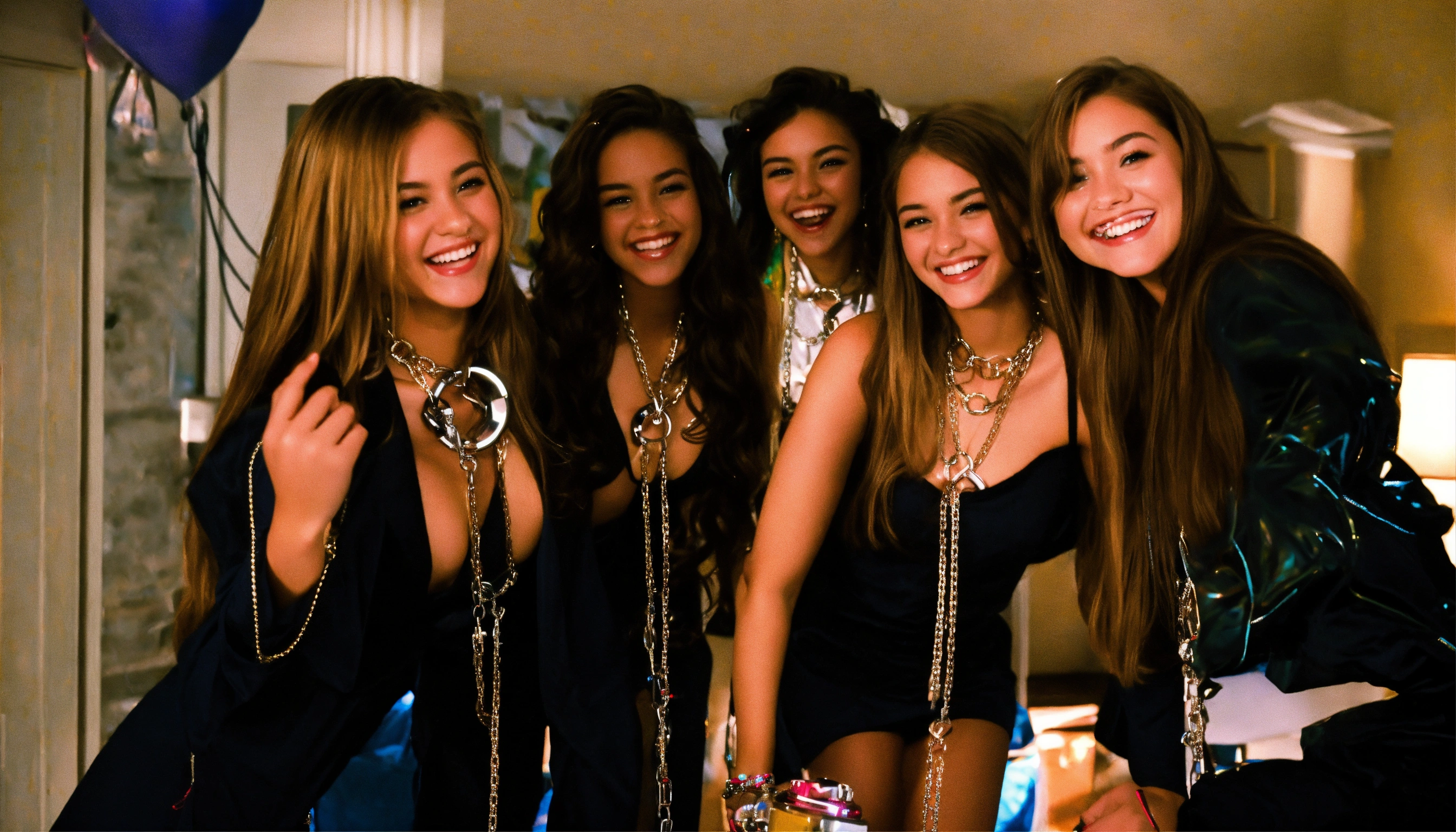 Group gang, caucasian, female, age 19, college dorm room, tight shiny suits, smiling, laughing, holding cameras, taking photos, cameras, photo shoot, holding chrome chains