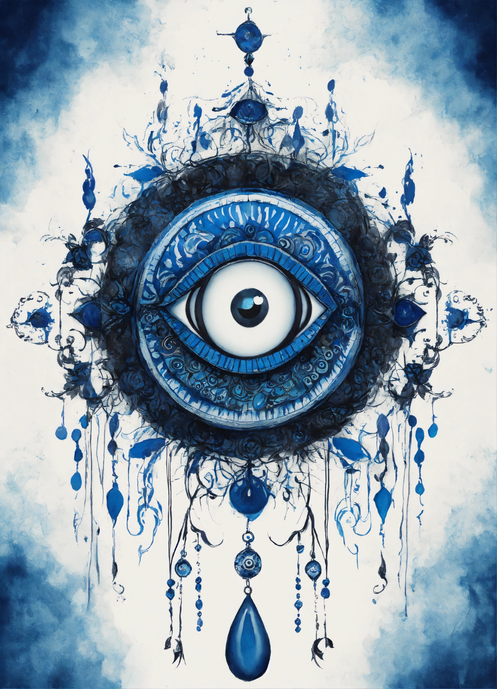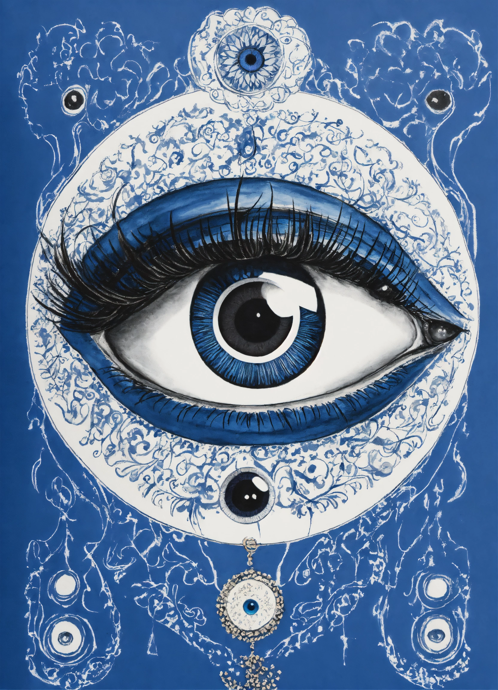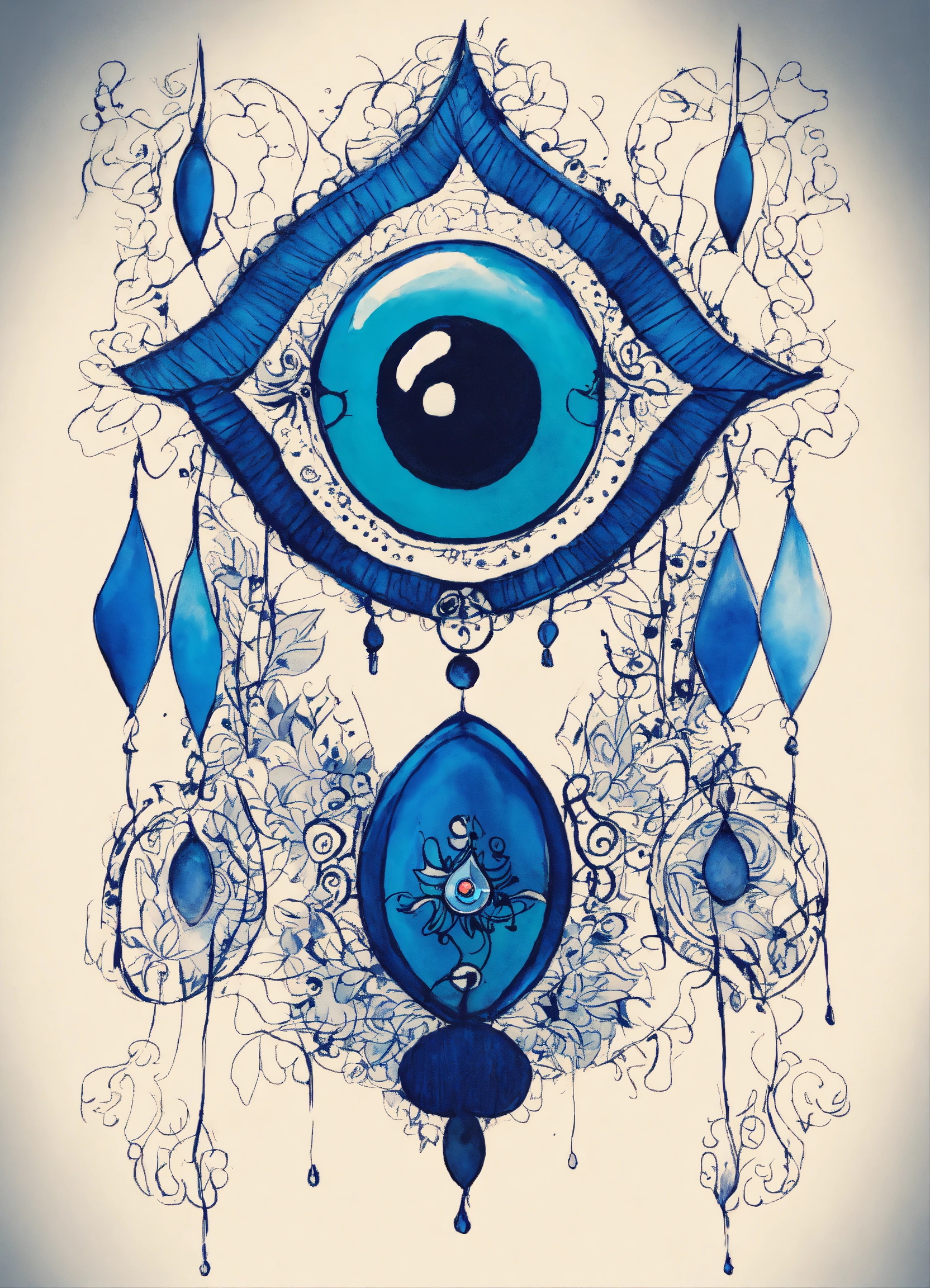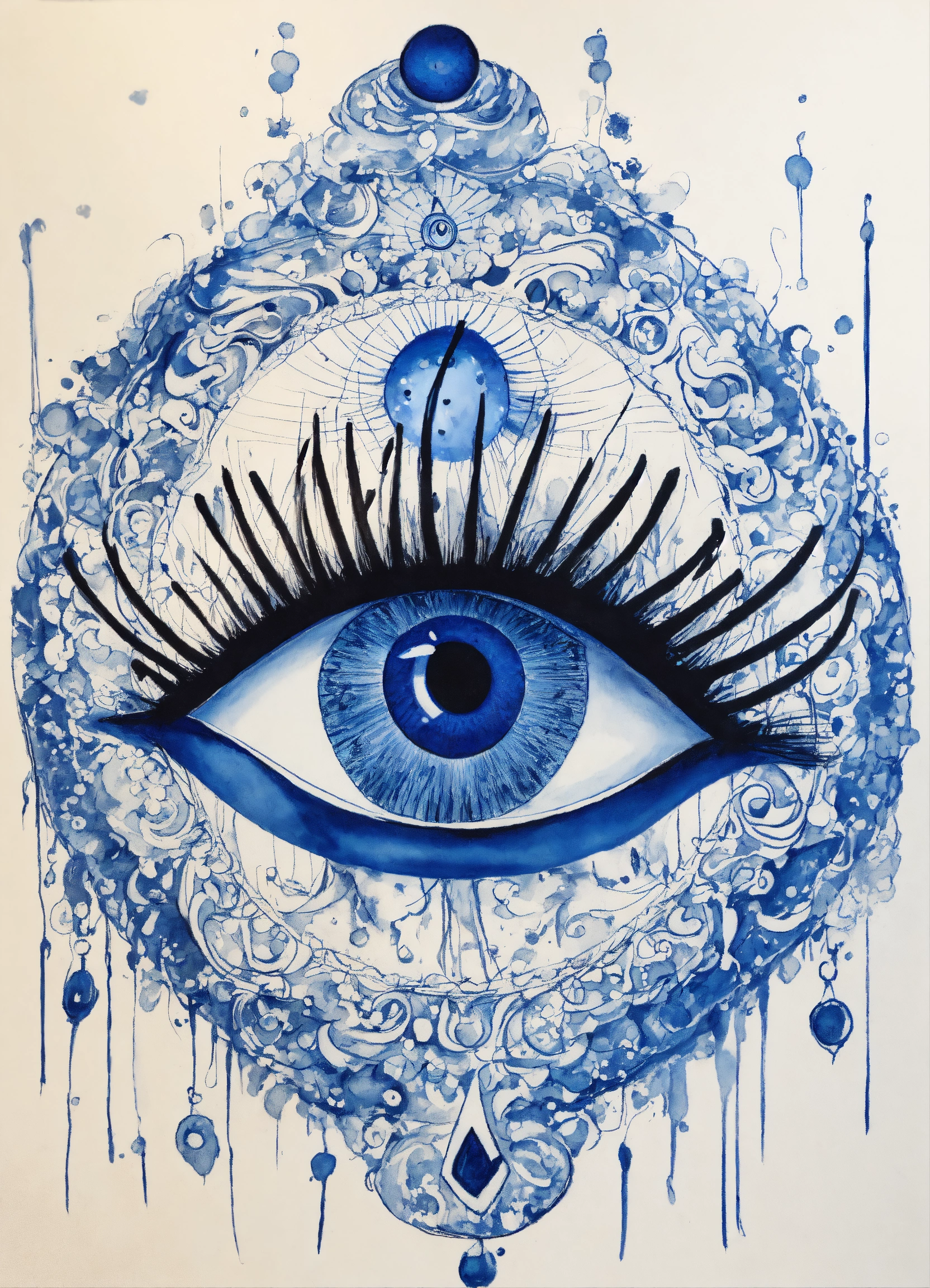 Ink drawing of illustrative image of evil eye (blue) with pronounced eye lashes symbol, white background