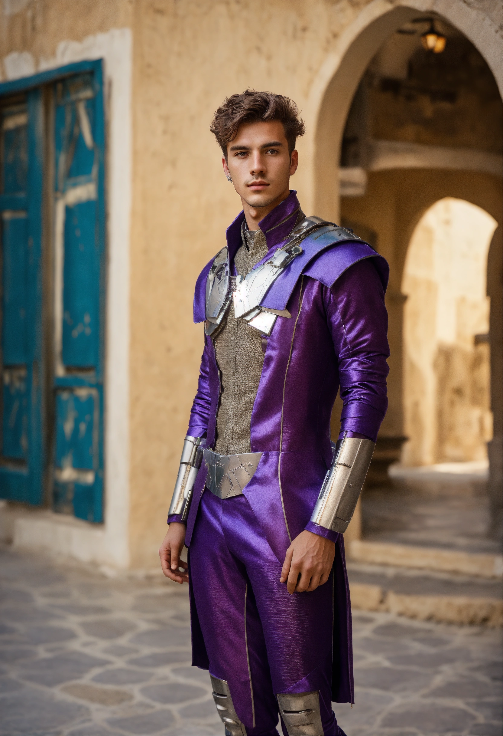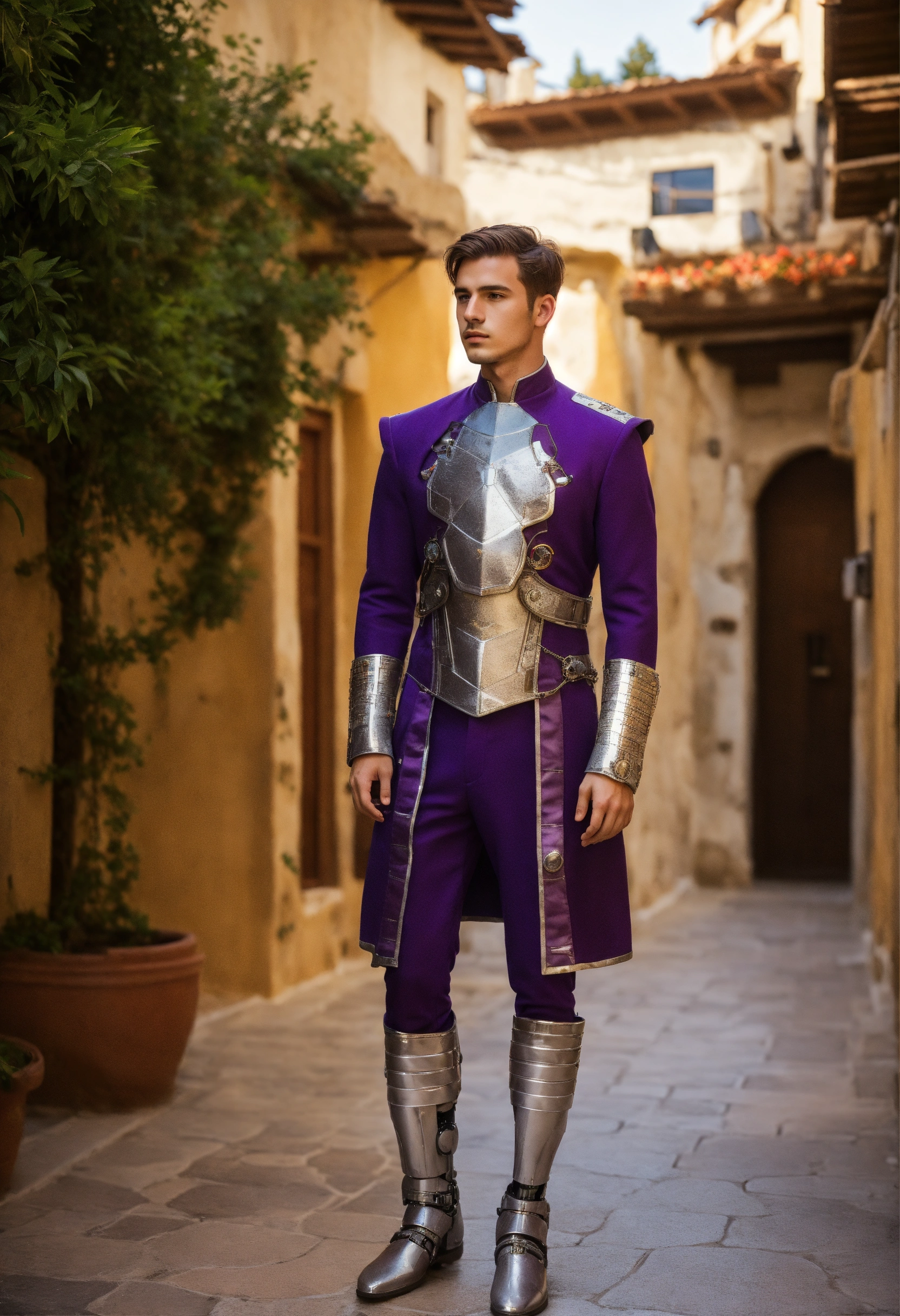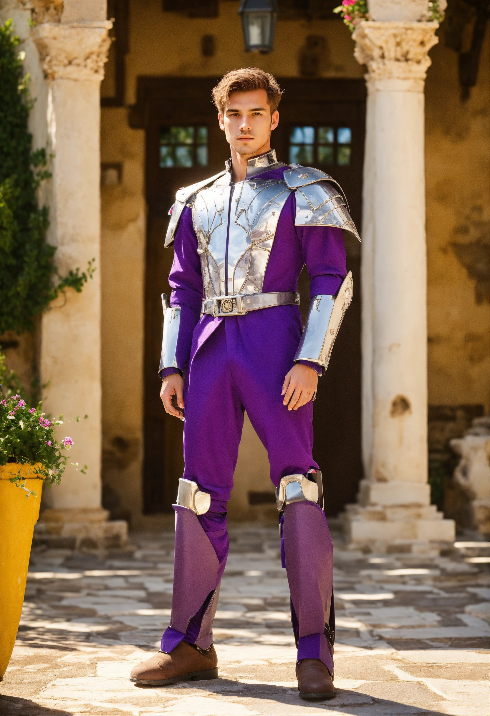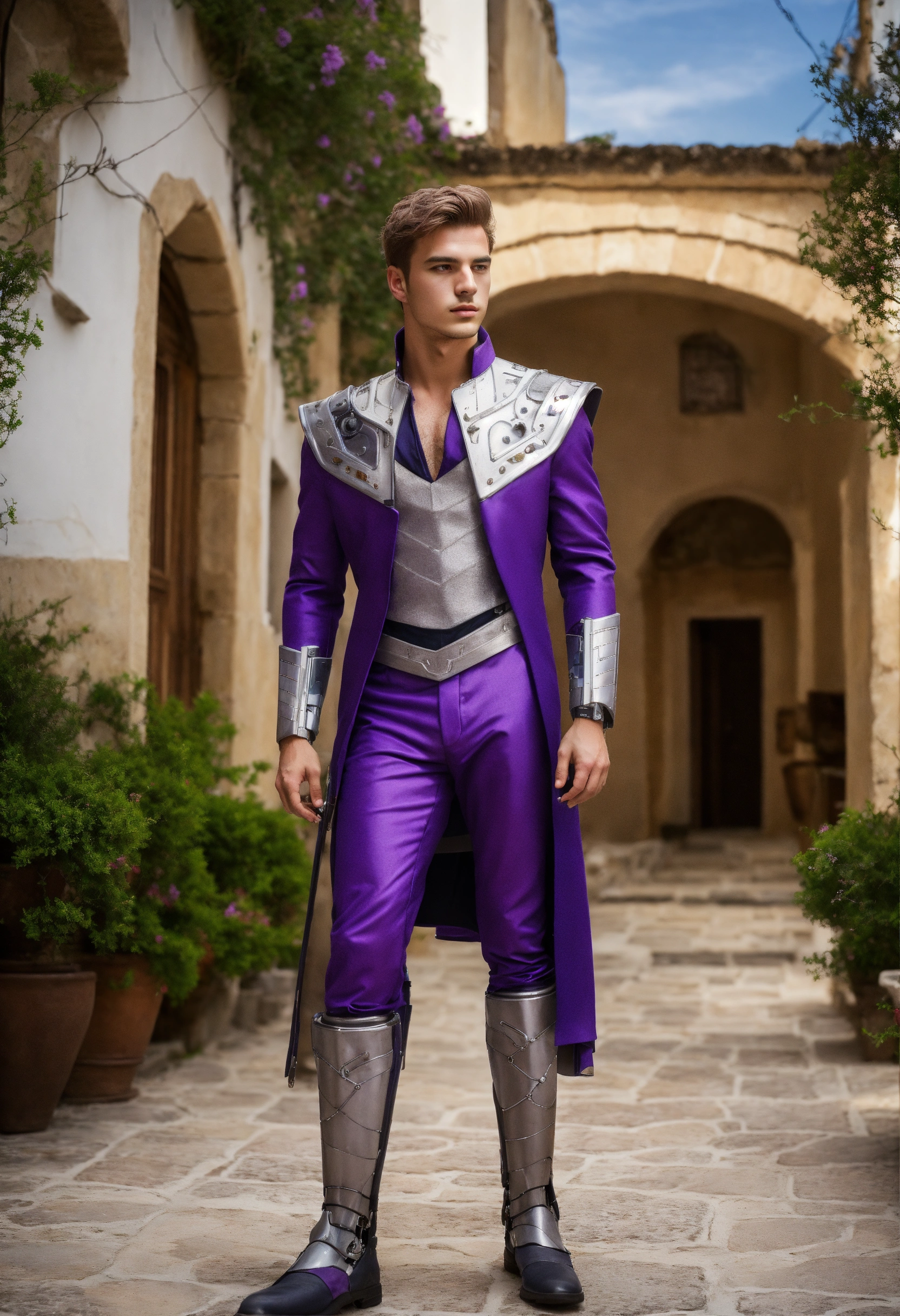 Full body image of an aristocratic sci fi man, cybernetic, royalty, purple and silver outfit, light brown hair, standing in a courtyard on a summer day in greece, male, 22 years old, full body