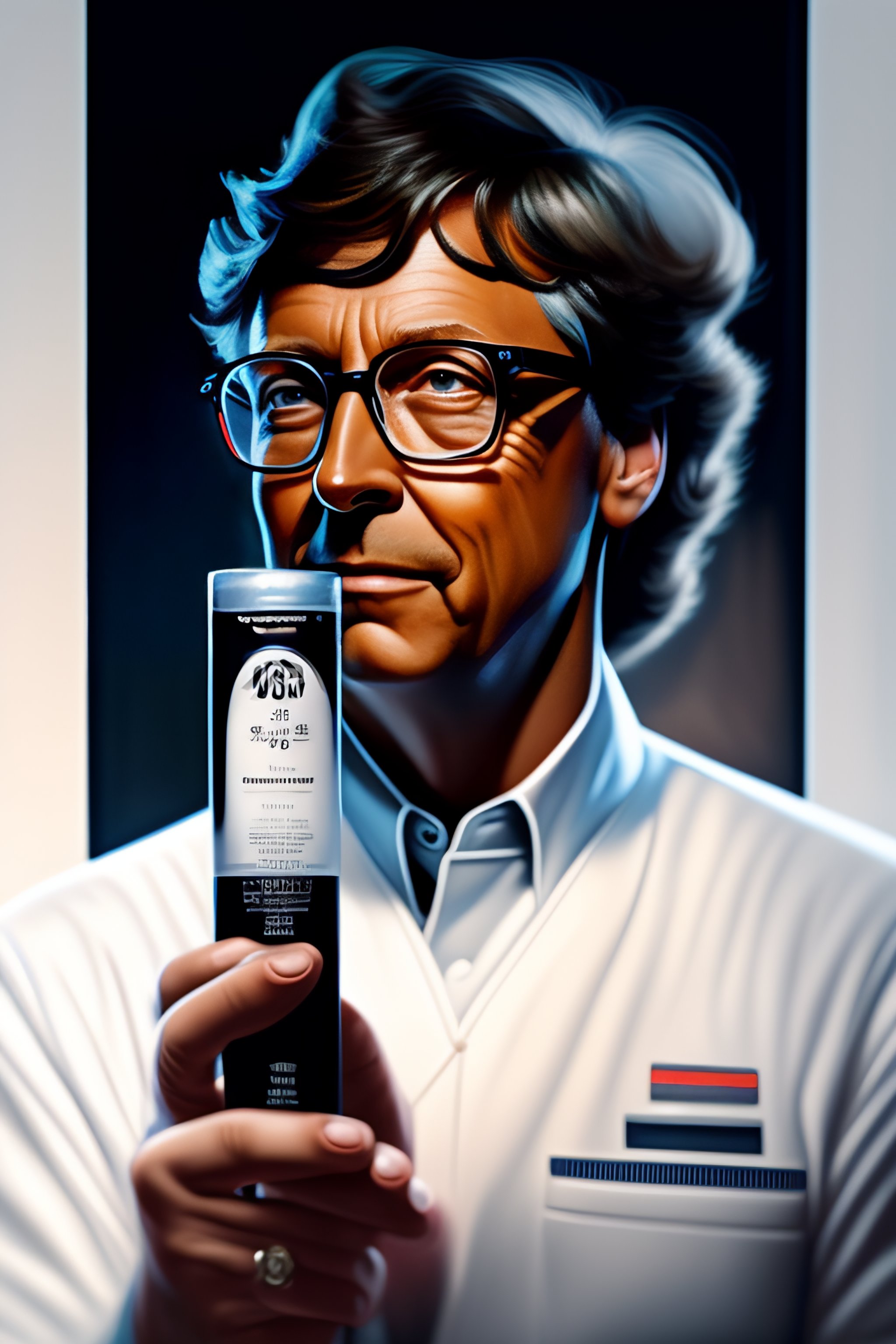 Portrait of bill gates holding a syringe, they live alien, john carpenter, obey venom intricate, waist to top, highly detailed, digital painting, artstation, concept art, smooth, sharp focus, illustration, art by artgerm and greg rutkowski