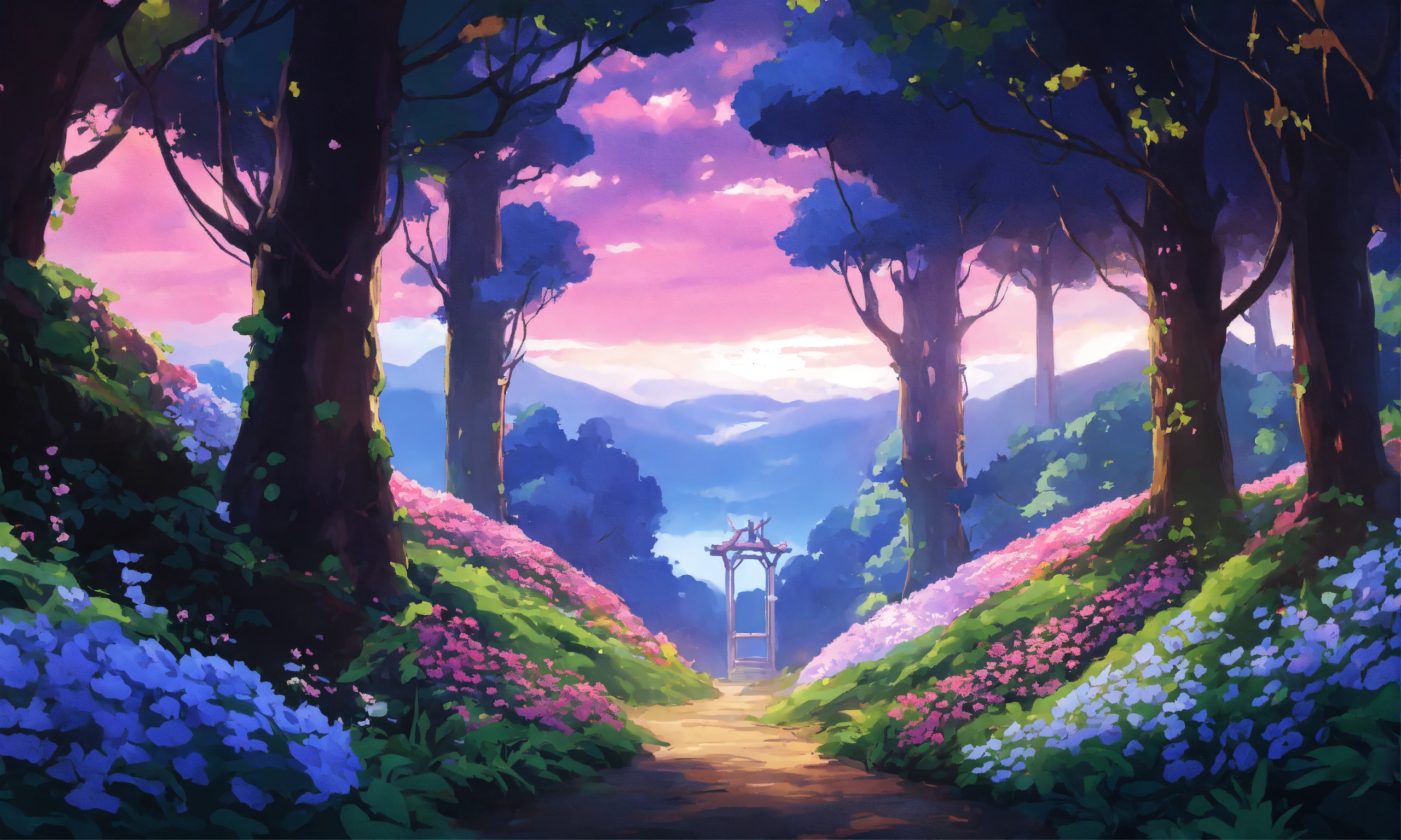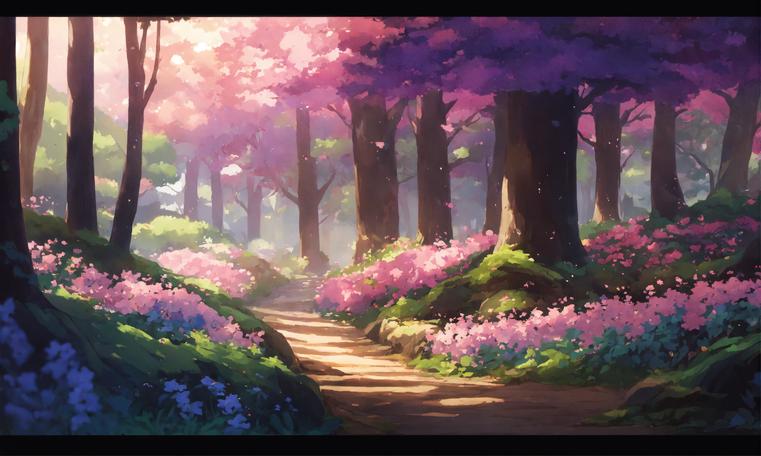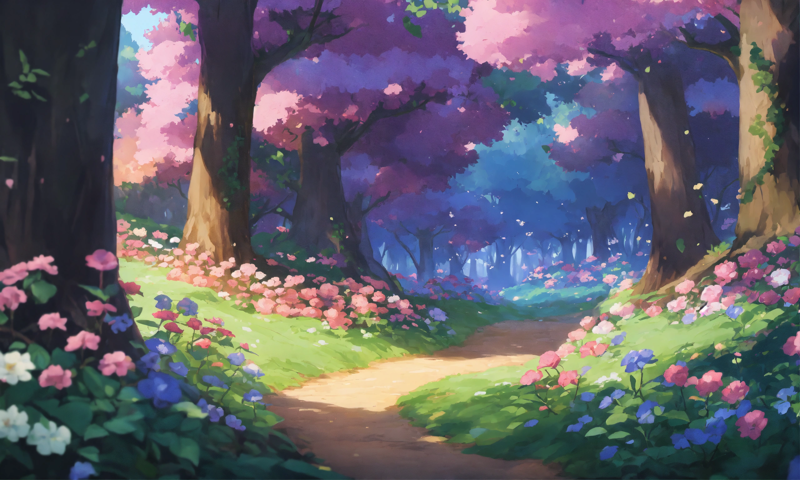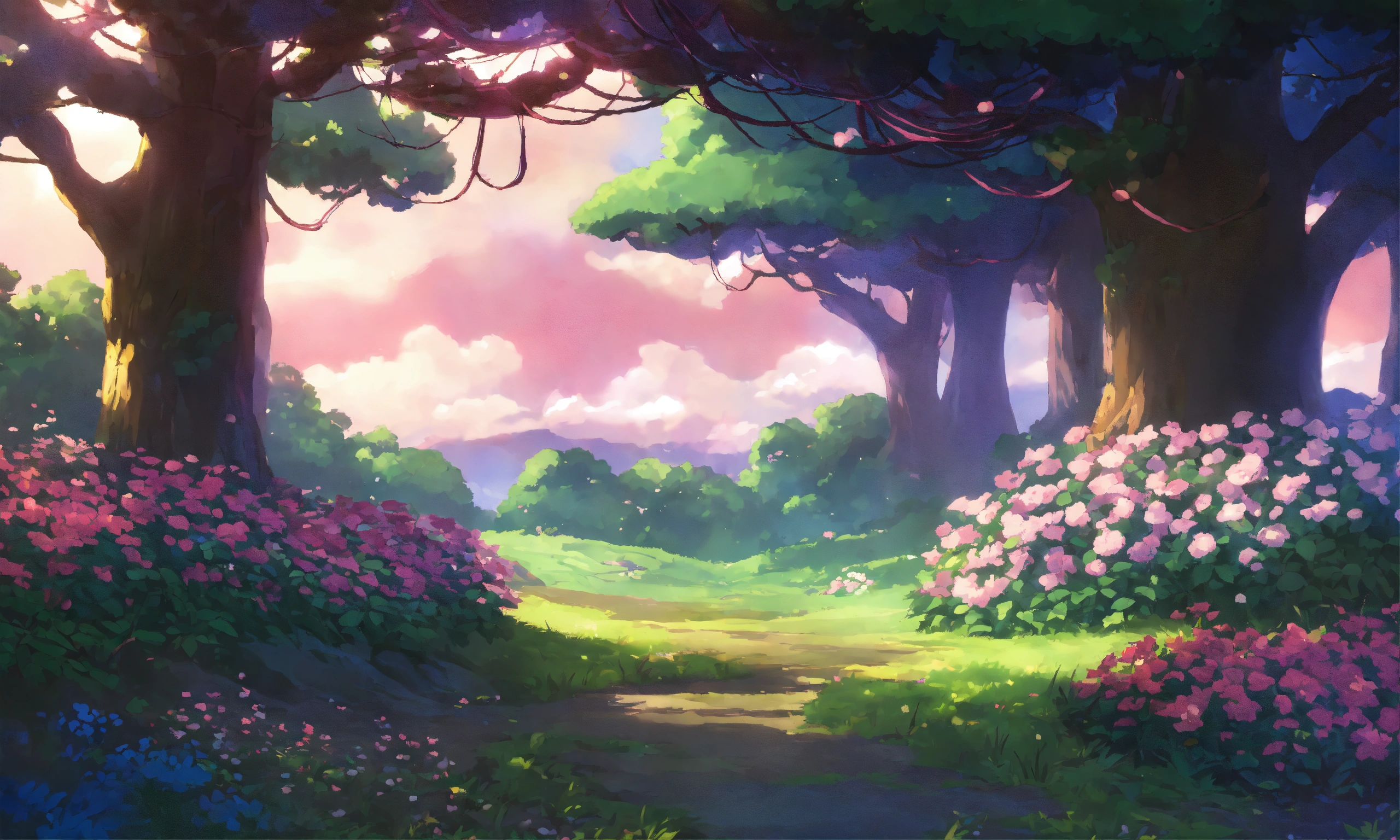 Pokémon scenery, dark forest with pink/purple/white flowers, vines, beautiful landscape, anime/studio ghibli inspired.