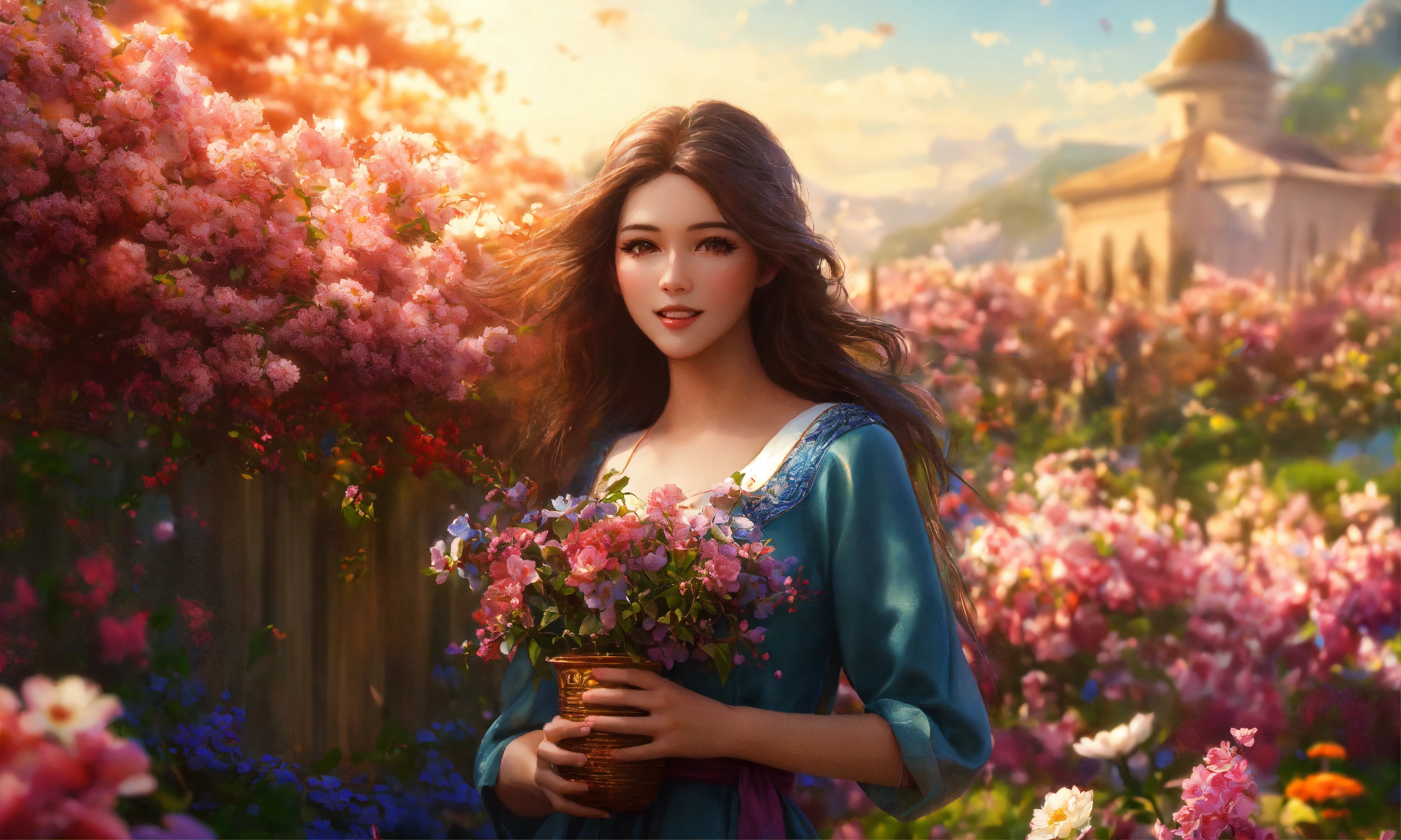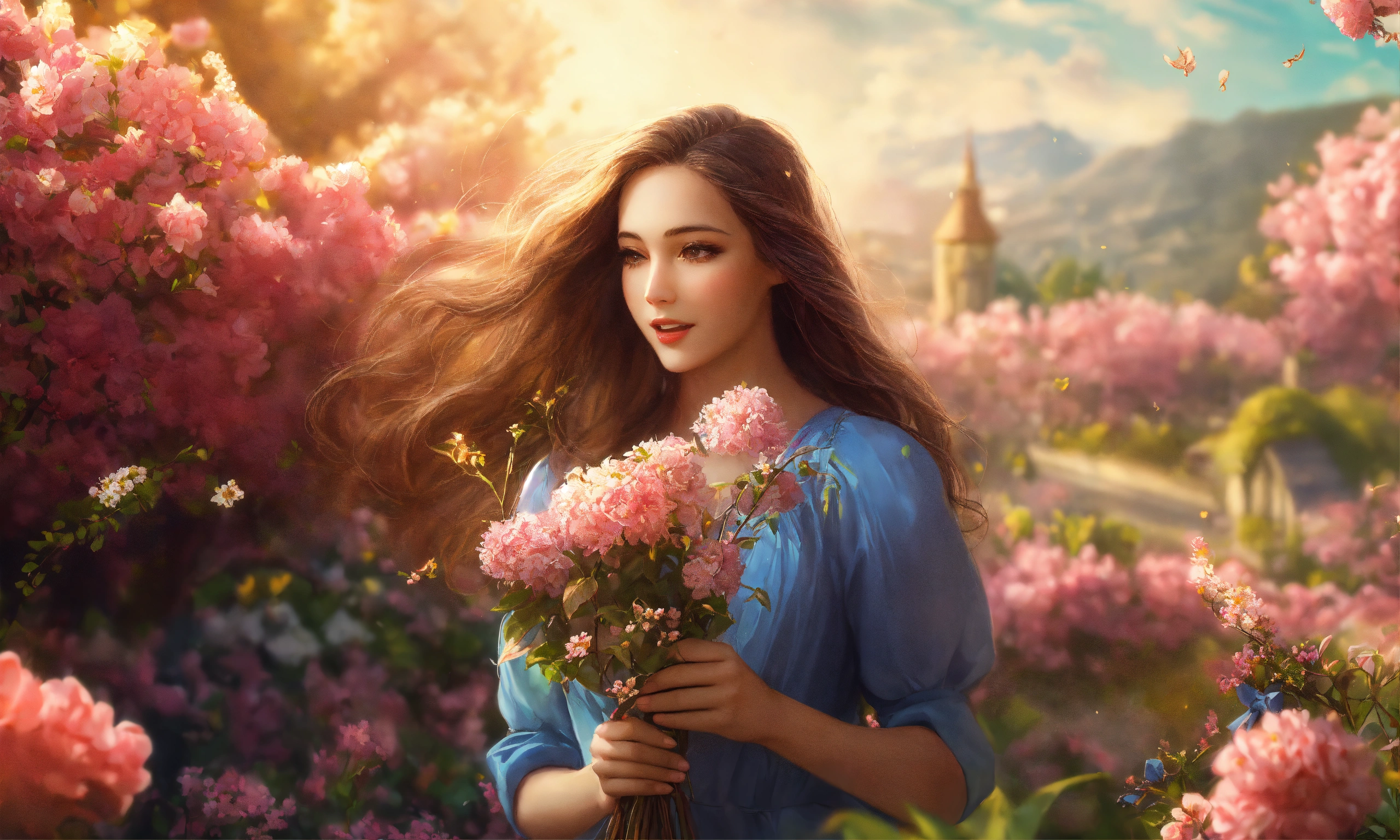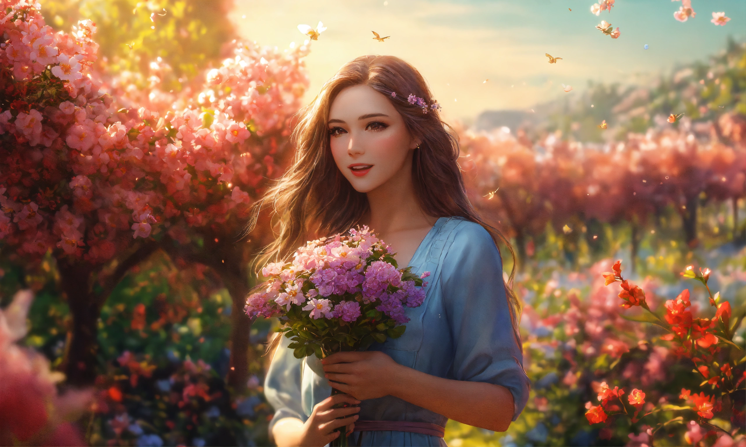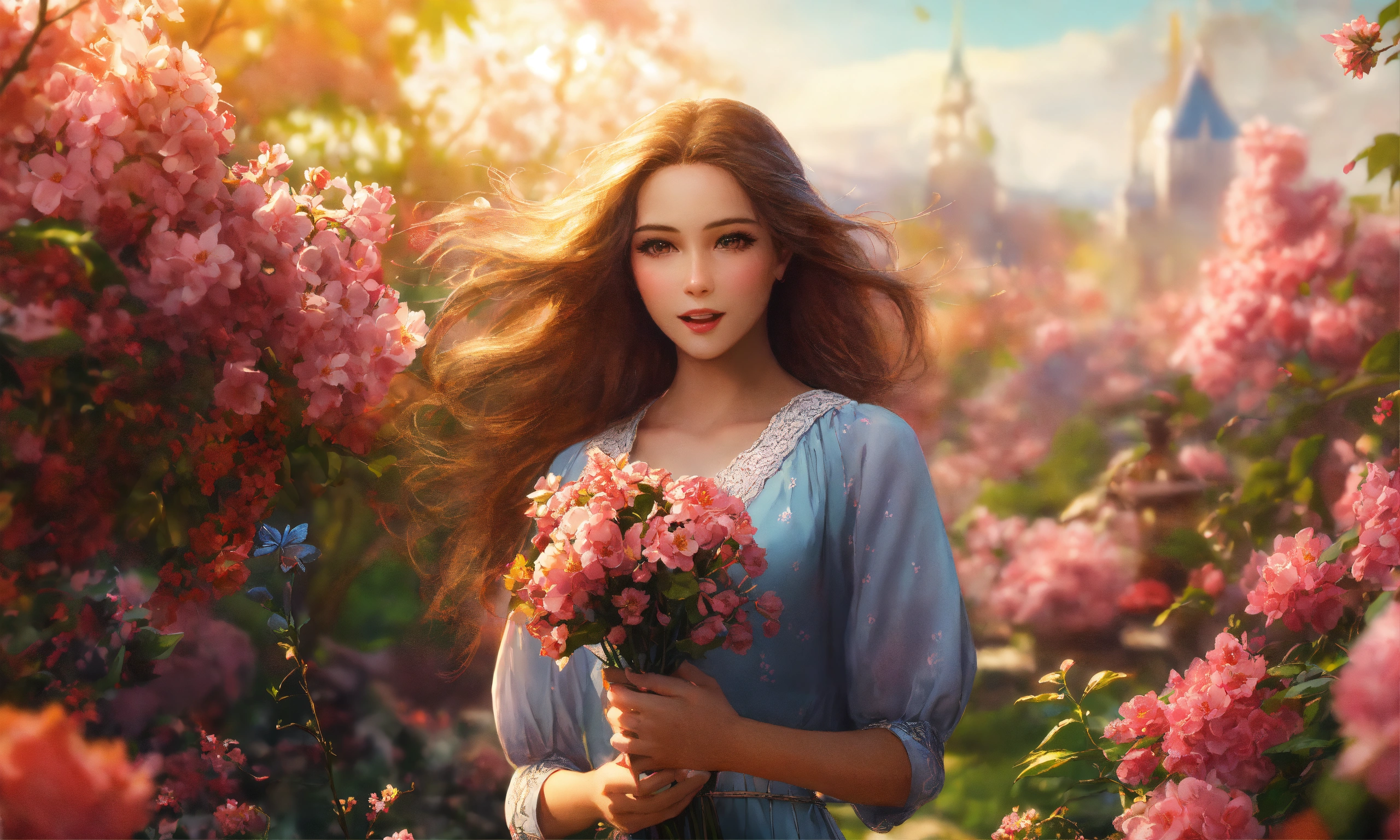 A beautiful girl with long hair in a flowering garden, happily surprise expression, fantasy, high detail, realistic photo, high detail, digital painting, cinematic, stunning, hyper-realistic, sharp focus, high resolution 8k, insanely detailed