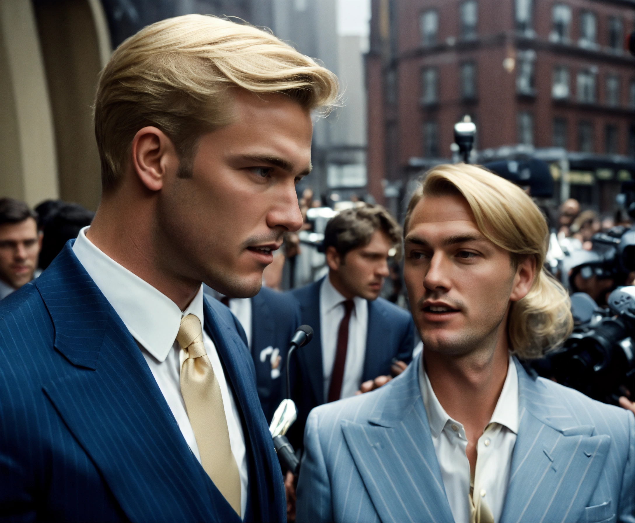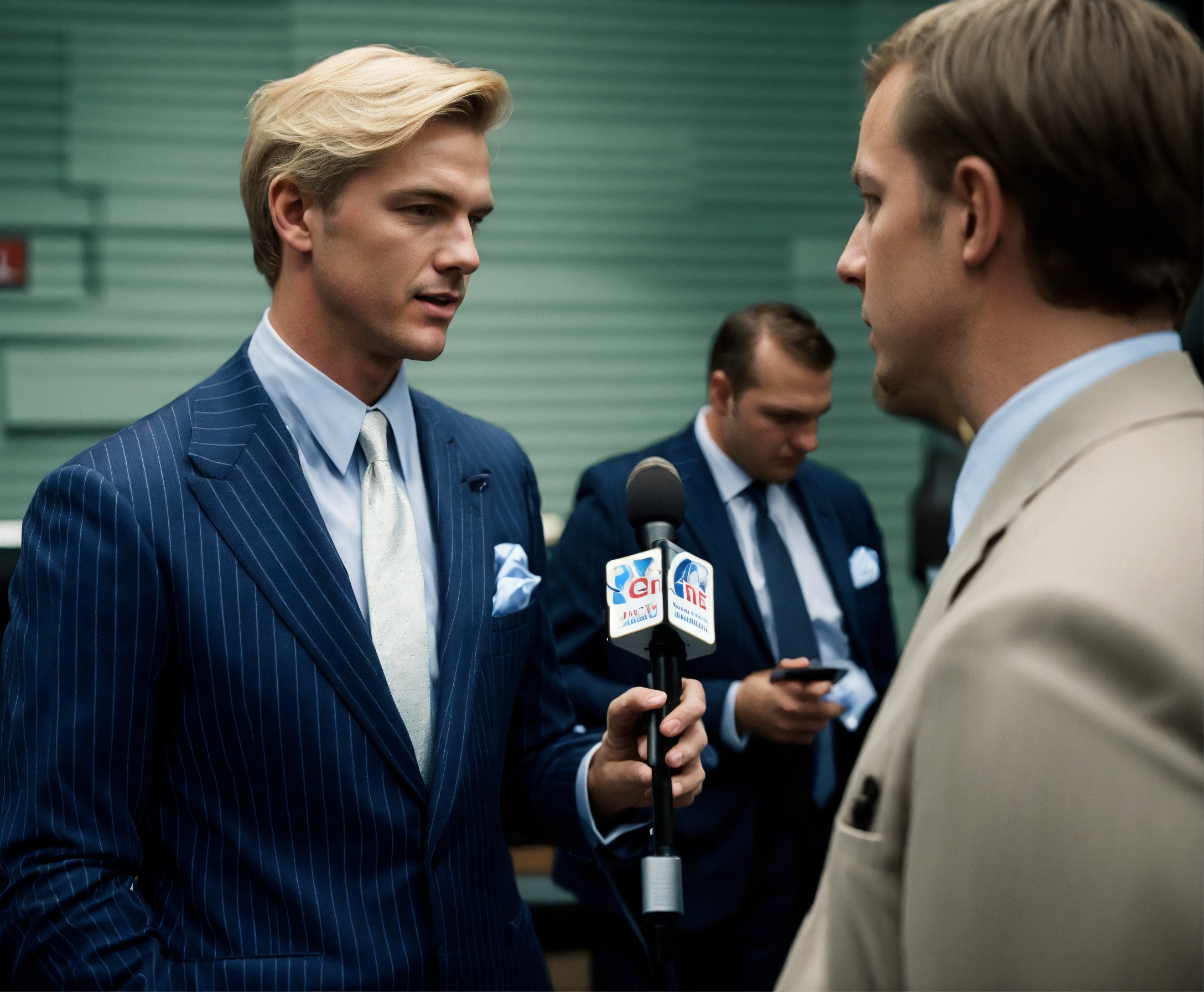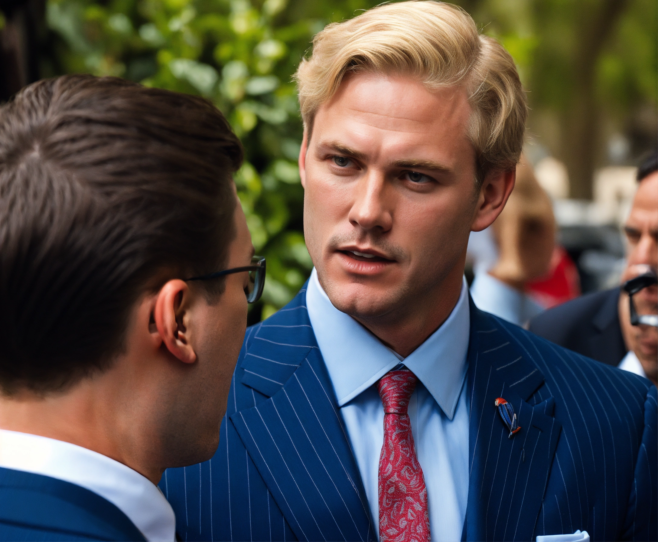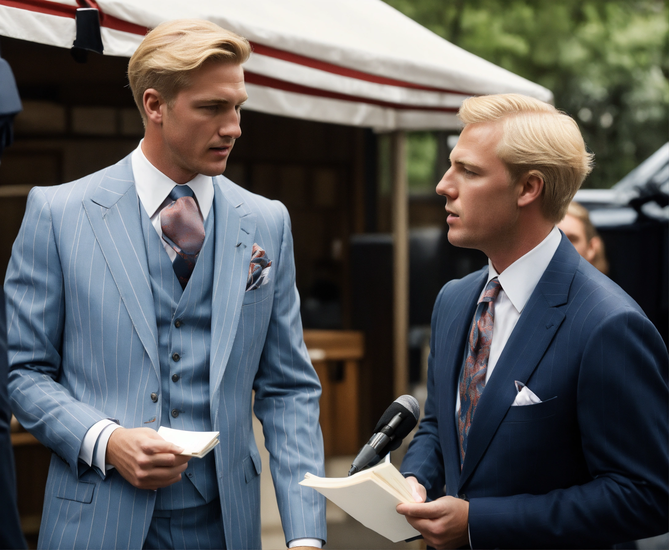 A blonde gentleman in pale blue pinstripe vested suit and tie