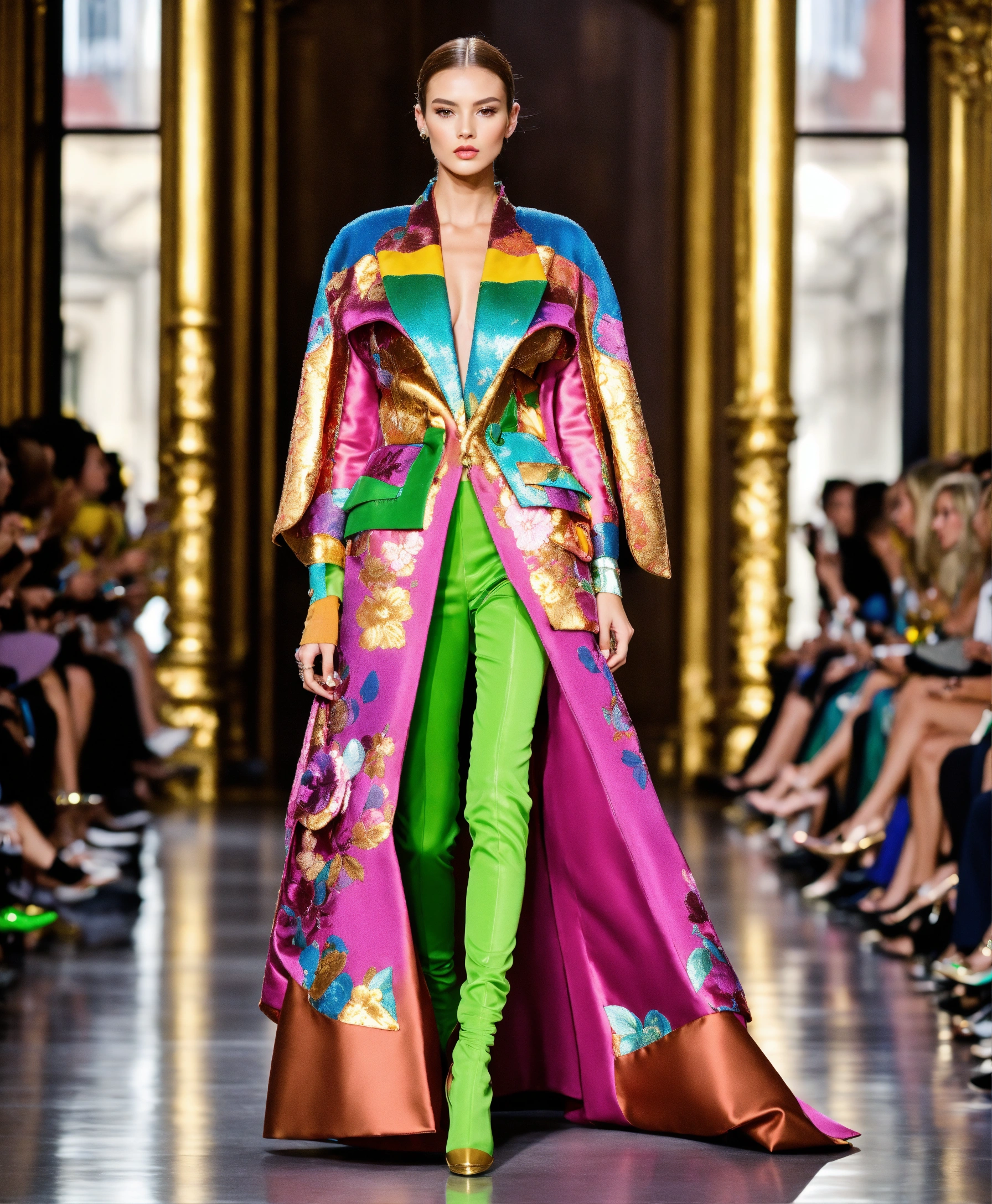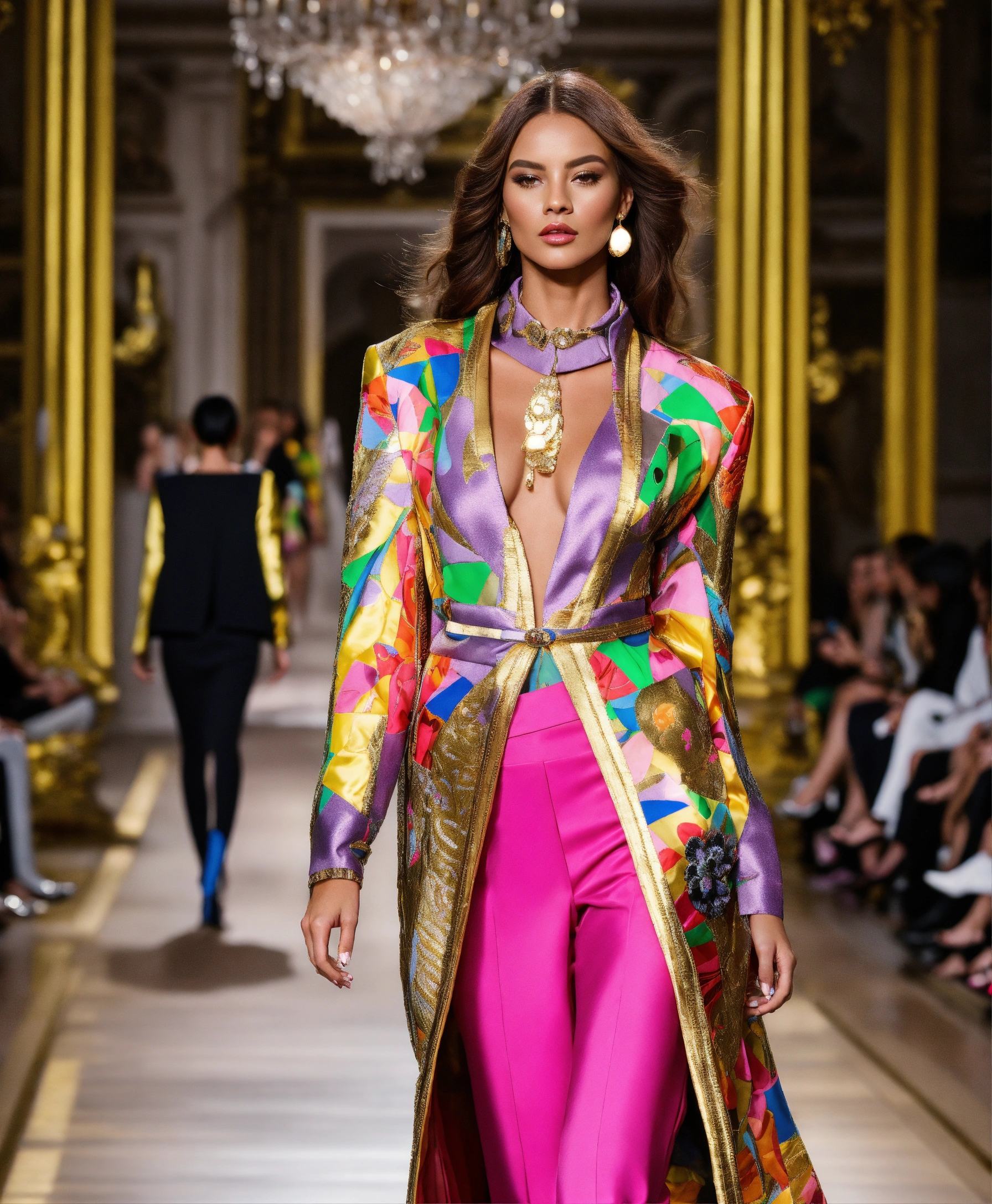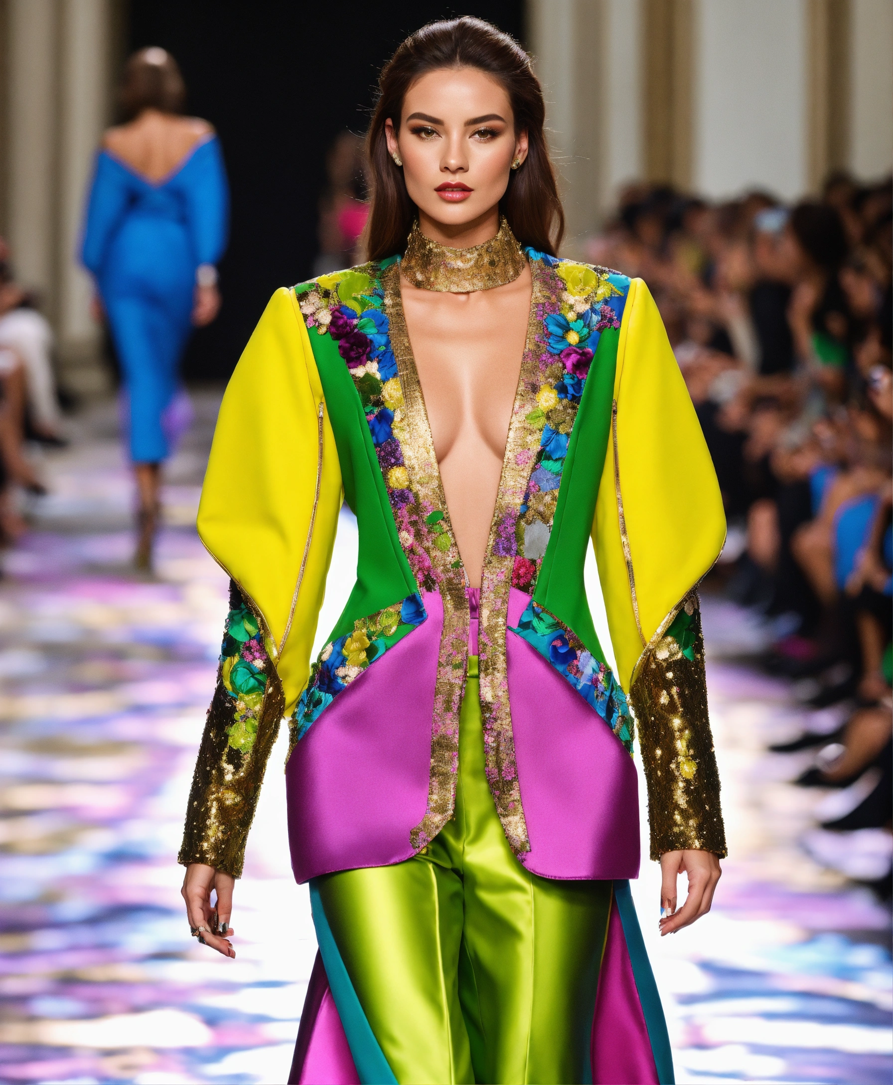 Ultra realistic full body photo of a stylish edgy american model walking the runway modeling summer designer novelty interesting complex unusual street sporty classy modern dolman sleeve outfit brave, paris versailles details cutouts and and gold geometric pattern floral structured tailored jacket pink gold green lilac peridot silver magenta lime fuchsia yellow blue black gray copper mauve bronze haute couture ultimate elegance beautiful luxurious awesome appliques haute couture wealthy billionaire opulent majestic cutouts novelty resplendent magnificent sublime 12k