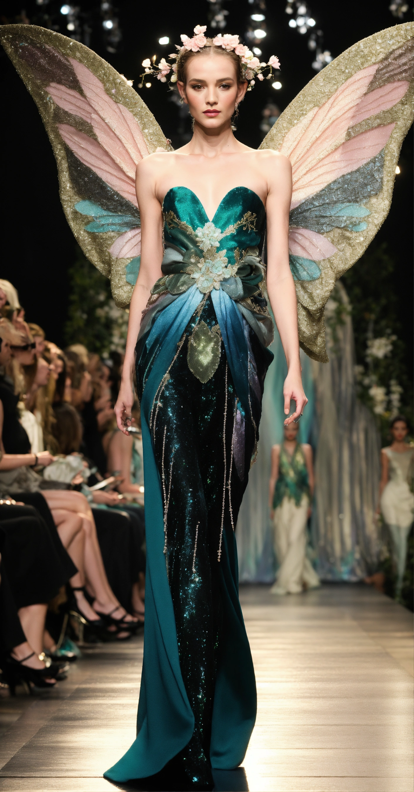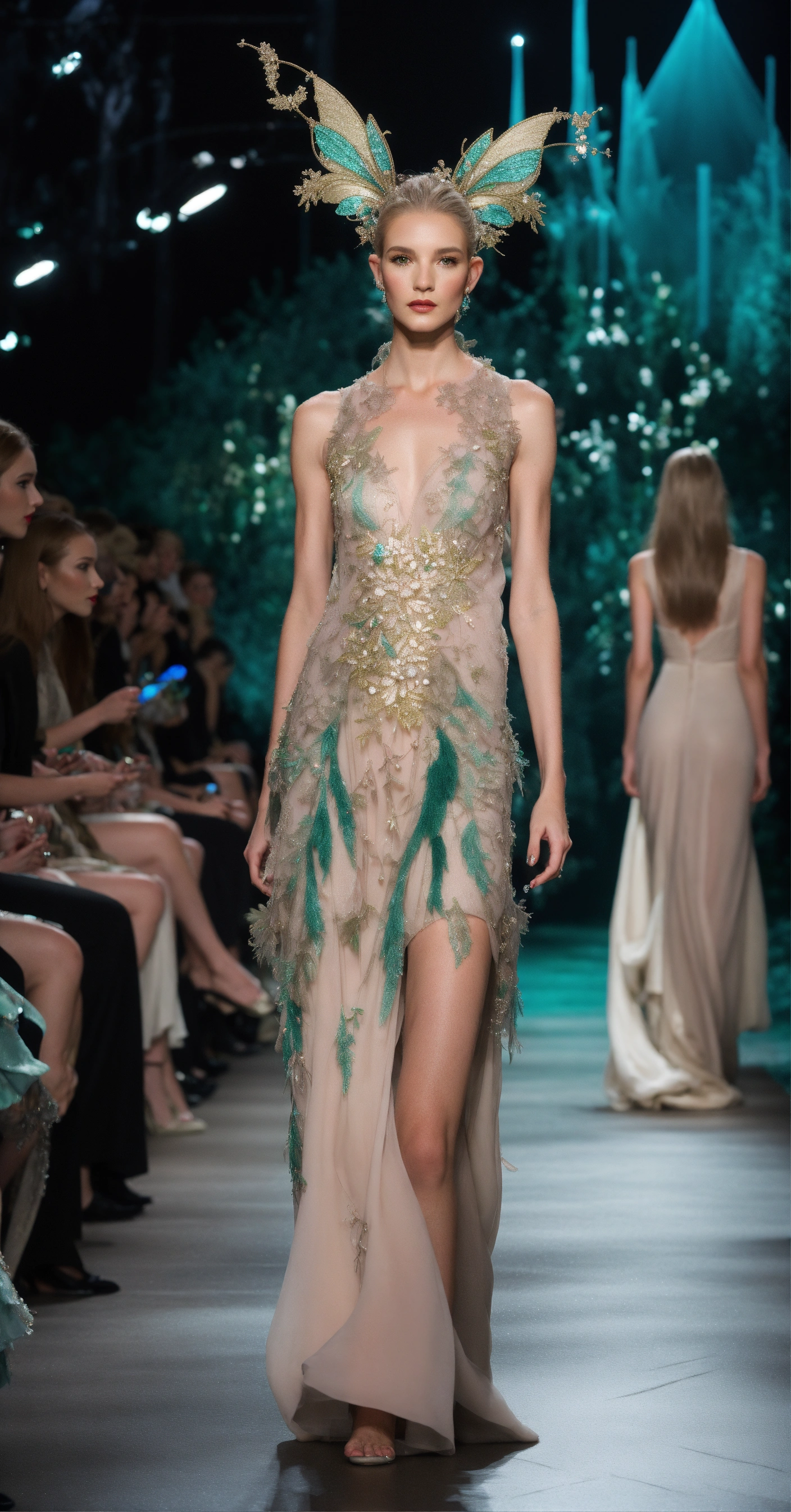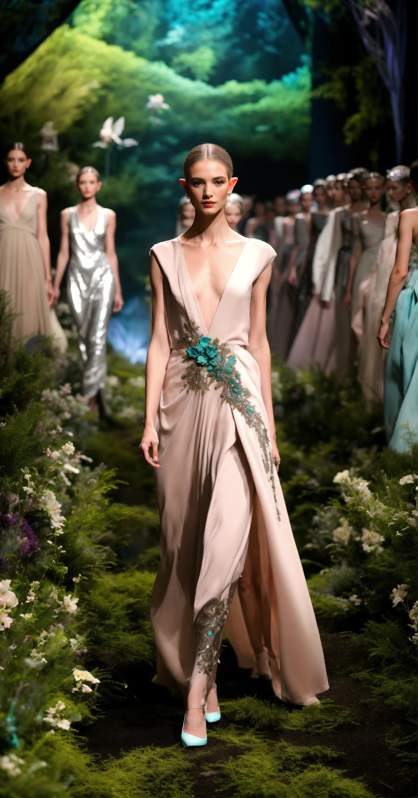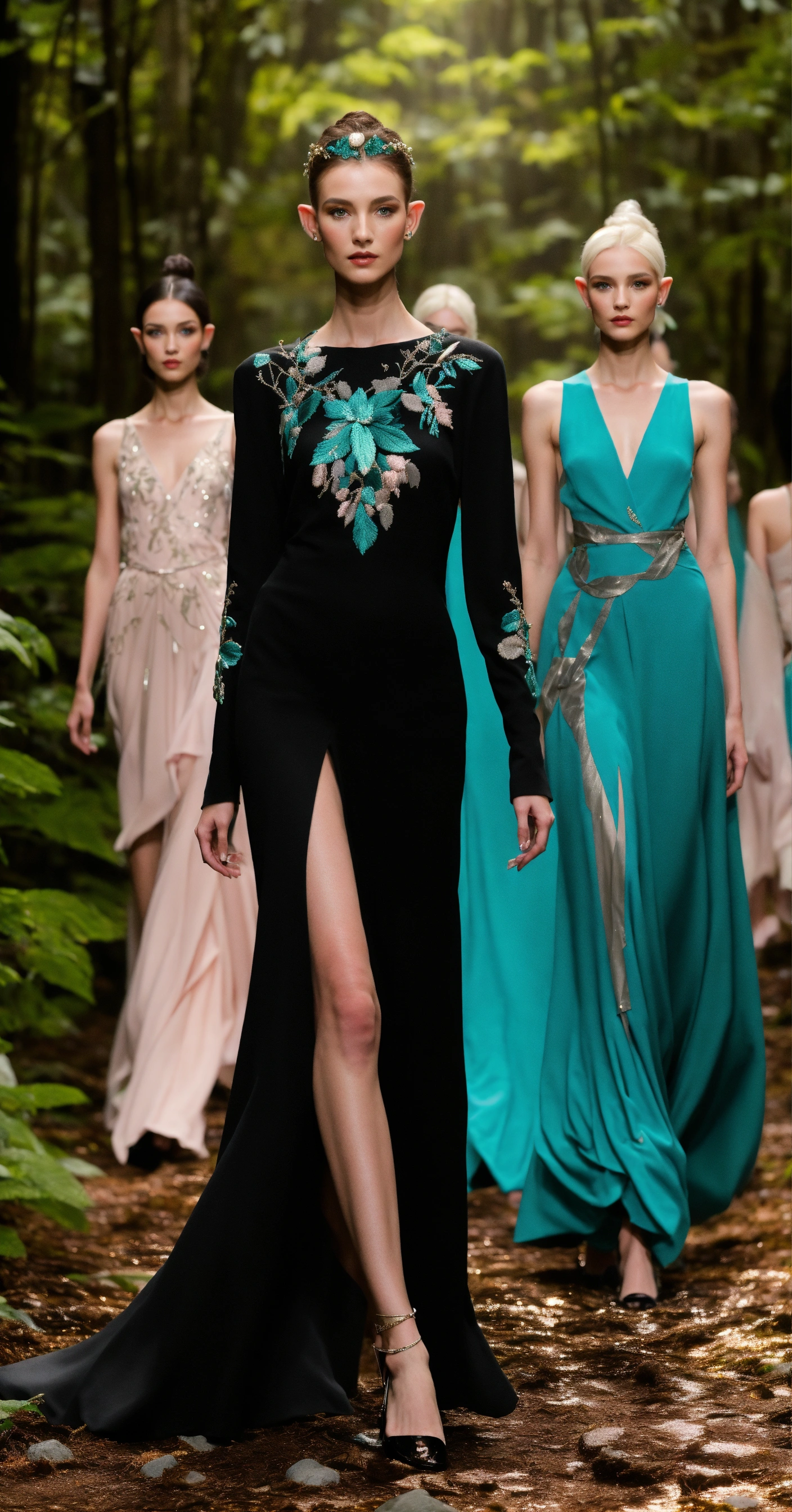 3d realistic photo of androgynous elves and fairies walking runway during fairy fashion week wearing dolman sleeve fairish donna karan fashion in black, white, blush, grey, beige, teal, stone, metallics, shimmer, iridescent, pearlescent, embroidered walking a candelit enchanted night forest runway with other fairies watching