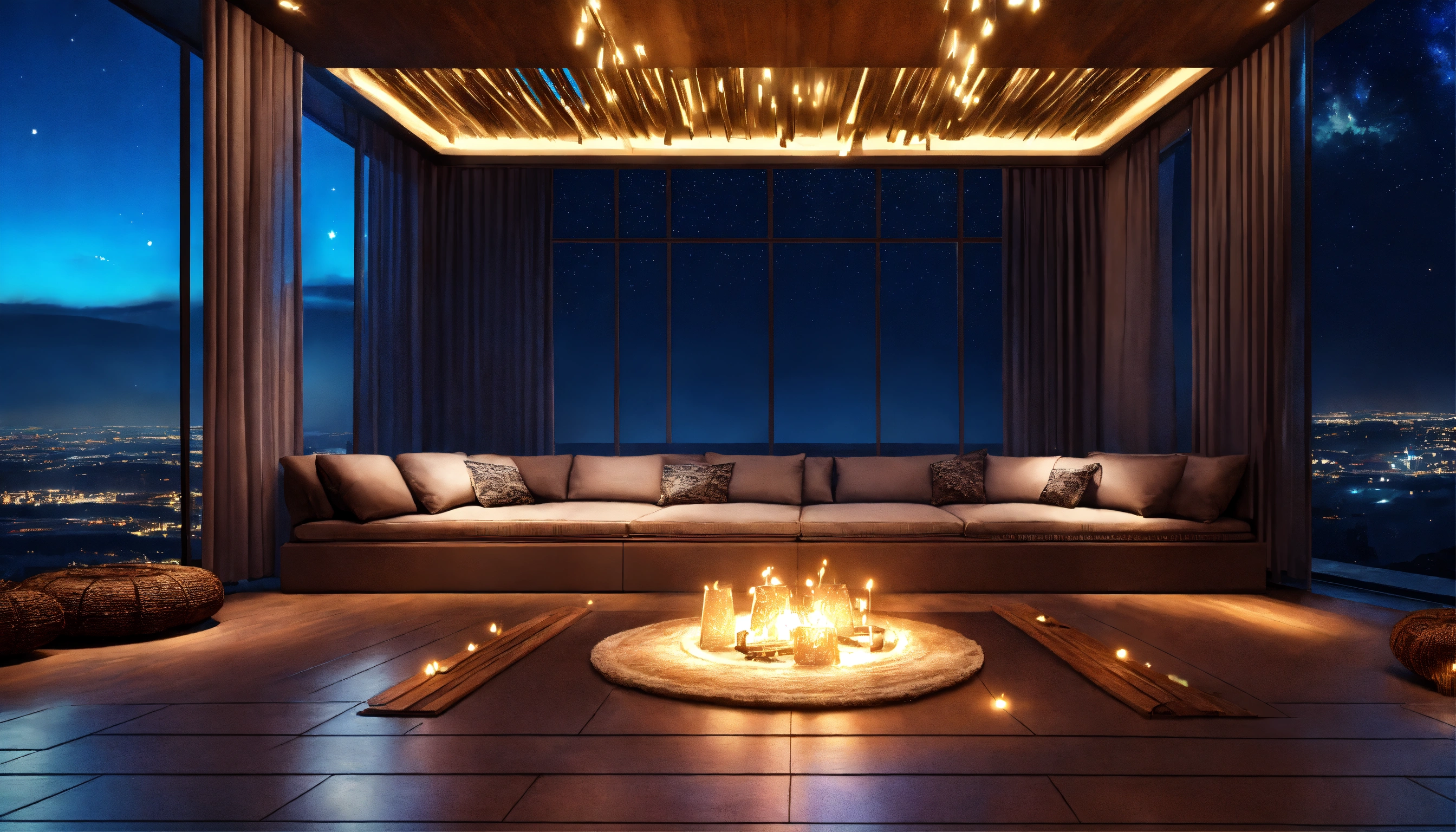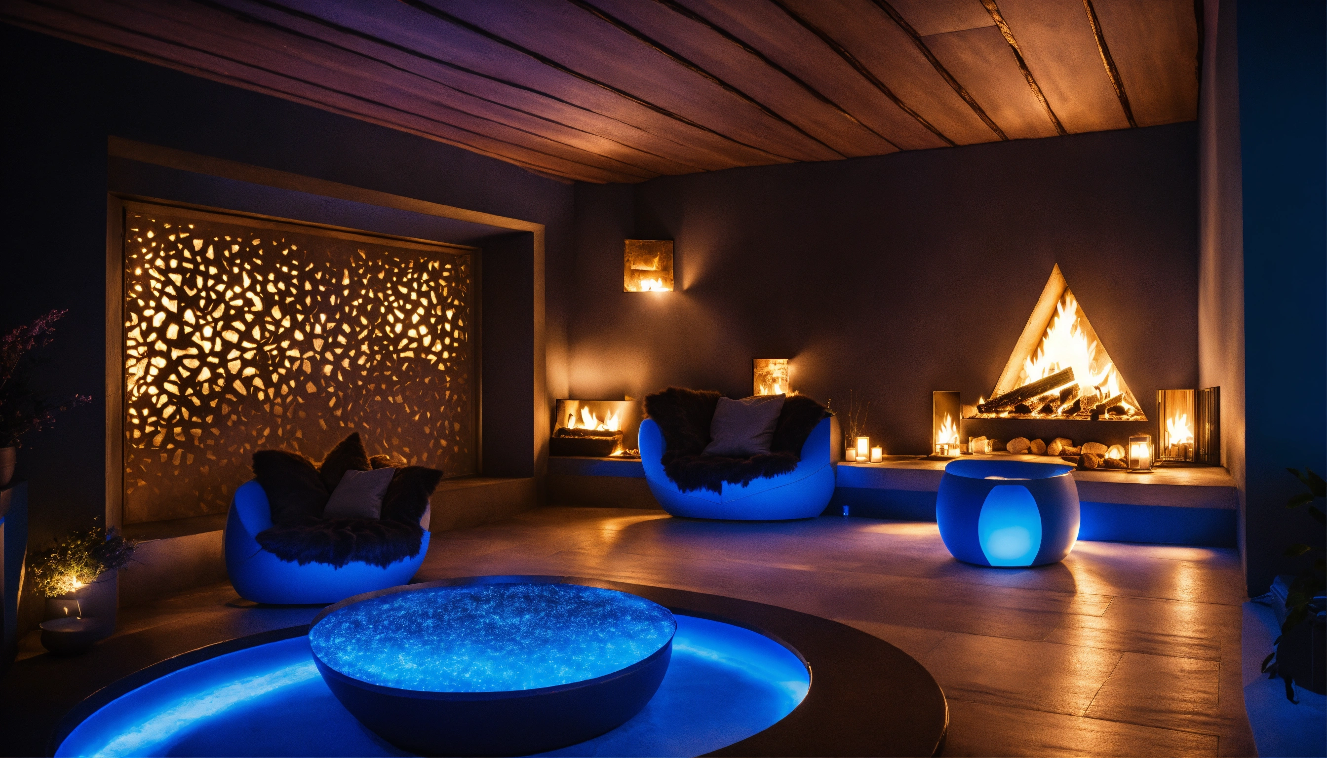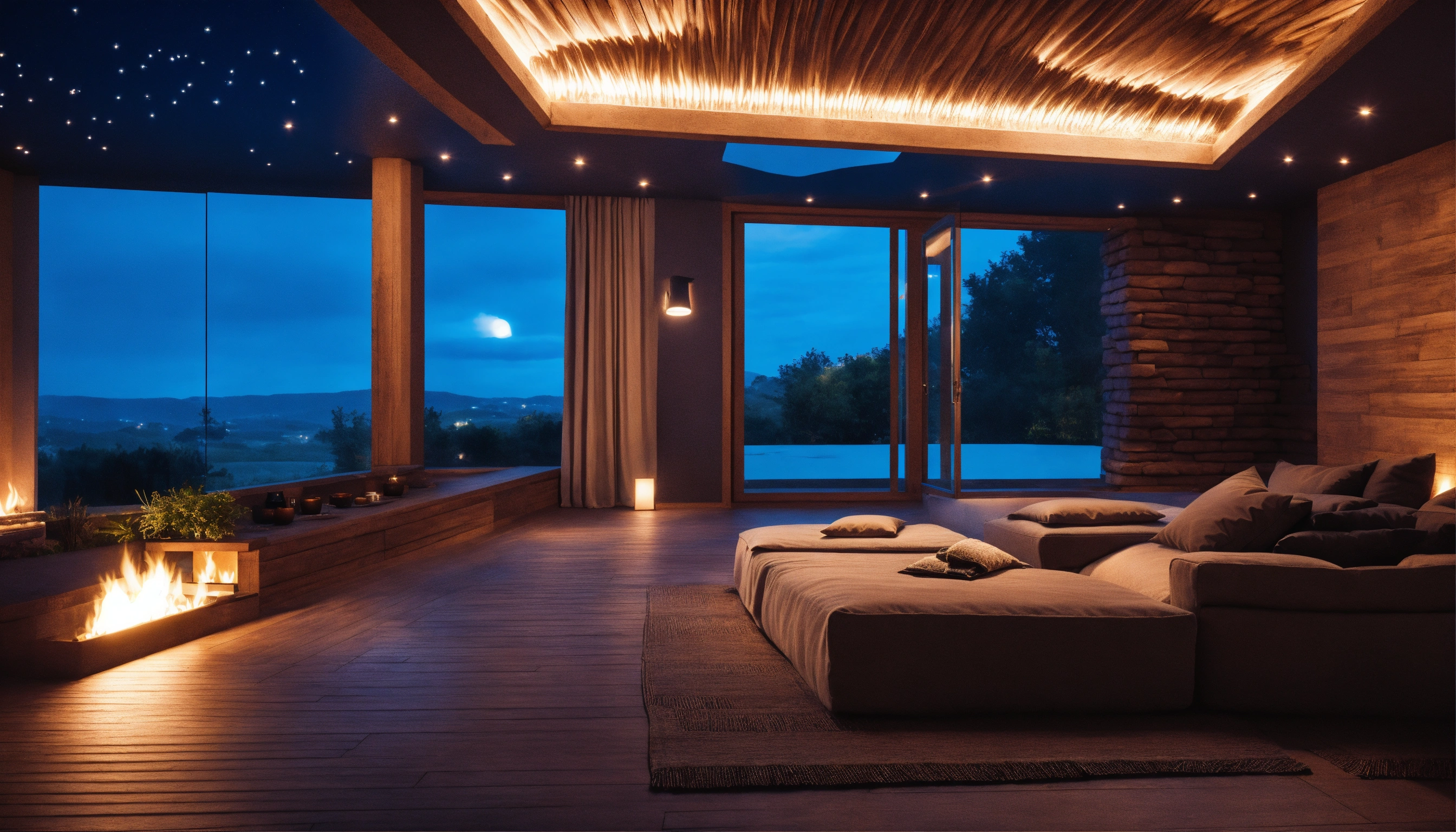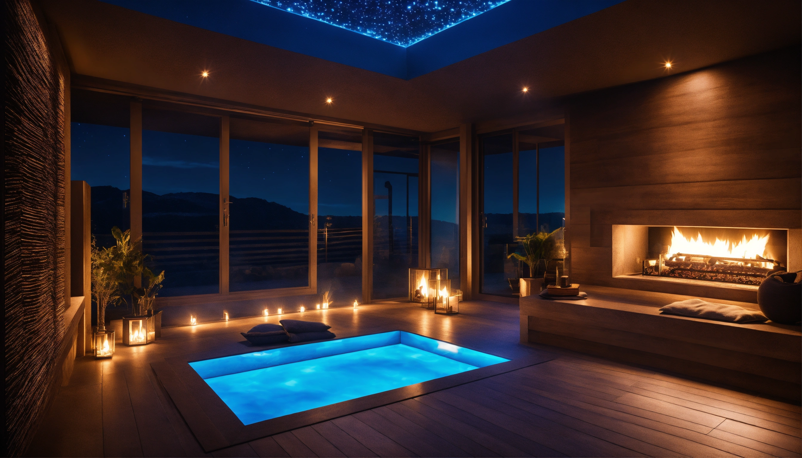 A luxury meditation room dark with ambient illumination in blue tones. night sky effect start light effect in roof. led lighting relaxation sounds, fireplace. luxury details led lighting