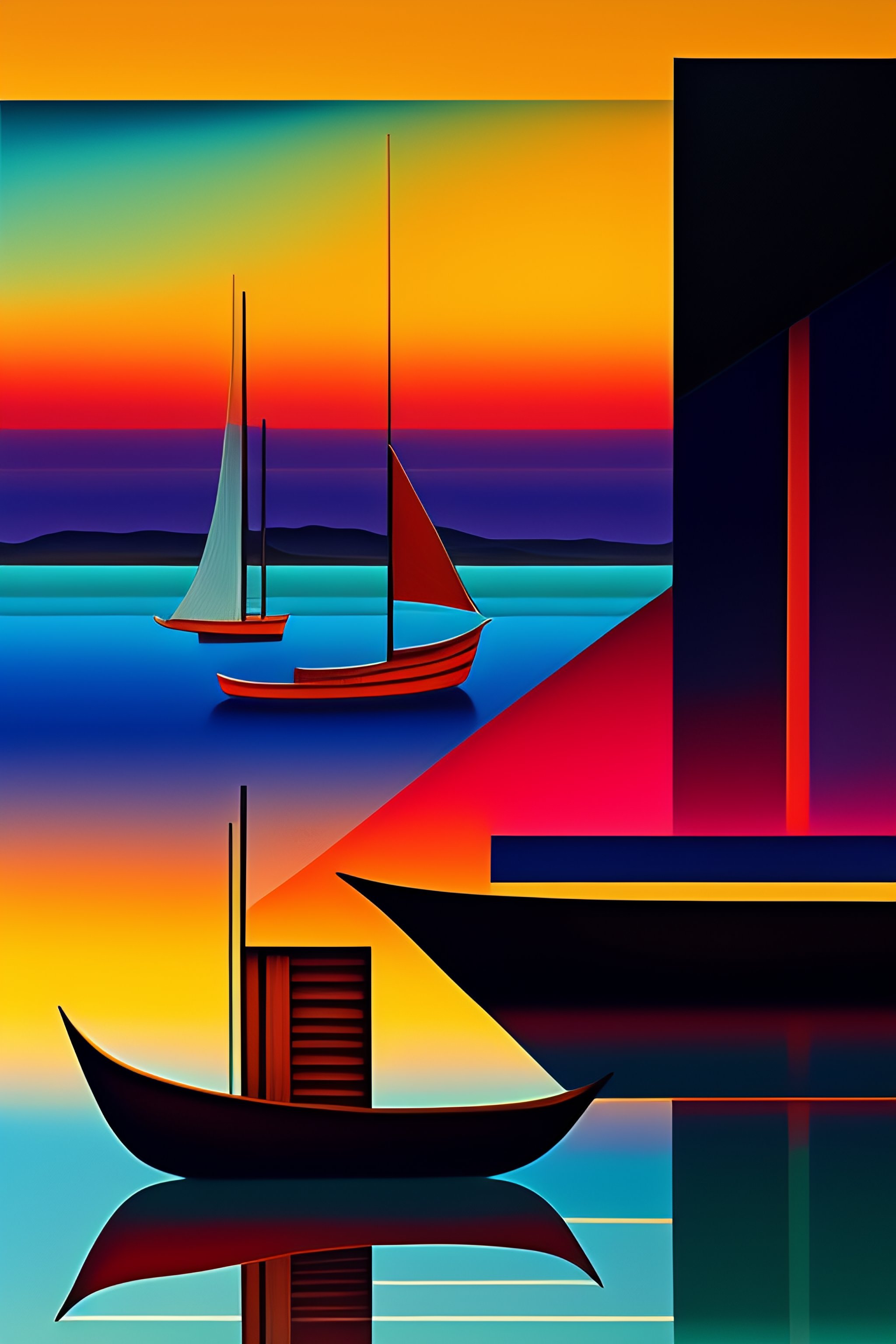 Imagen cubista abstracta y surrealista en forma de paisaje en el mar con barcos antiguos