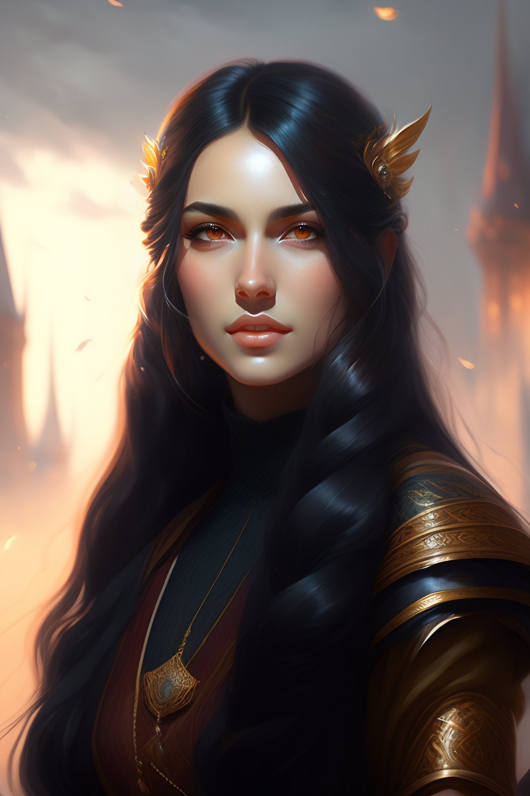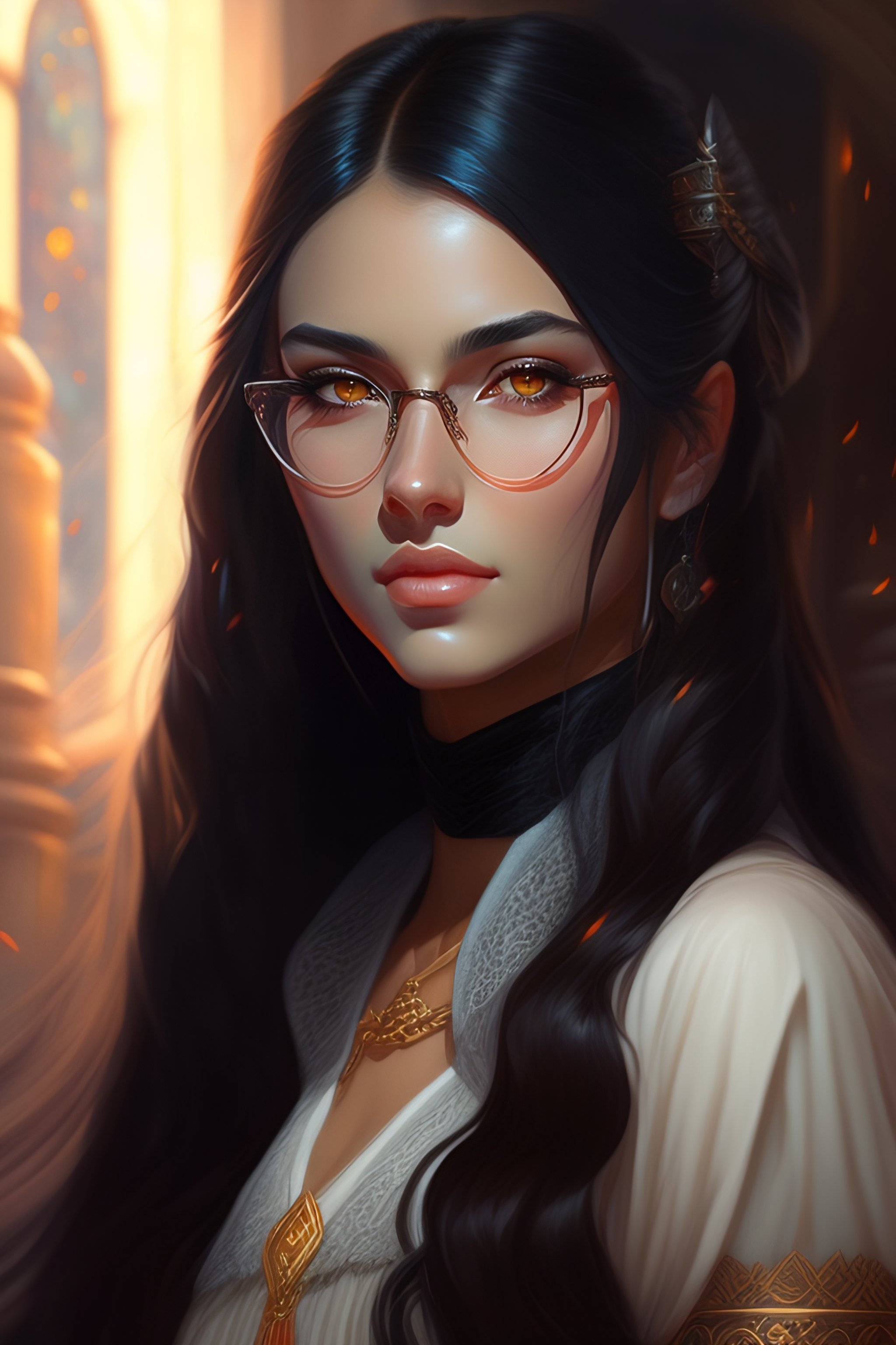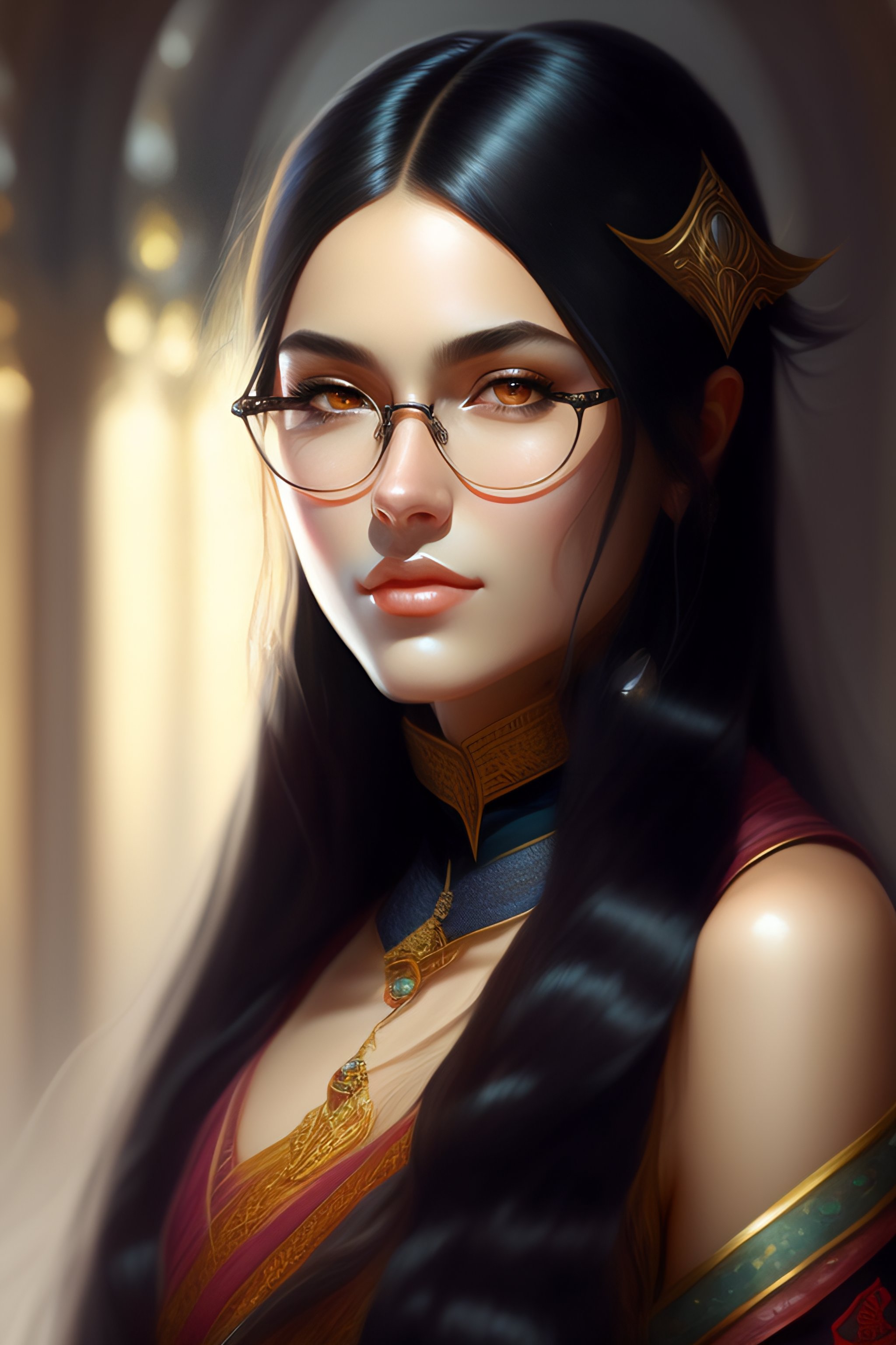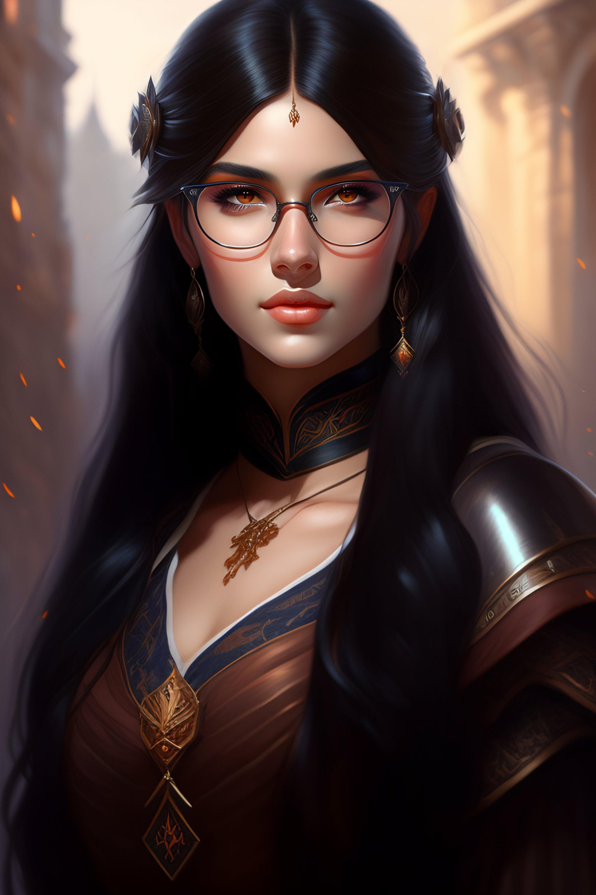Girl with long straight black hair, fantasy style, portrait, painting, glasses, rpg, dnd, oil painting, portrait extremely detailed, artgerm greg rutkowski greg, brazilian, dark brown eyes, european, cheeks