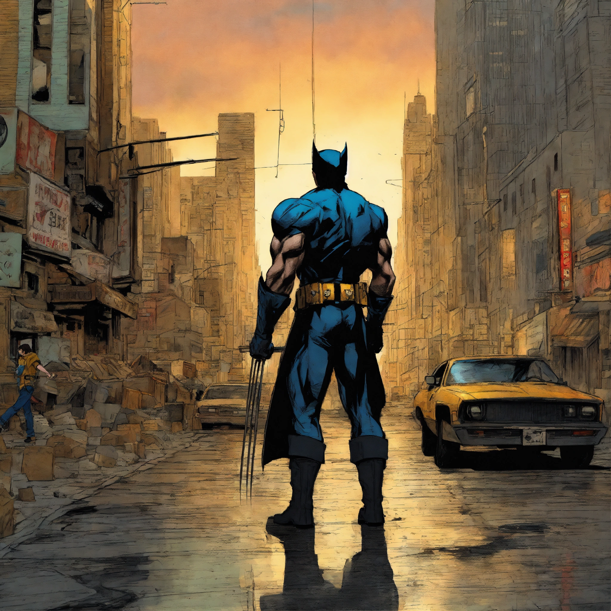 Imagine wolverine drawn realistically by todd mcfarlane in the radiant, gritty streets of metropolis.