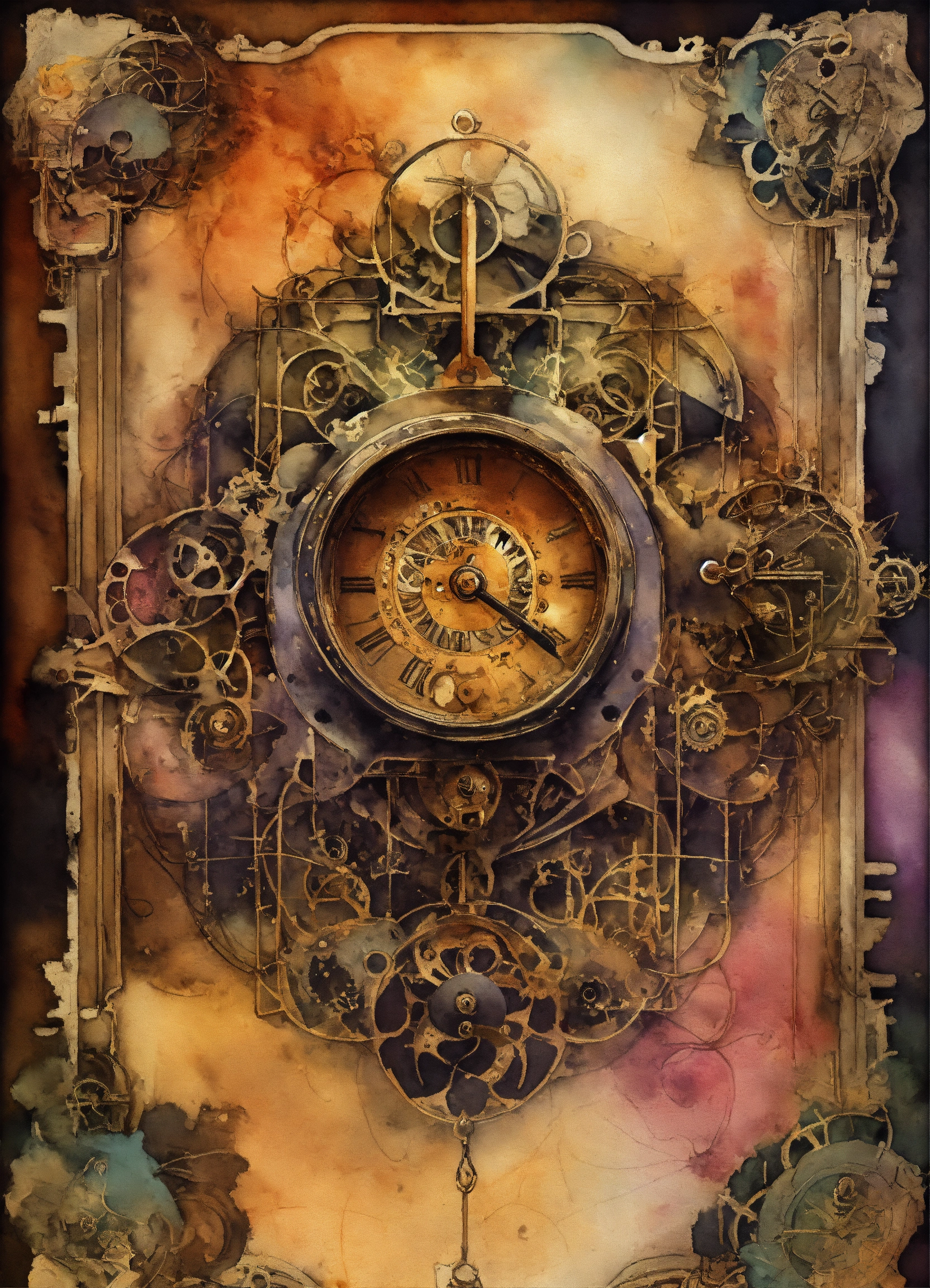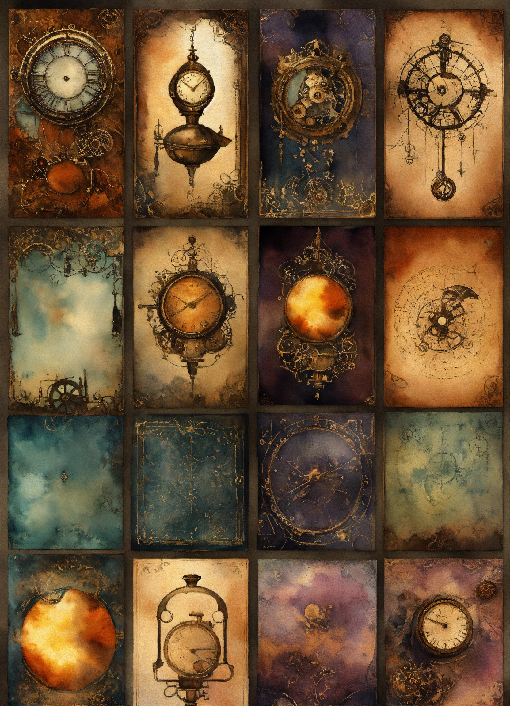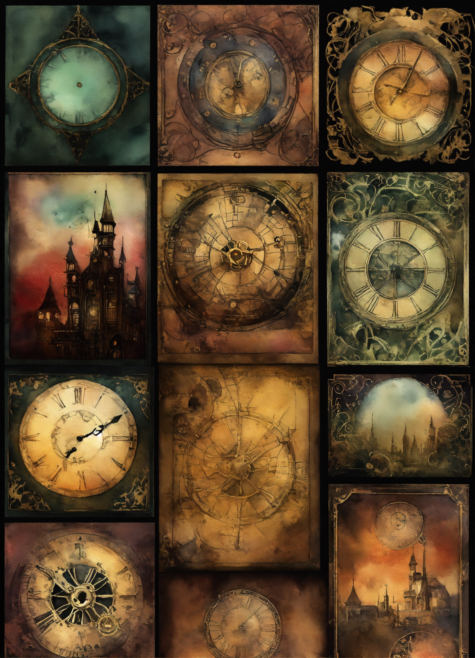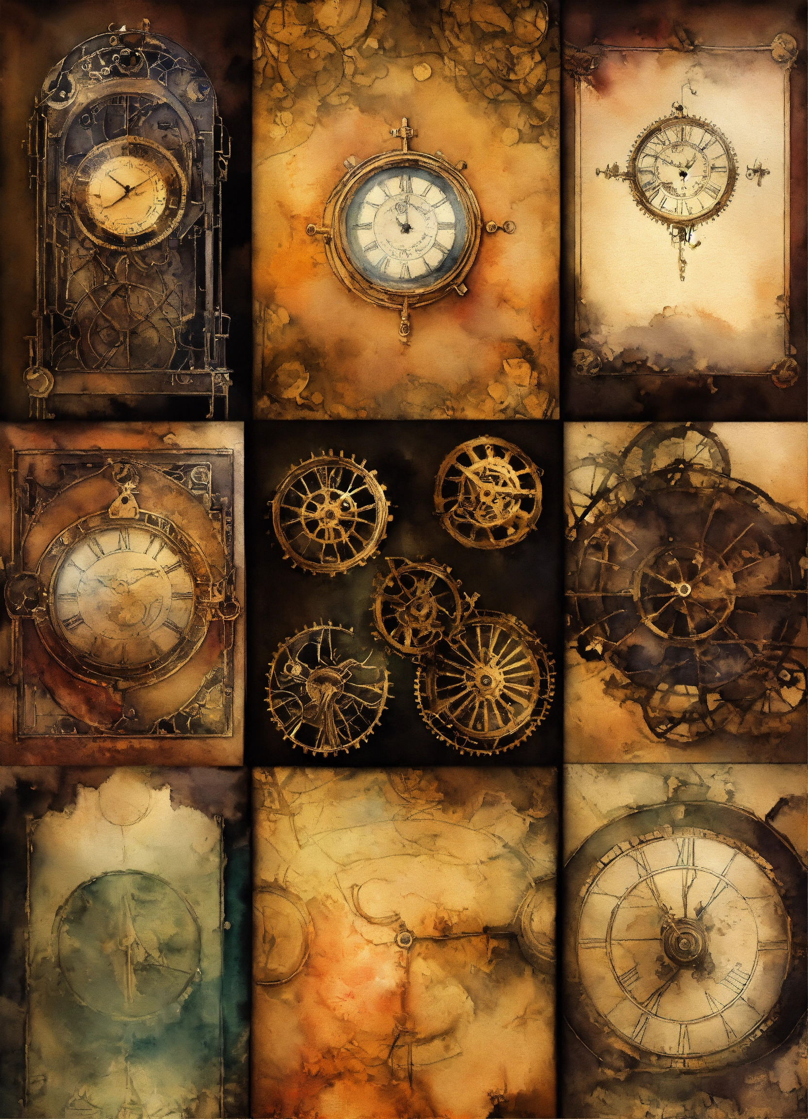"generate a collection of intricate background watercolor illustrations inspired by goth-steampunk themes. these background images should capture the essence of gothic fantasy and steampunk aesthetics, providing a versatile resource for various paper craft projects such as card making, scrapbooking, junk journaling, and more. ensure that each background design is unique and suitable for enhancing creative projects."