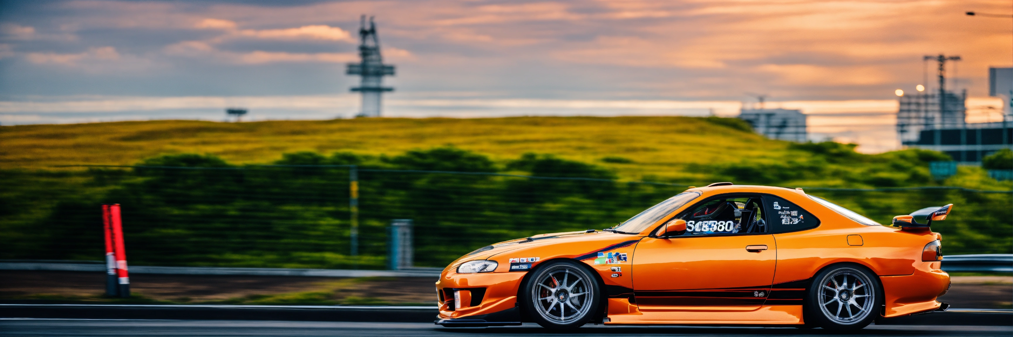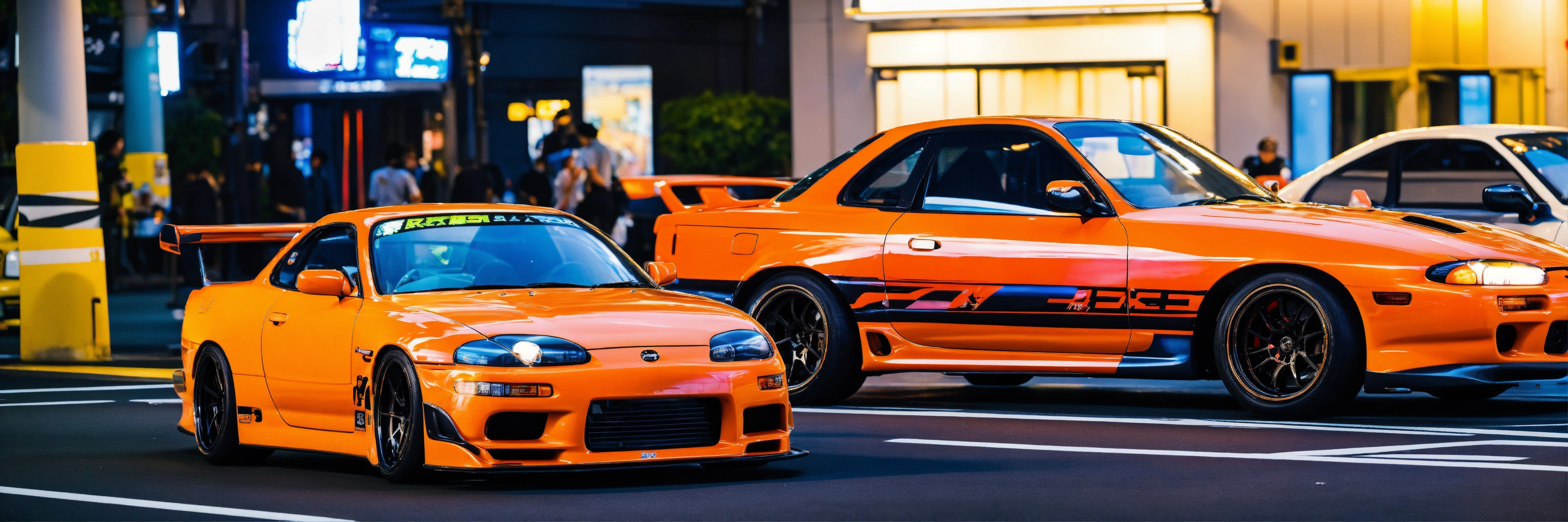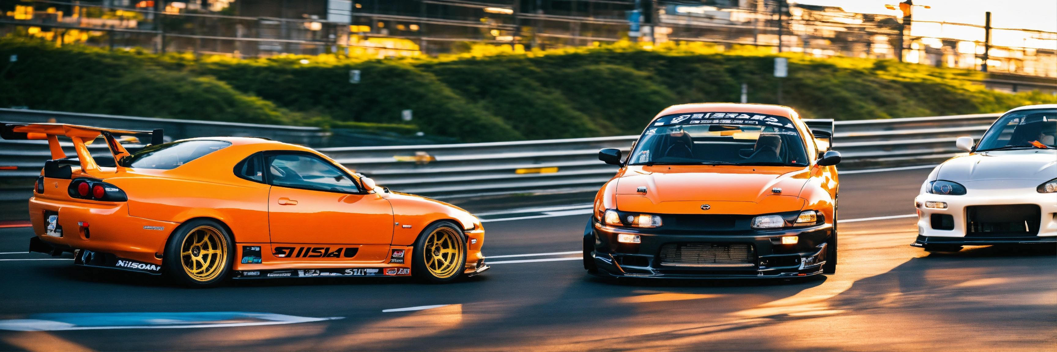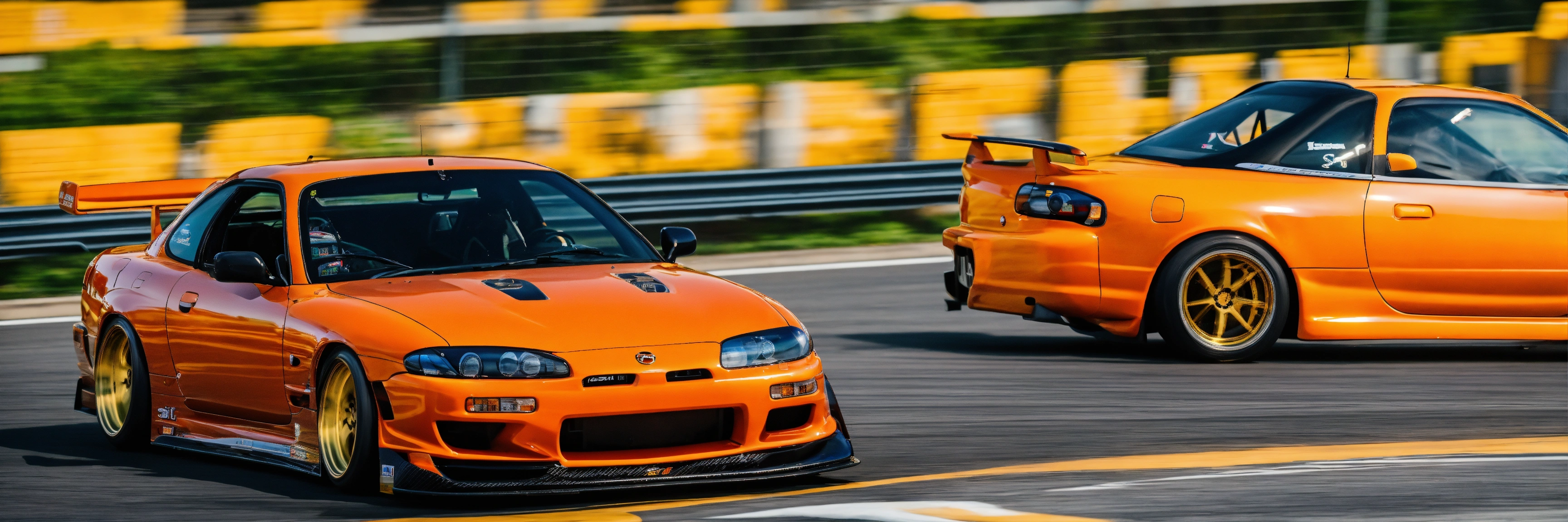 A colorful orange nissan silvia s15 with a wide-body kit racing a white mazda rx7 in tokyo highway
