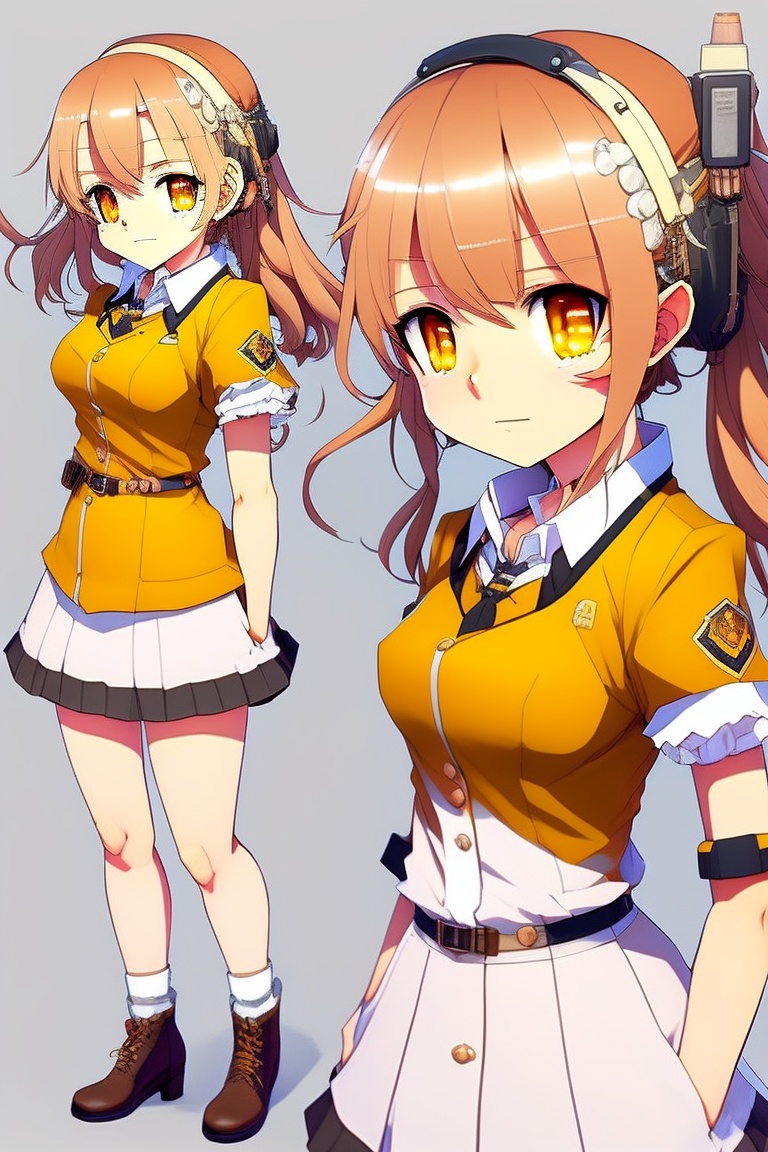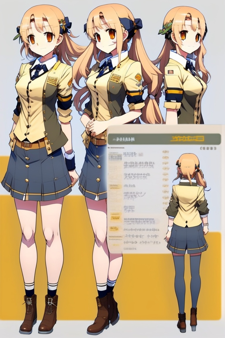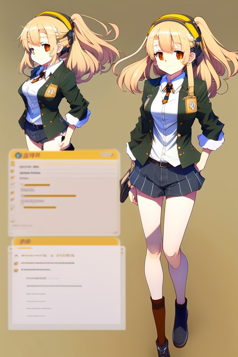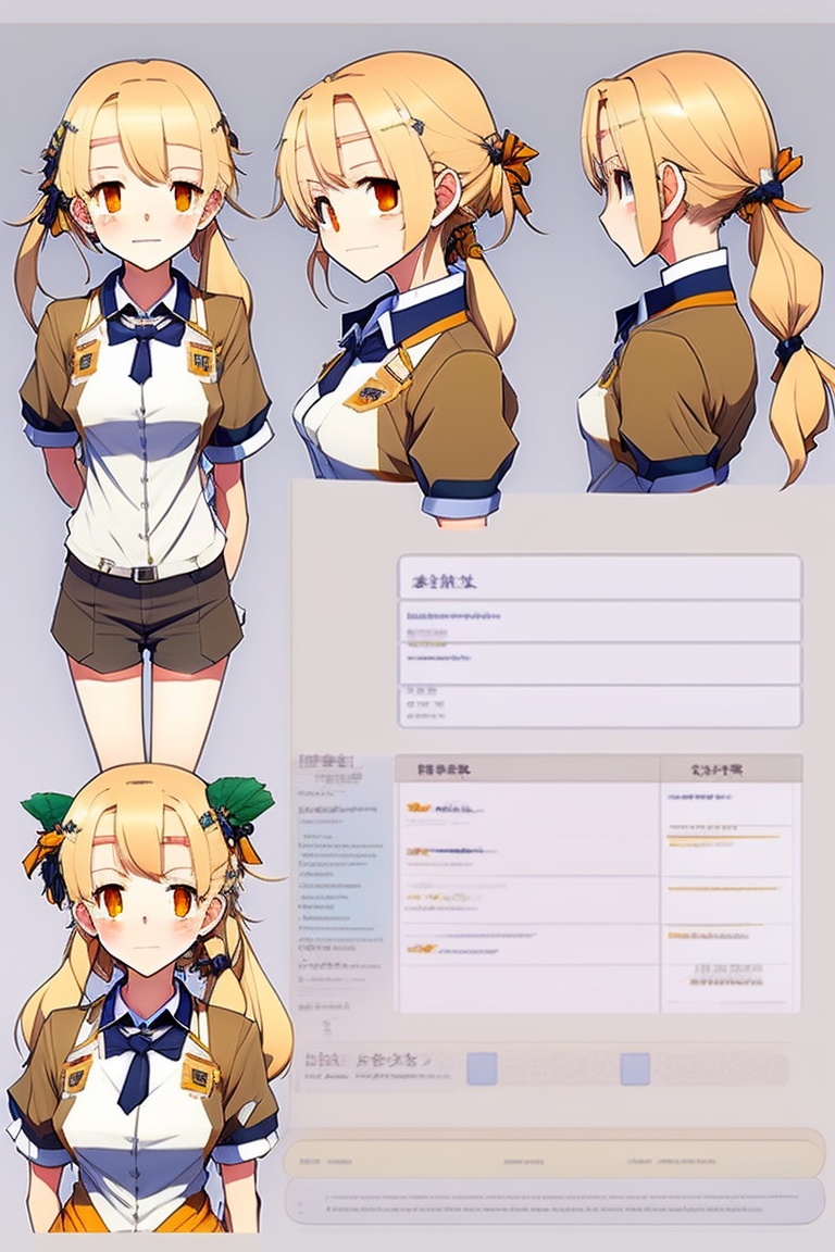 Teen chubby woman character sheet poses for visual novel, using school uniform, light skin, yellow hair, she has bright brown eyes, dark yellow eyebrows, a well shaped nose, and slightly smooth lips, often curved into a smile, adding a casual air in appearance, anime, toradora, niji 5