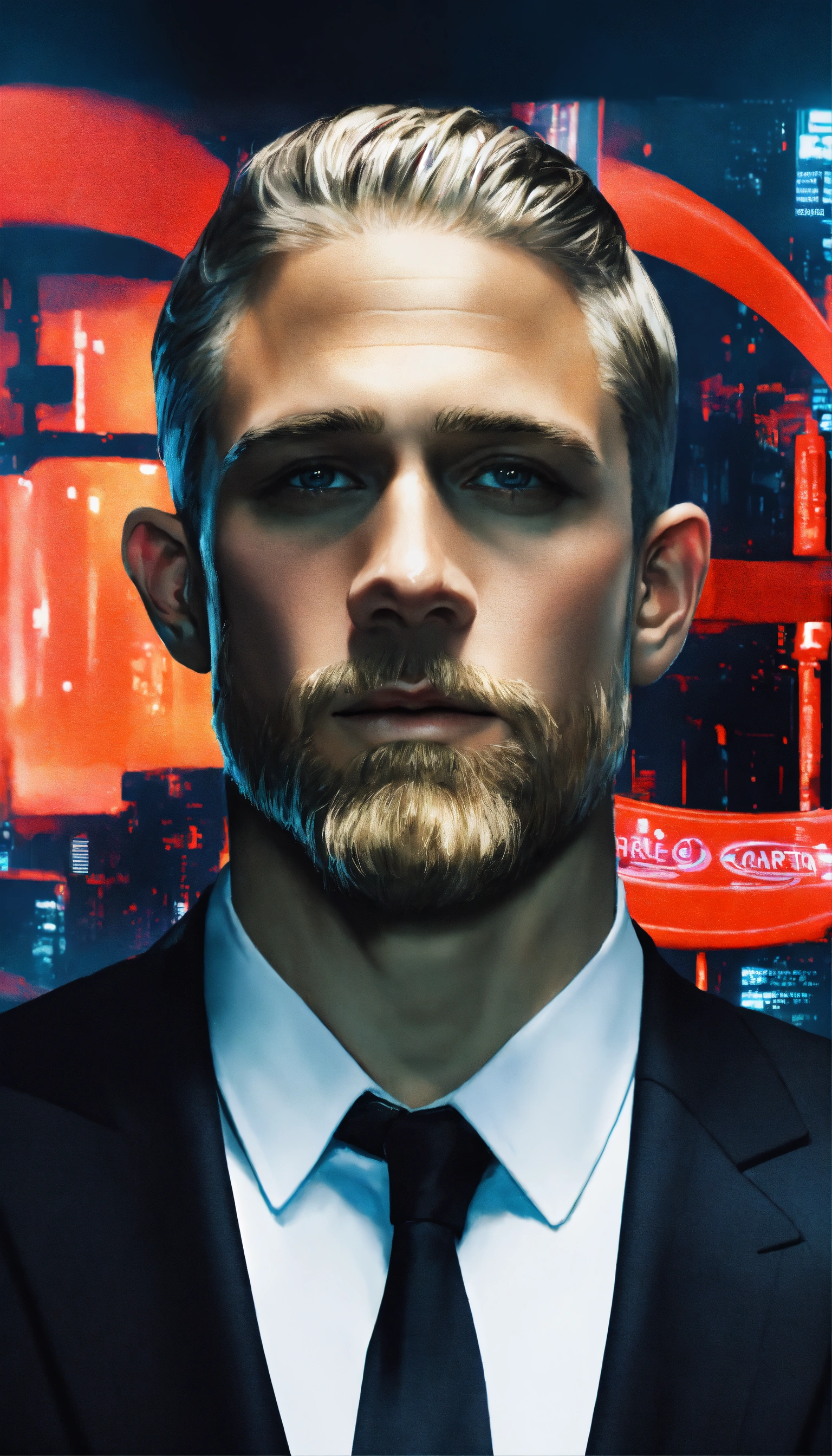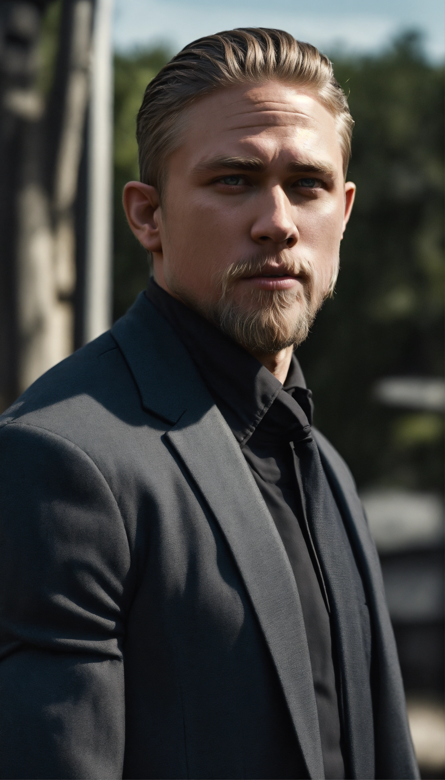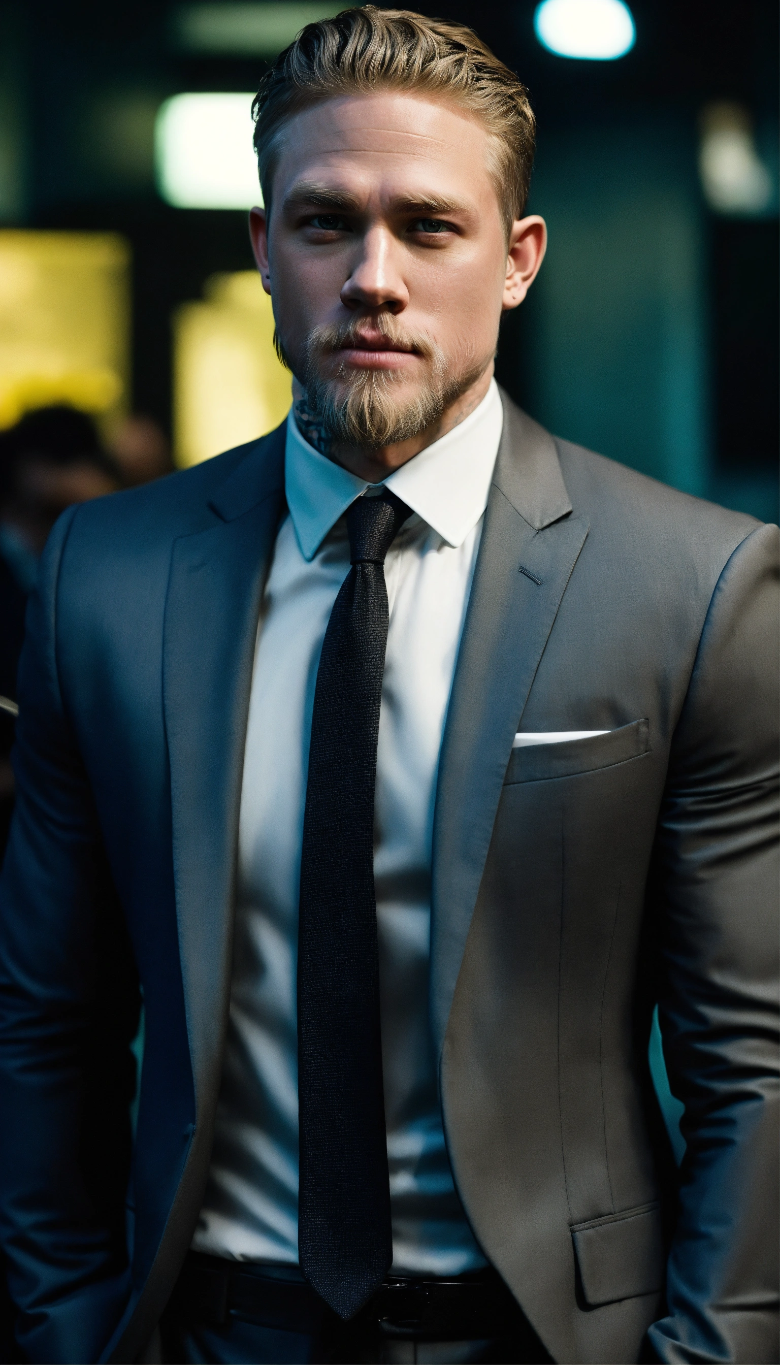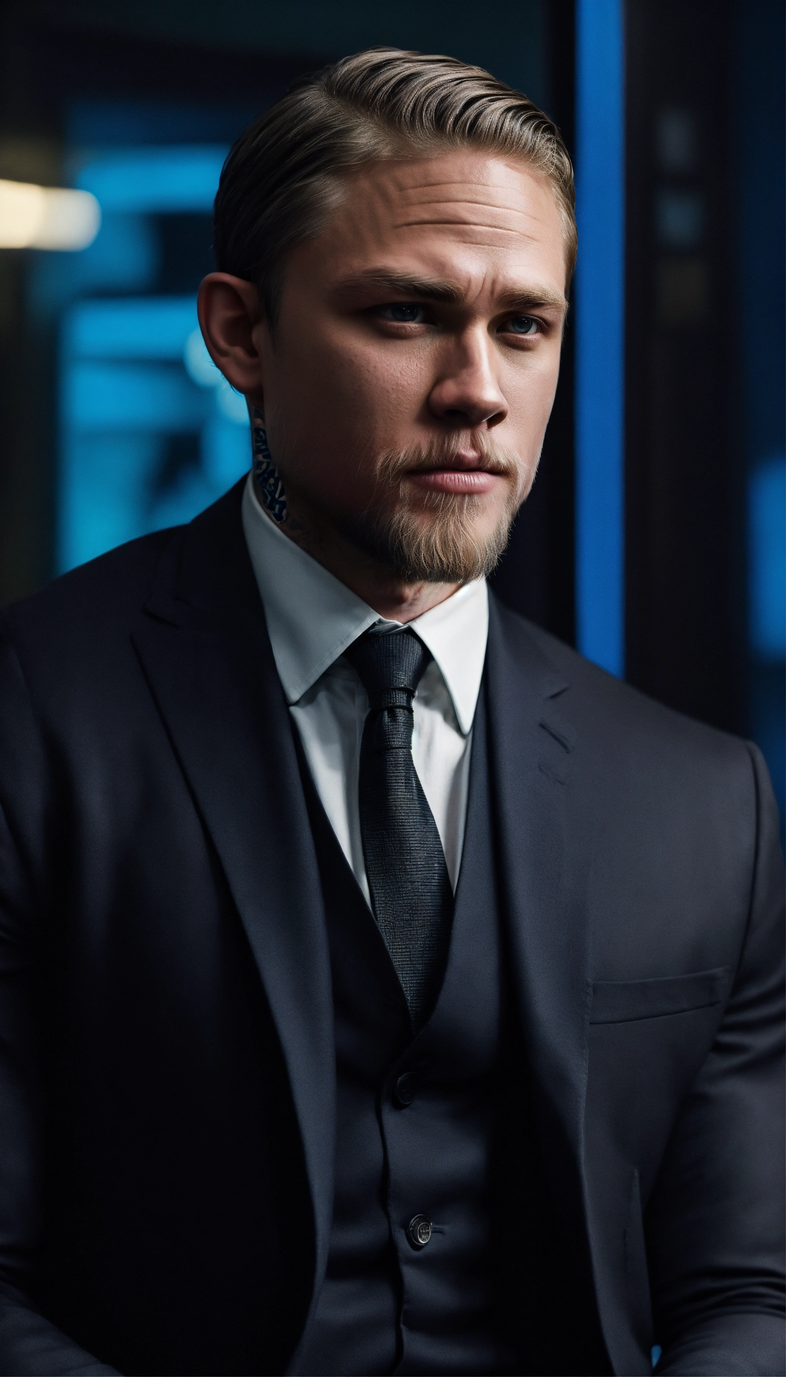 Tall handsome man, charlie hunnam, black suit, short white hair, fbi agent, very realistic, altered carbon 33 years old