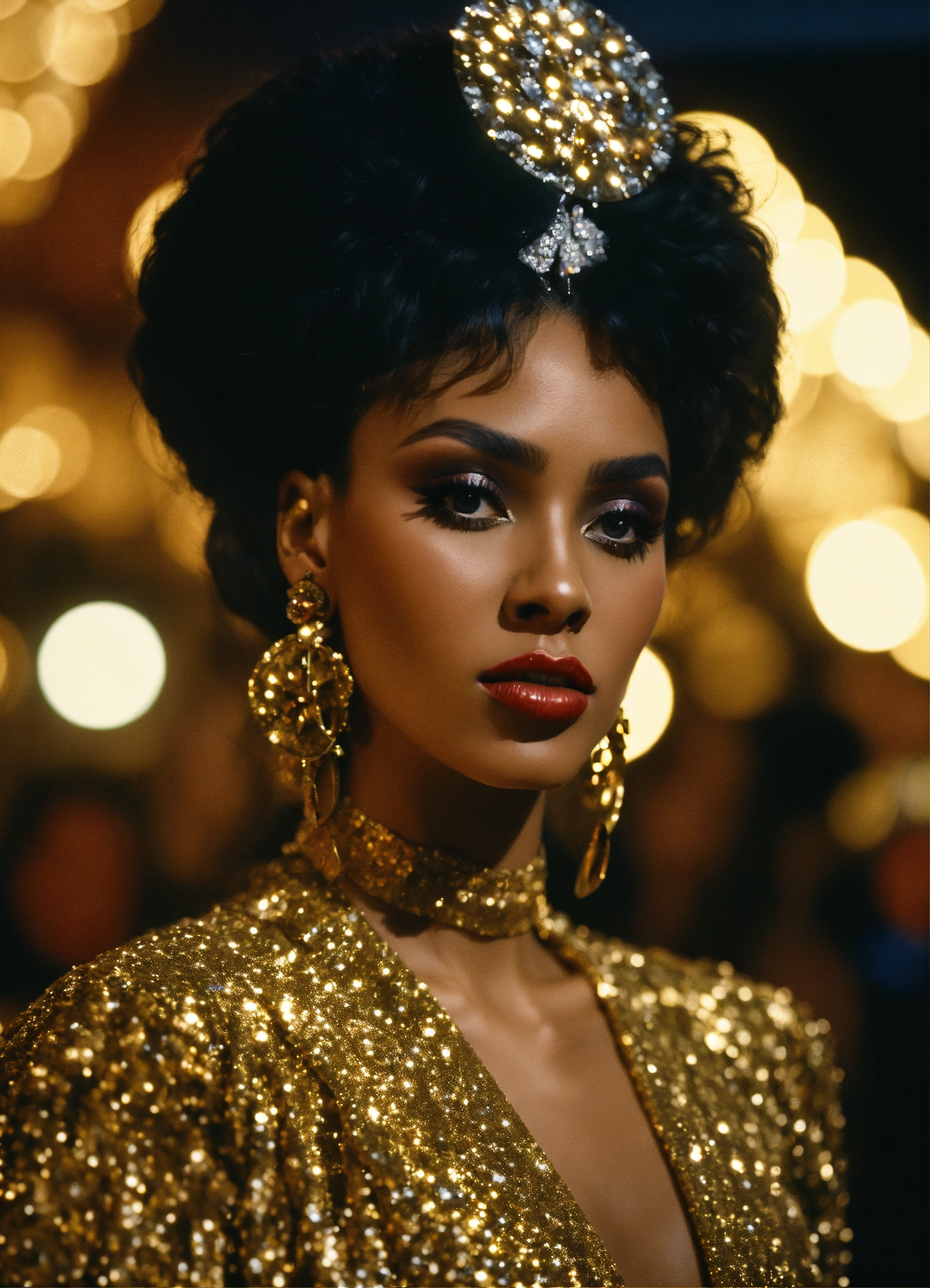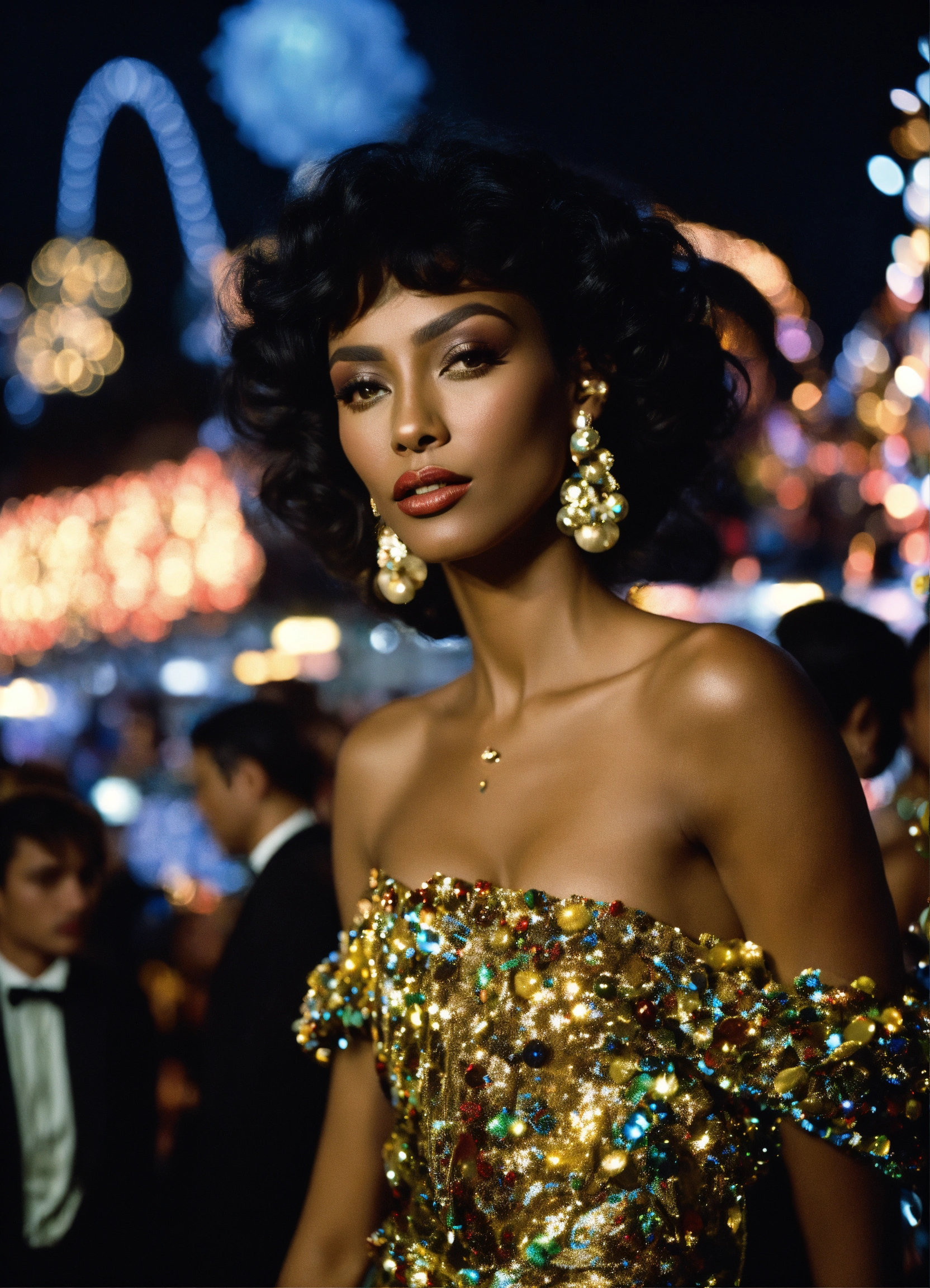 Donyale luna, 8k resolution, hyper realistic, new year’s eve, 35mm film, editorial, high fashion, 2023, dolce and gabbana