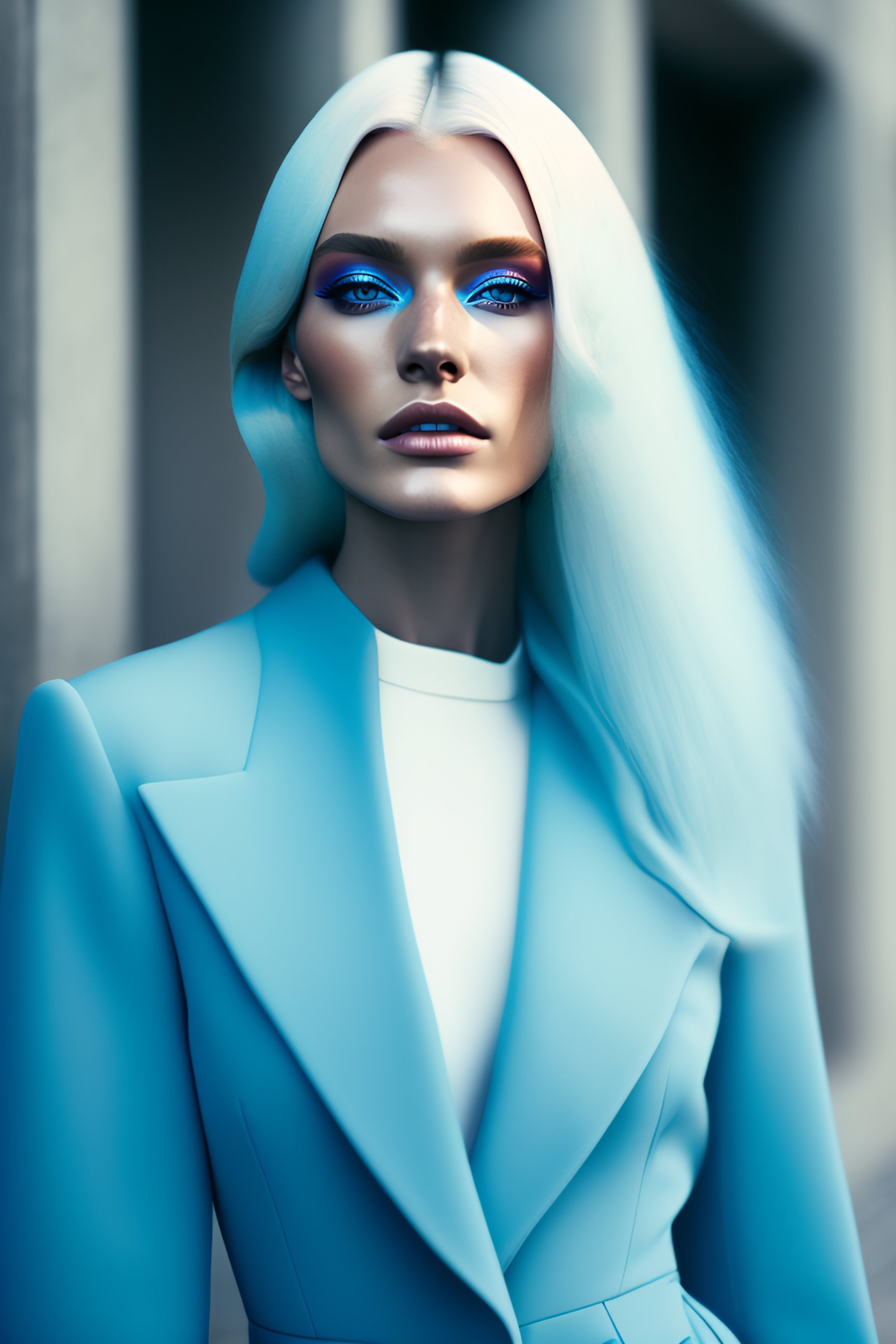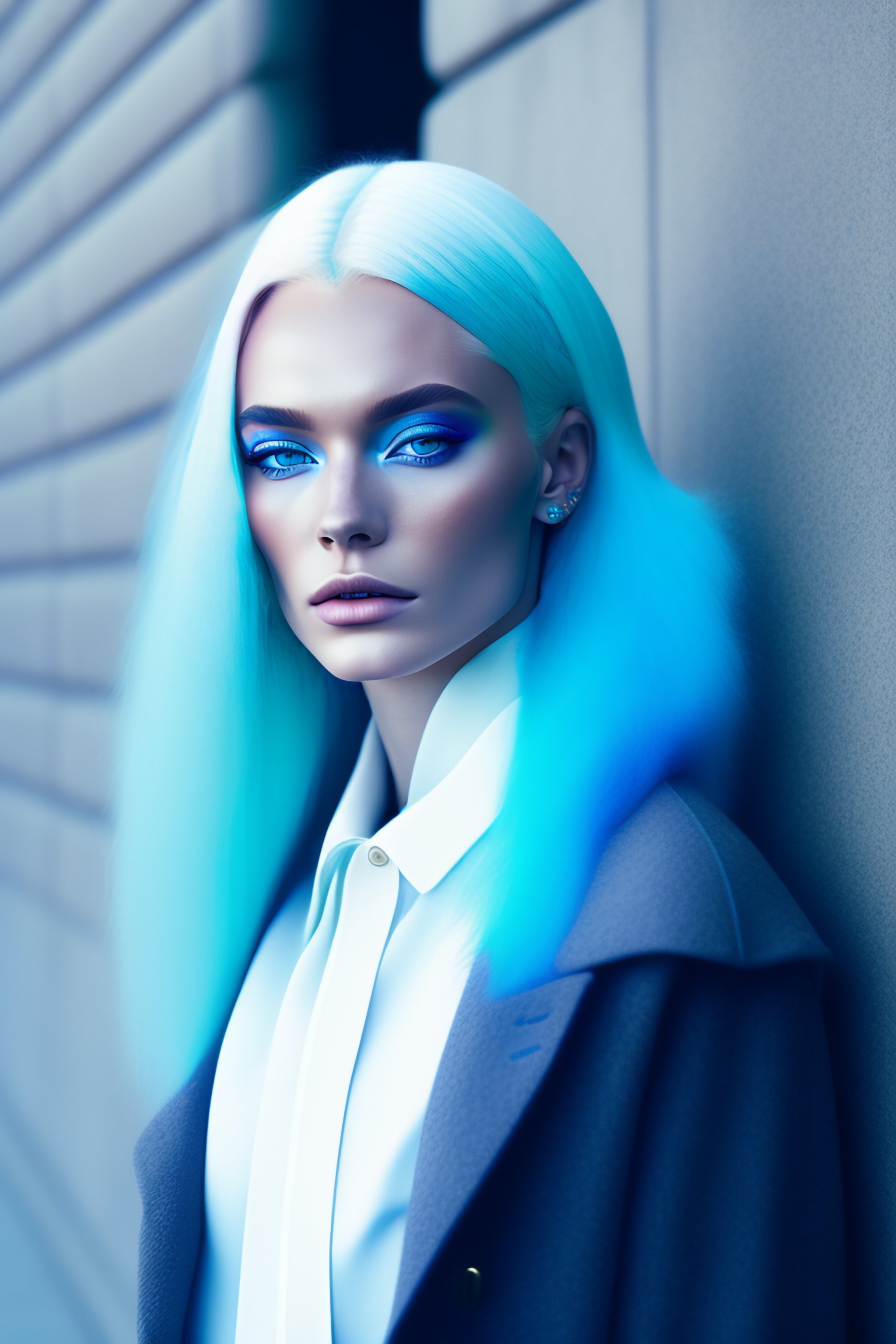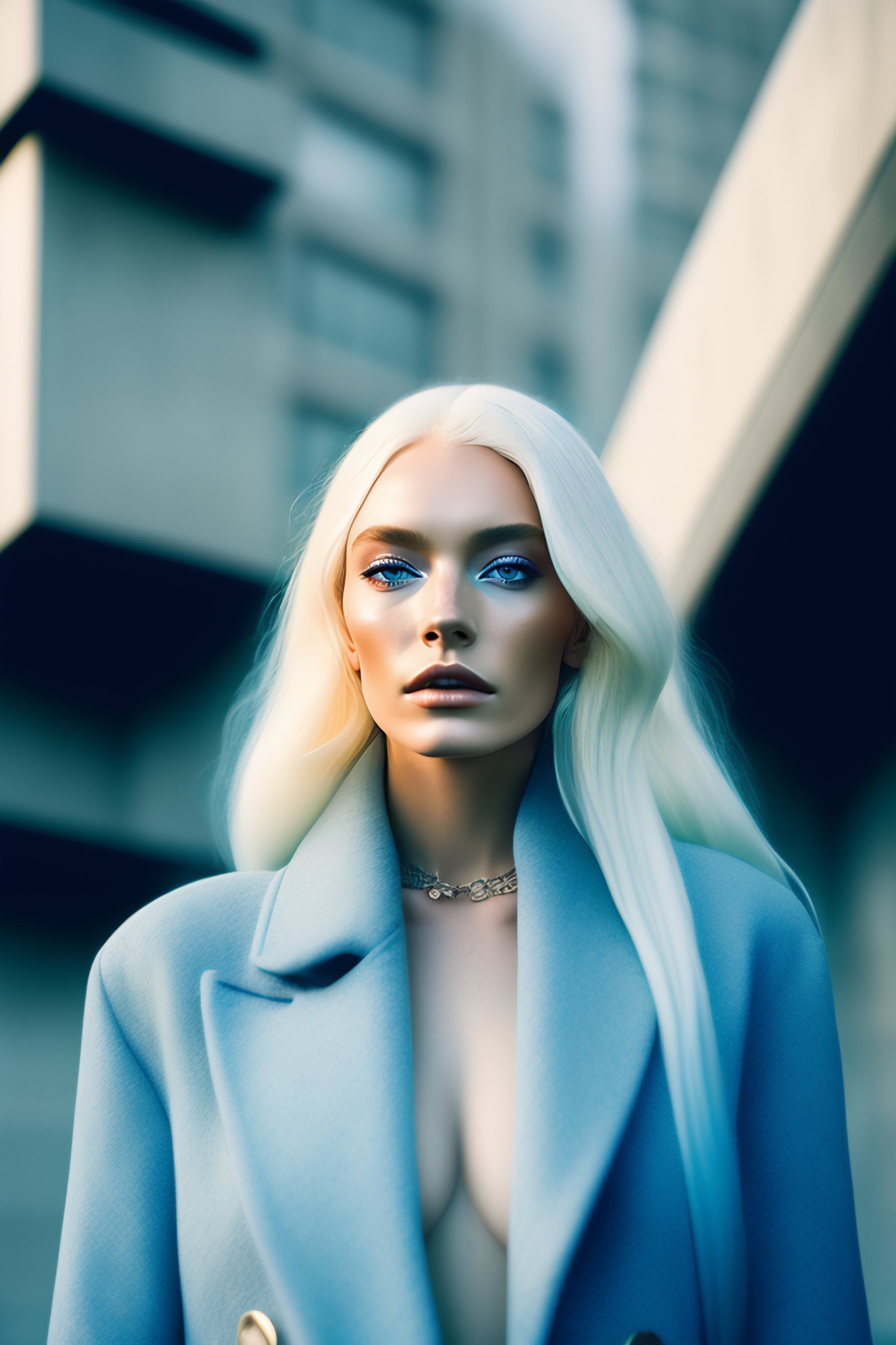 Portrait of haute couture beautiful albino fashion model with blue hair that looks similar to lindsay lohan, ethereal dreamy foggy, photoshoot by an amateur photographer, editorial fashion magazine photoshoot, fashion poses, in front of brutalist building architecture. kinfolk magazine. film grain.