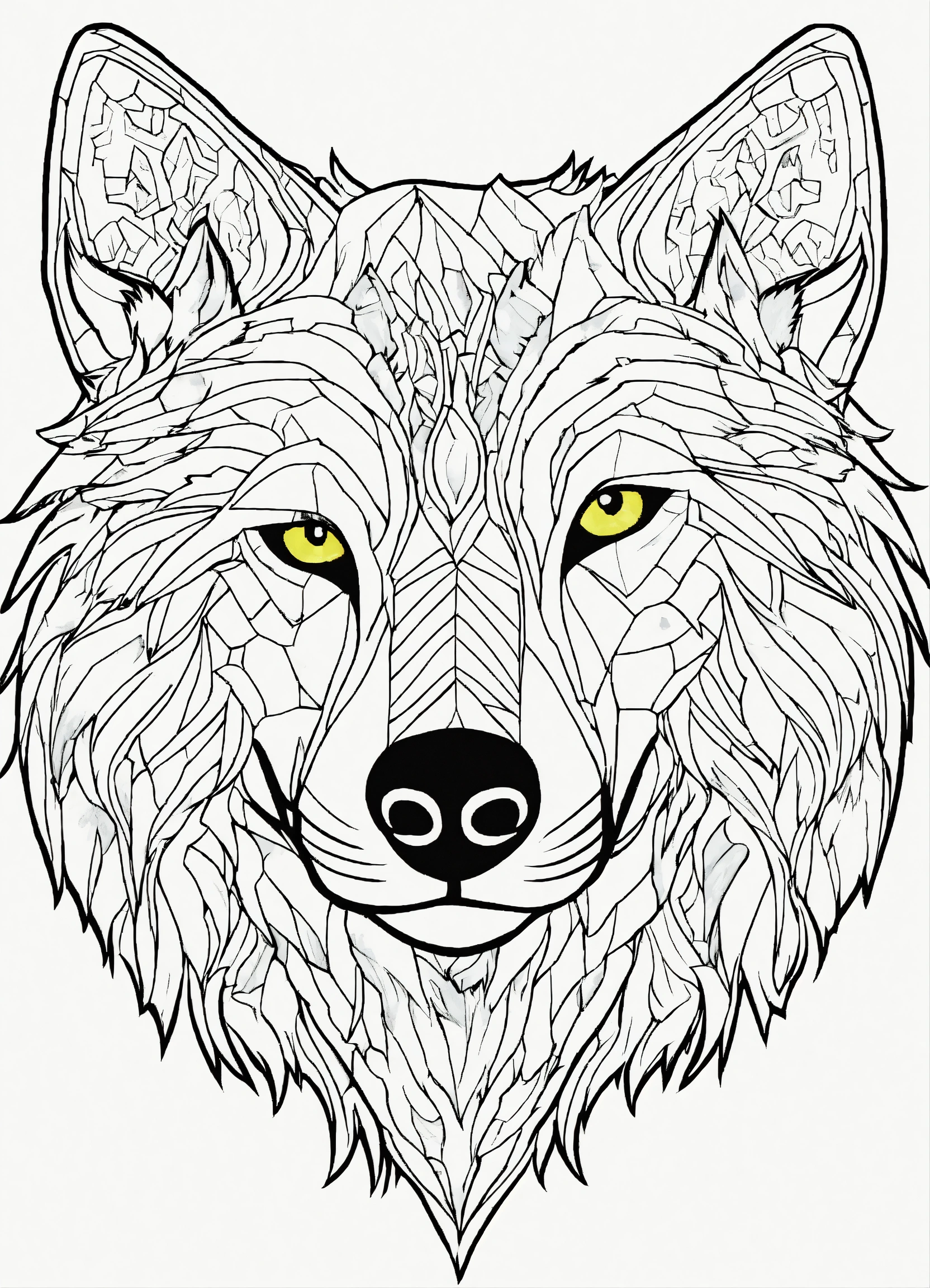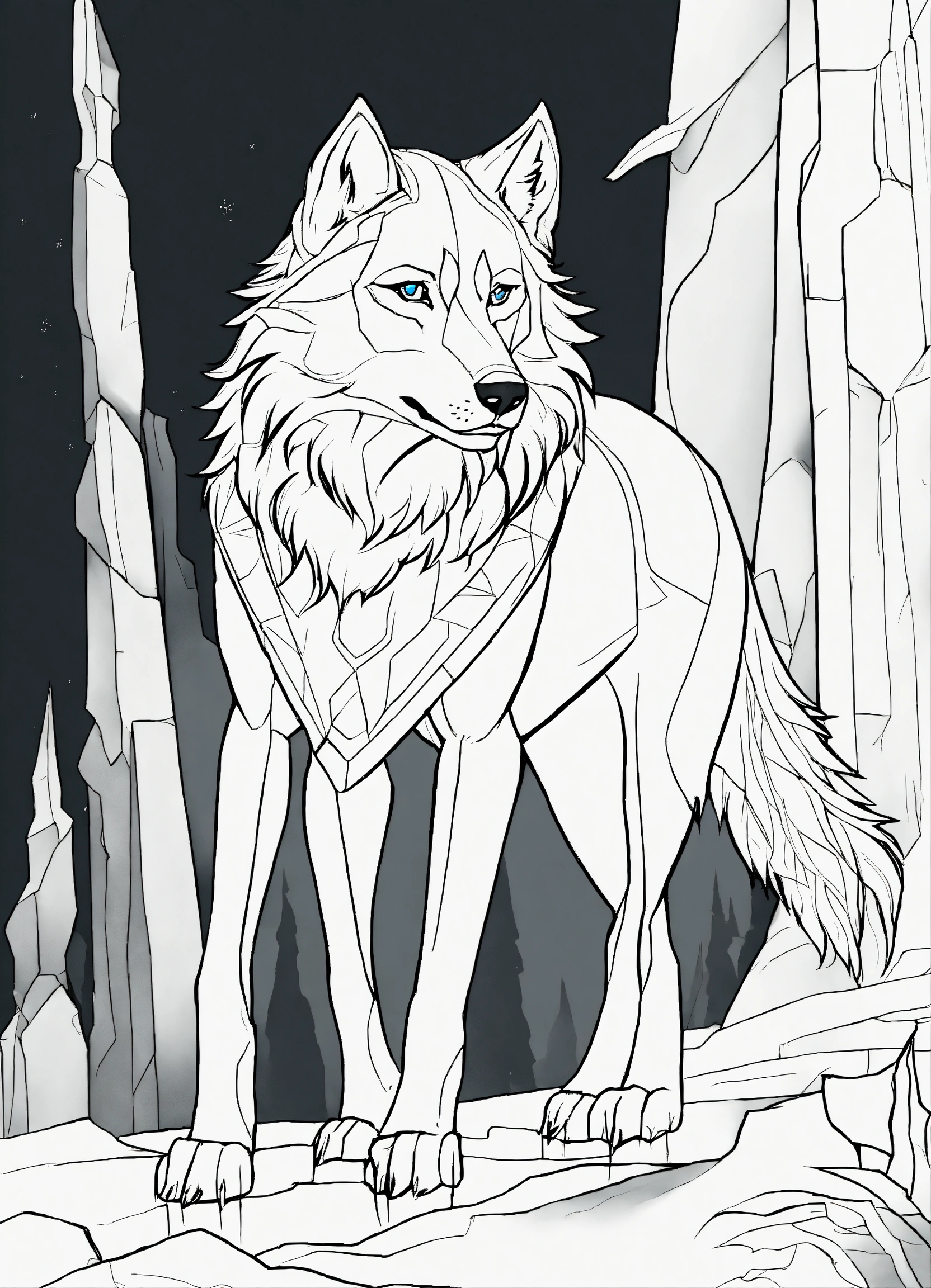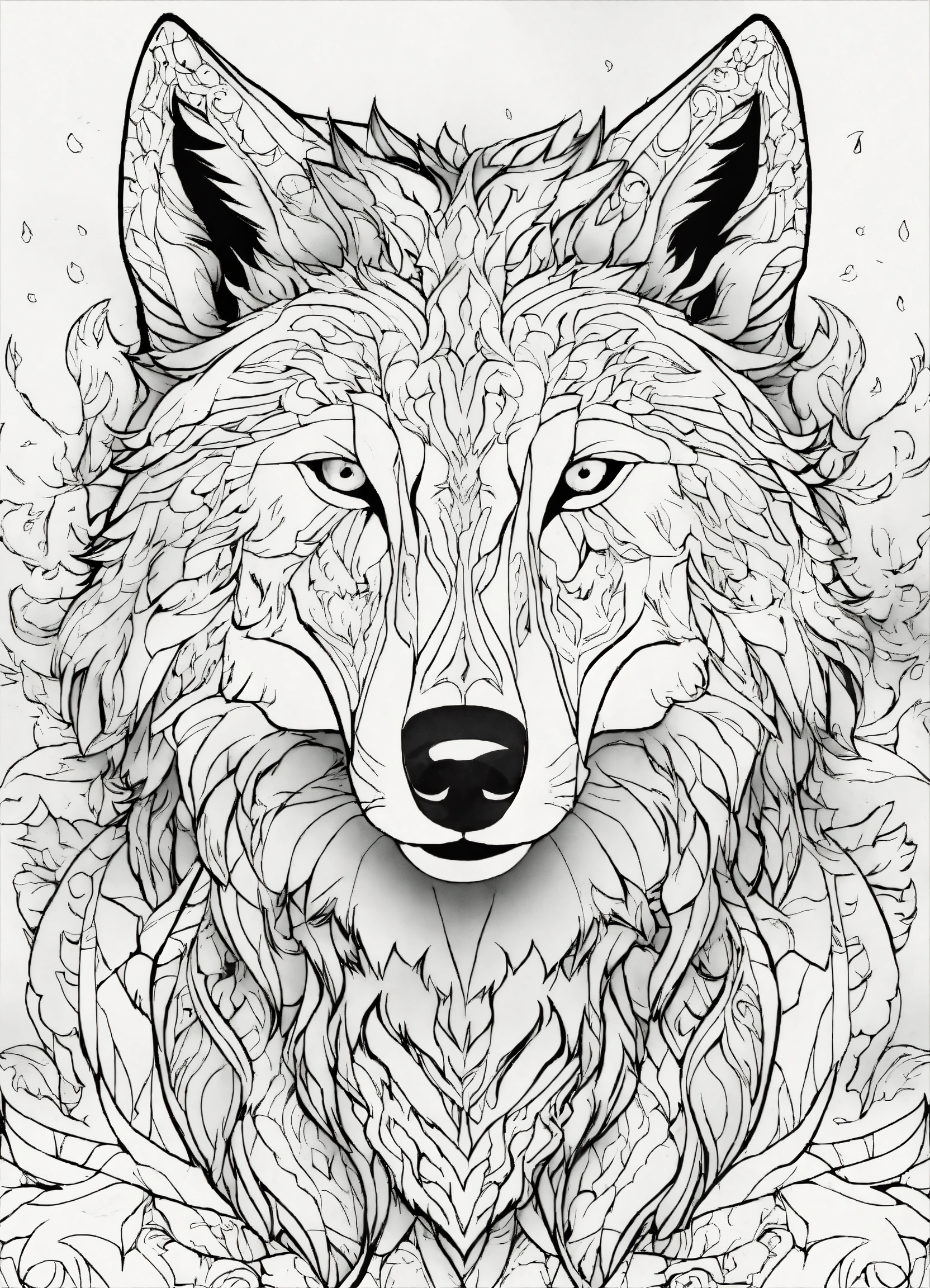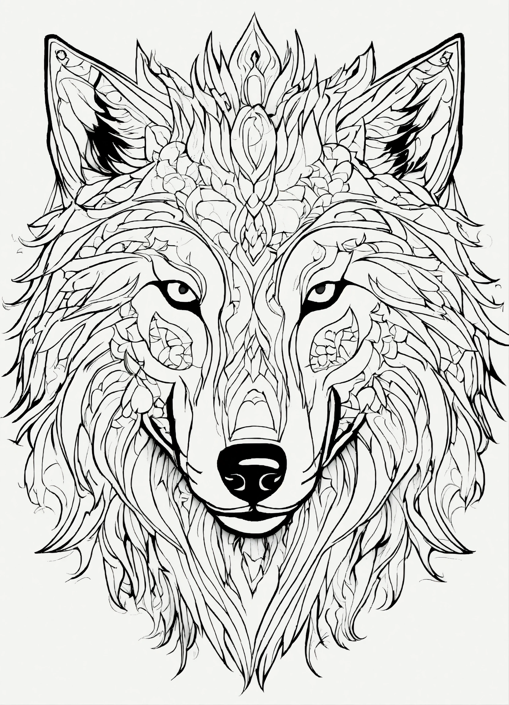 Extremely simple image, icefire wolf, cartoon style, black and white, coloring book, white background, -ar 23