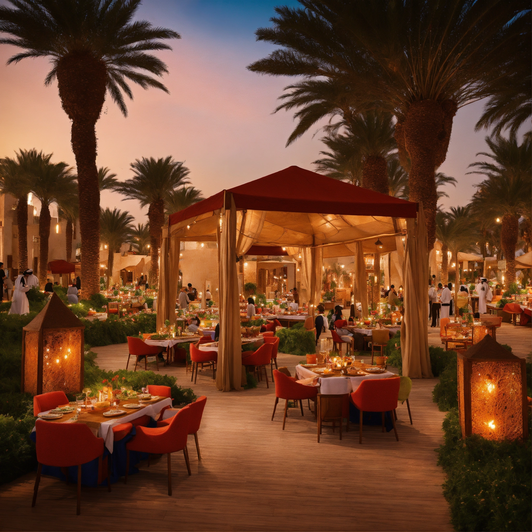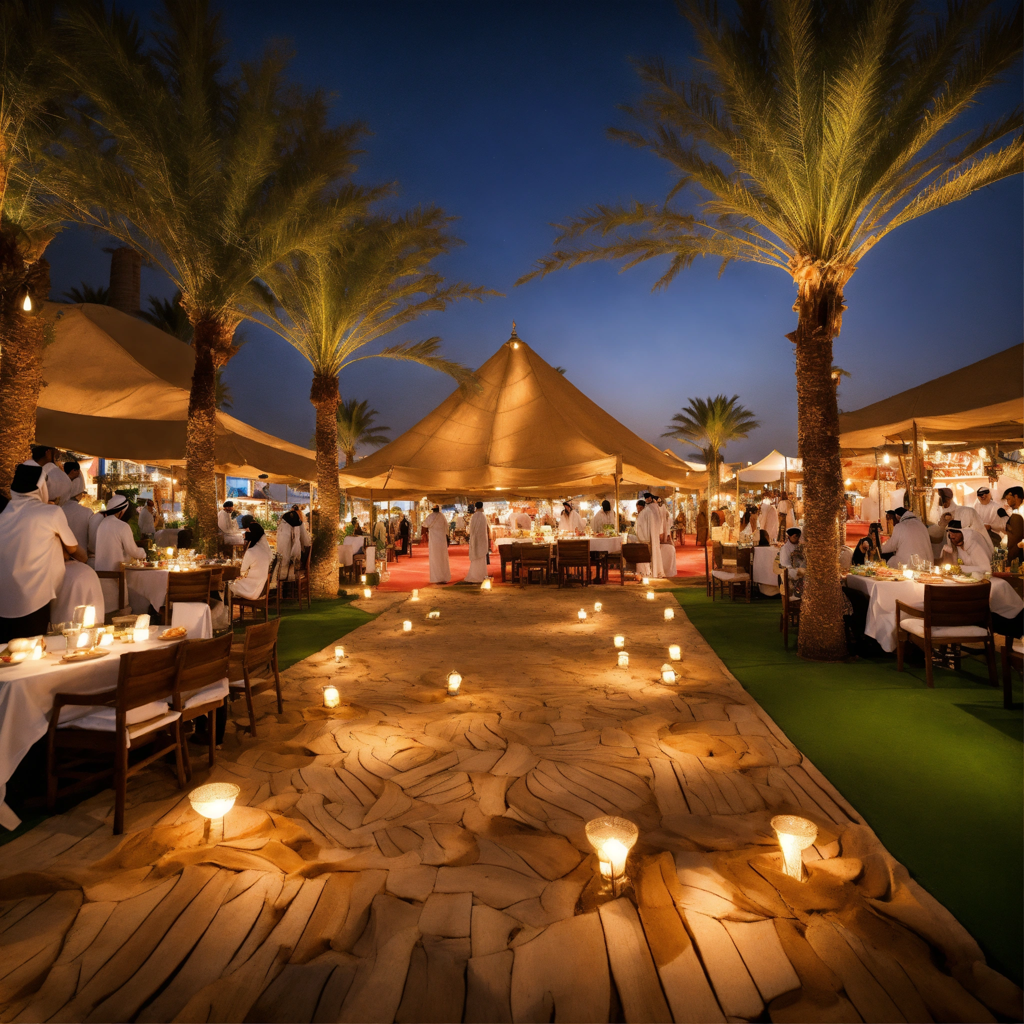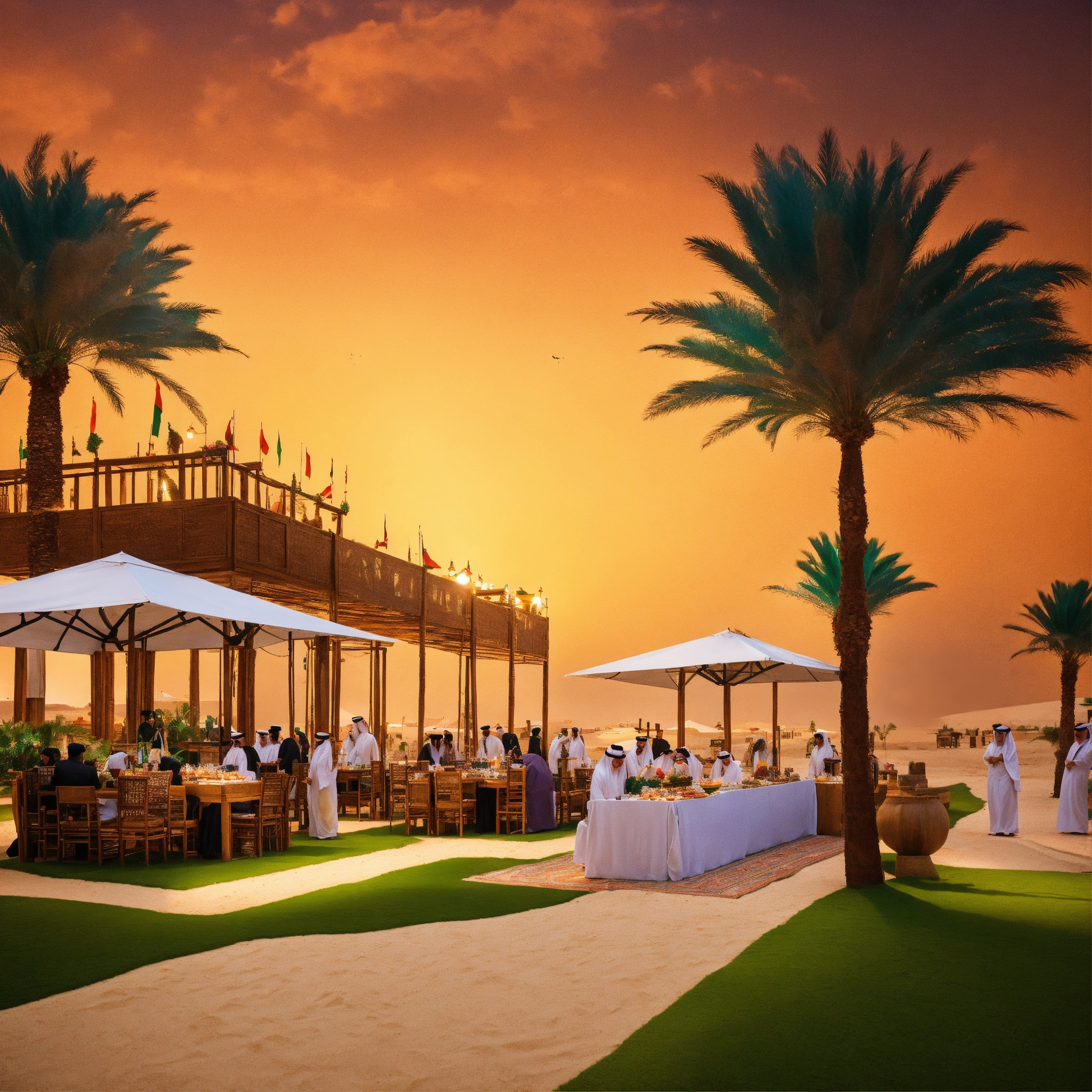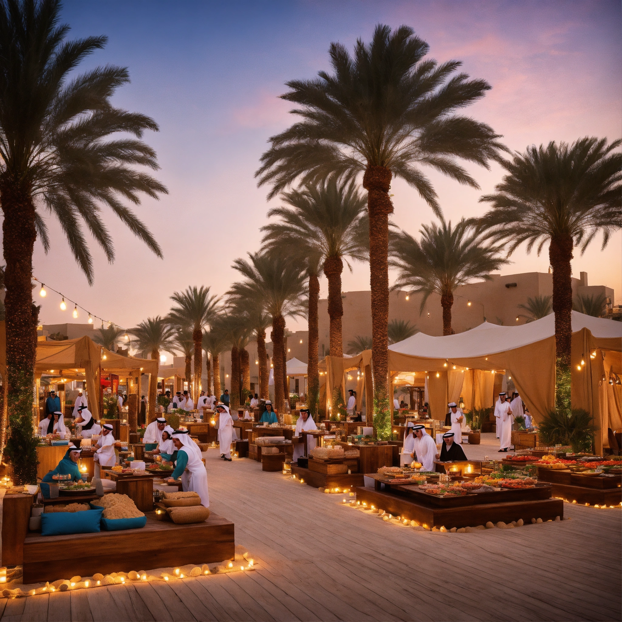 Visualize a vibrant scene at the 'taste of bahrain' food festival, where traditional bahraini flavors and global influences merge. the setting resembles an arabian oasis with palm trees, set on a landscape-inspired flooring of sand, faux grass, and wooden decking. envision a culinary adventure that transcends boundaries."
