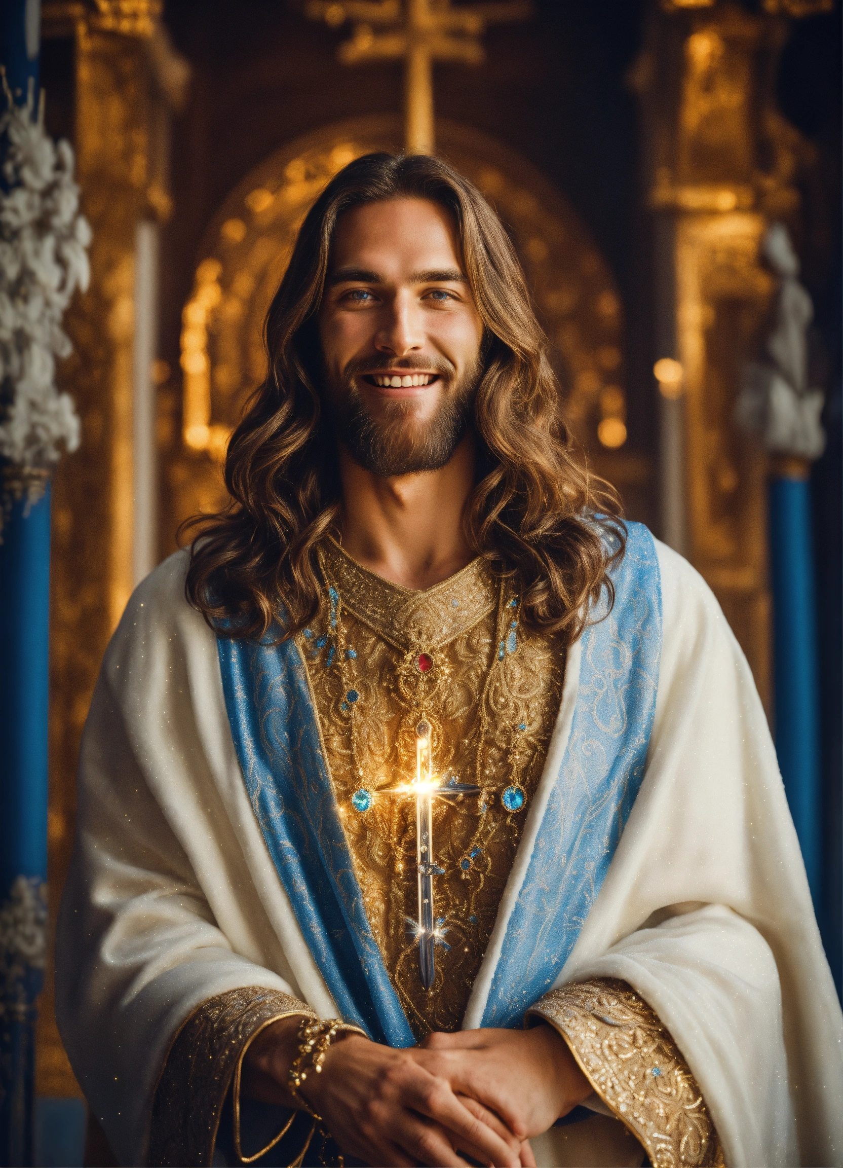 Iconoclastic surreal triumphant photo portrait of gorgeous handsome fit joyous kind-faced masculine glorified jesus christ supermodel white blissfully joyous, gentle loving smile and staring lovingly straight ahead directly into camera at me, long brown hair and trimmed beard, brilliant glowing blue eyes centred on me, wearing sparkling intricately designed white and blue kingly robes over a sparkling tunic with high neckline, symmetrical, iconic, striking, award winning photo, powerful, glorious, emotional, editorial fantasy photoshoot, background is heavenly-lit sparkling crucifix. film grain.