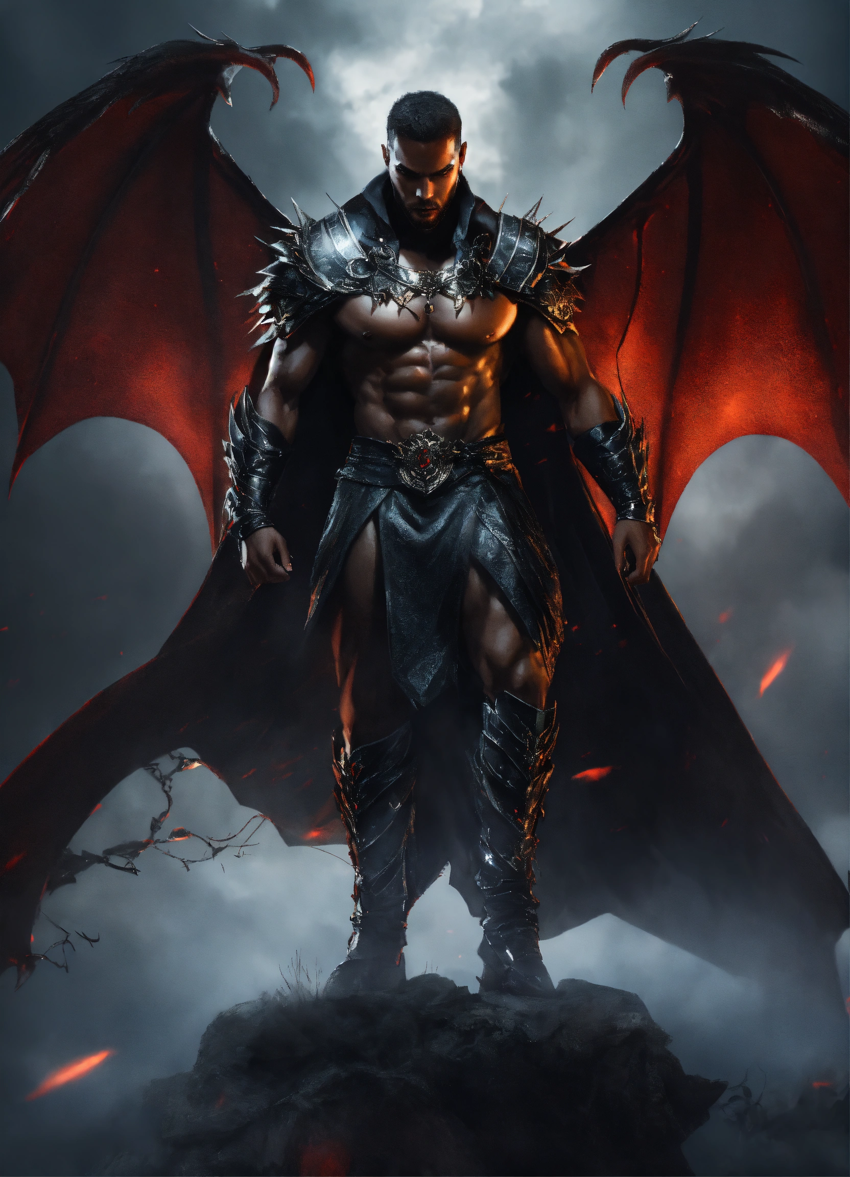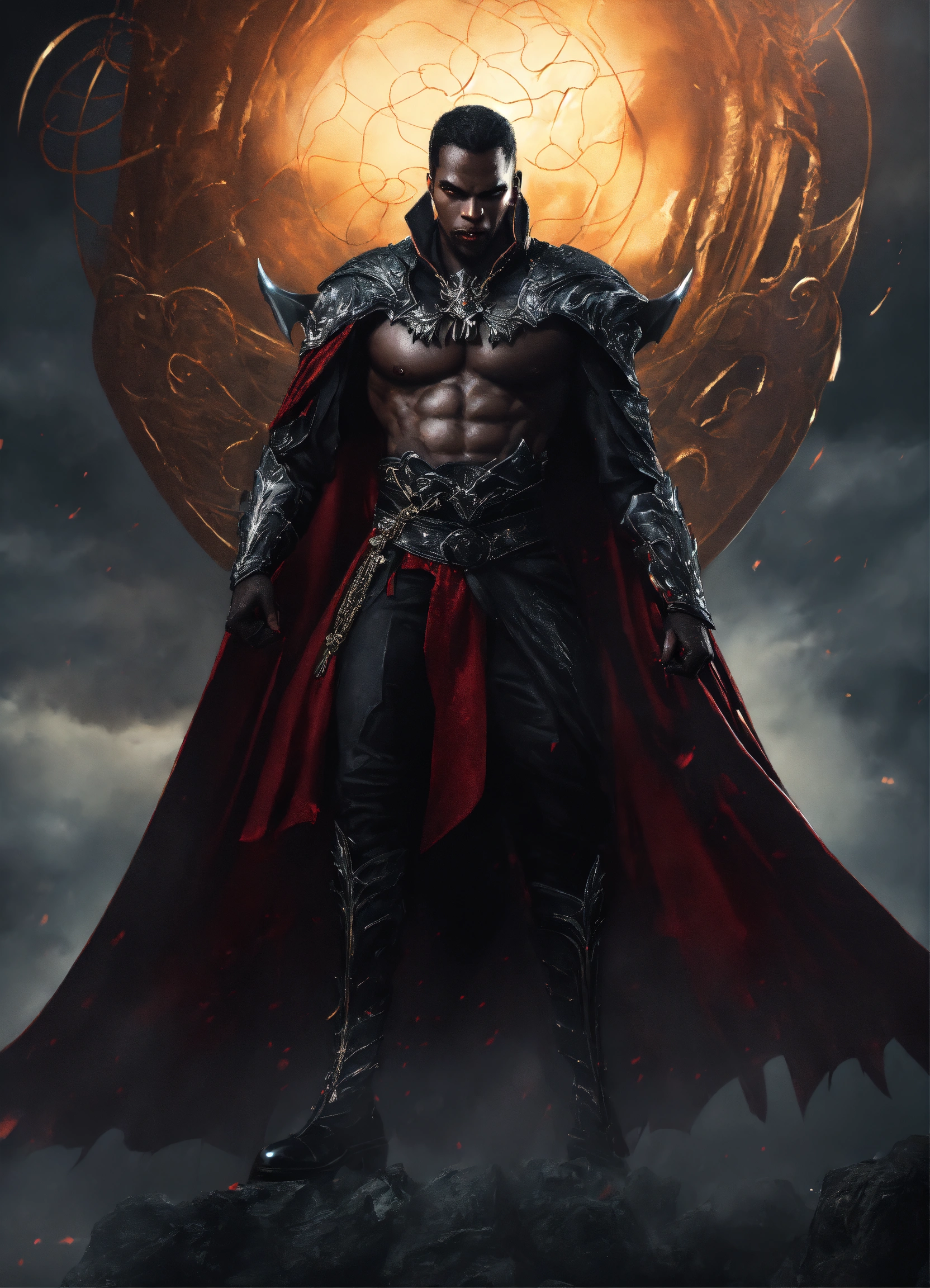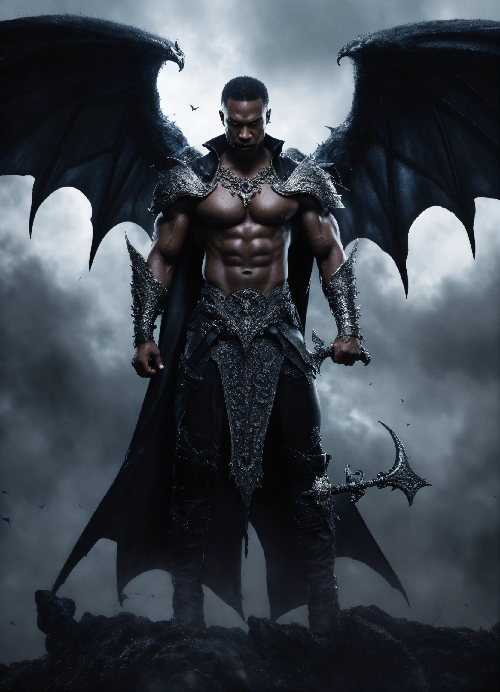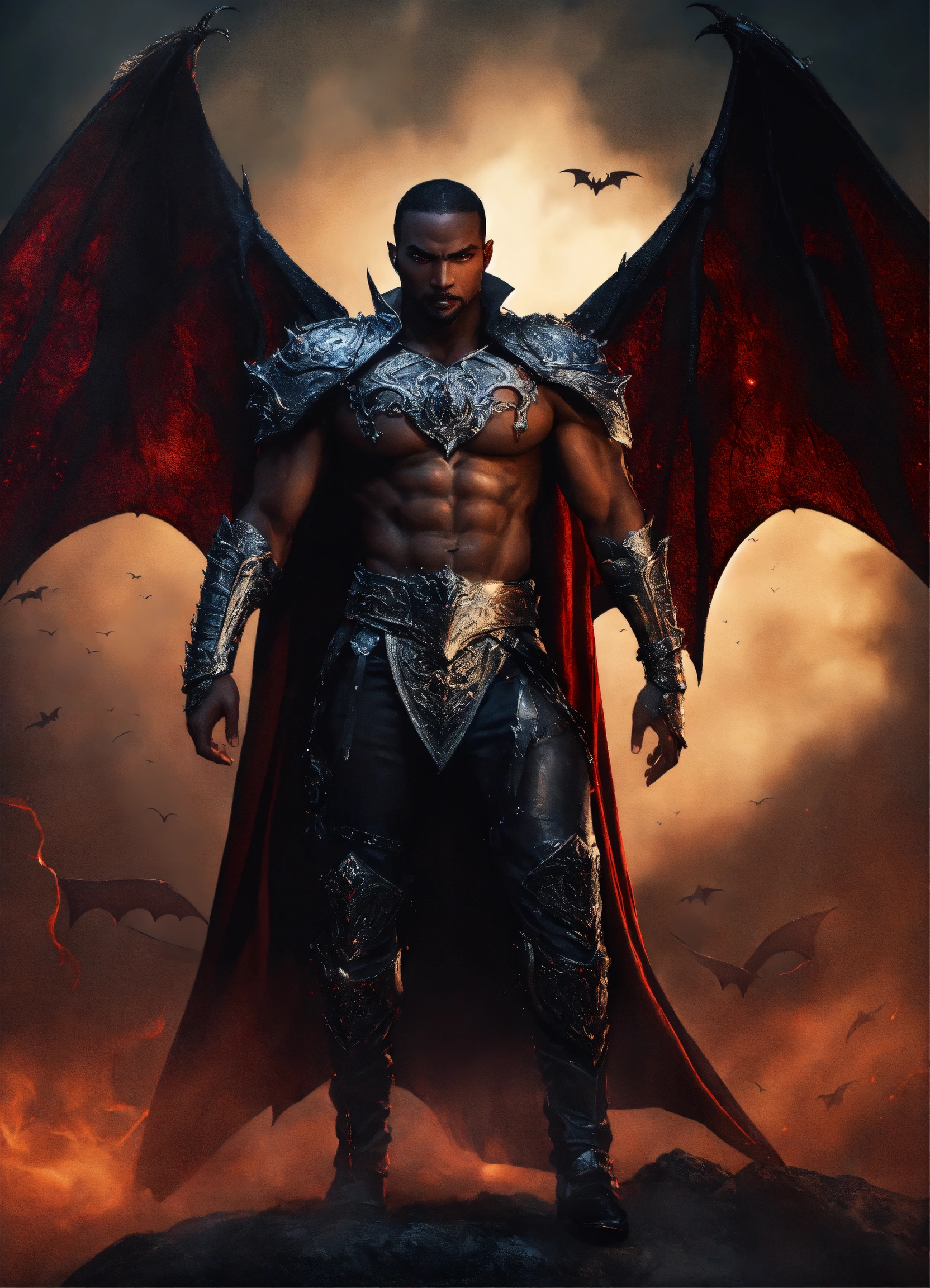 Full body strong muscular evil black male vampire king entangled in a dark mist spiral, huge muscular attractive evil black vampire man with bat wings entangled in a dark mist spiral, fully clothed wearing silver warrior armor, floating in the sky, fantasy, high detail, realistic photo, high detail, digital painting, cinematic, stunning, hyper-realistic, sharp focus, high resolution 8k, insanely detailed
