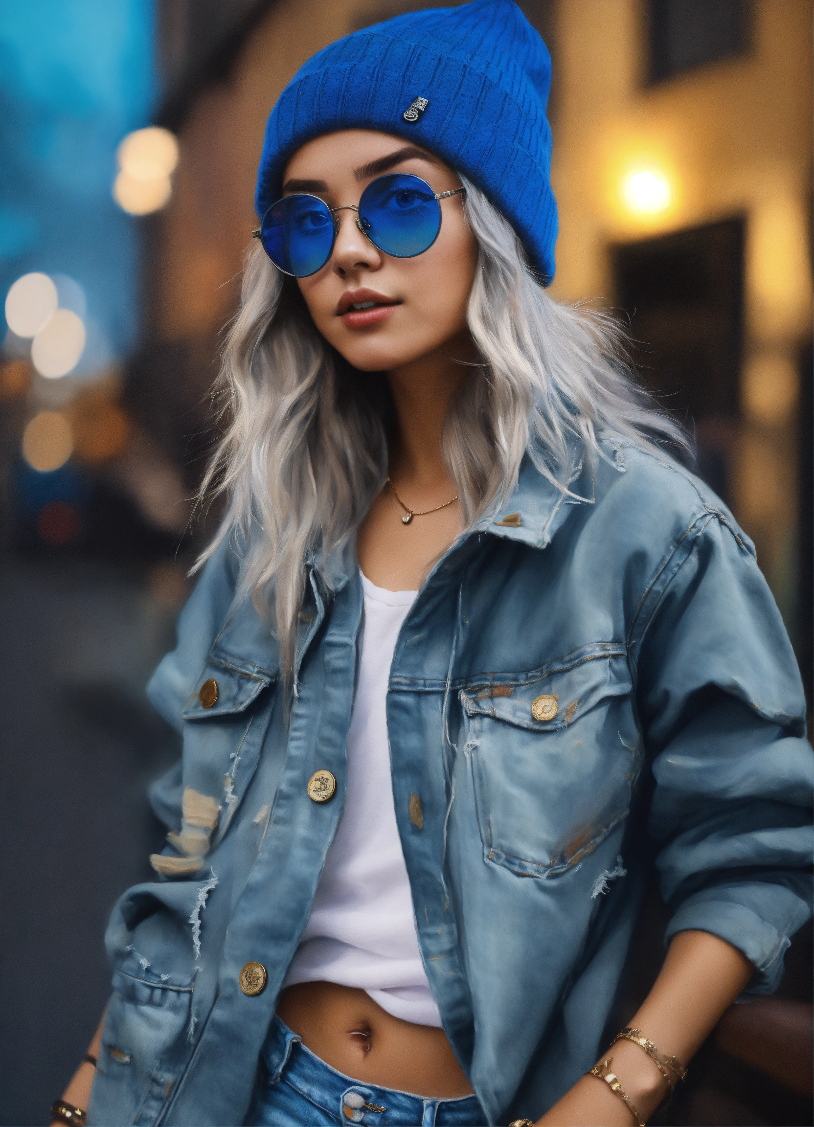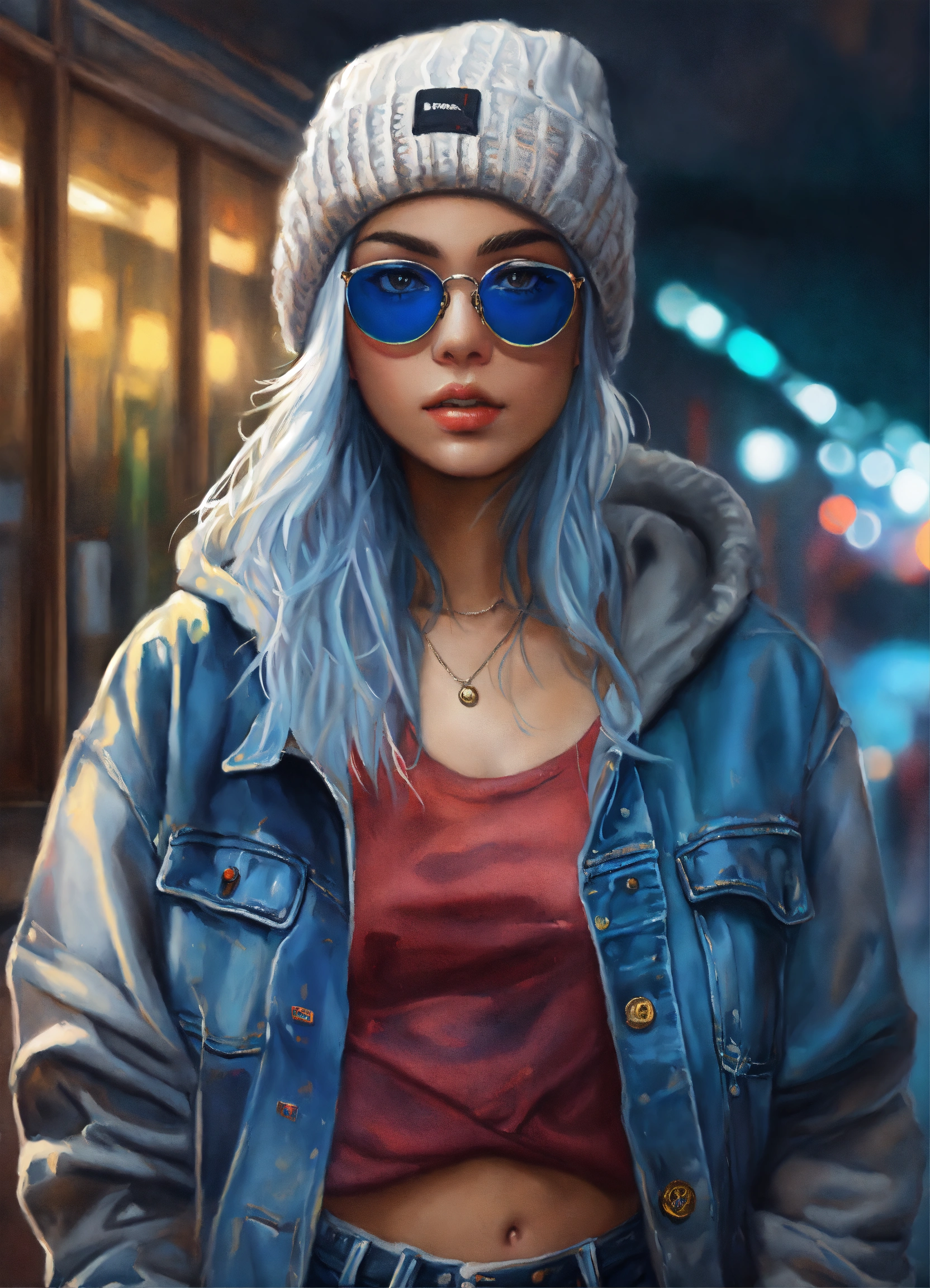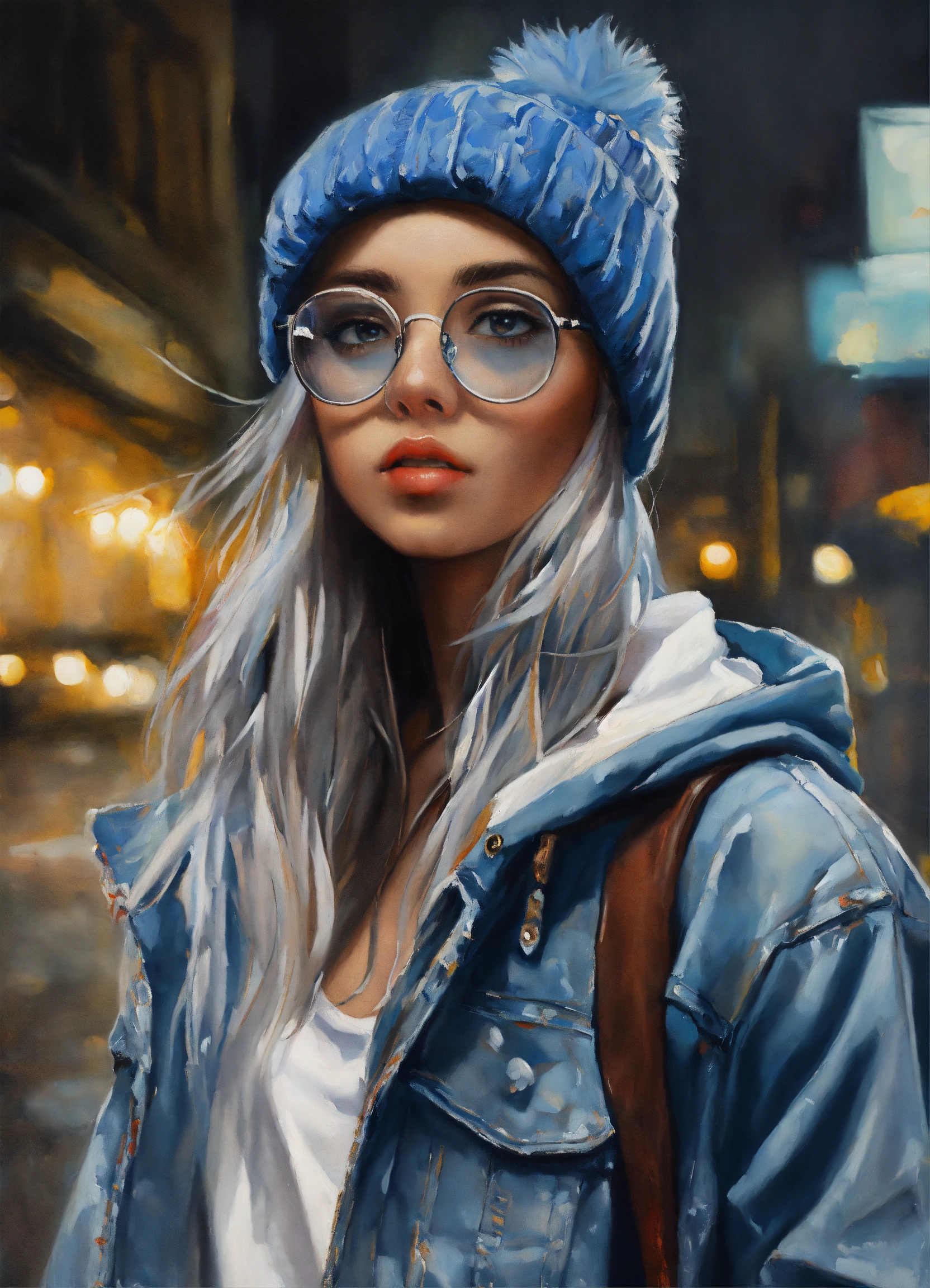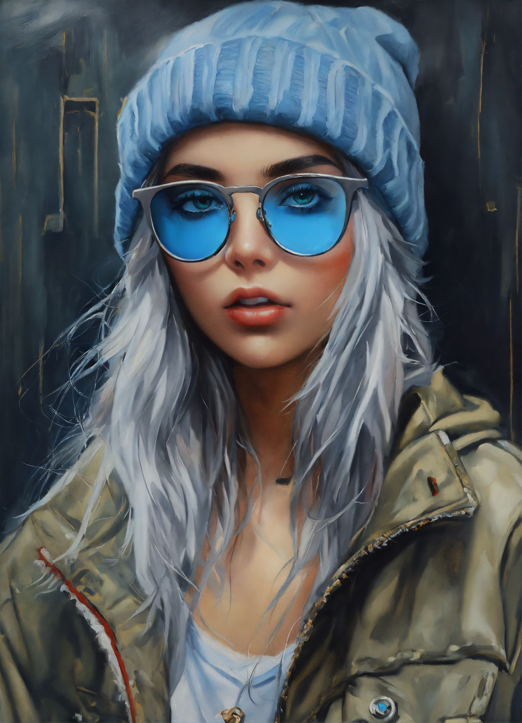 Cute female realistic oil painting hacker with blue colored glasses, in a jacket with a beanie long grey hair half teeshirt ripped jeans.