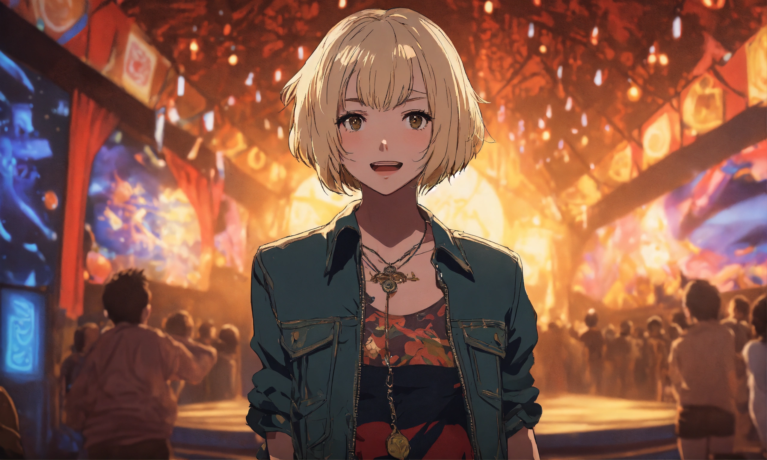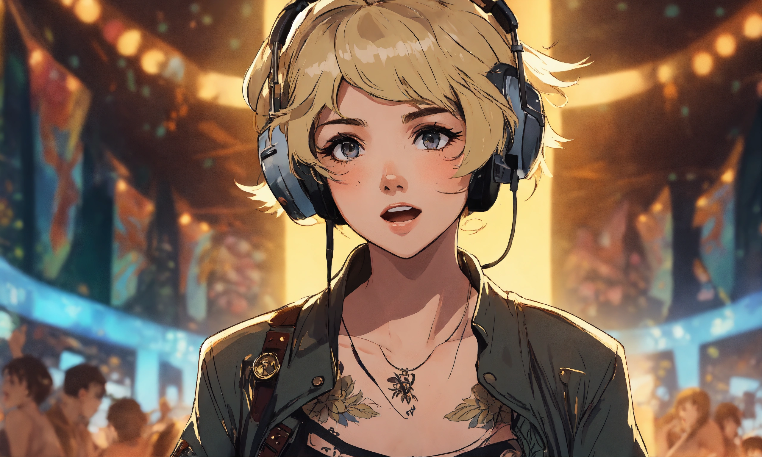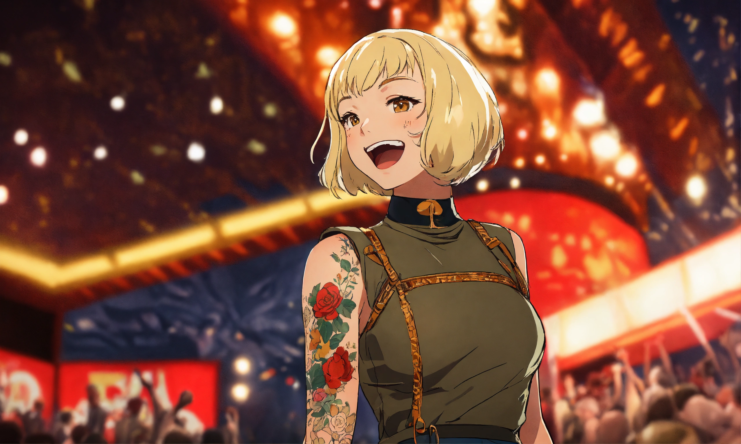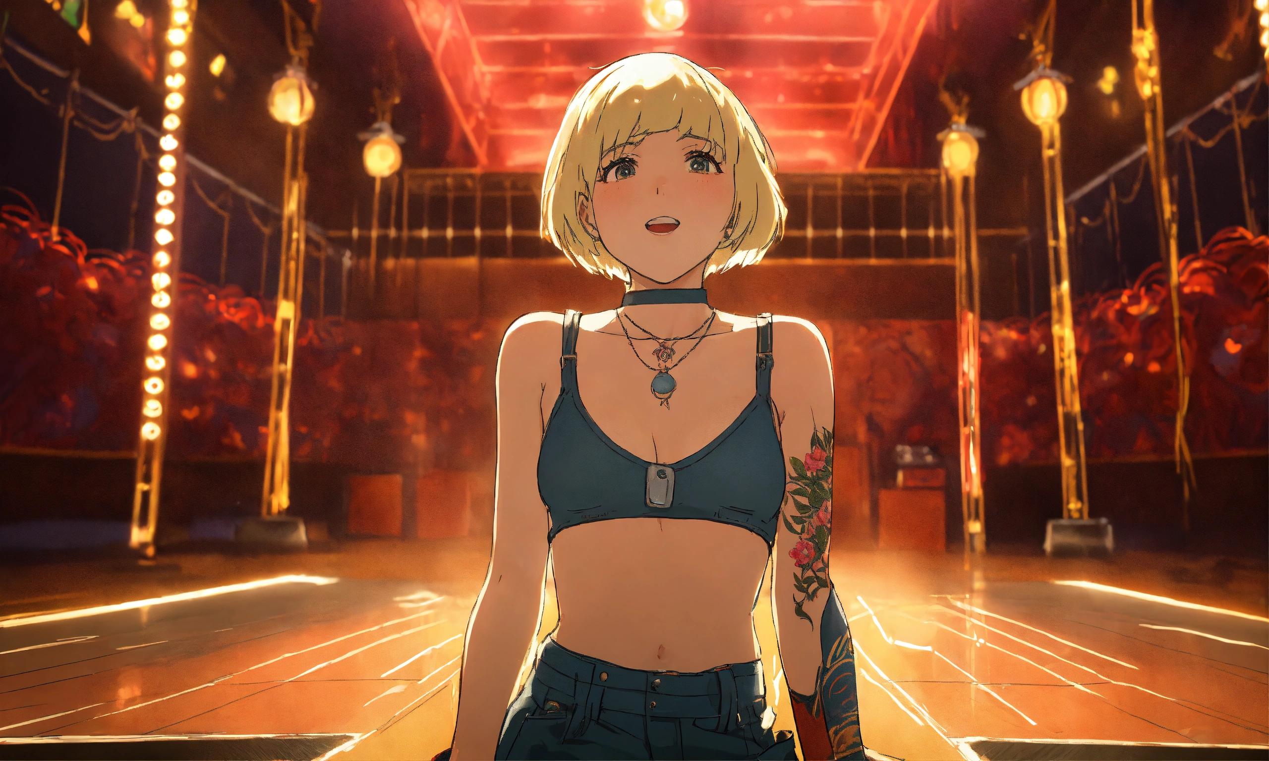 In a studio ghibli-inspired style, depict a blonde girl with a short haircut and tattoos passionately shouting on a stage inside a club. she's clad in metal-inspired attire
