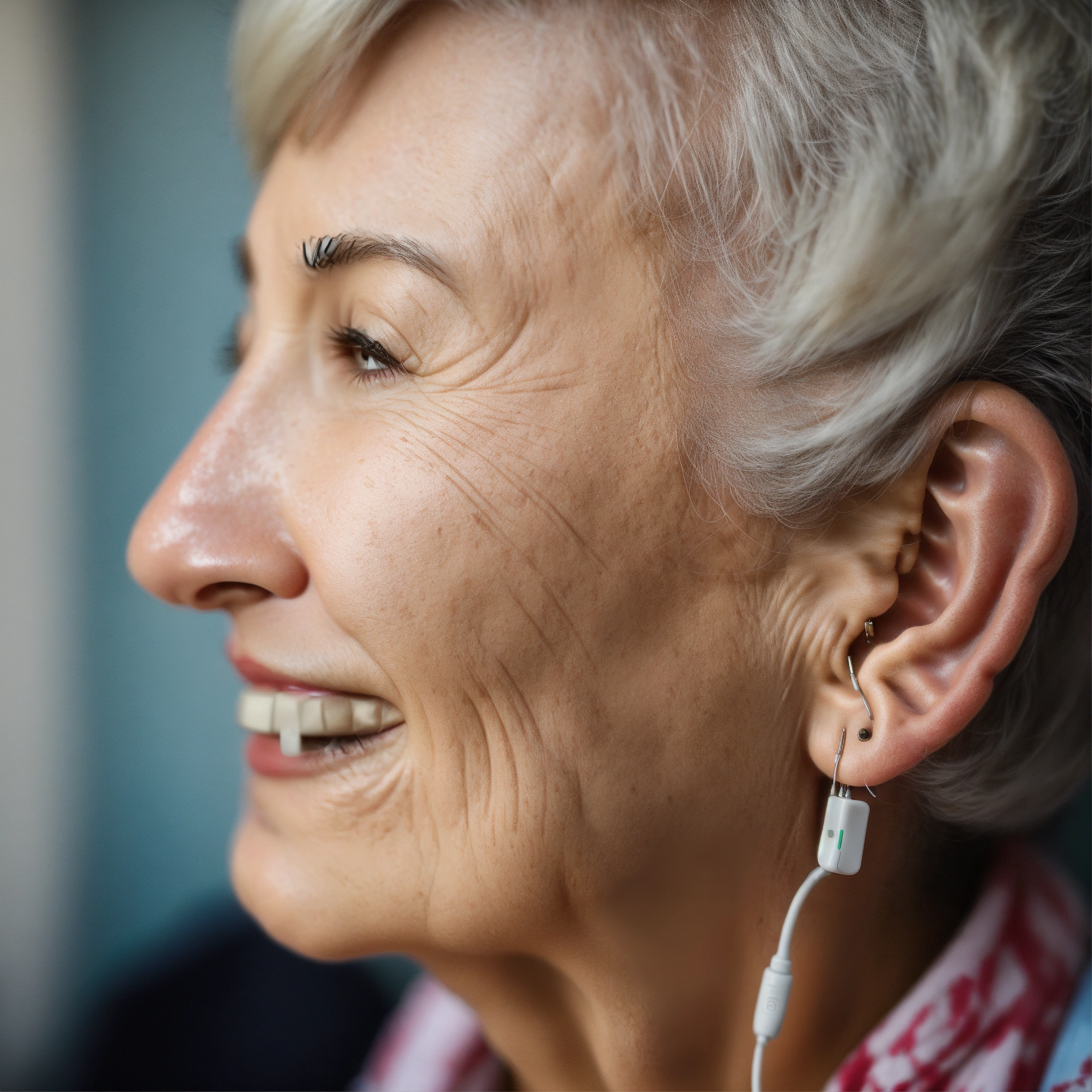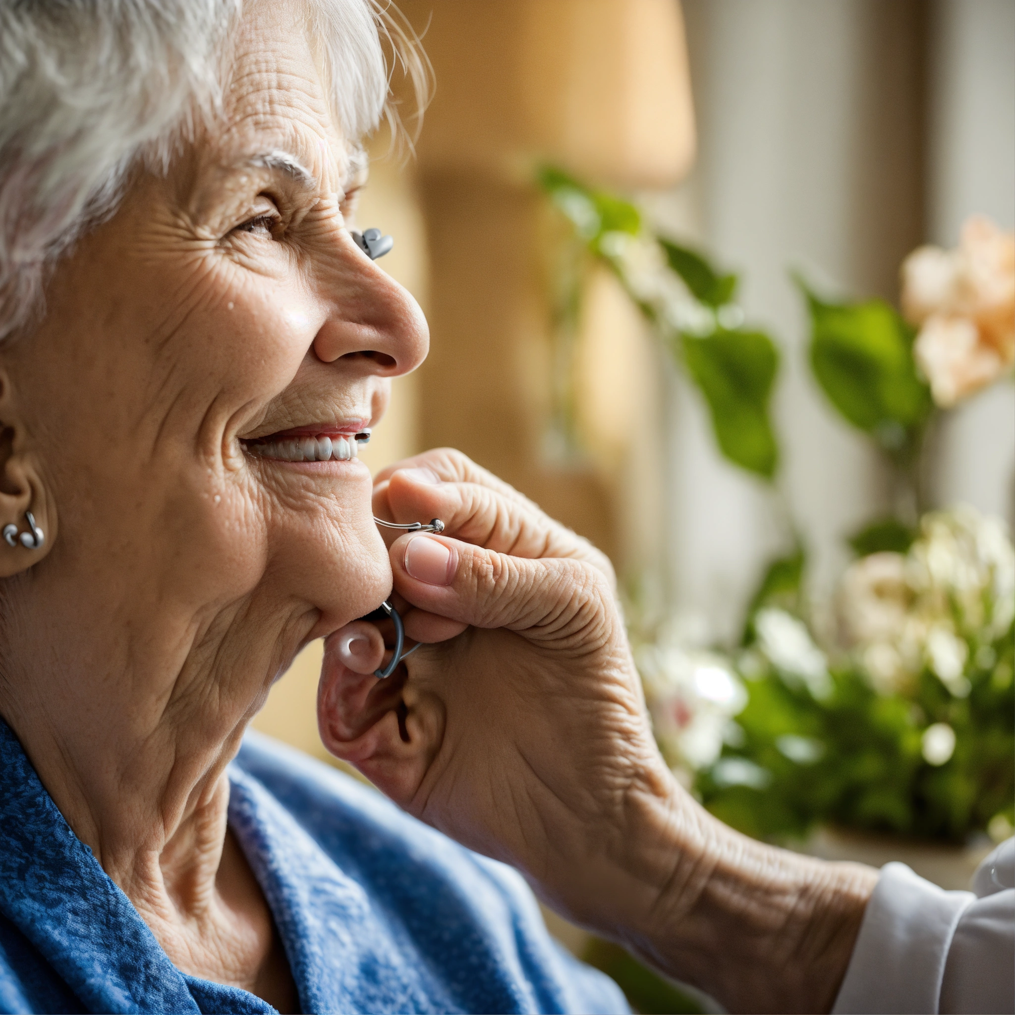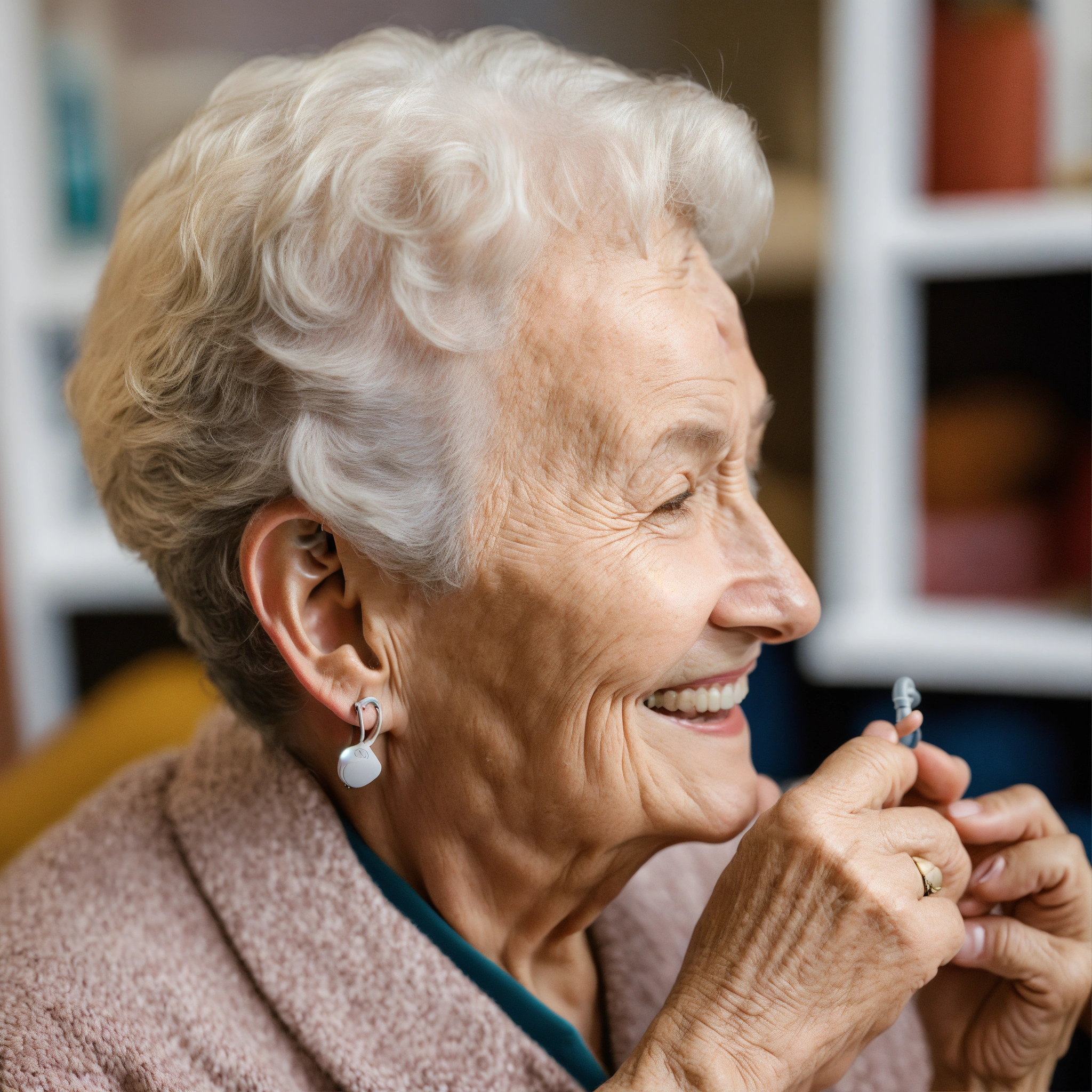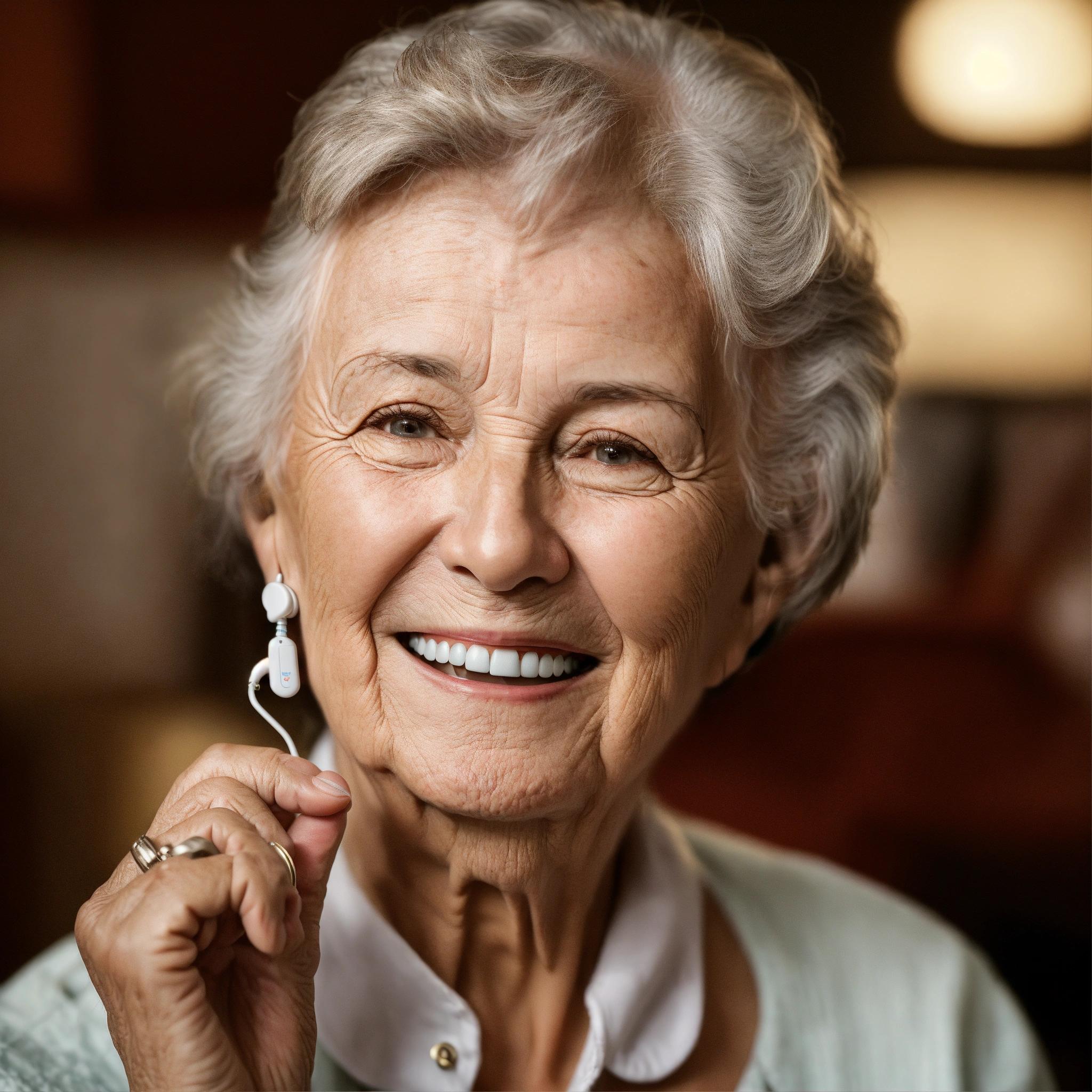 A photo of a hearing aid being worn by an elderly person. the hearing aid is small and discreet, and it is attached to the person's ear with a small wire. the person is smiling and looks happy.