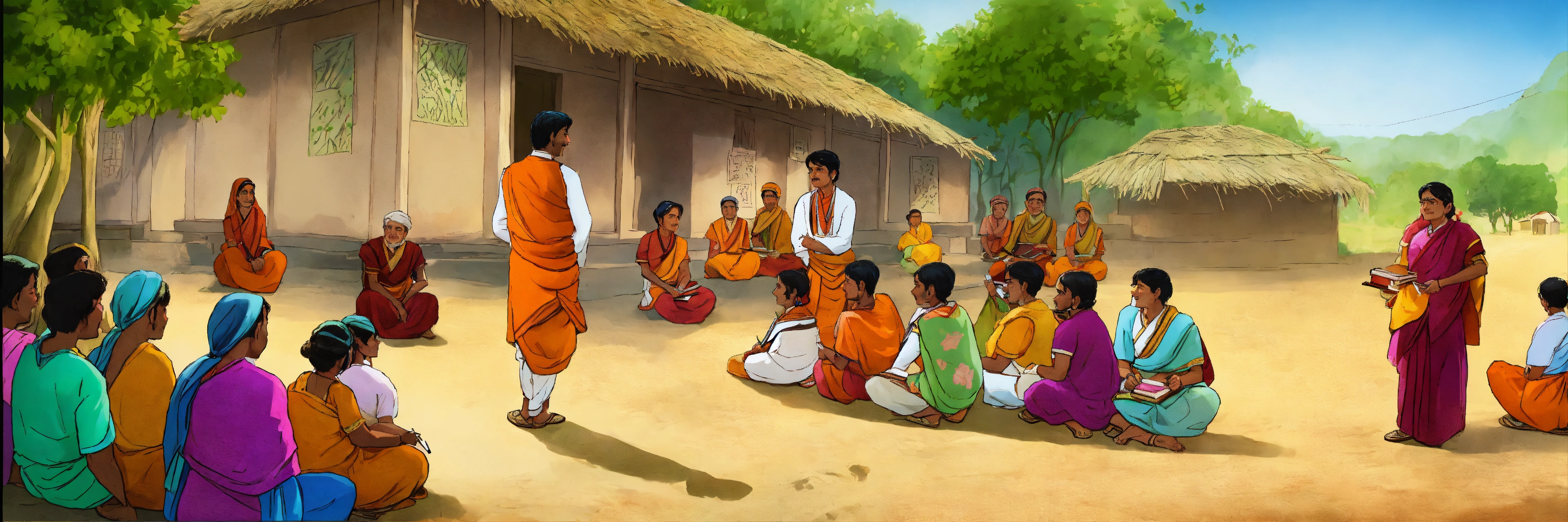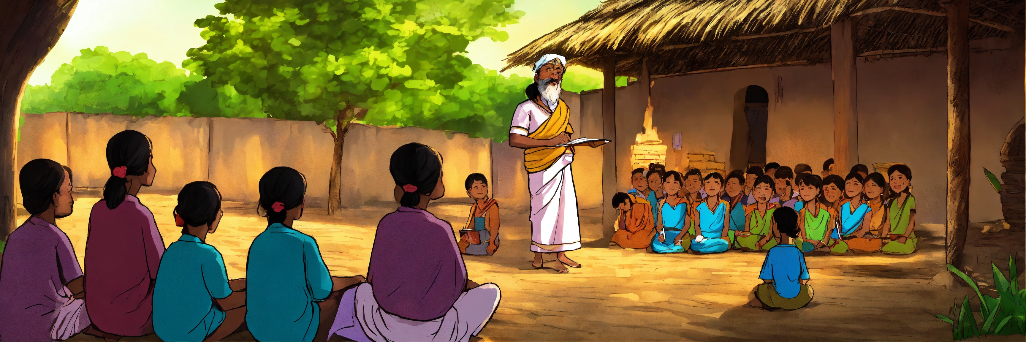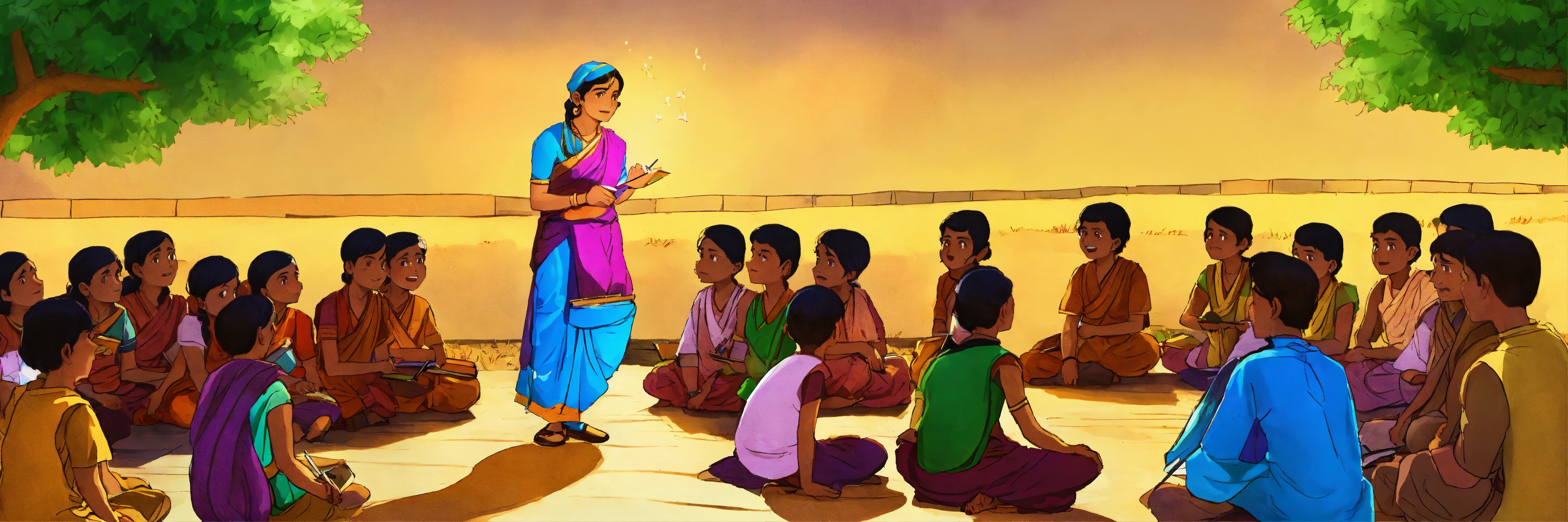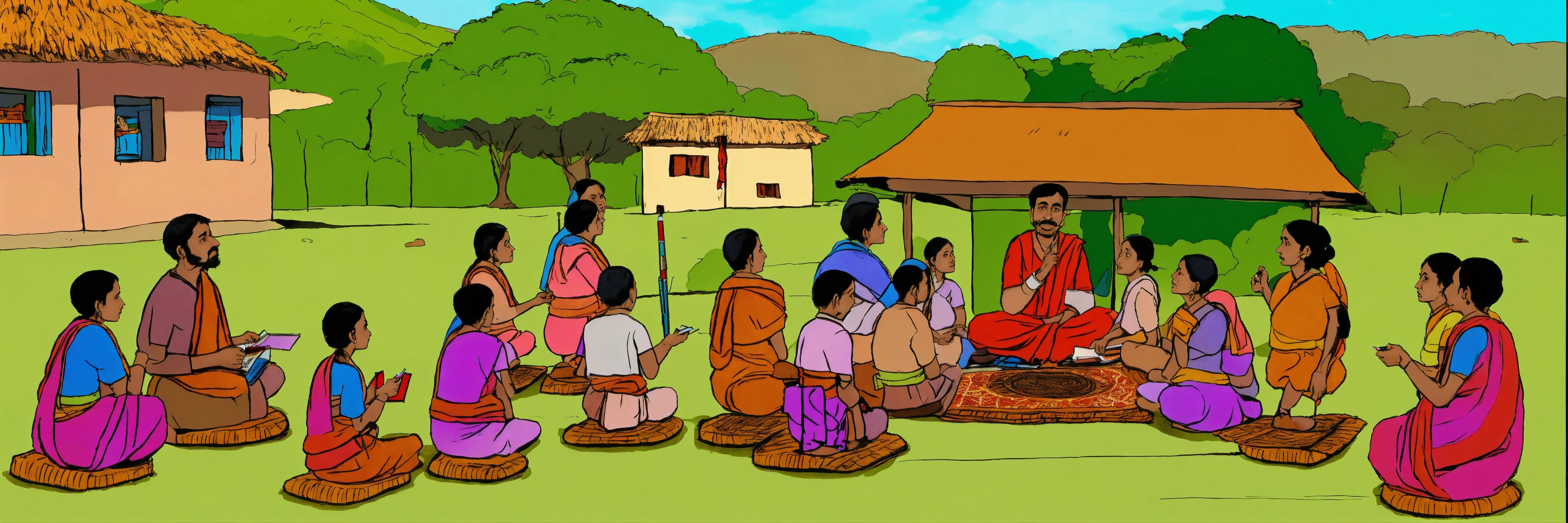The wise woman's offer raju inspiring the village this image portrays raju addressing a group of villagers seated in a circle in the village square. he stands at the center, sharing his ideas and dreams with enthusiasm. the villagers hold books, notepads, and pens, indicating their readiness to learn and contribute..in cartoon