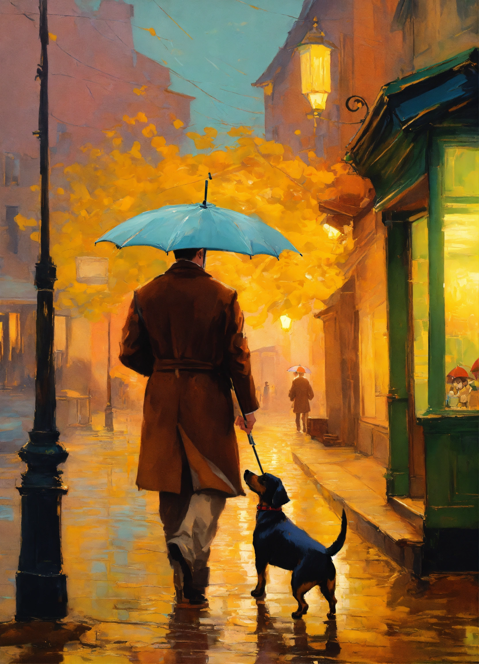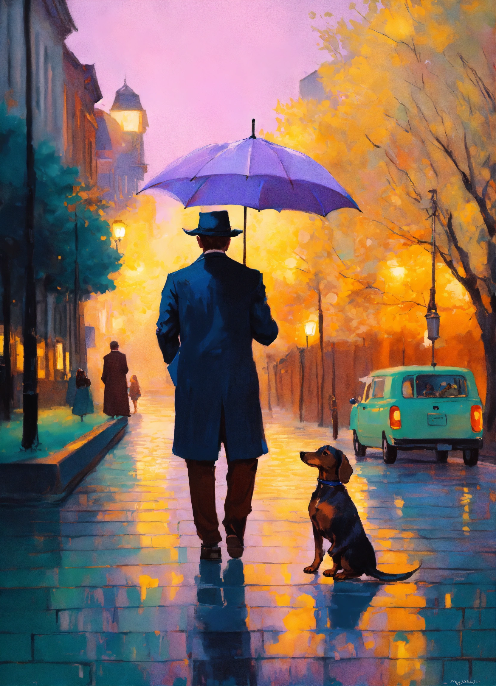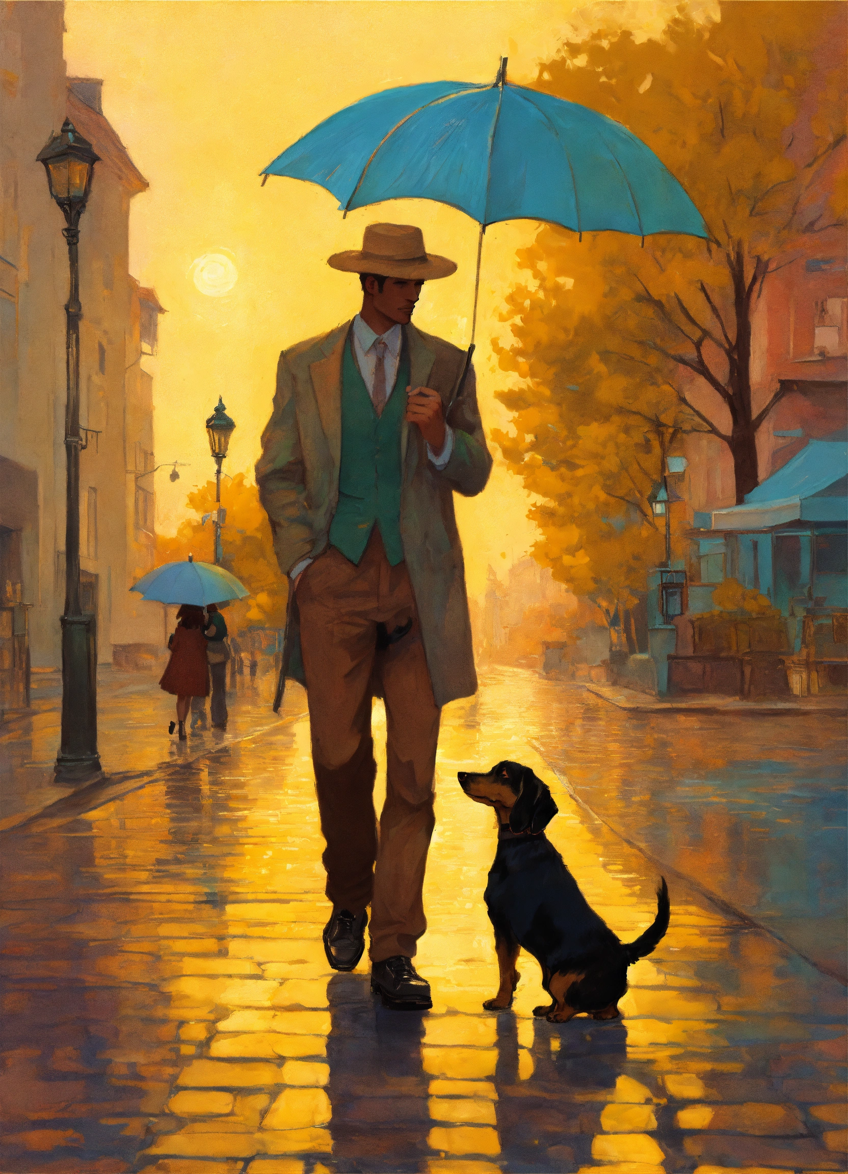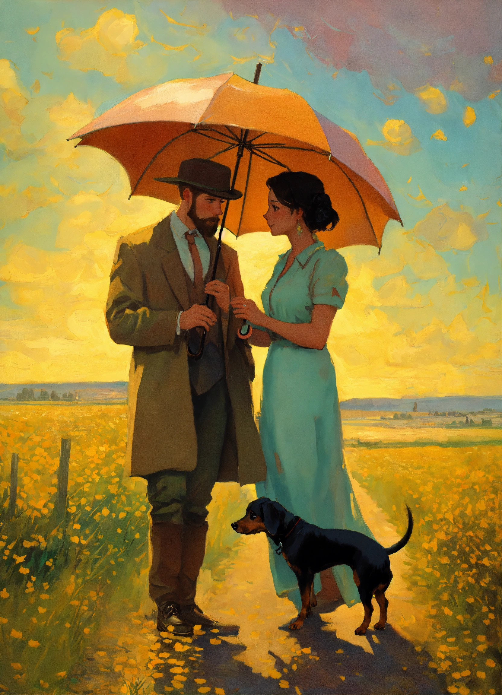 I want you to create a romantic couple with an umbrella and a mini dachshund, and in van gogh style and pastel colors greg rutkowski fantasy