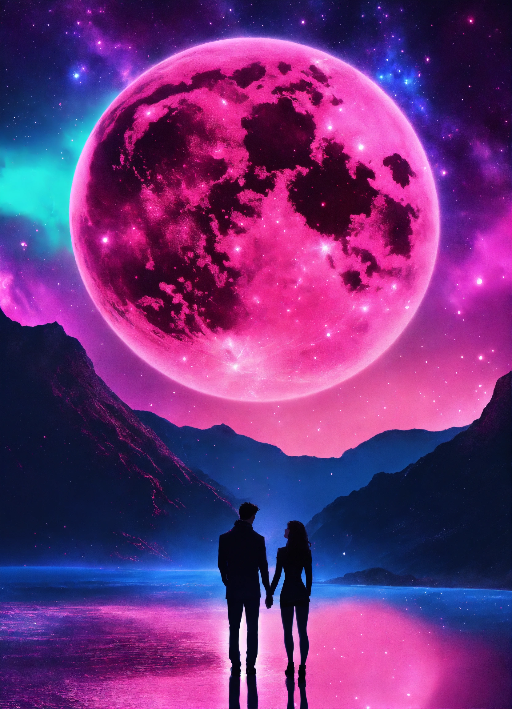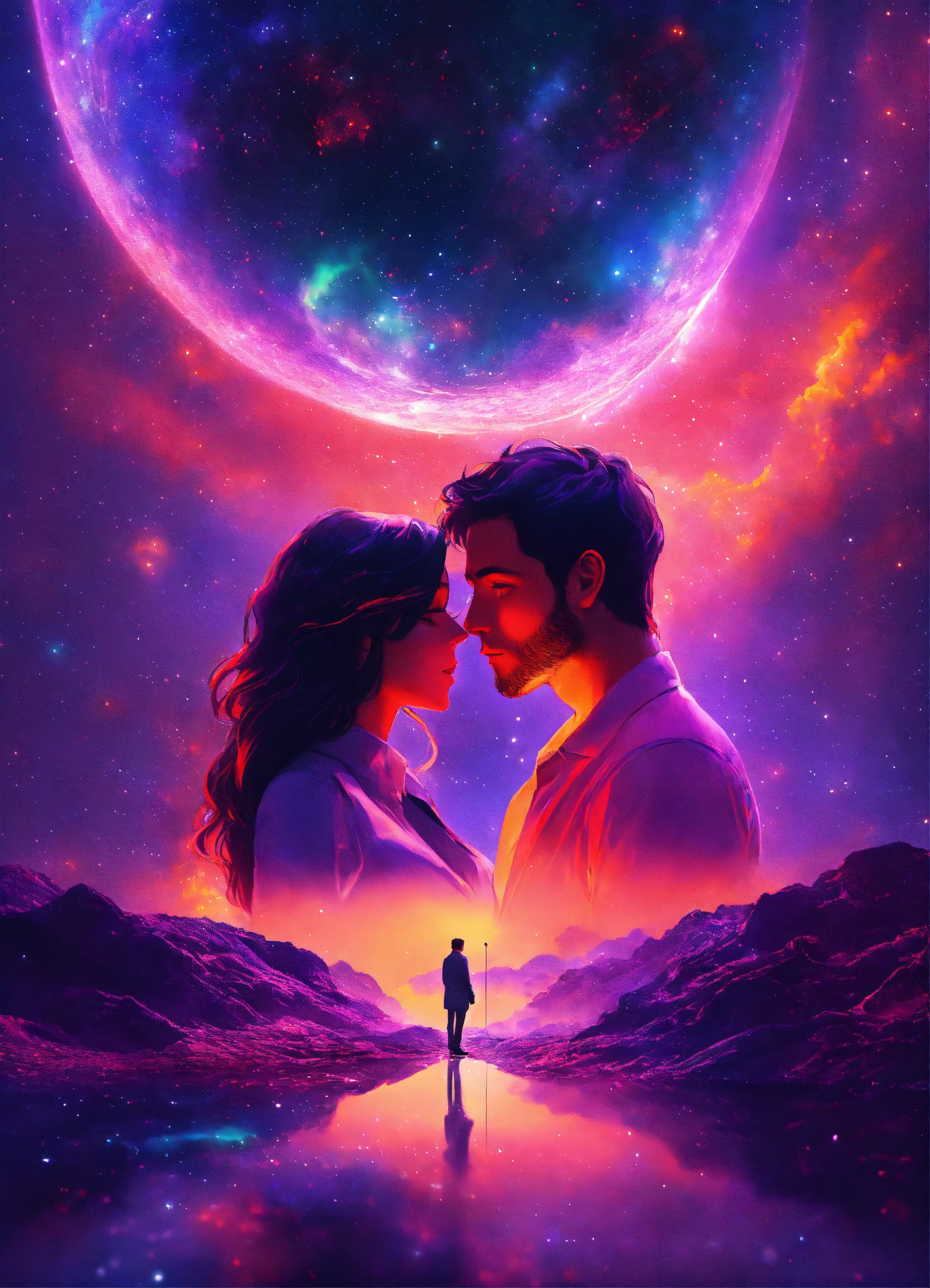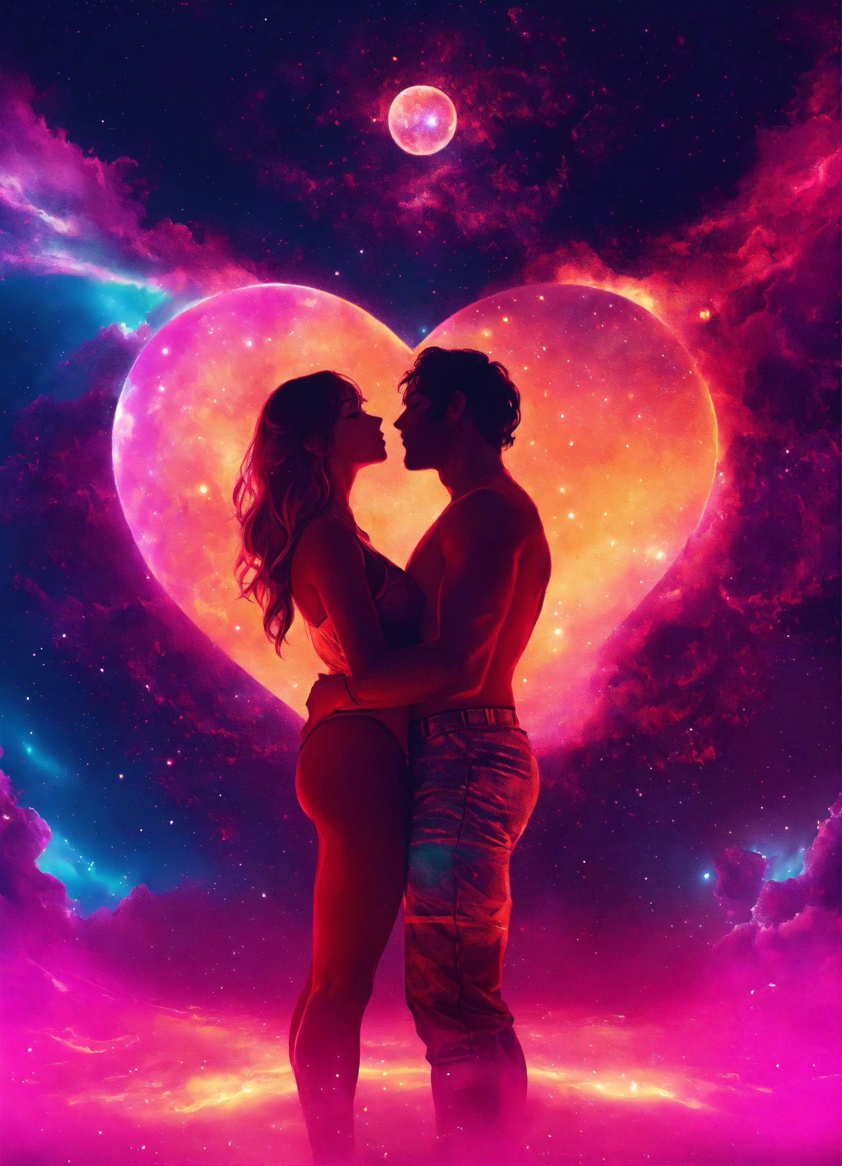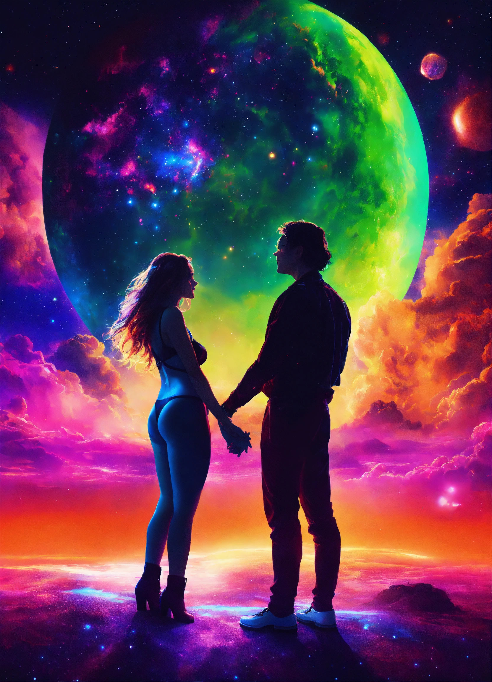 A woman and a man wearing underware in cosmos sharing love in a soulmate way watching a nebula sharing love in a soulmate way, neon lights lightly illuminate, cyberwave, future