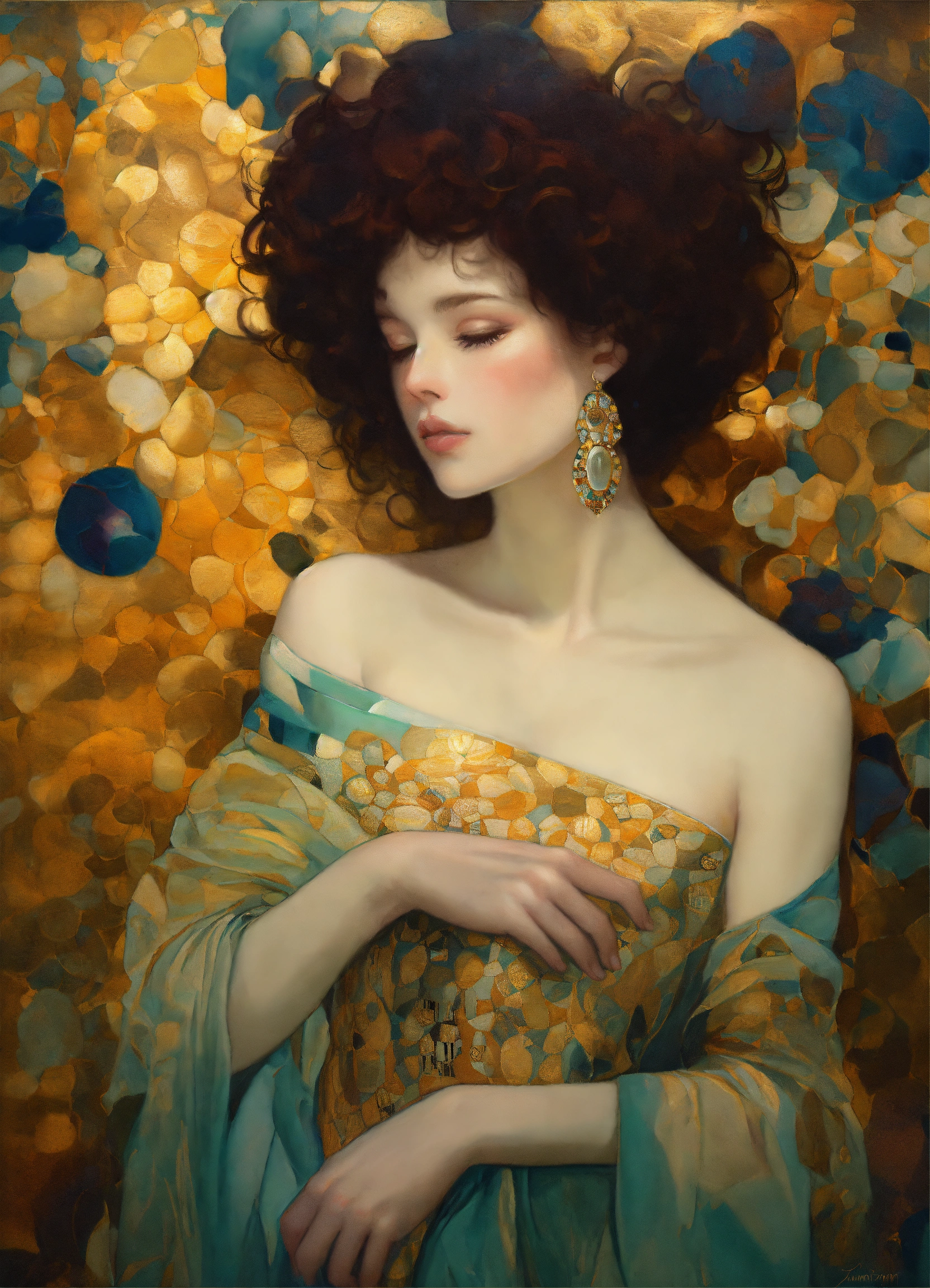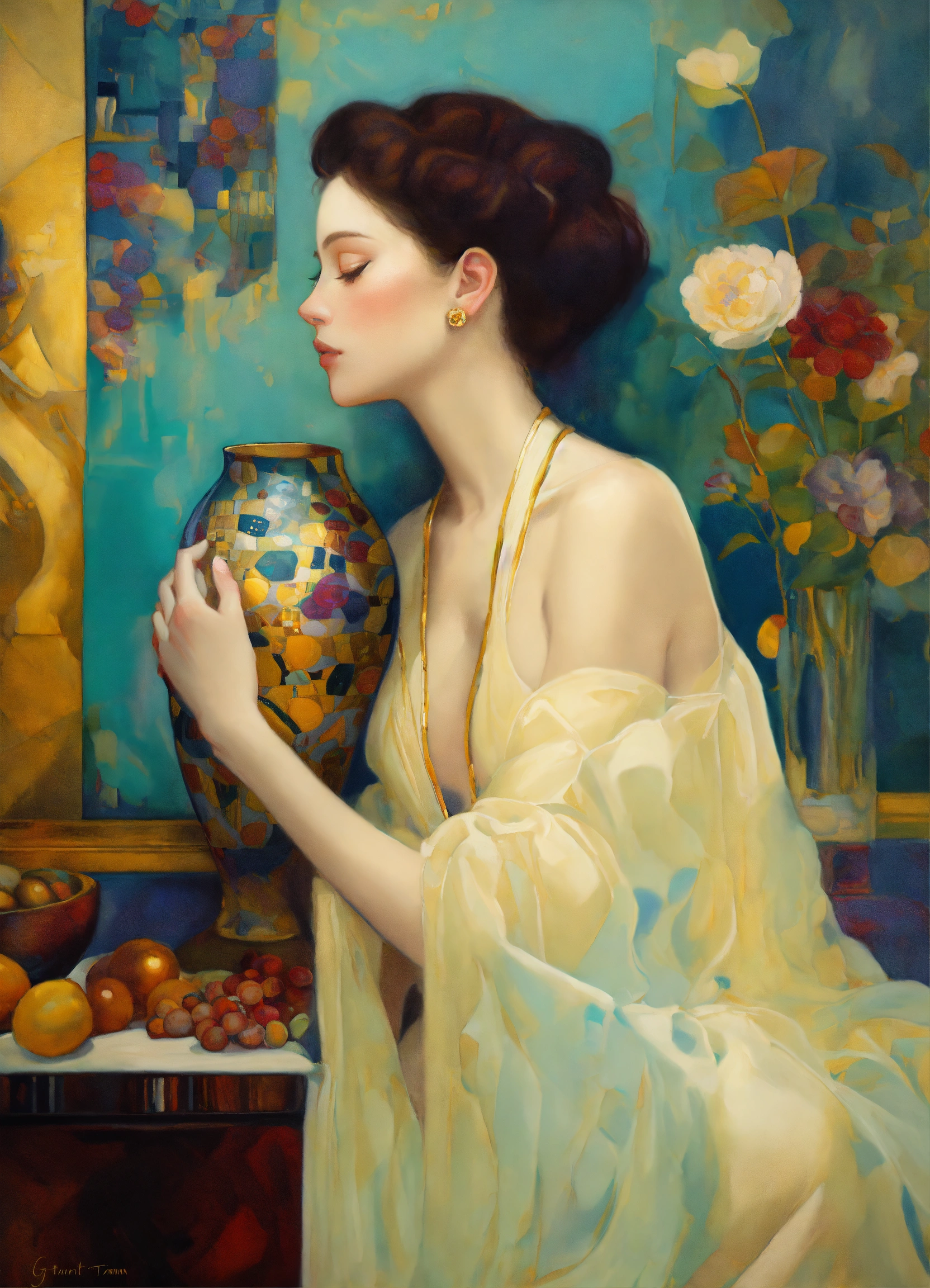 A breathtaking oil painting fashionable artist home interior setting, anatomically correct hands, by gustav klimt, by tarkay, by anna dittman