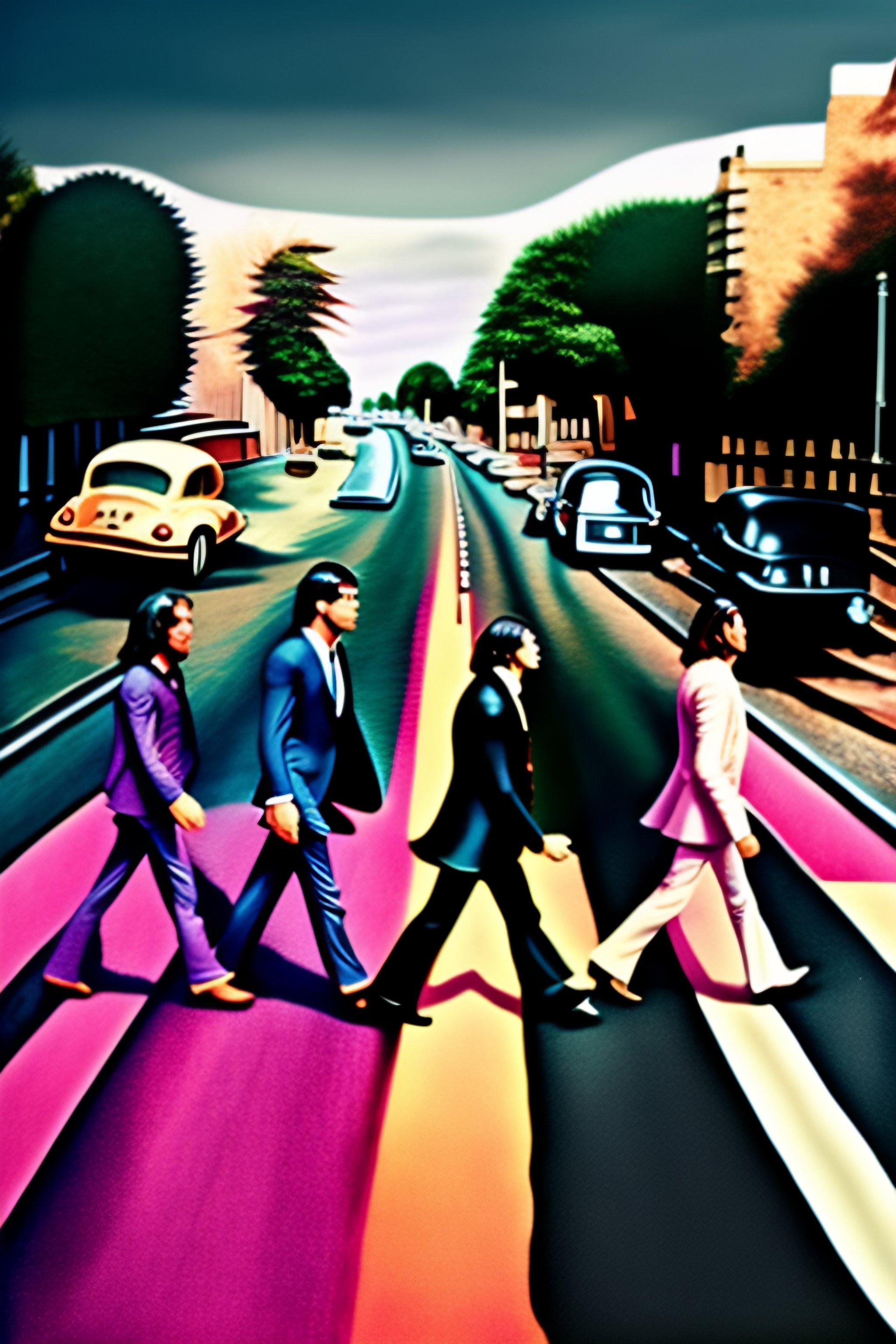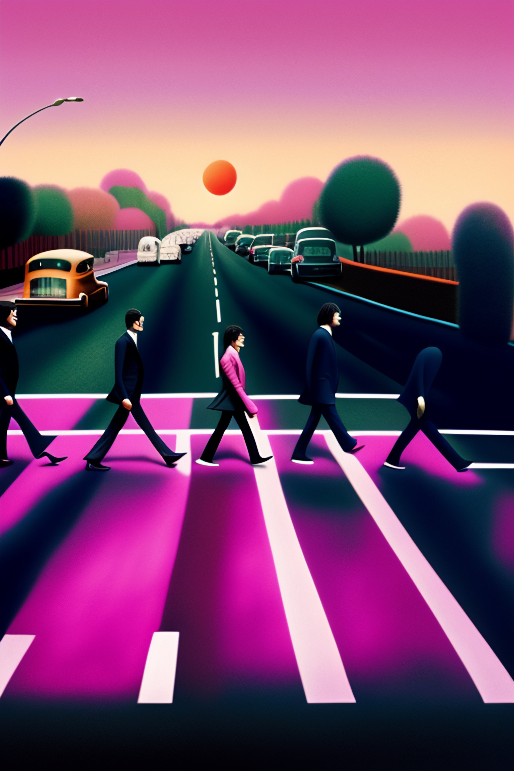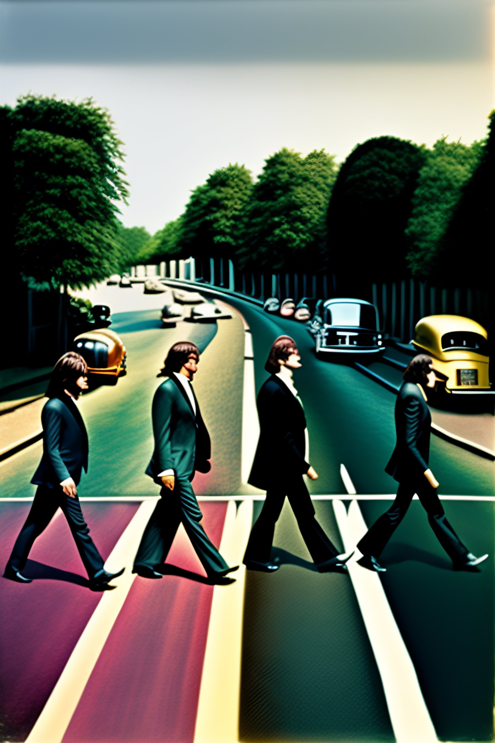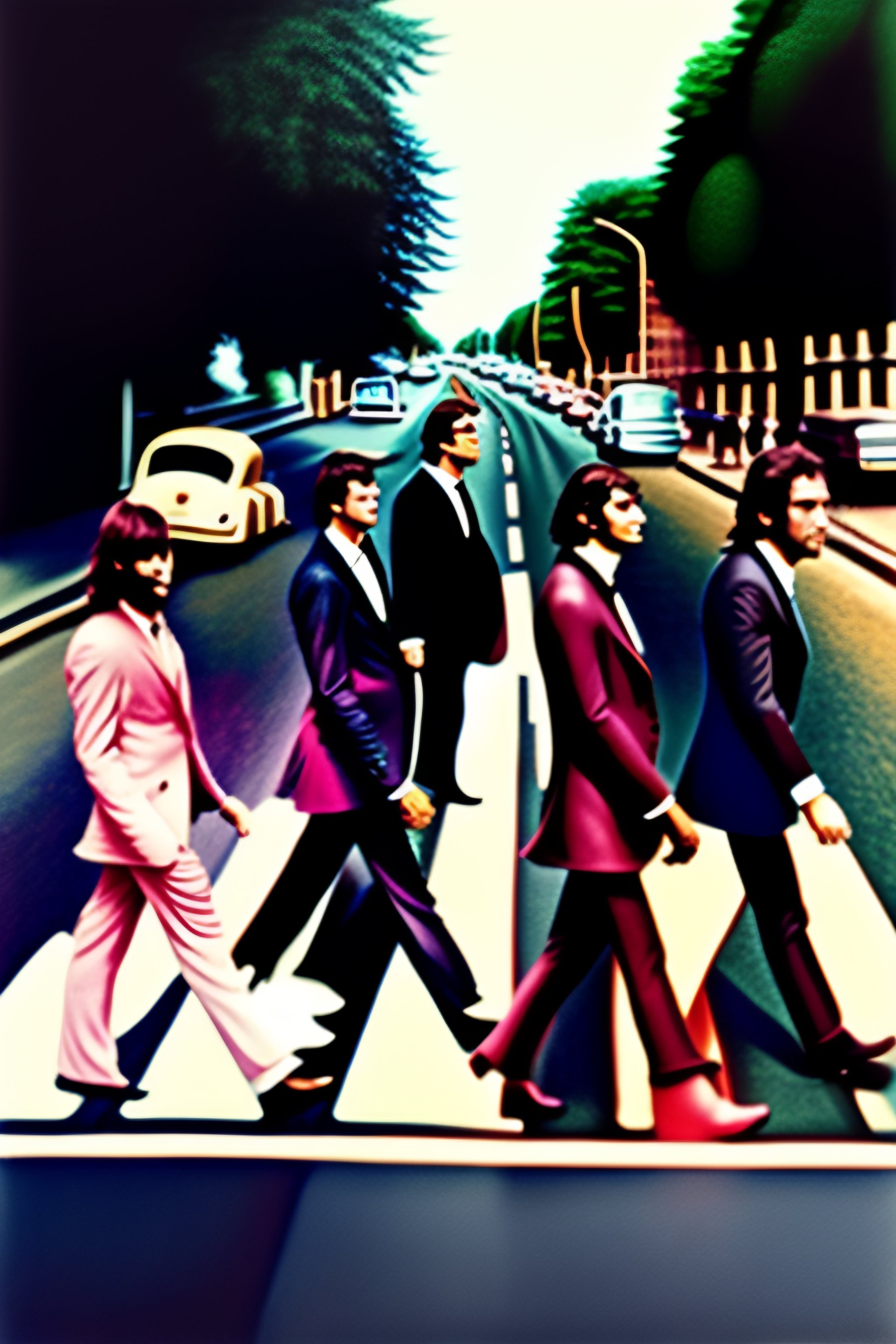 Pink floyd with all its band members crossing the abbey road street to copy the beatles abbey road cover