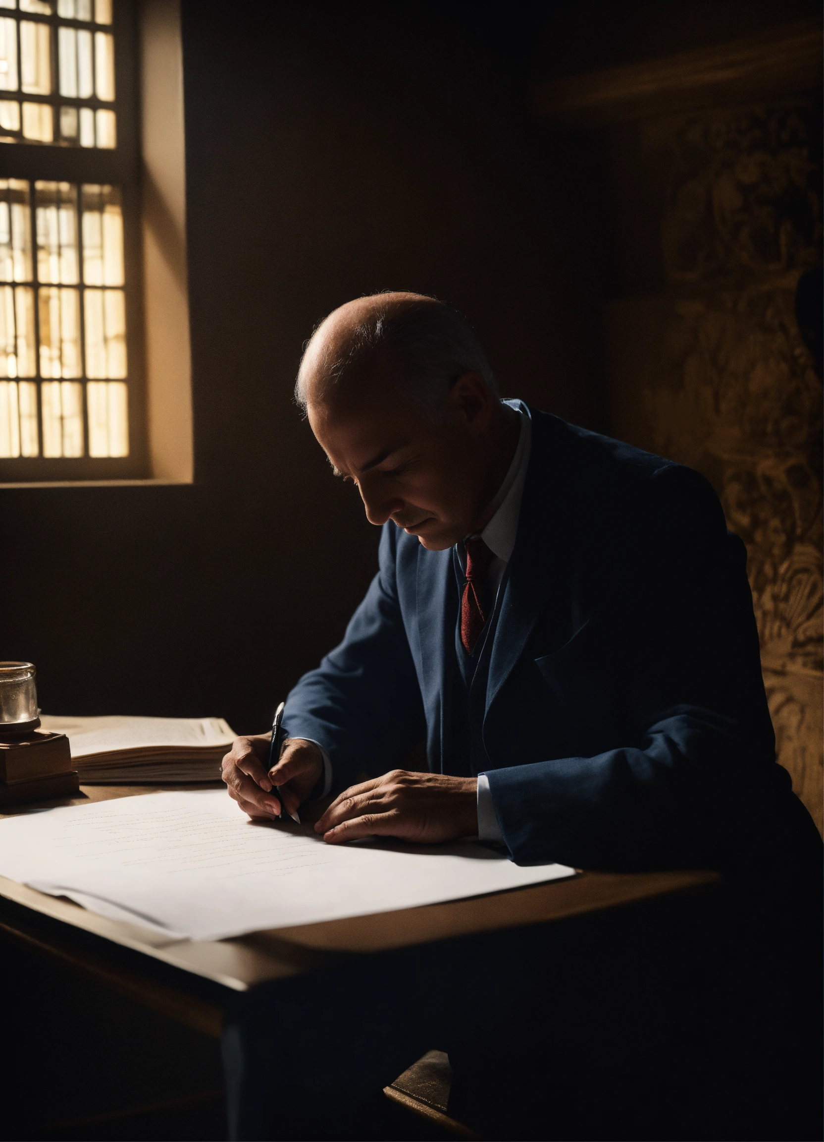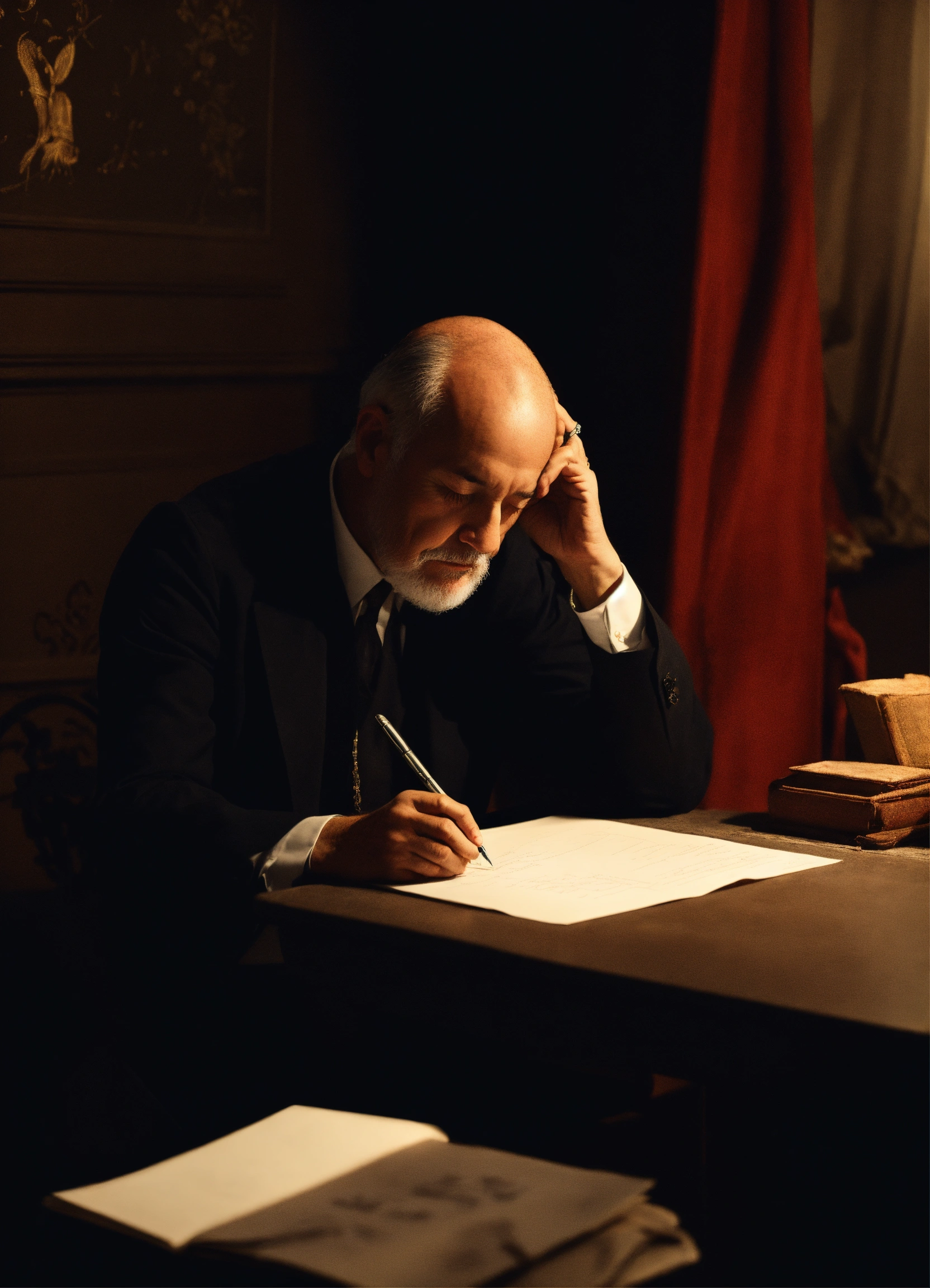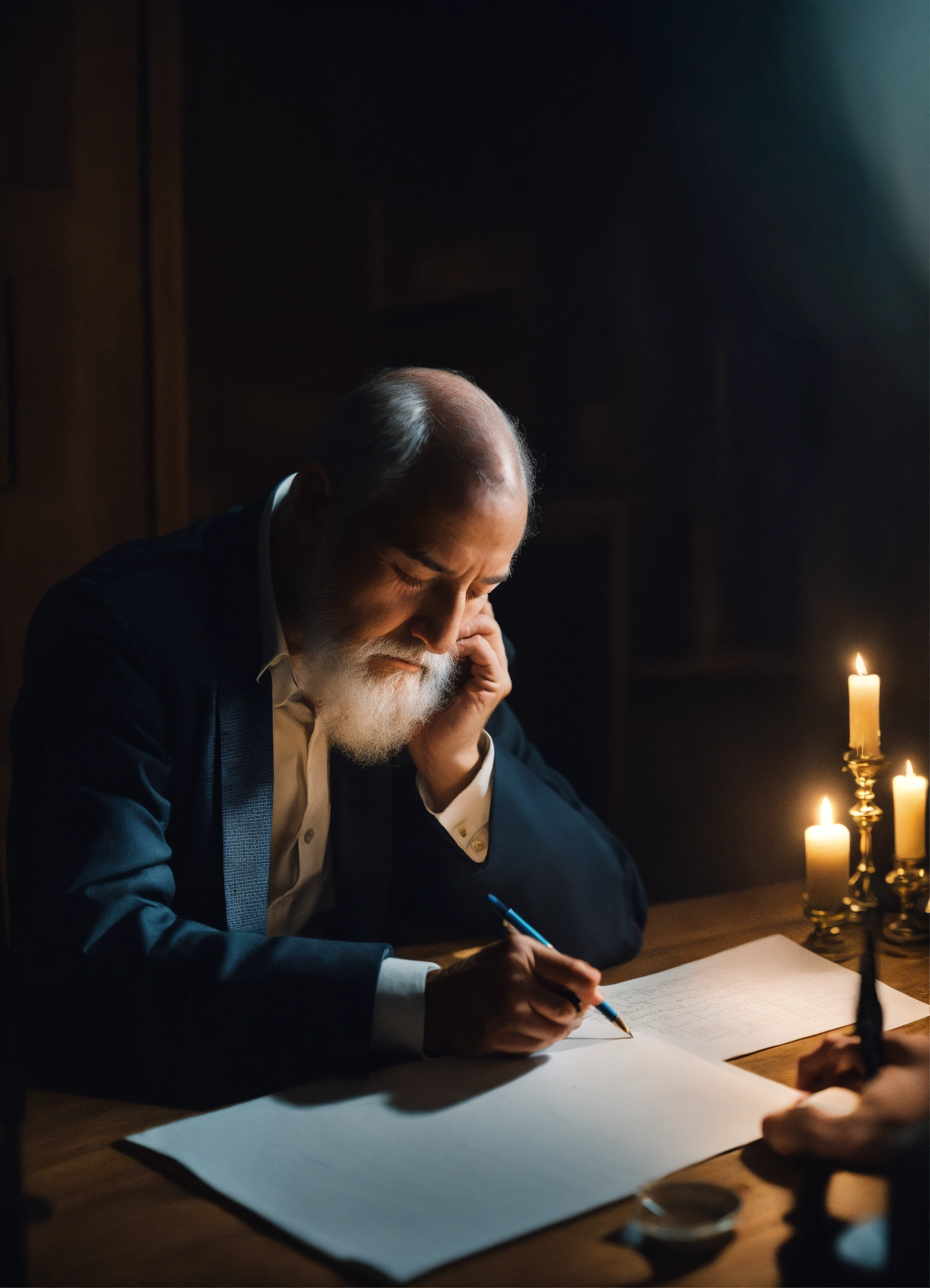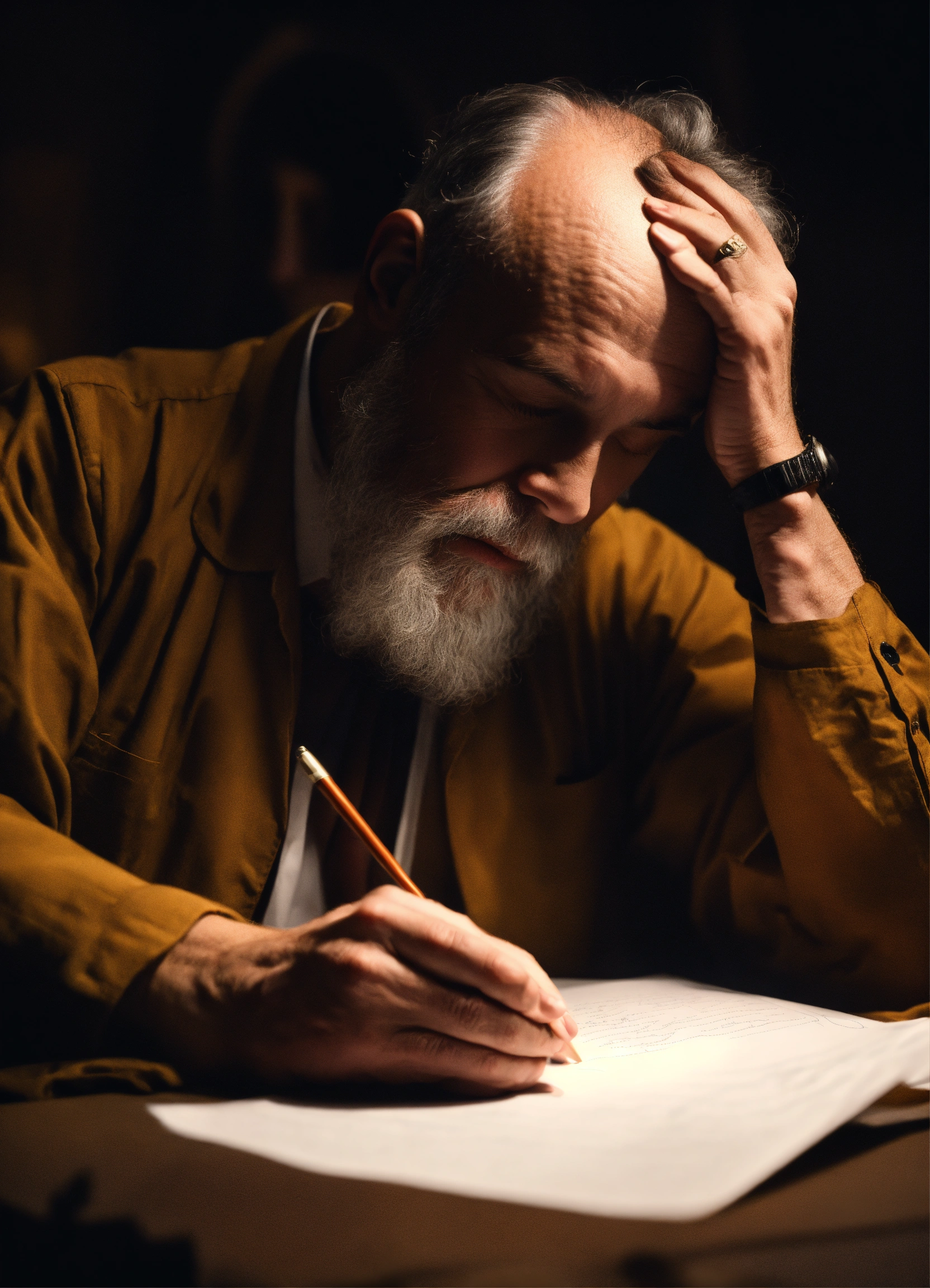 A person from the last century in a dark room sitting writing on a sheet of paper holding his forehead in the other hand with his eyes closed in the middle of a psychographic mediumship session, 4k