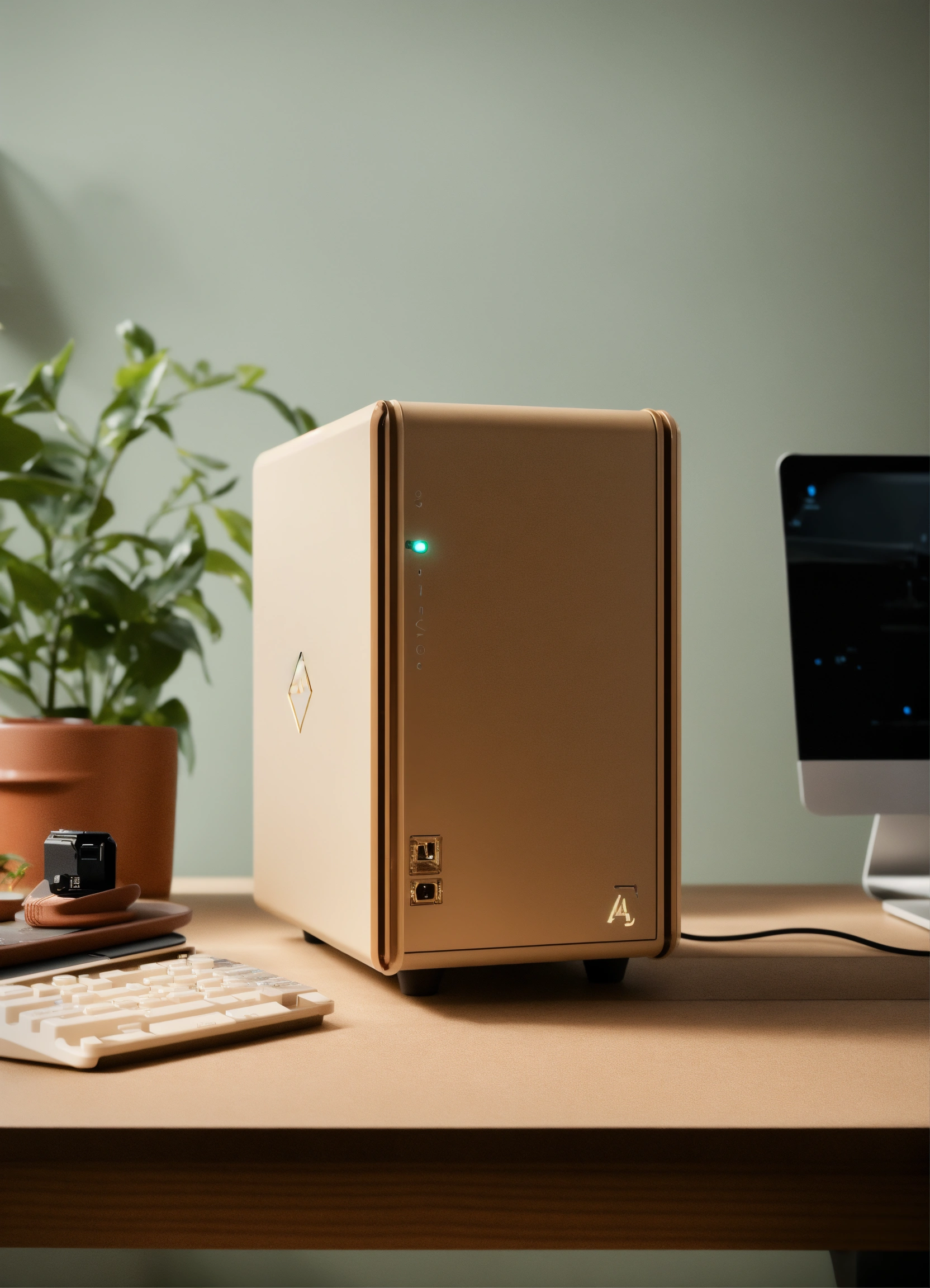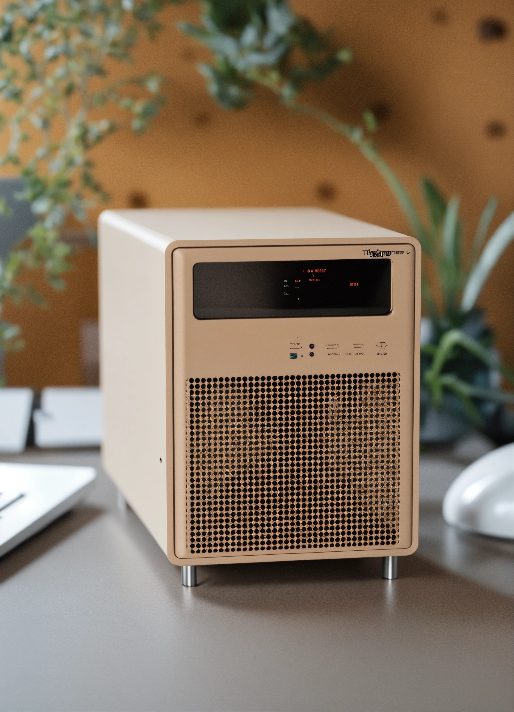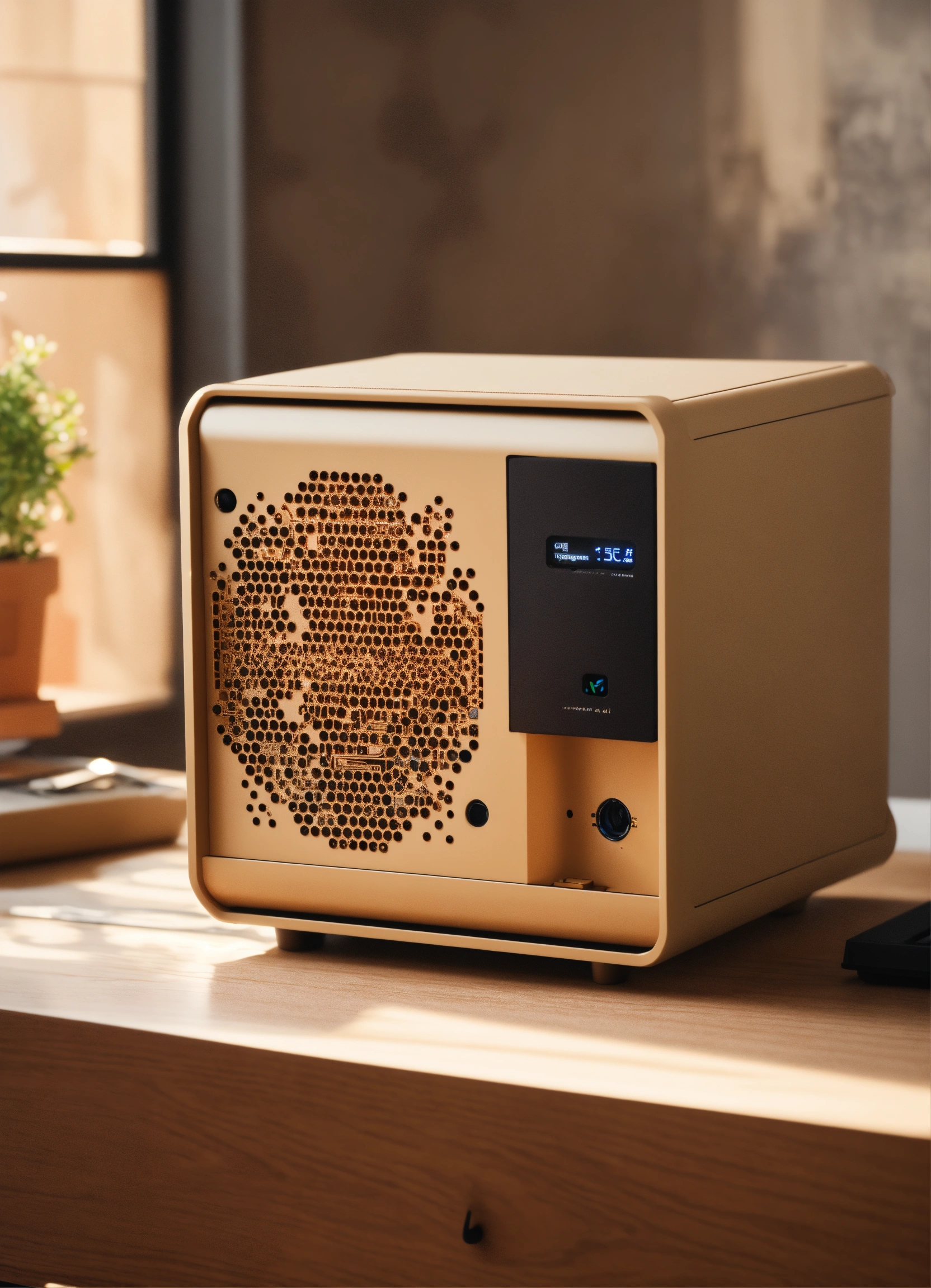 A stunning, minimalist beige micro itx case designed by teenage engineering. product ad retro. industrial design inspiration. unreal engine render, natural lighting, on desk, beautiful shot