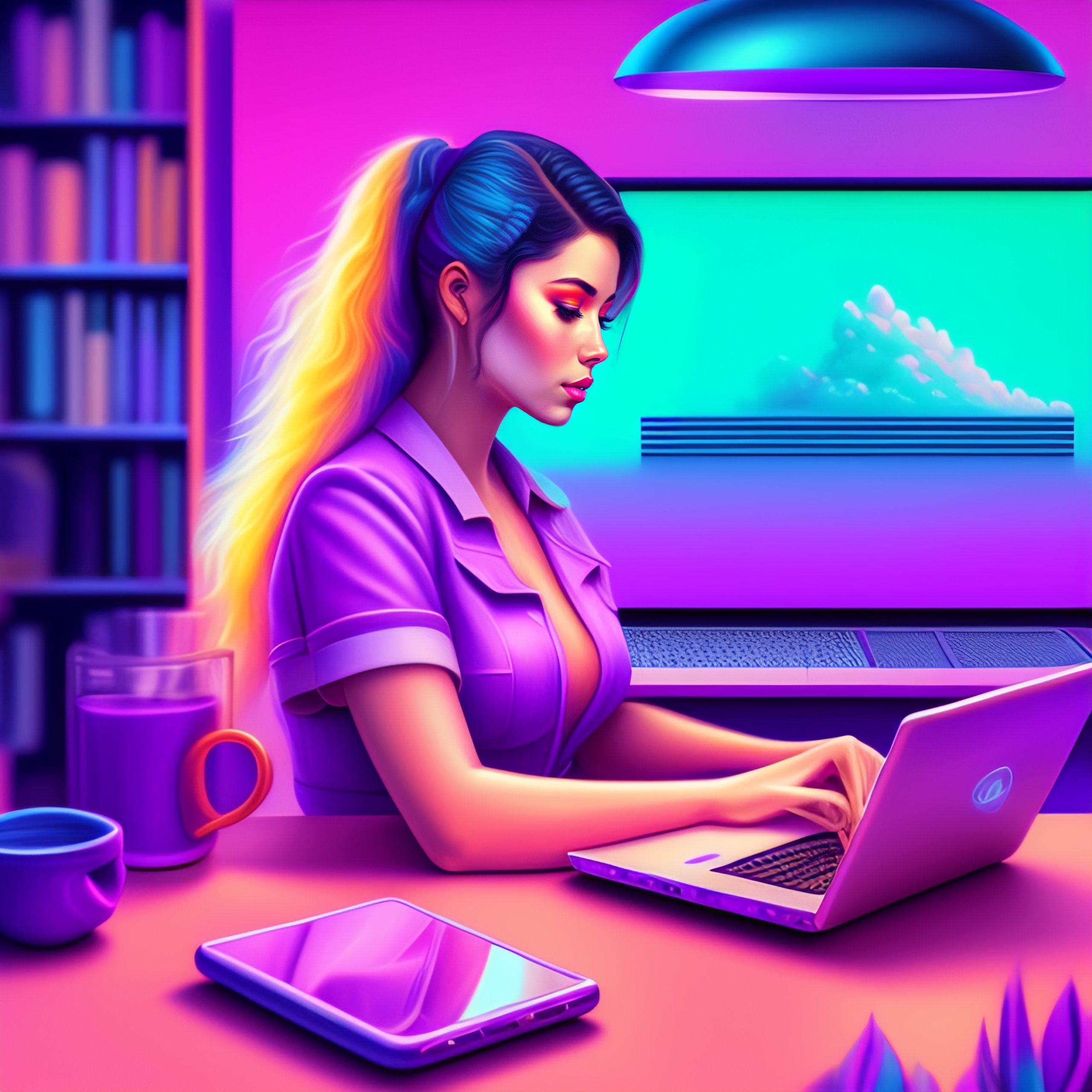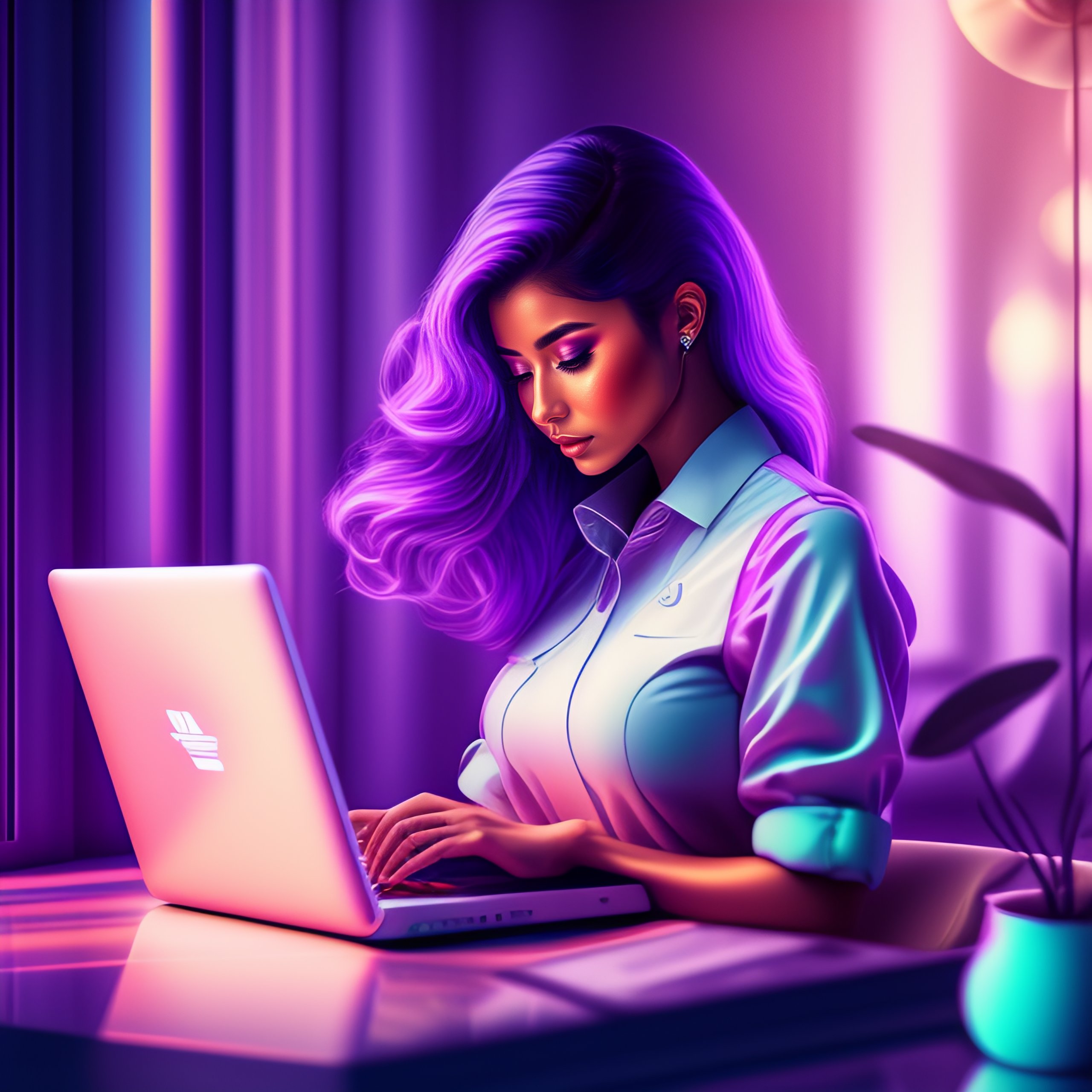 Woman programming on her laptop, coding aesthetic, pastel colors aesthetic, highly detailed, surrealistic, digital painting, concept art, sharp focus, illustration, purple