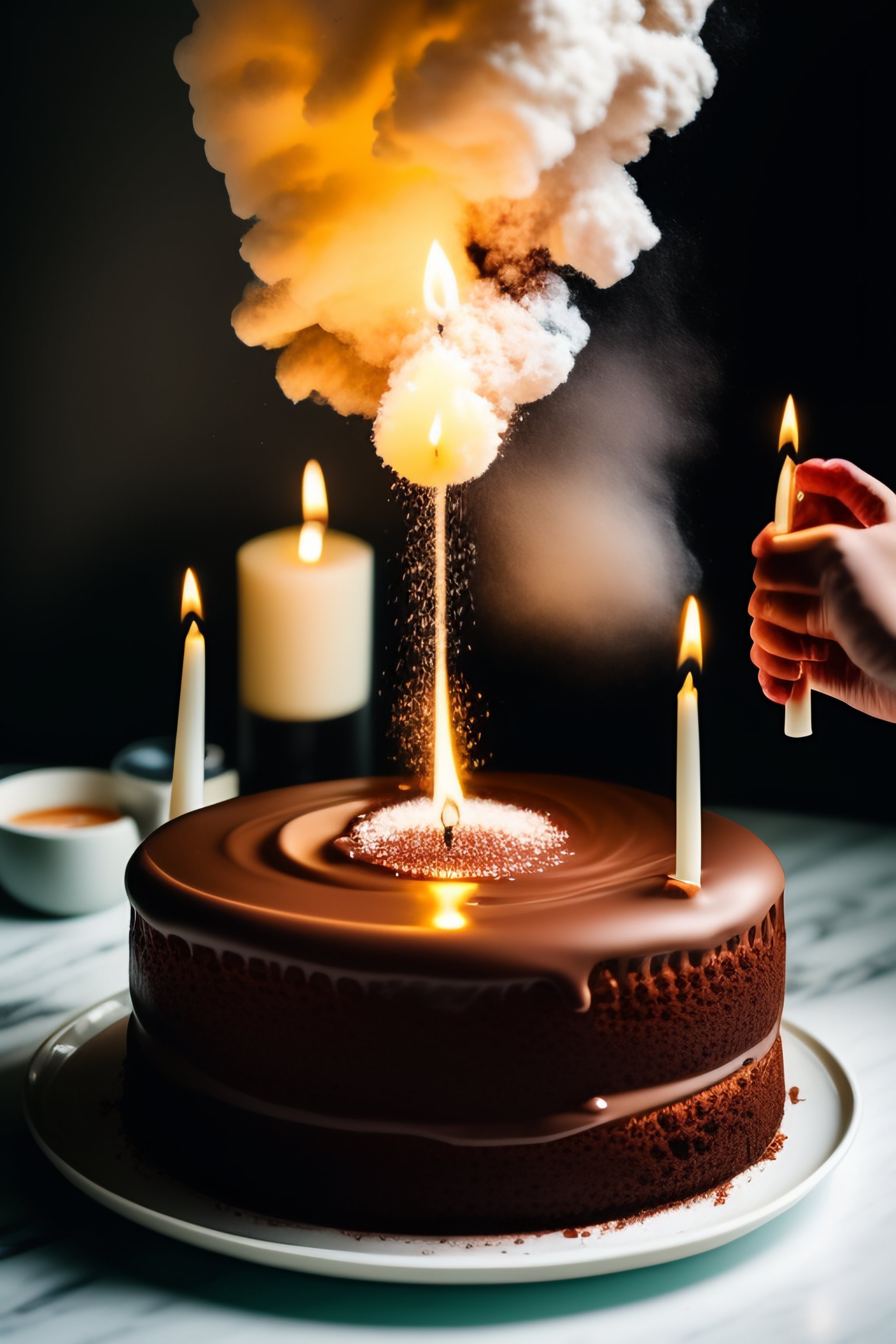 Friends blowing out candles on an exploding chocolate cake