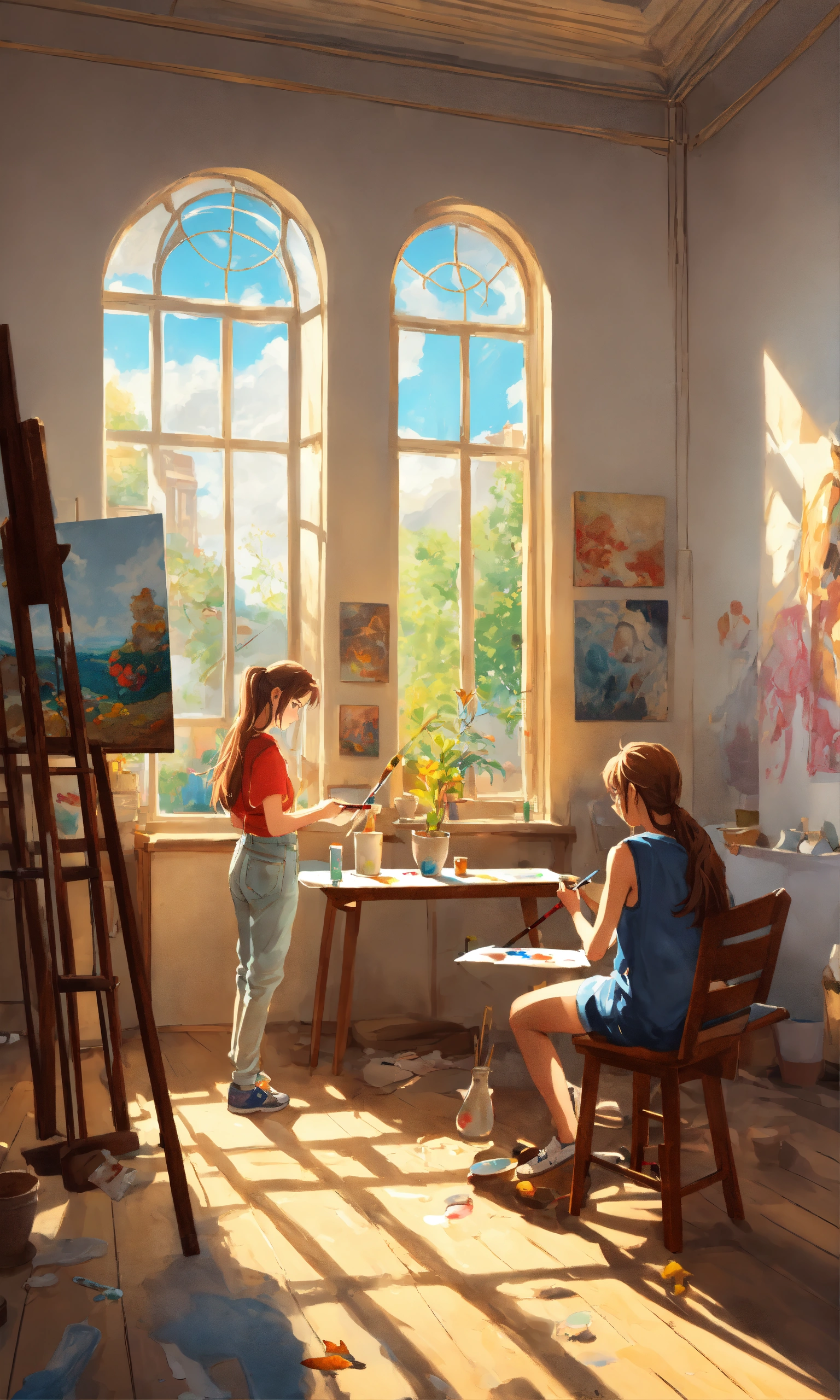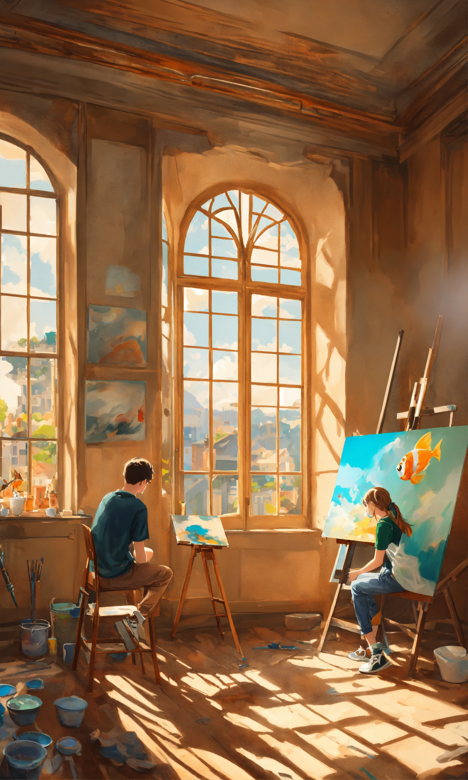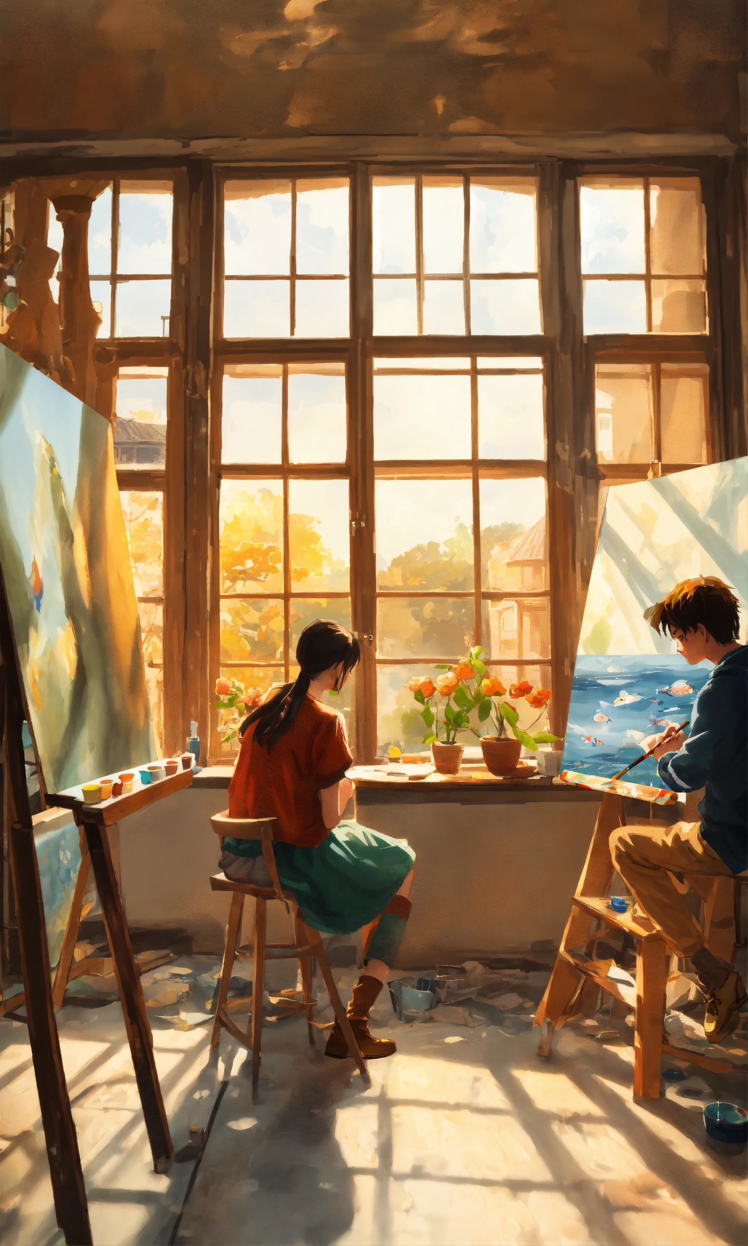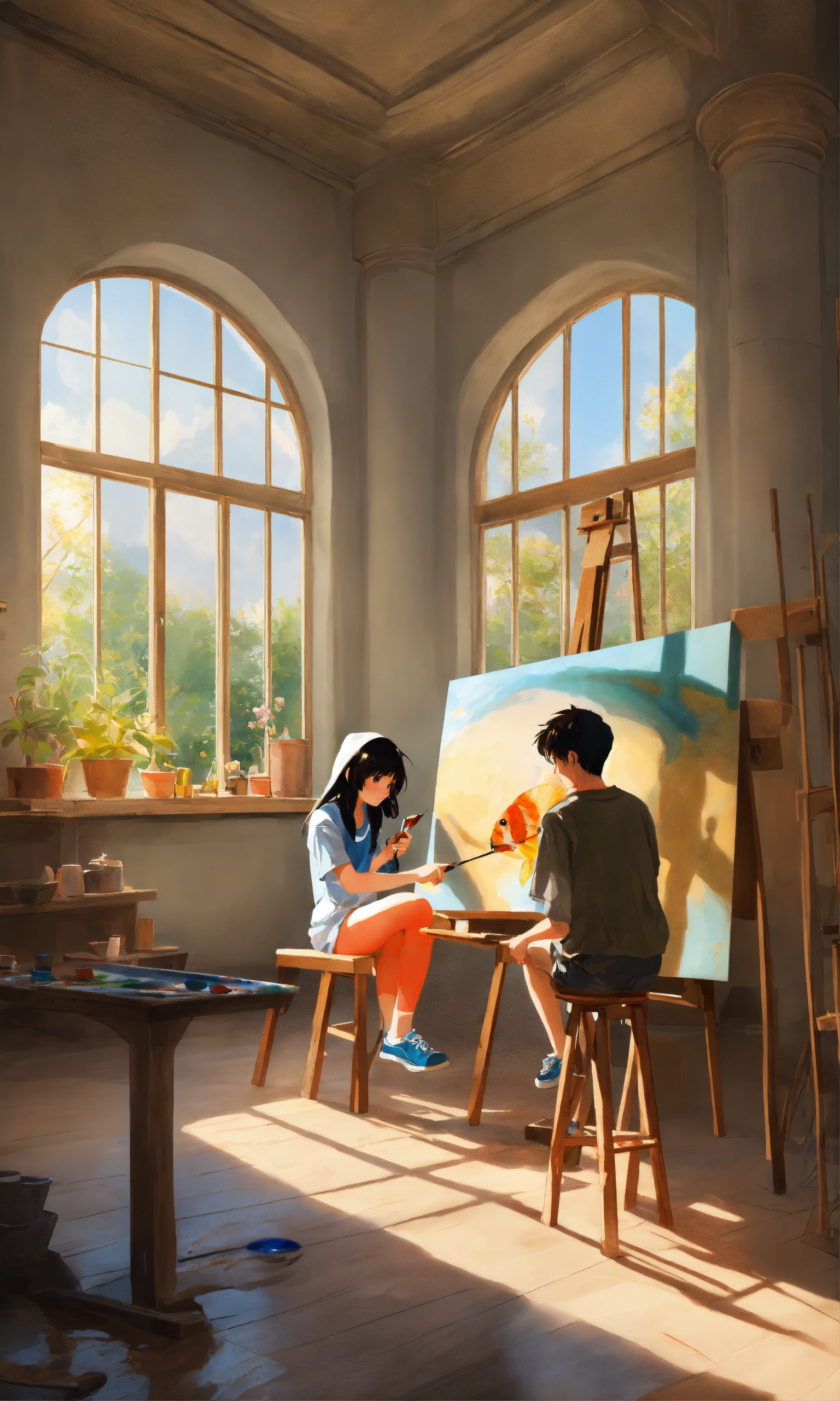 18-year-old girl is painting a still life with plaster, in a large art hall, next to an 18-year-old boy is sitting on the window, looking out of the window. fish-eye lens, 3d anime style. realistic style