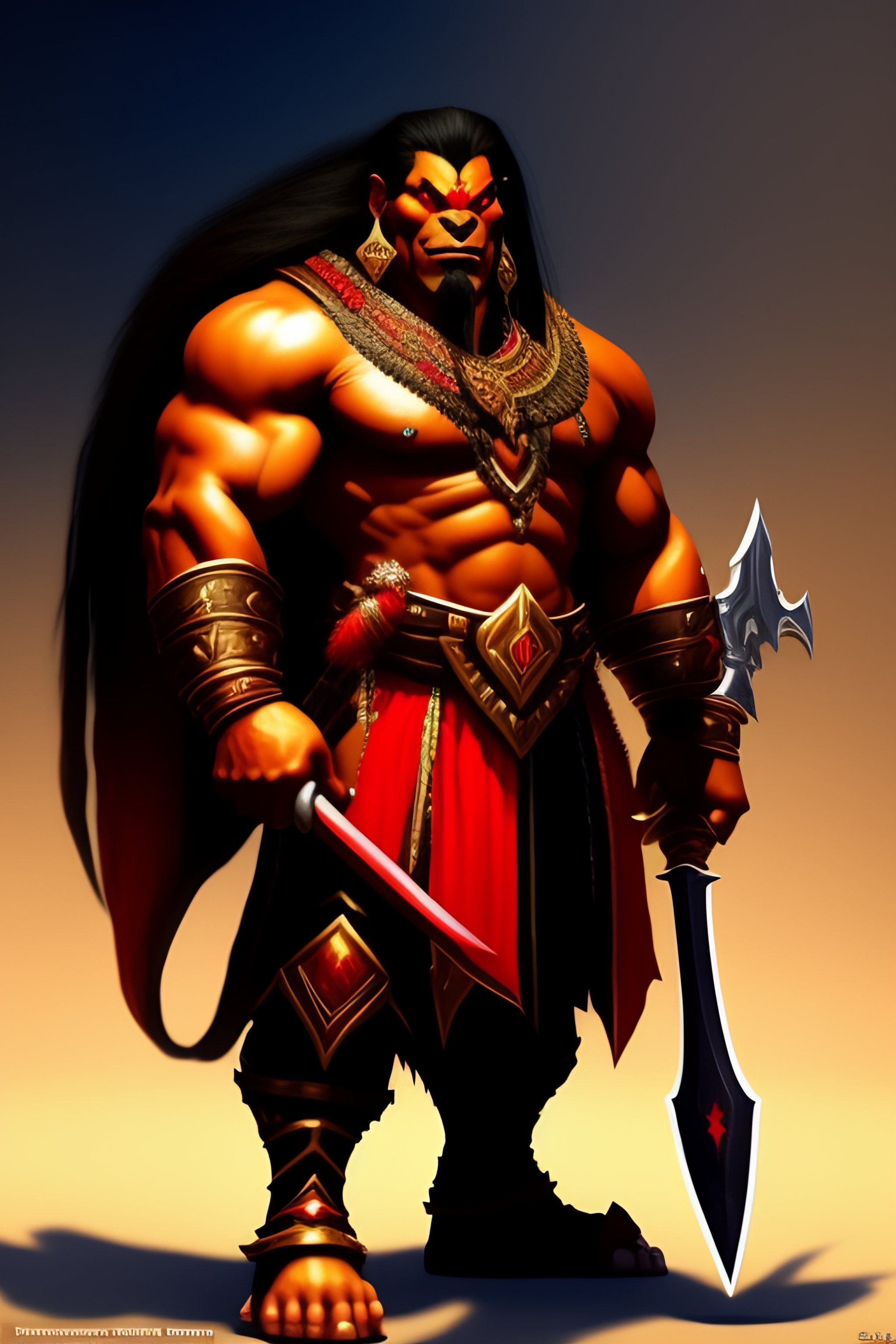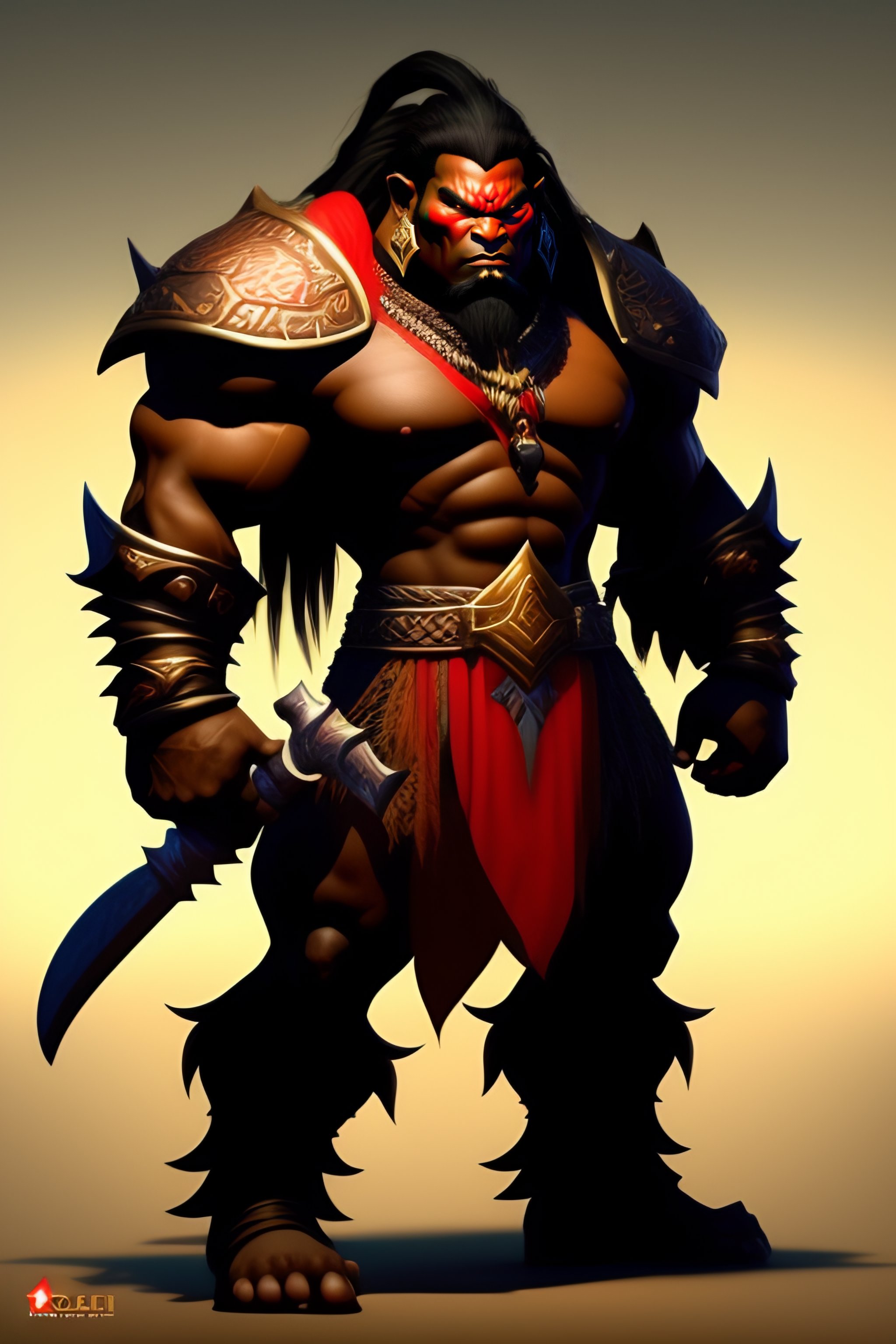 Mogul khan "the axe" from dota 2, a red skinned orc like character with black hair wielding a big axe. he is quite top heavy and has small legs