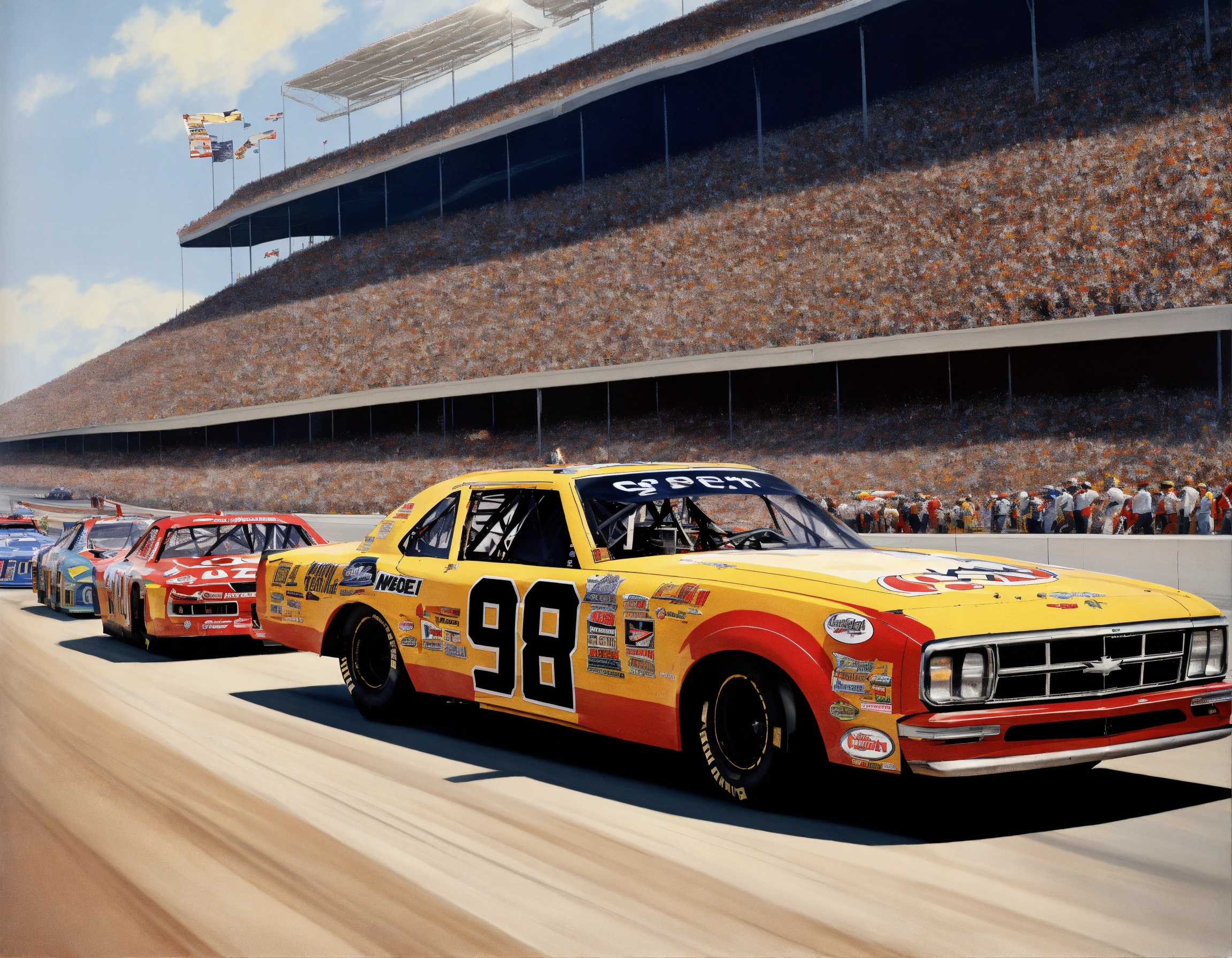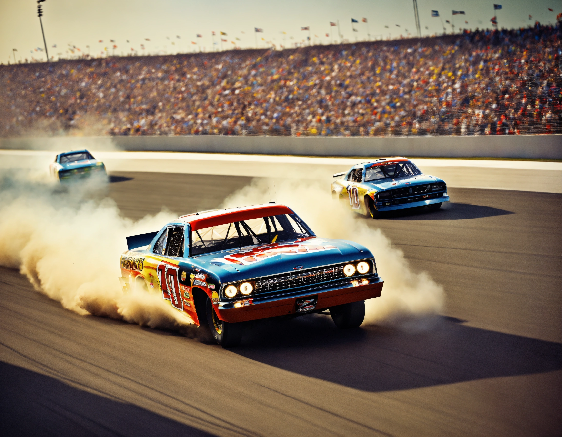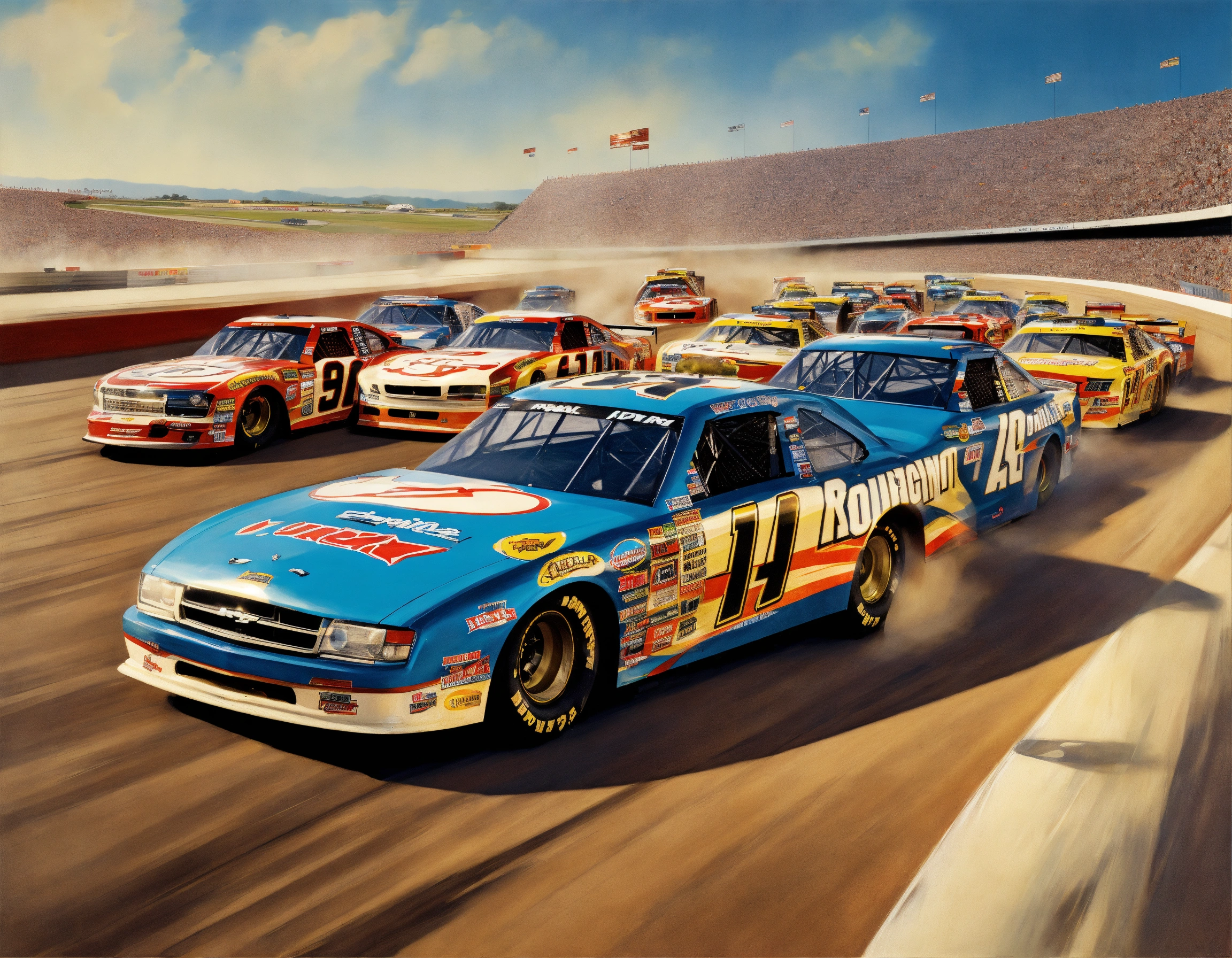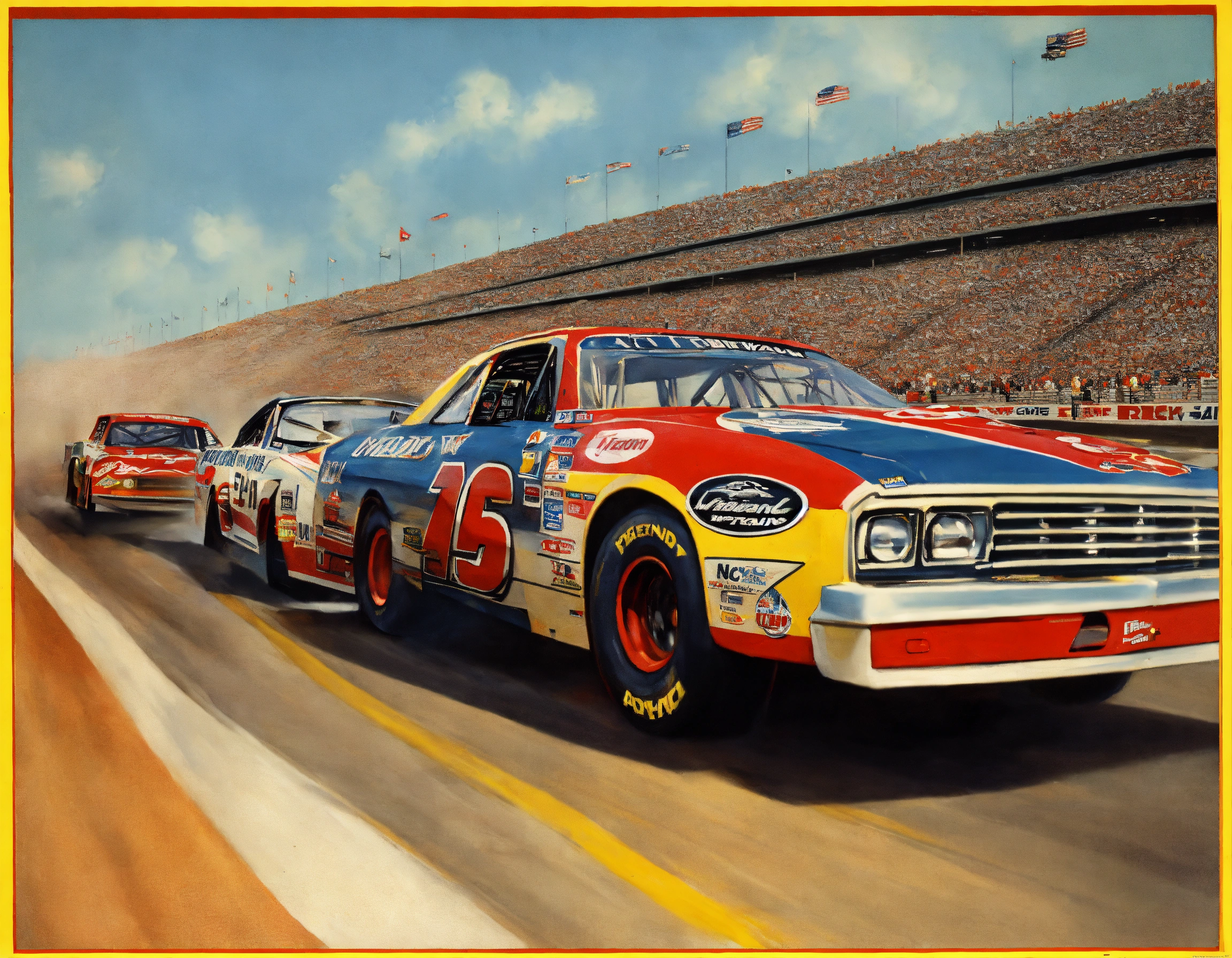 Nascar vehichles racing towards fourth wall, ground level view, vintage painted magazine advertisement, dynamic angle