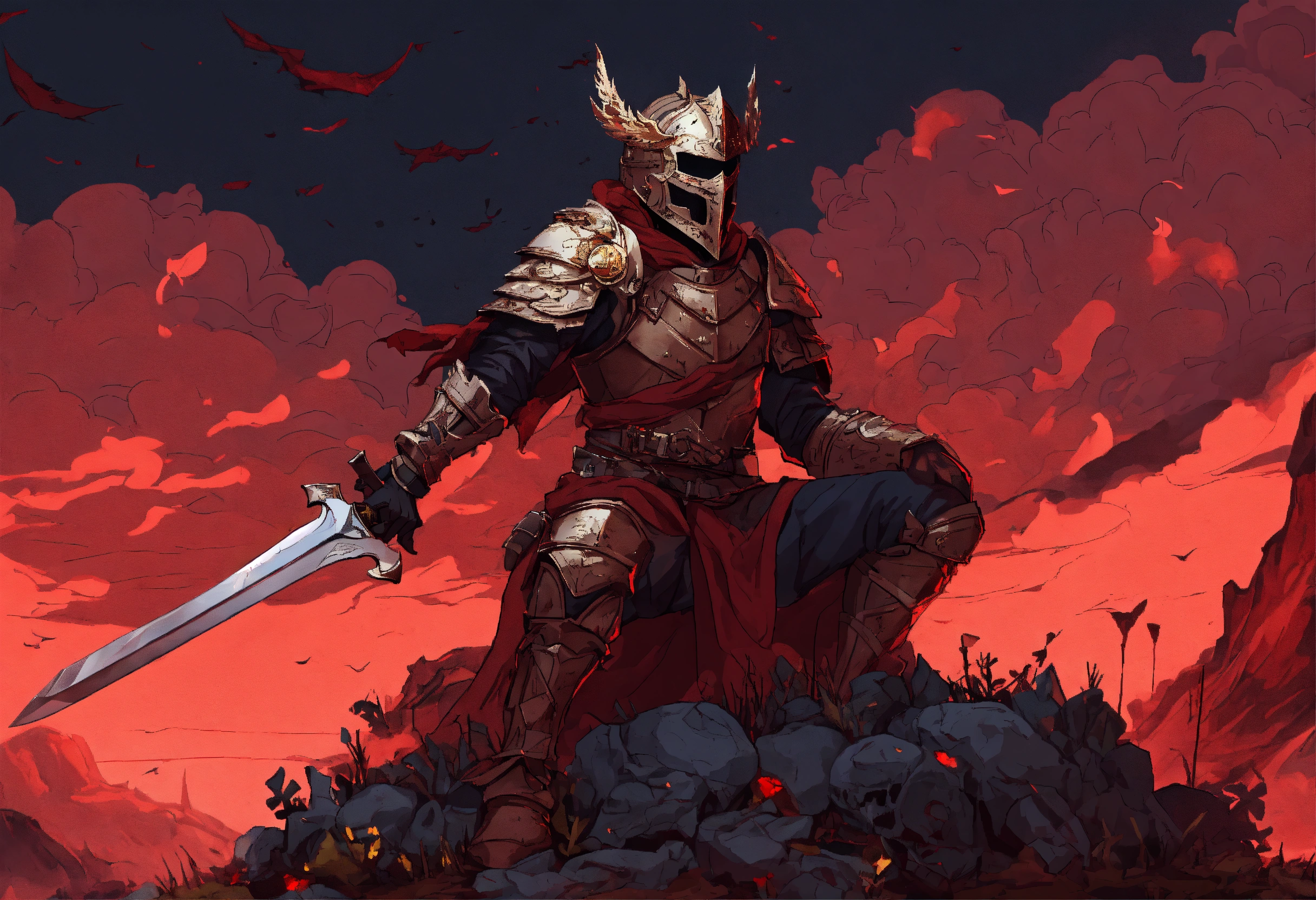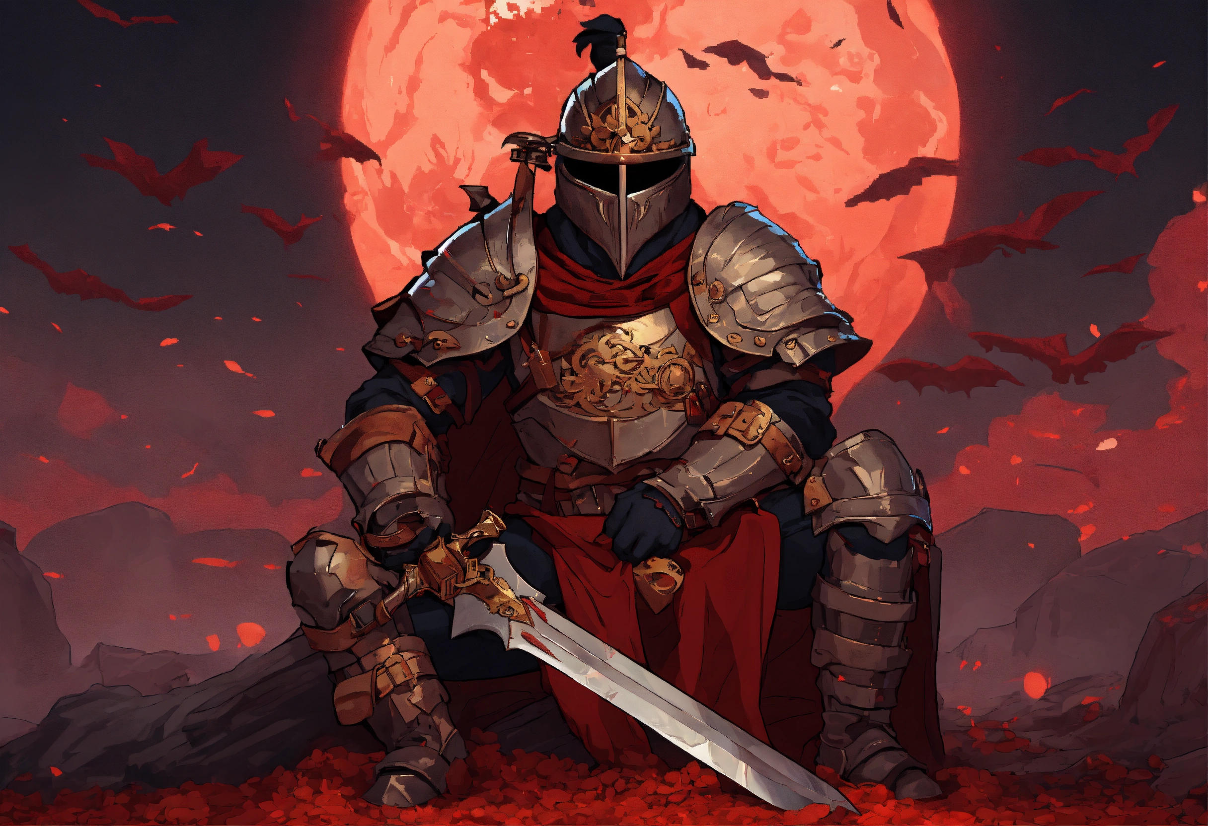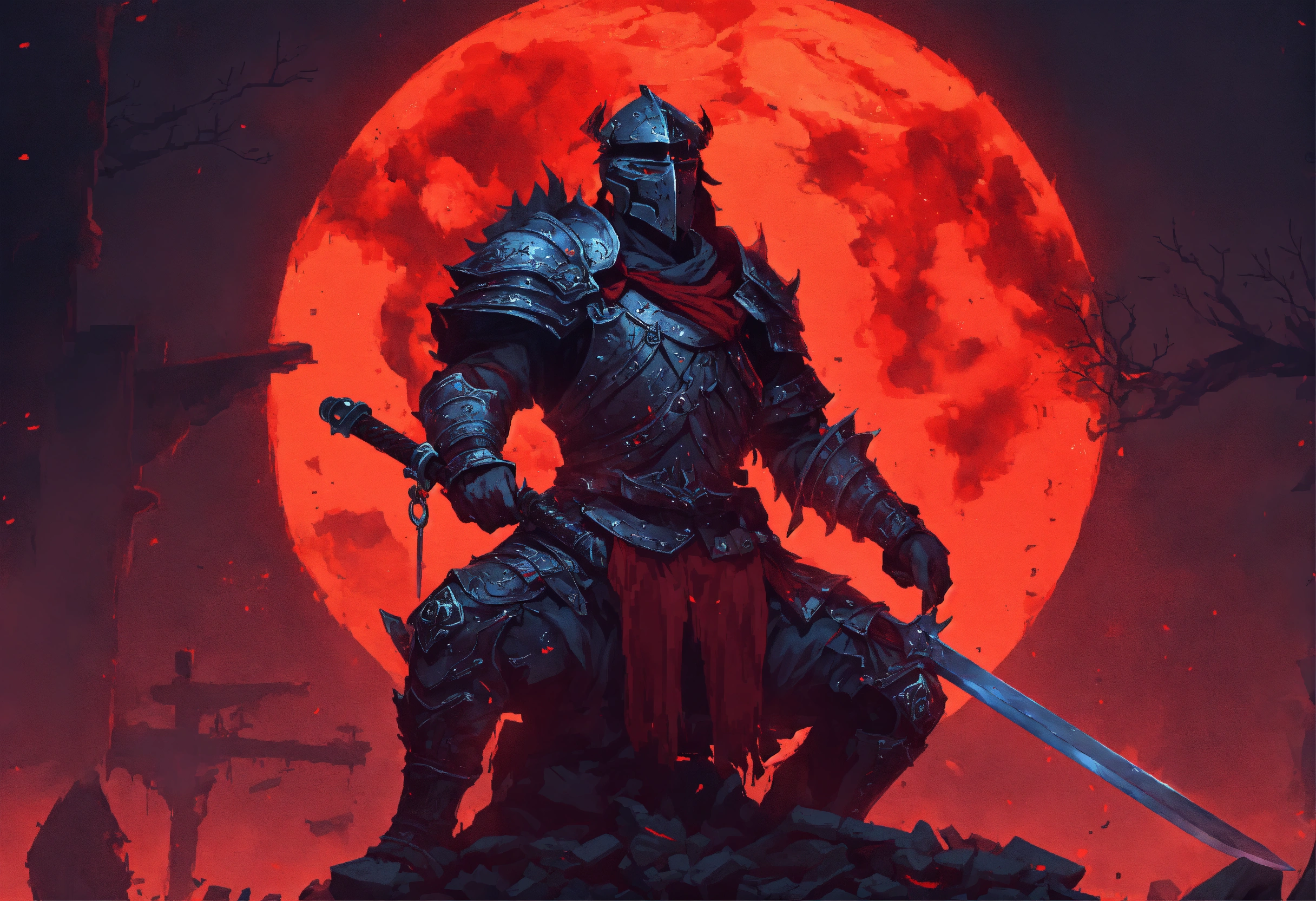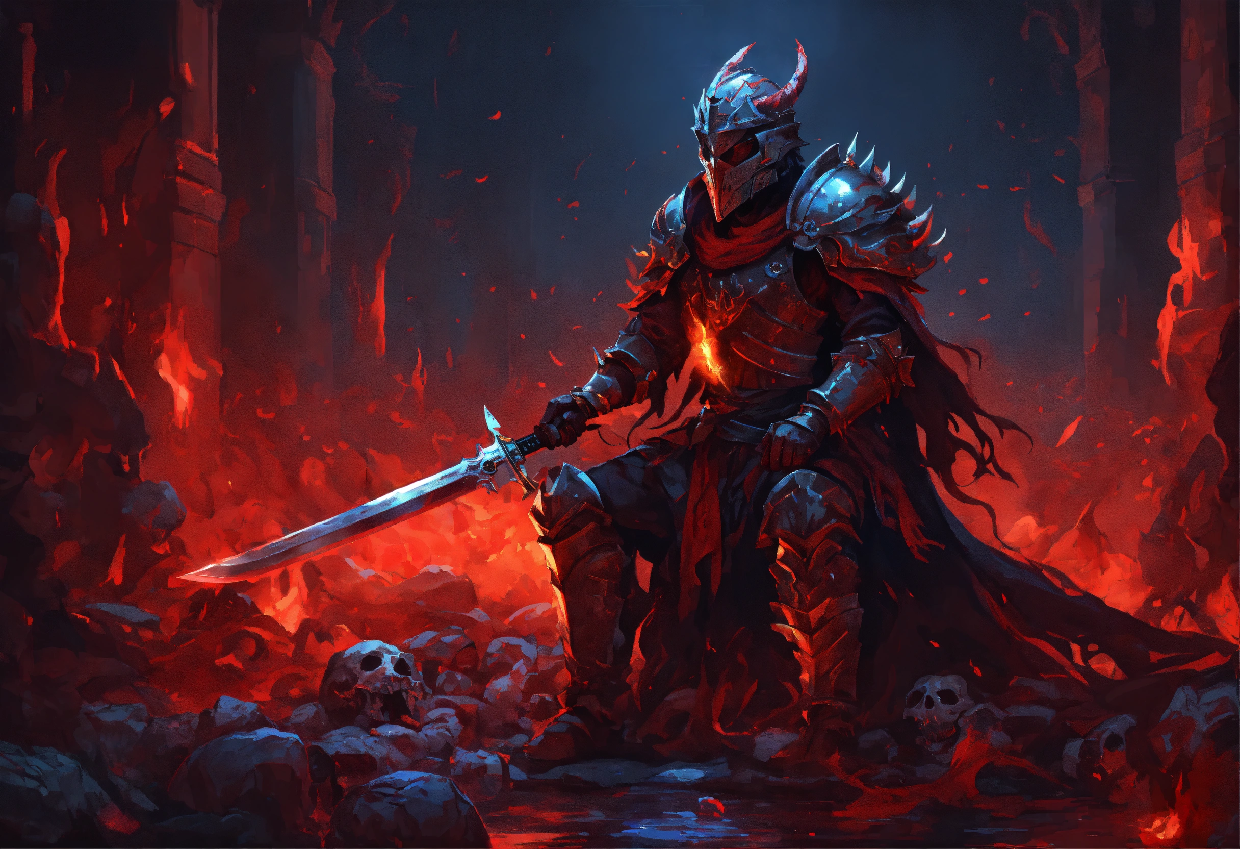 Genre pixel art. race human. picture quality 8k. a warrior dressed in plate armor sits on a pile of bones and clutches a sword. his visor is up, and his face is covered in scars. in his hands he clutches a cursed sword, the blade of which represents the mouth of a monster, the entire sword is covered with crying eyes. everything around him is filled with scarlet water. and from the darkness a bony hand reaches out to him.