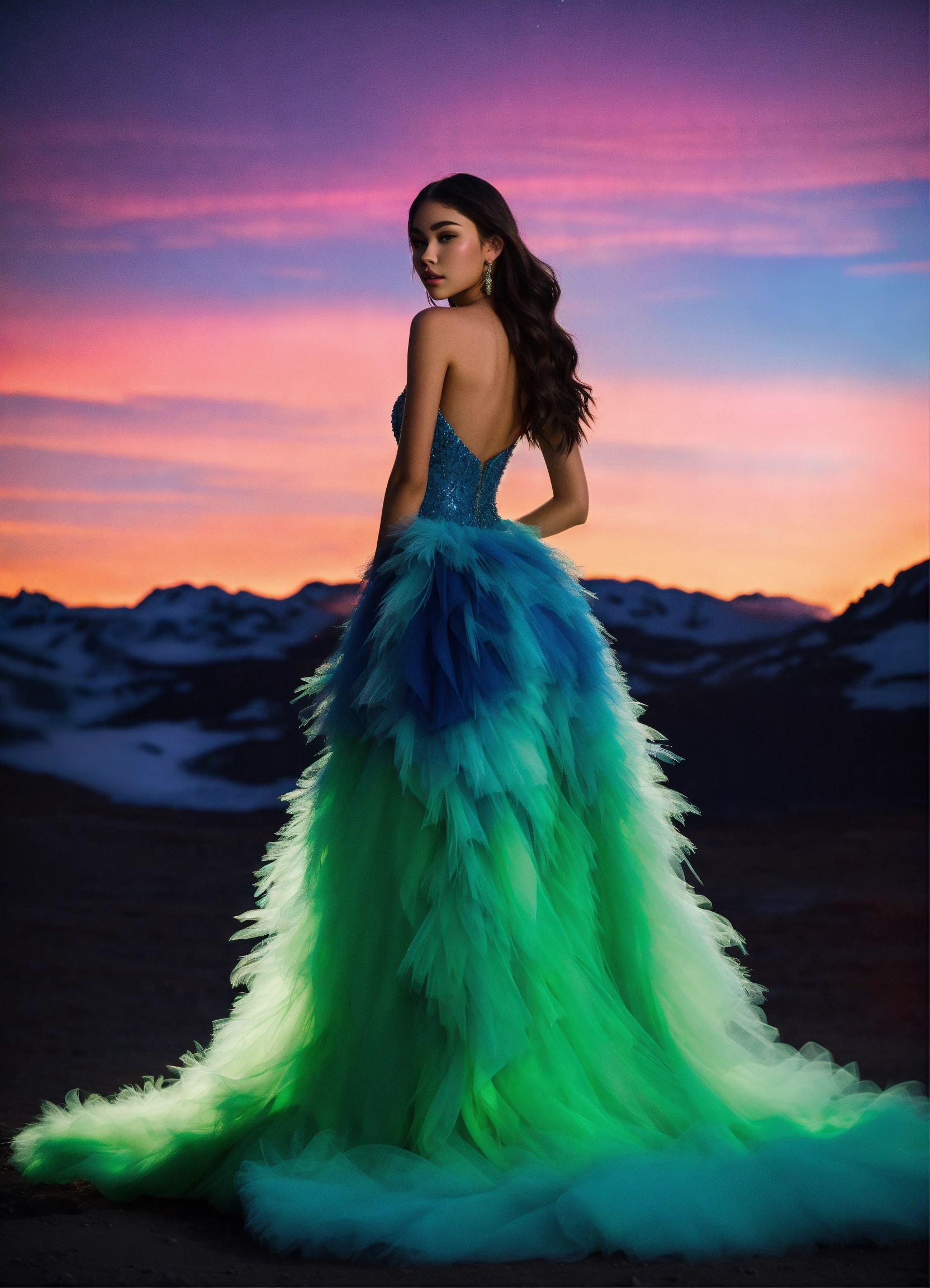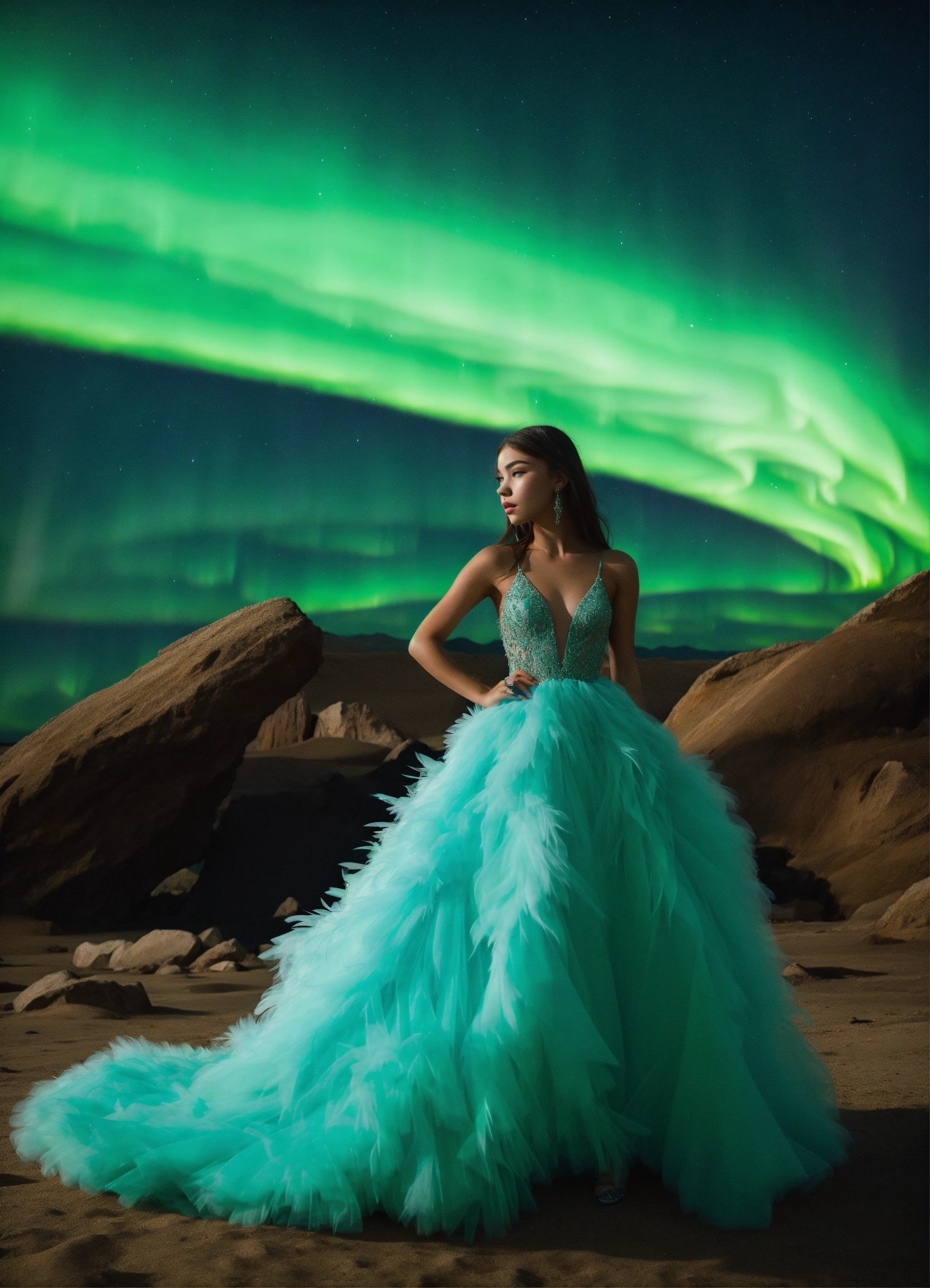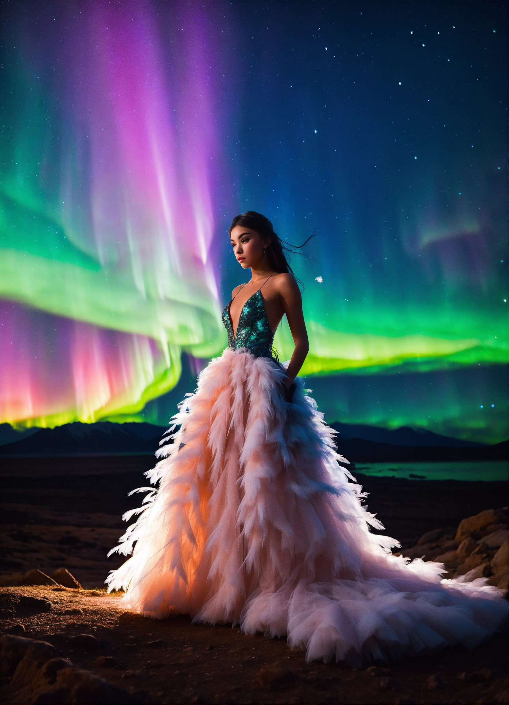 Madison beer in a feathered ballgown, on an isolated planet, aurora borealis. silhouette. 4k real photoshoot.