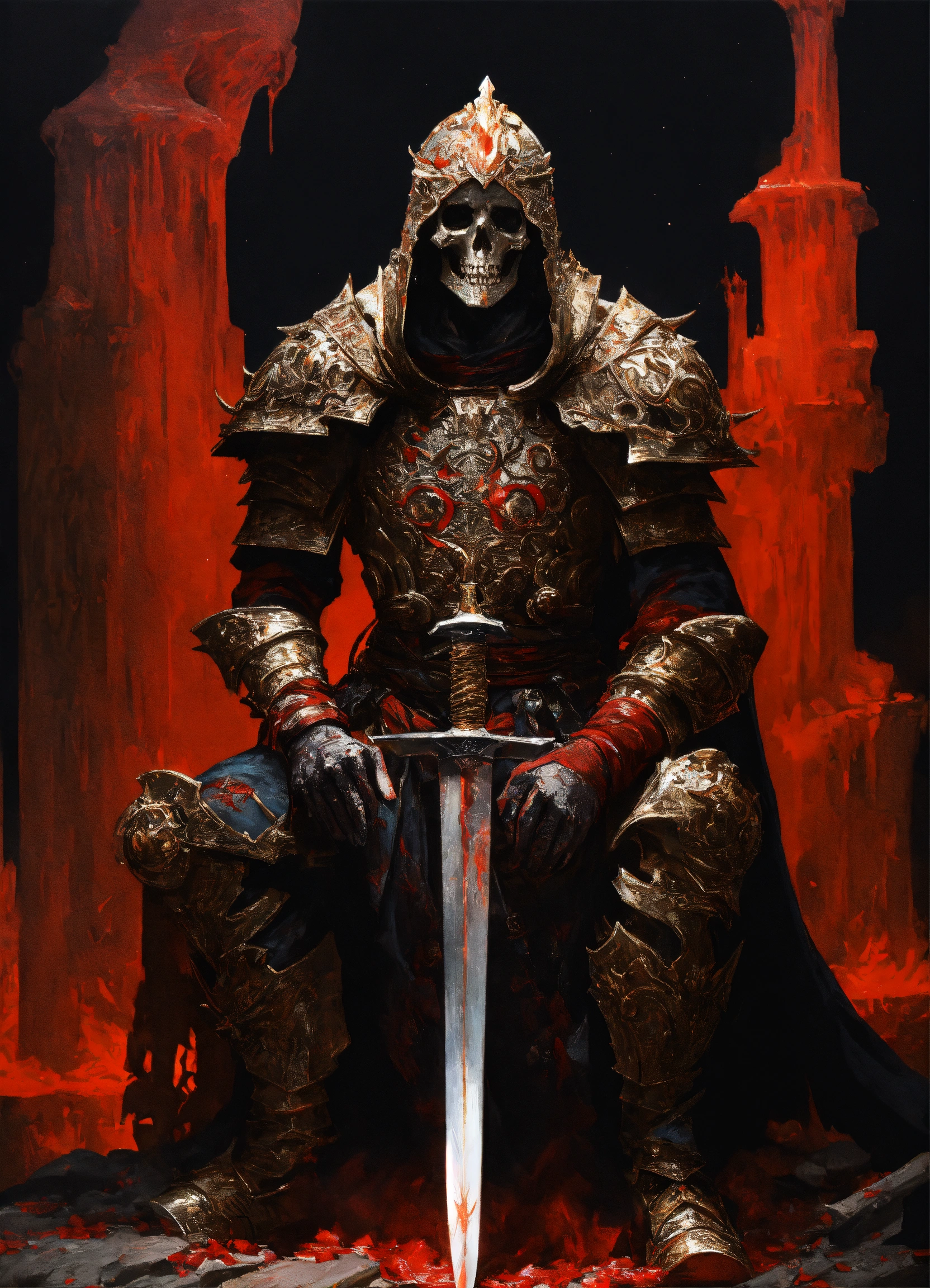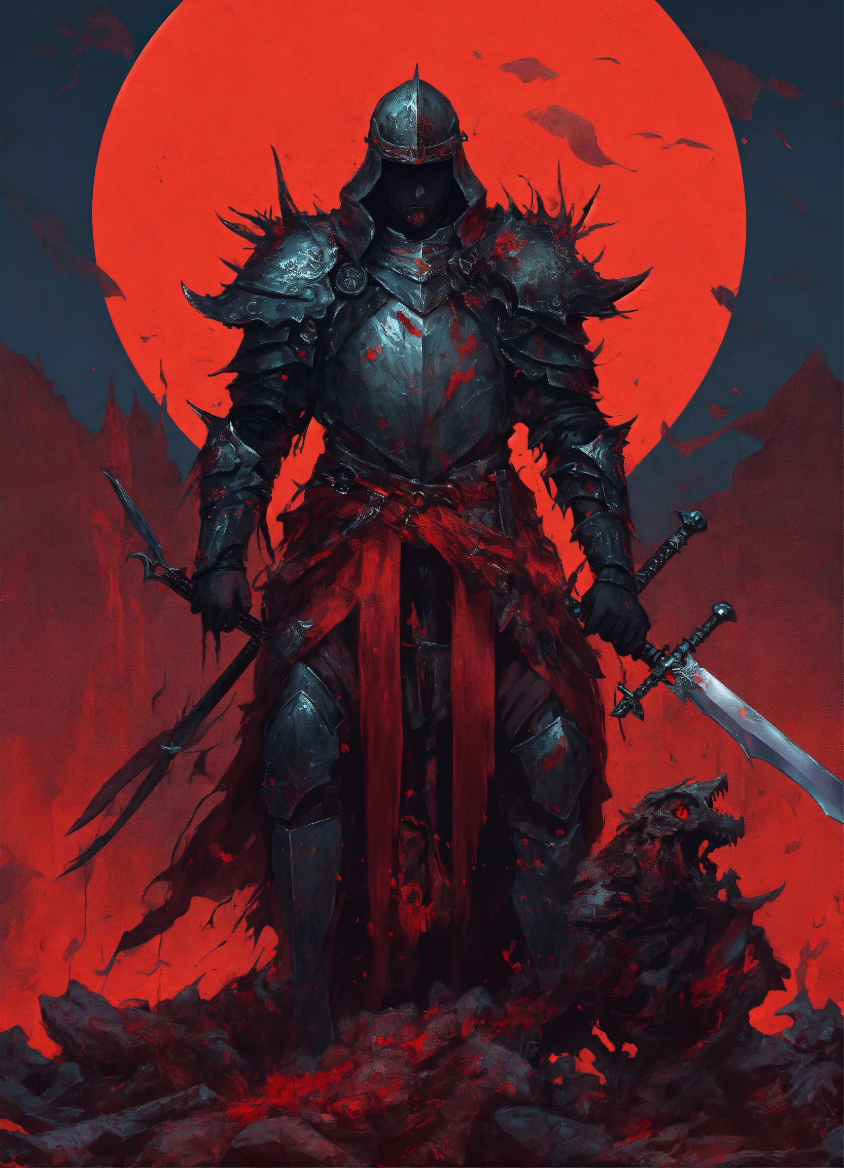 Genre abstract. a knight dressed in a robe sits on a pile of bones and clutches a sword. his visor is up and his face is covered in scars. in his hands he clutches a cursed sword, the blade of which represents the mouth of a monster, all of it is covered with crying eyes. everything around him is filled with scarlet water. and from the darkness a bony hand reaches out to him.
