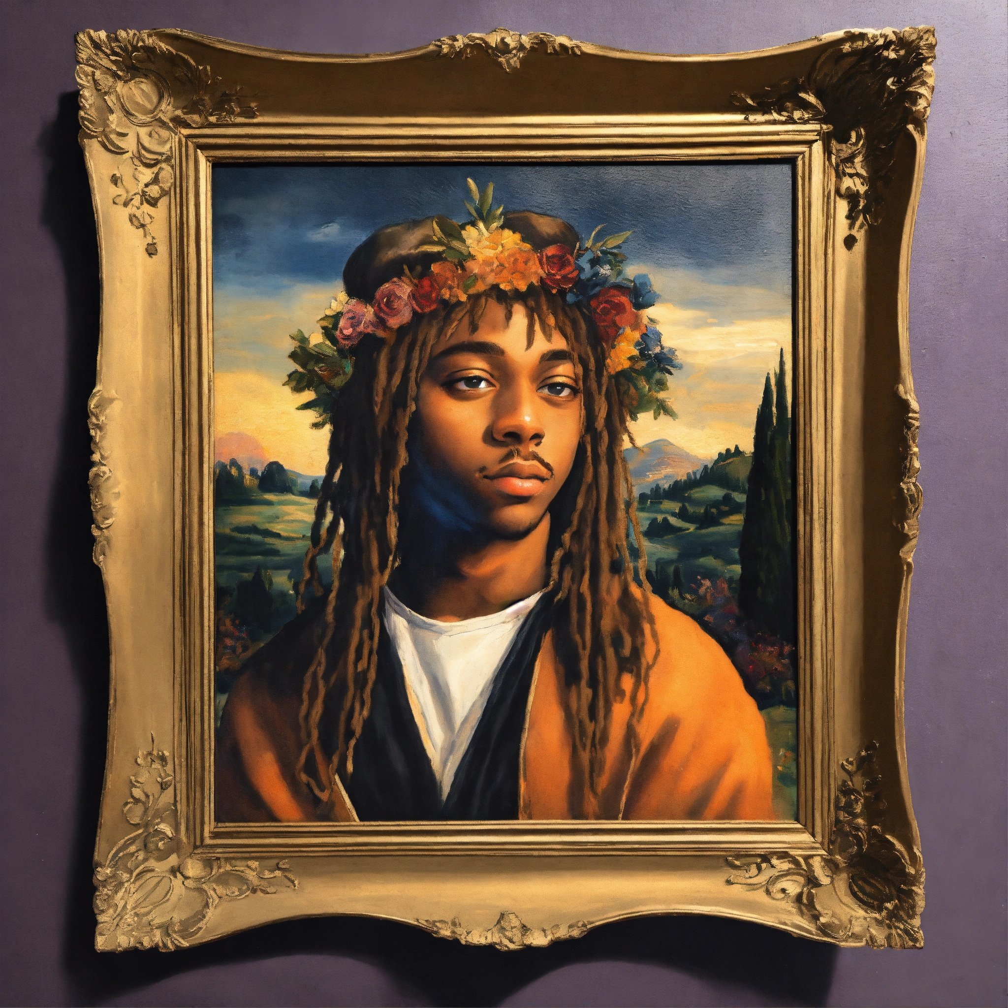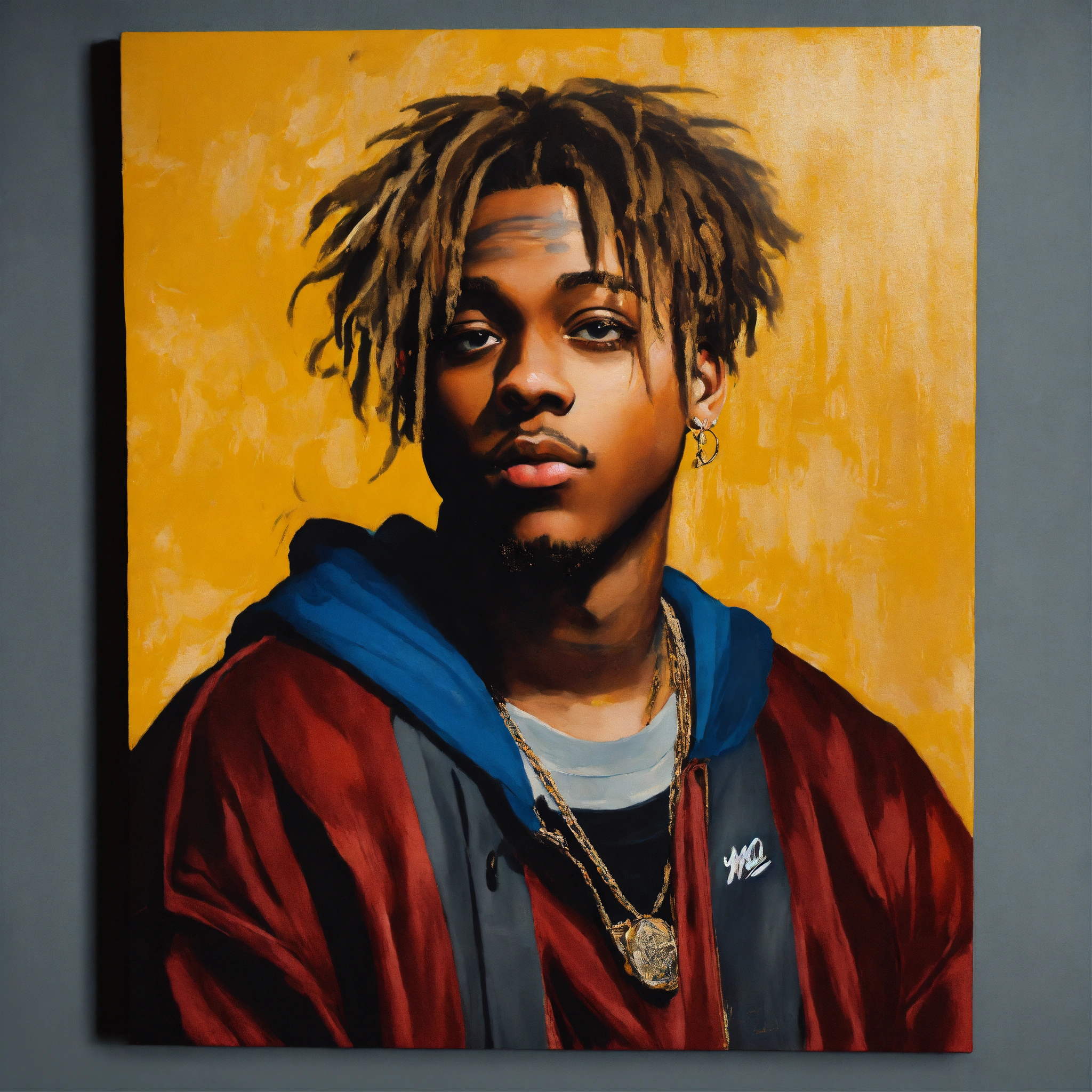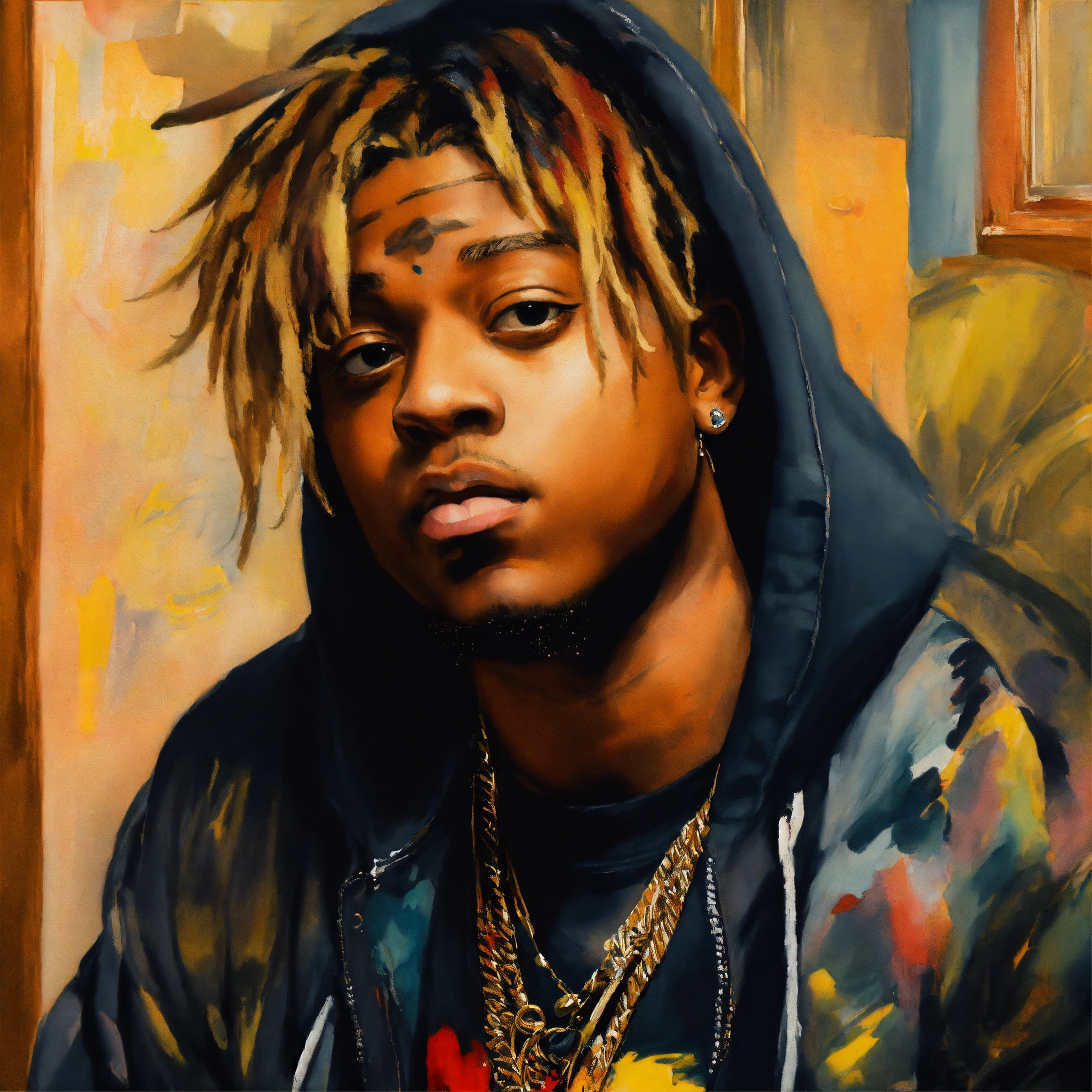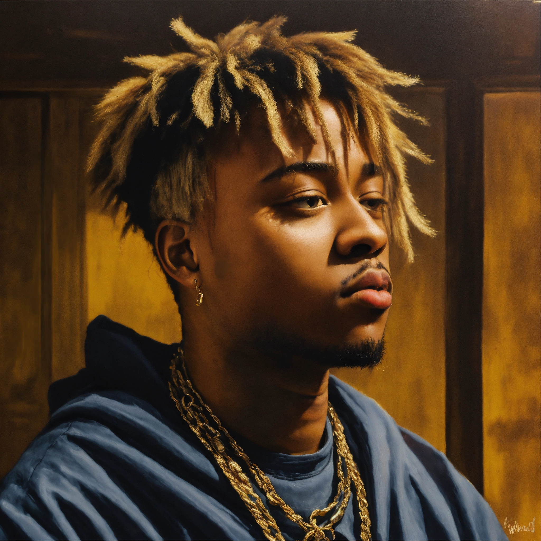 A portrait of juice wrld in the style of leonardo da vinci, with a similar vibe to the mona lisa. juice wrld should be seated in a chair, with a slightly enigmatic smile. the painting should be set in a dark, atmospheric room with a single window letting in a shaft of light. the overall tone of the painting should be moody and introspective. additional instructions use high-quality brushstrokes and a smooth, blended finish. pay close attention to the details of juice wrld's face, including his facial features, hair, and skin texture. use a limited palette of colors, with an emphasis on earthy tones. create a sense of depth and dimension in the painting.