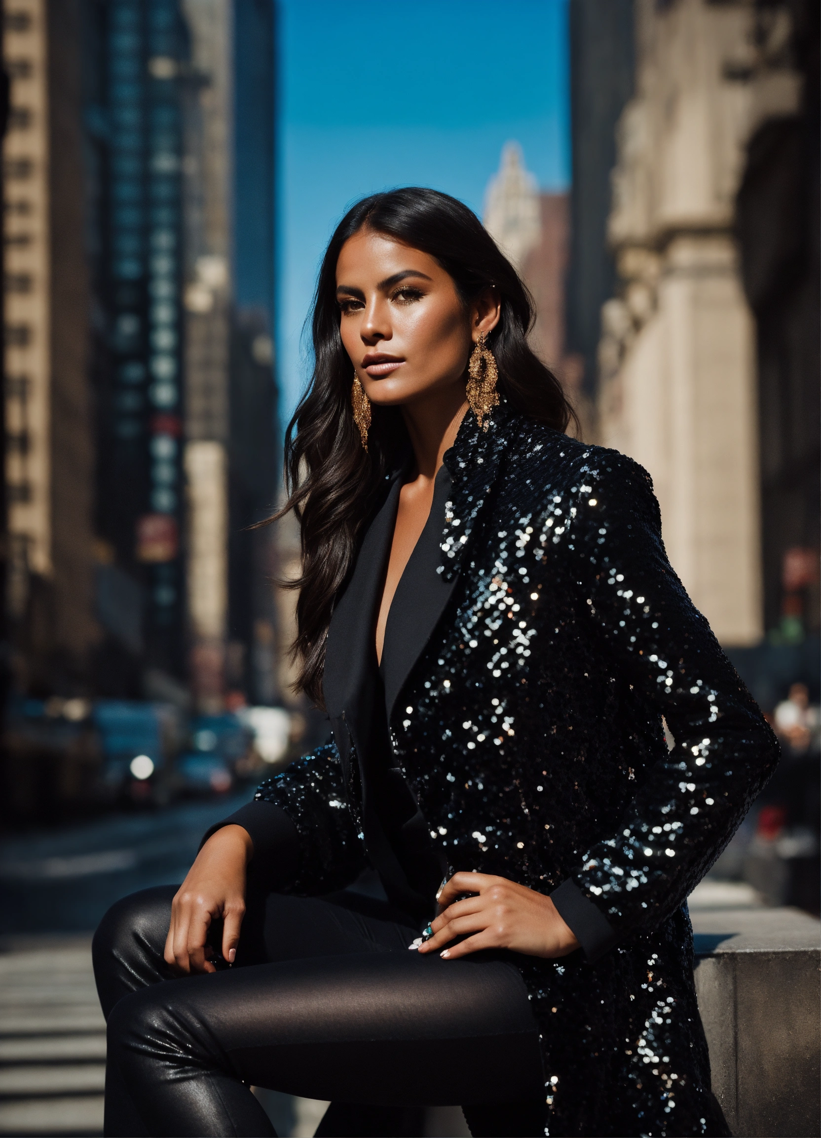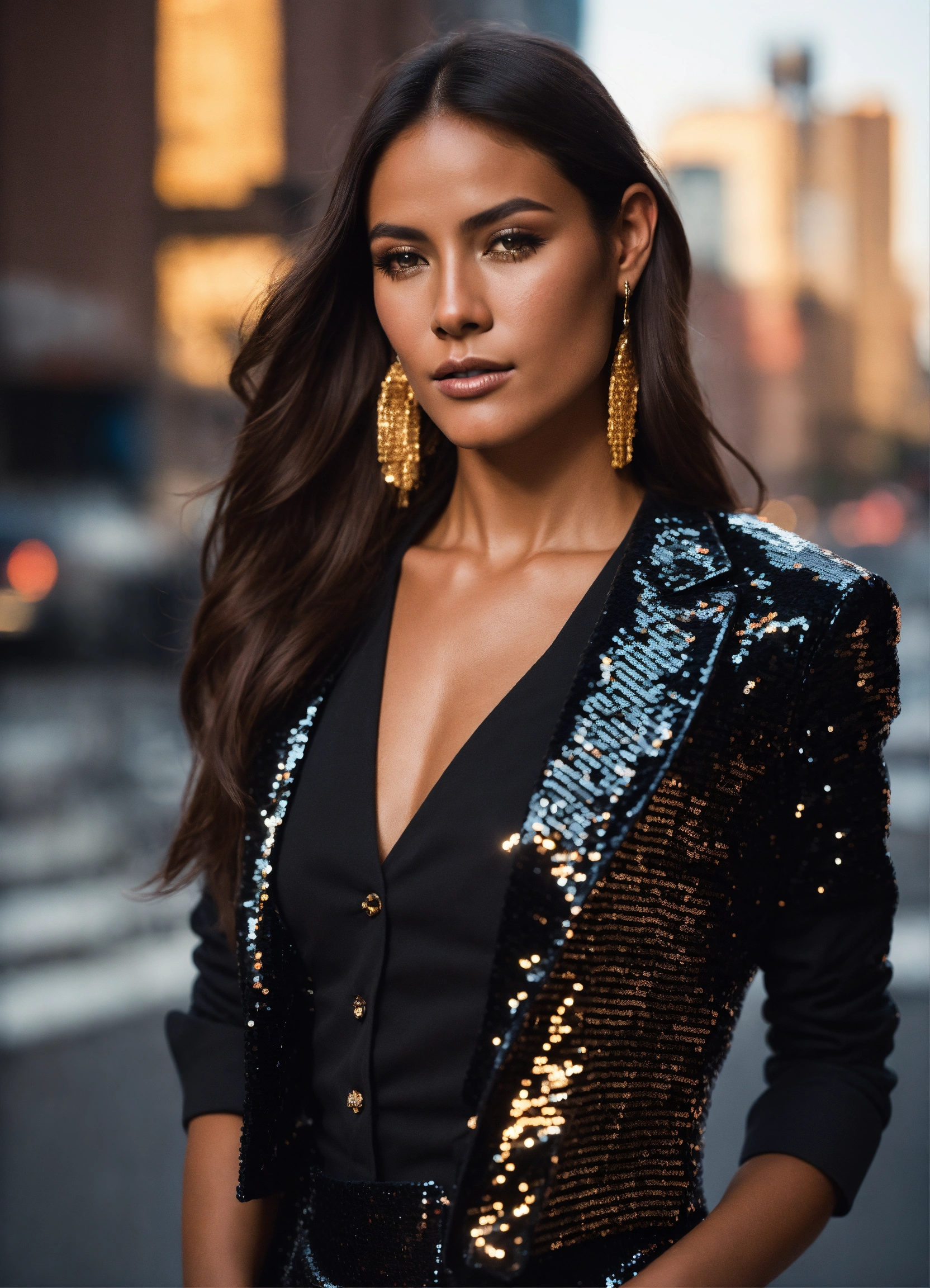Create a visually stunning ralph lauren inspired photoshoot featuring a tanned woman brazillian supermodel wearing black sequin waistcoat, iso 400, surrealistic, 8k, full frame, new york city background, portrait, daytime