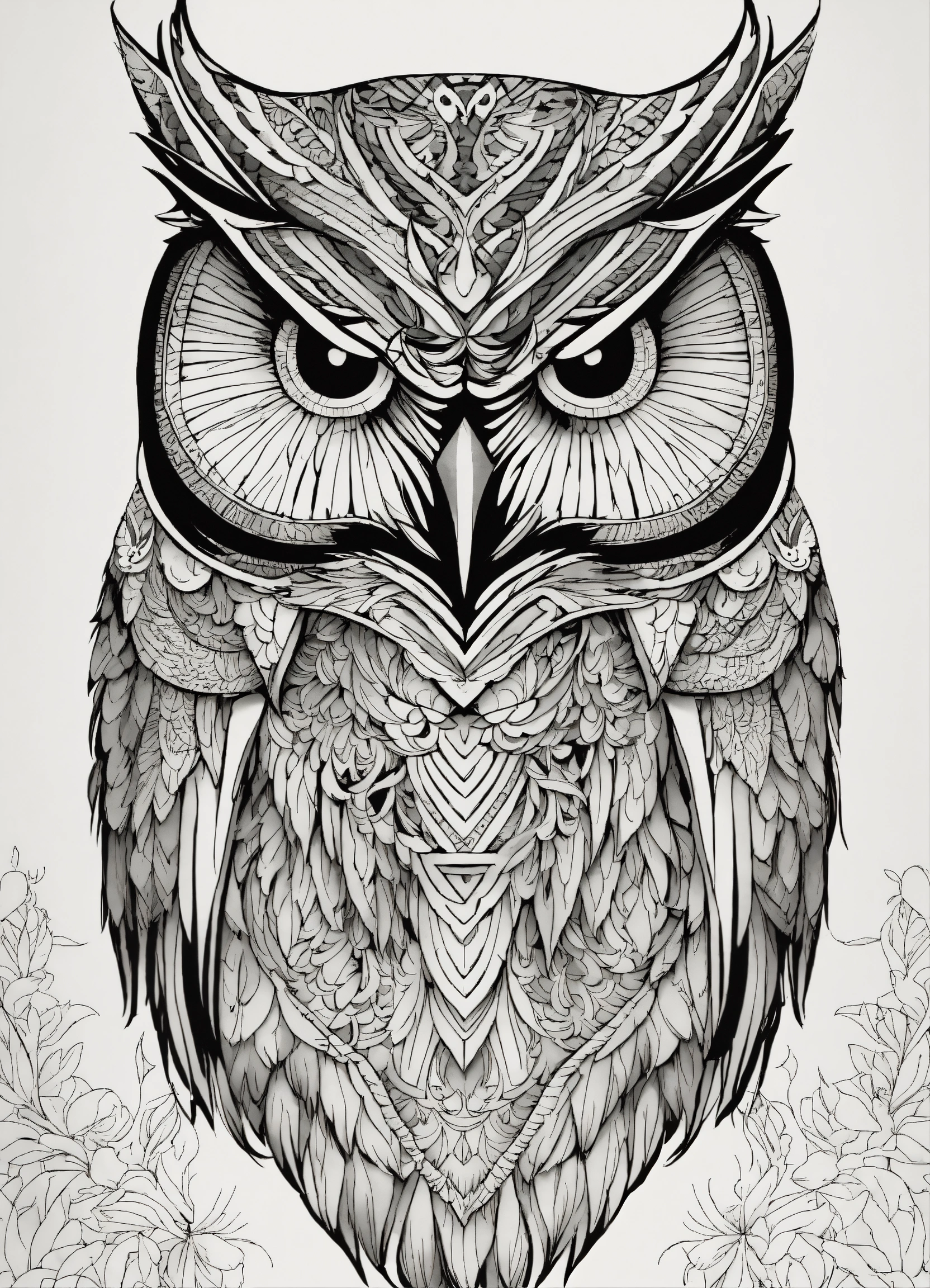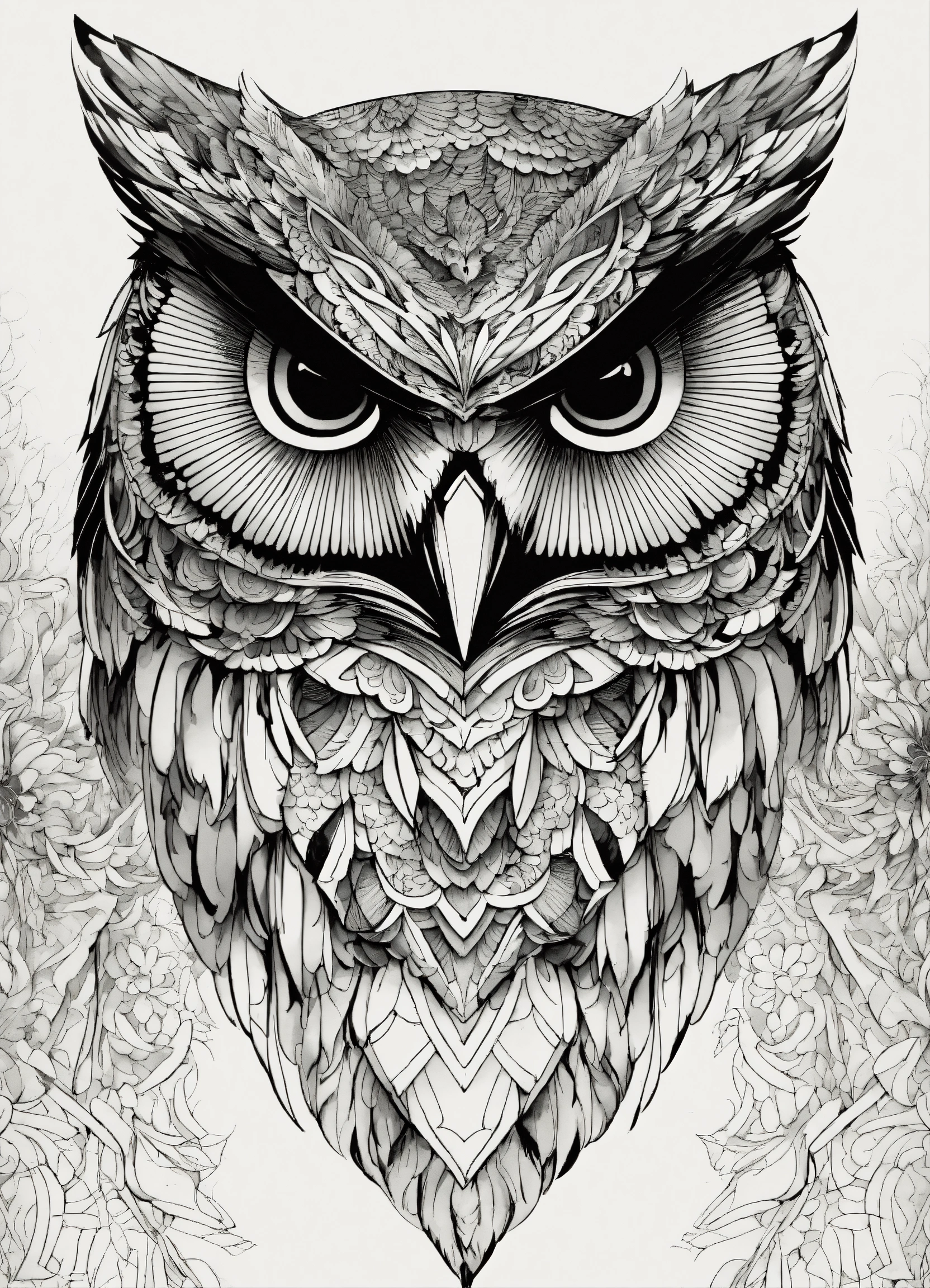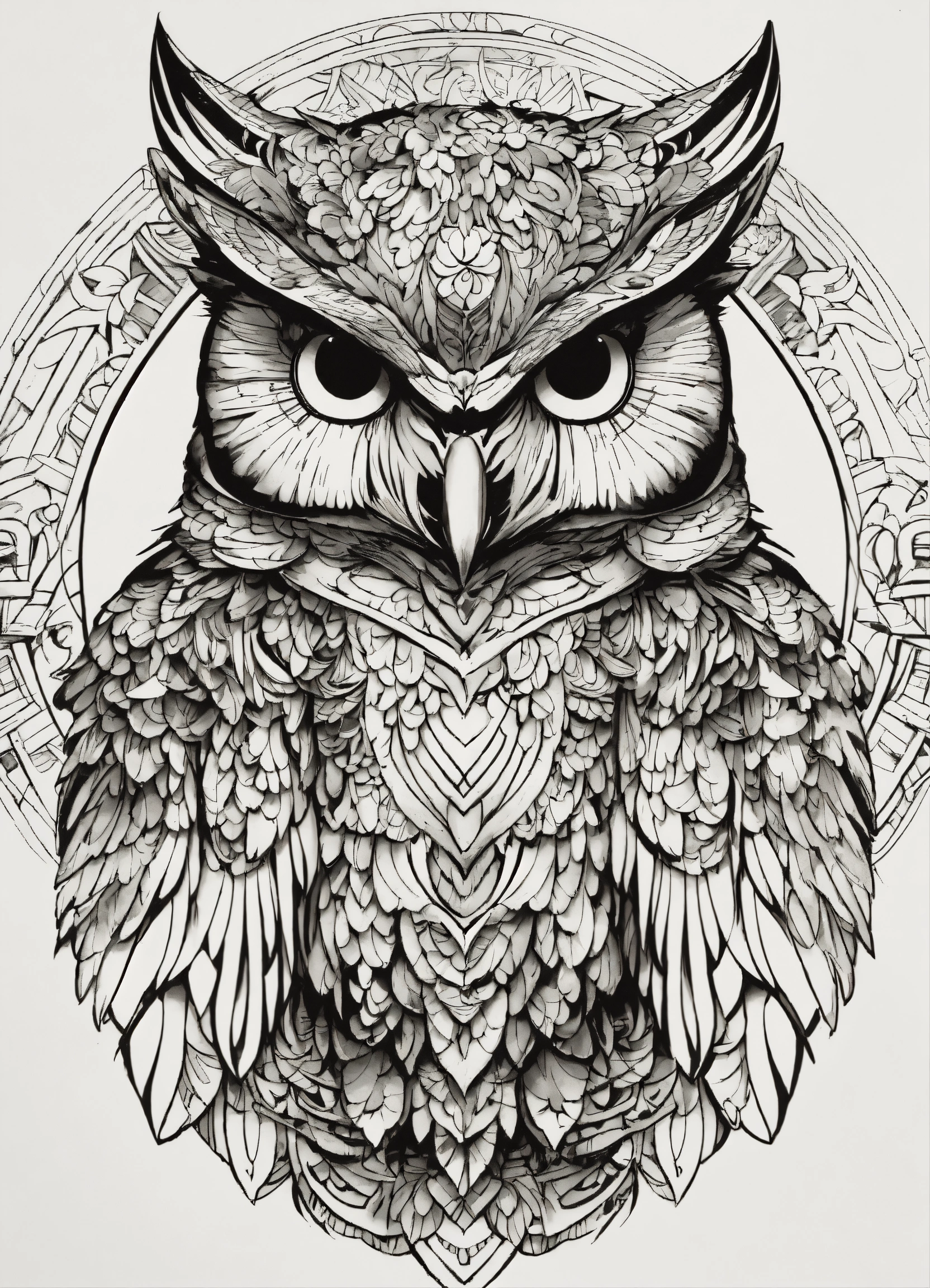 Symmetry, one owl head and only facing front, glare, black and white, white background, no background, ink fine line art stylized, vector, design for tattoo, african pattern mane, knight in horse, cape tribal owl, elaborate, profile, tattoo like, face towards, compas background, cloak with drawing owl