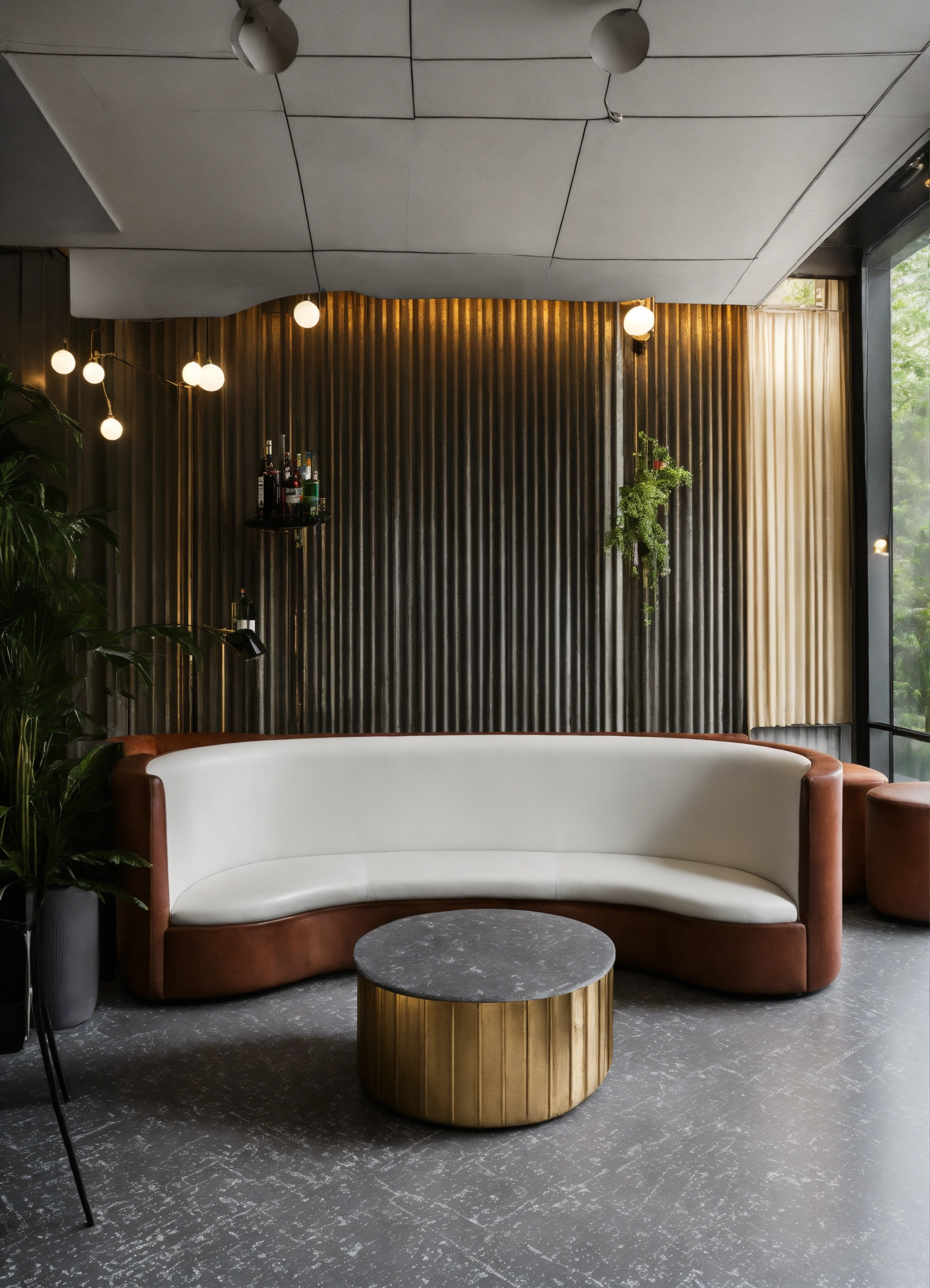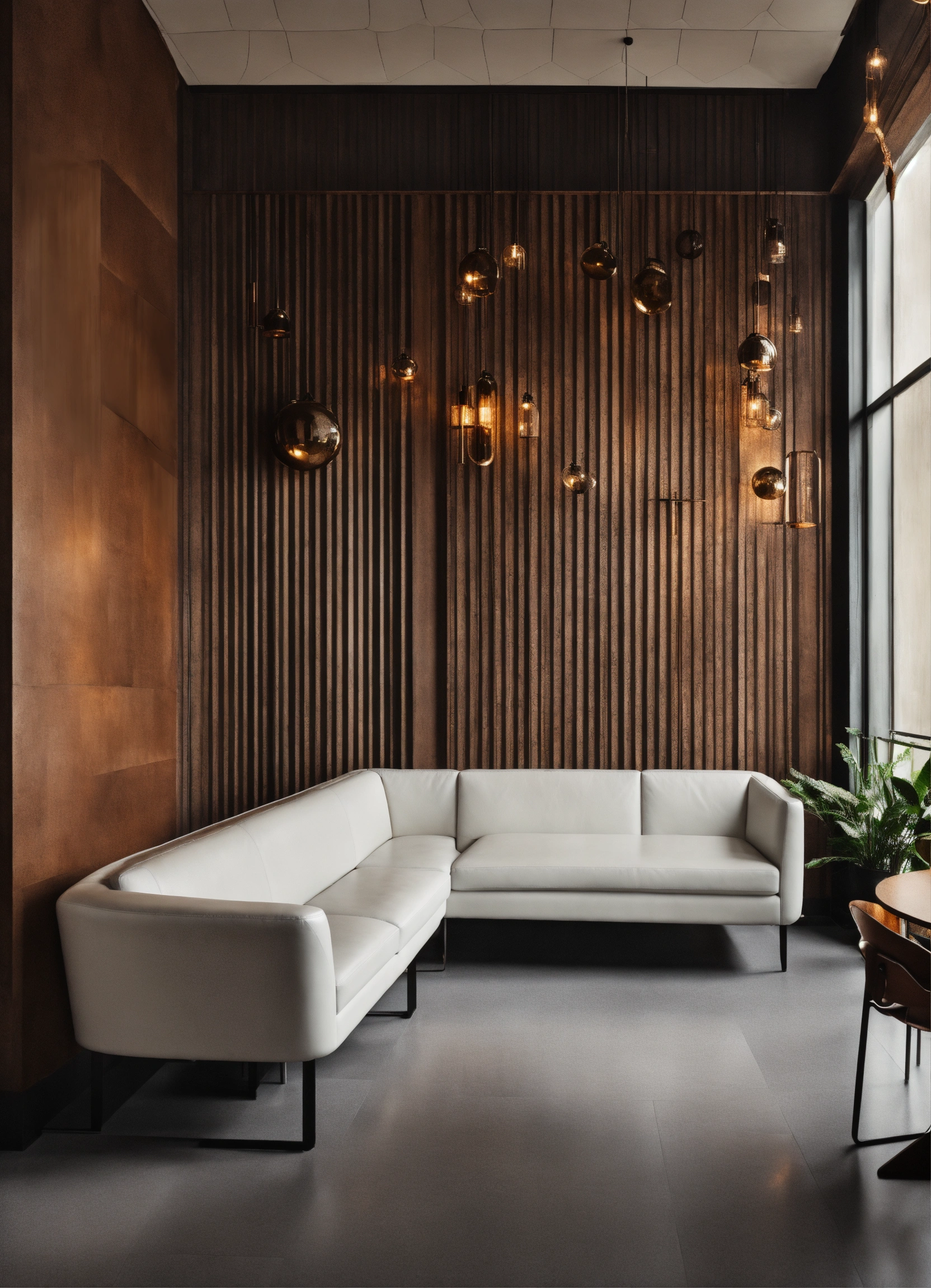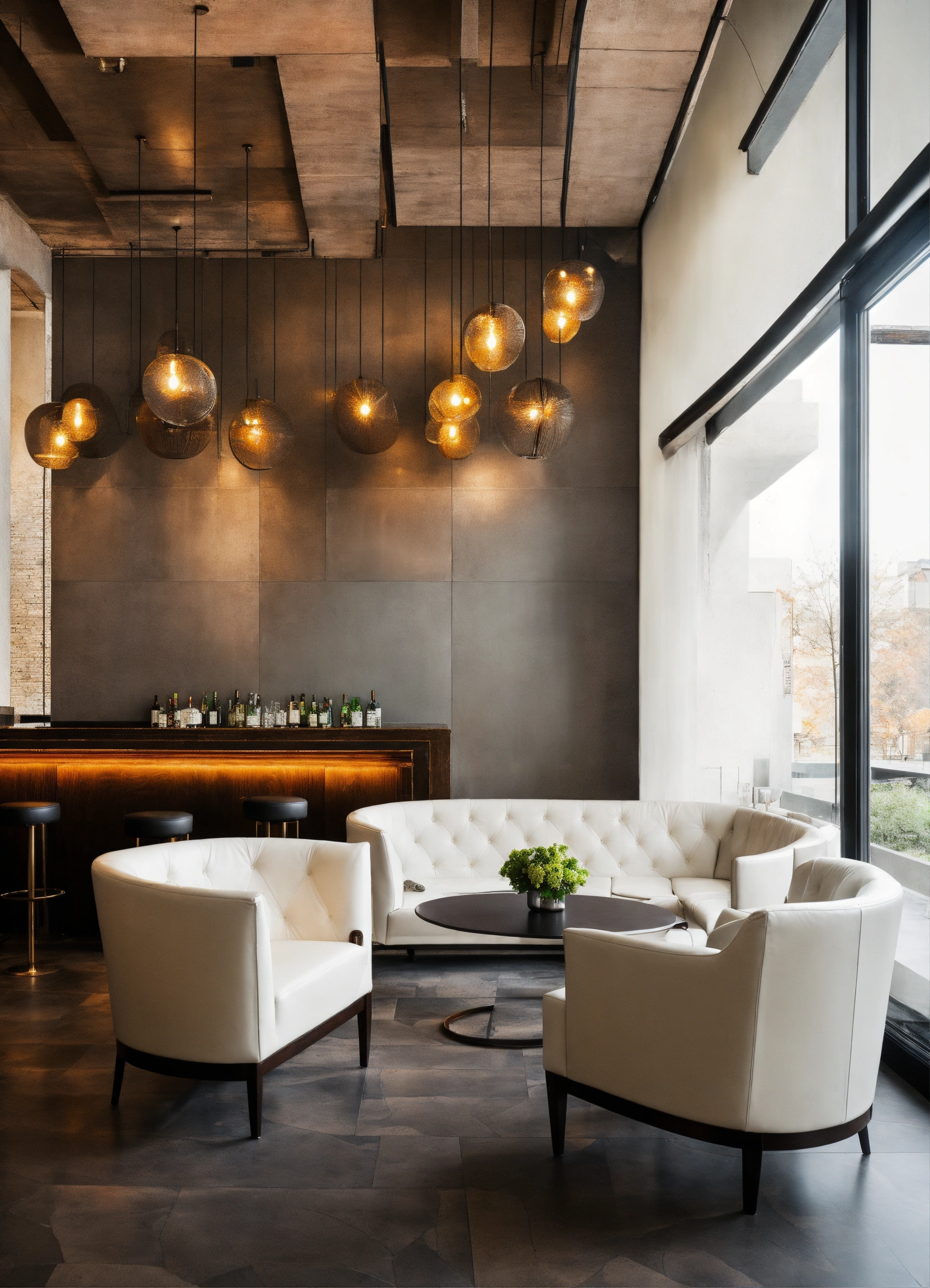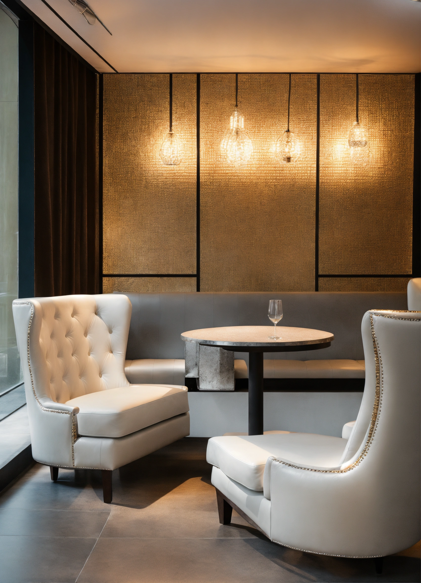Interior of the bar, seating area with white leather sofa and white armchair, gray floor, wall height and white