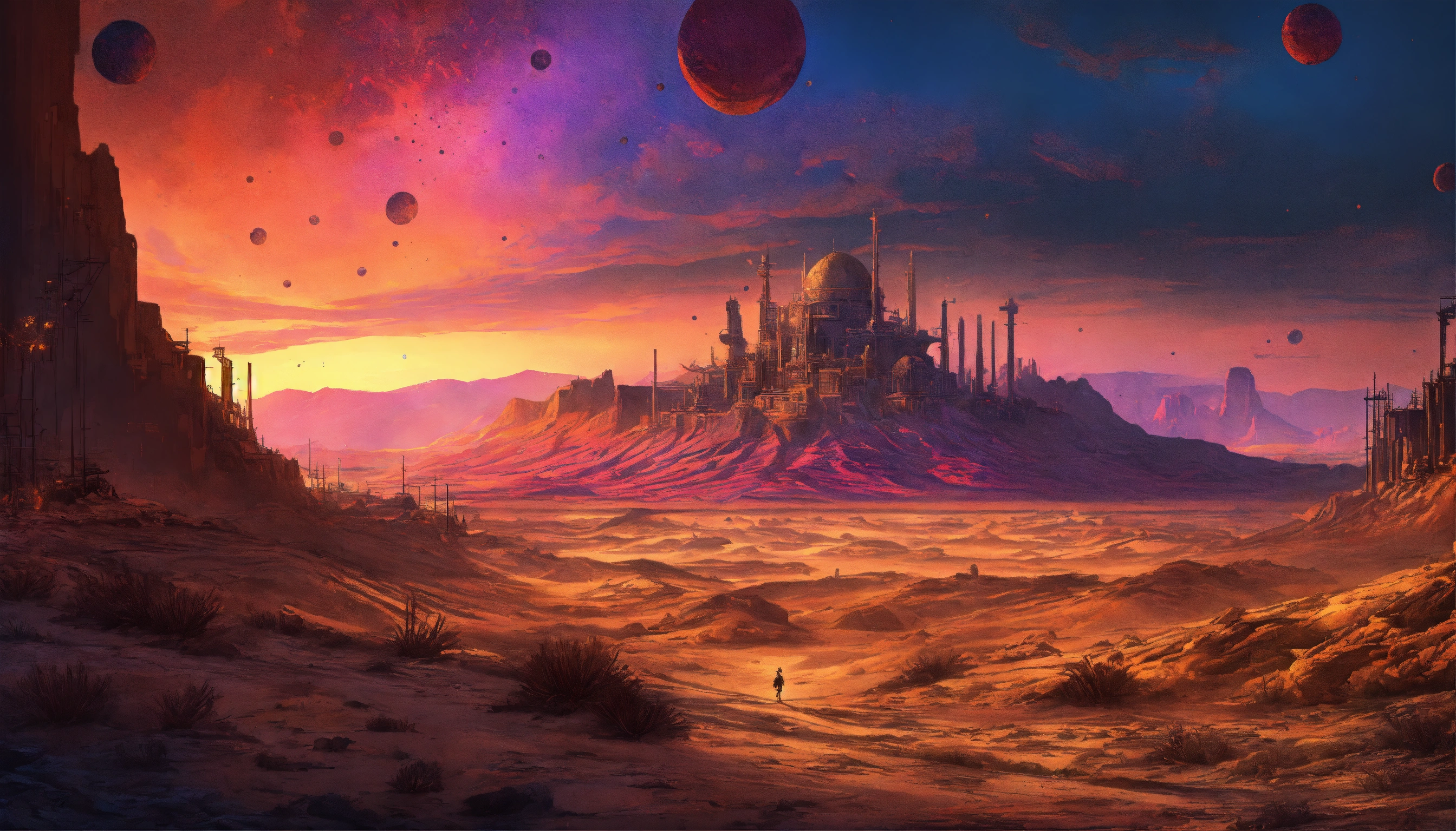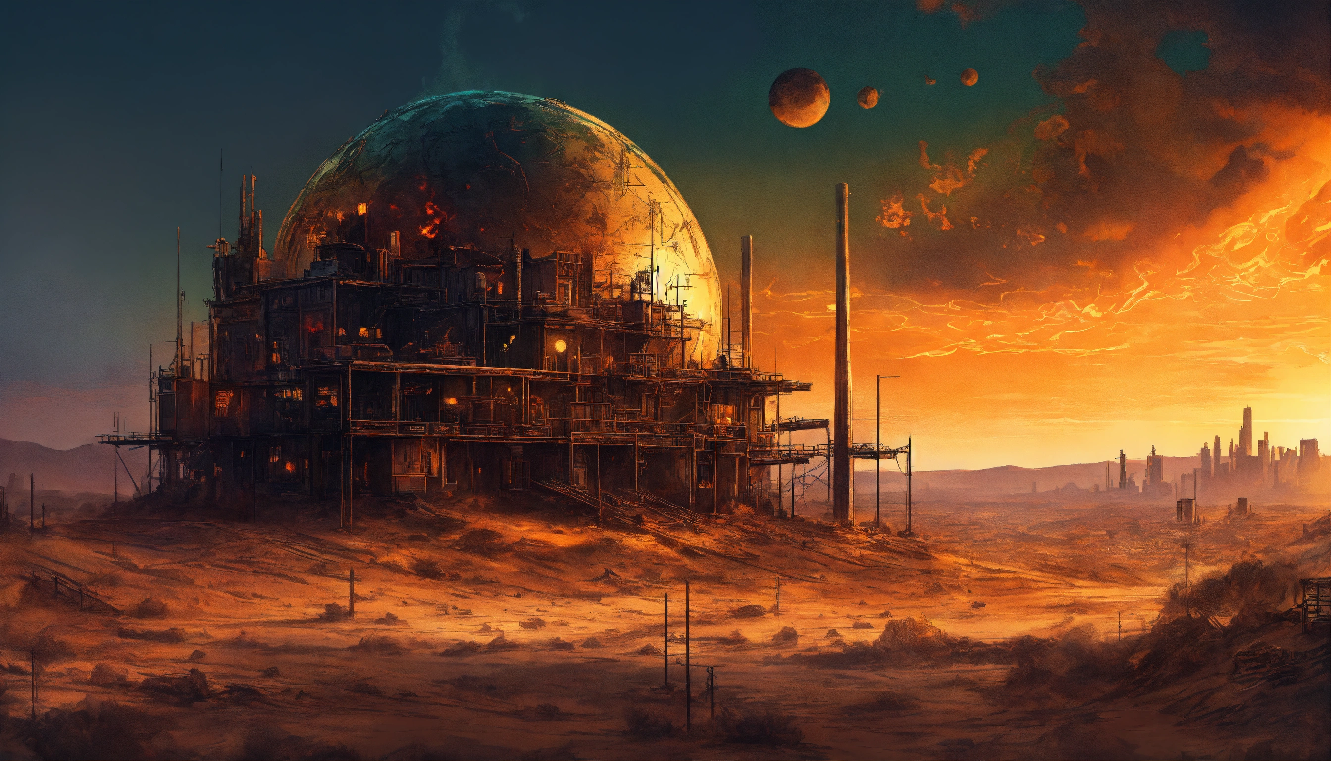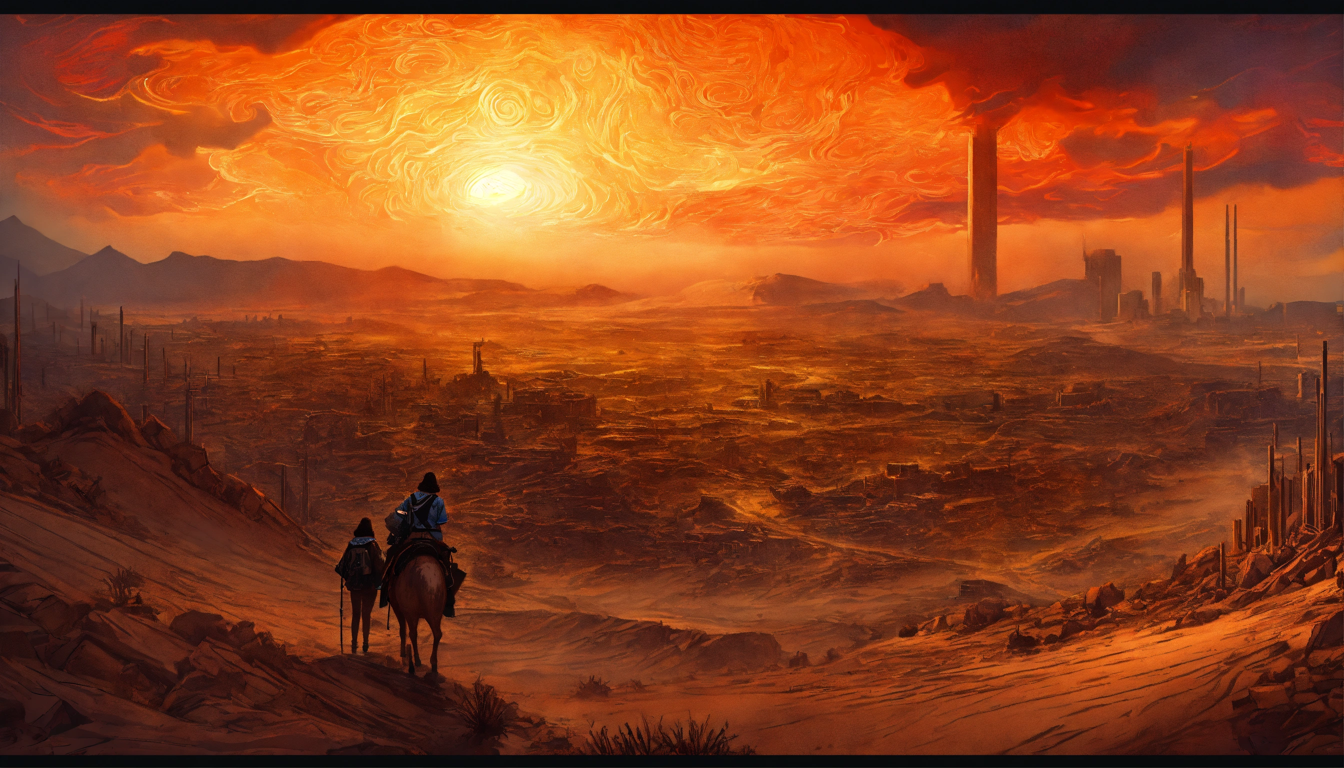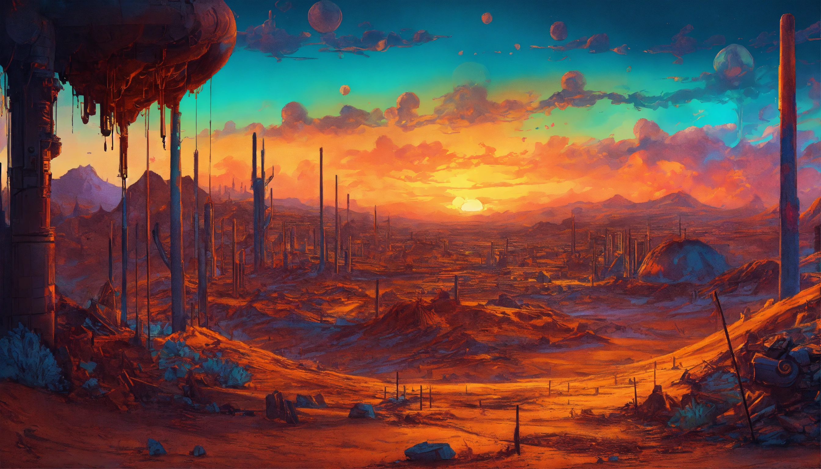 Desert city apocalyptic wasteland landscape at dusk. tee-shirt design, line art, black background, ultra detailed artistic, colour splash art, fire and ice, splatter, black ink, liquid melting, dreamy, glowing, glamour, glimmer, shadows, oil on canvas, brush strokes, smooth, ultra high definition, 8k, unreal engine 5, ultra sharp focus, intricate artwork masterpiece, ominous, golden ratio, highly detailed, vibrant, ultra high quality