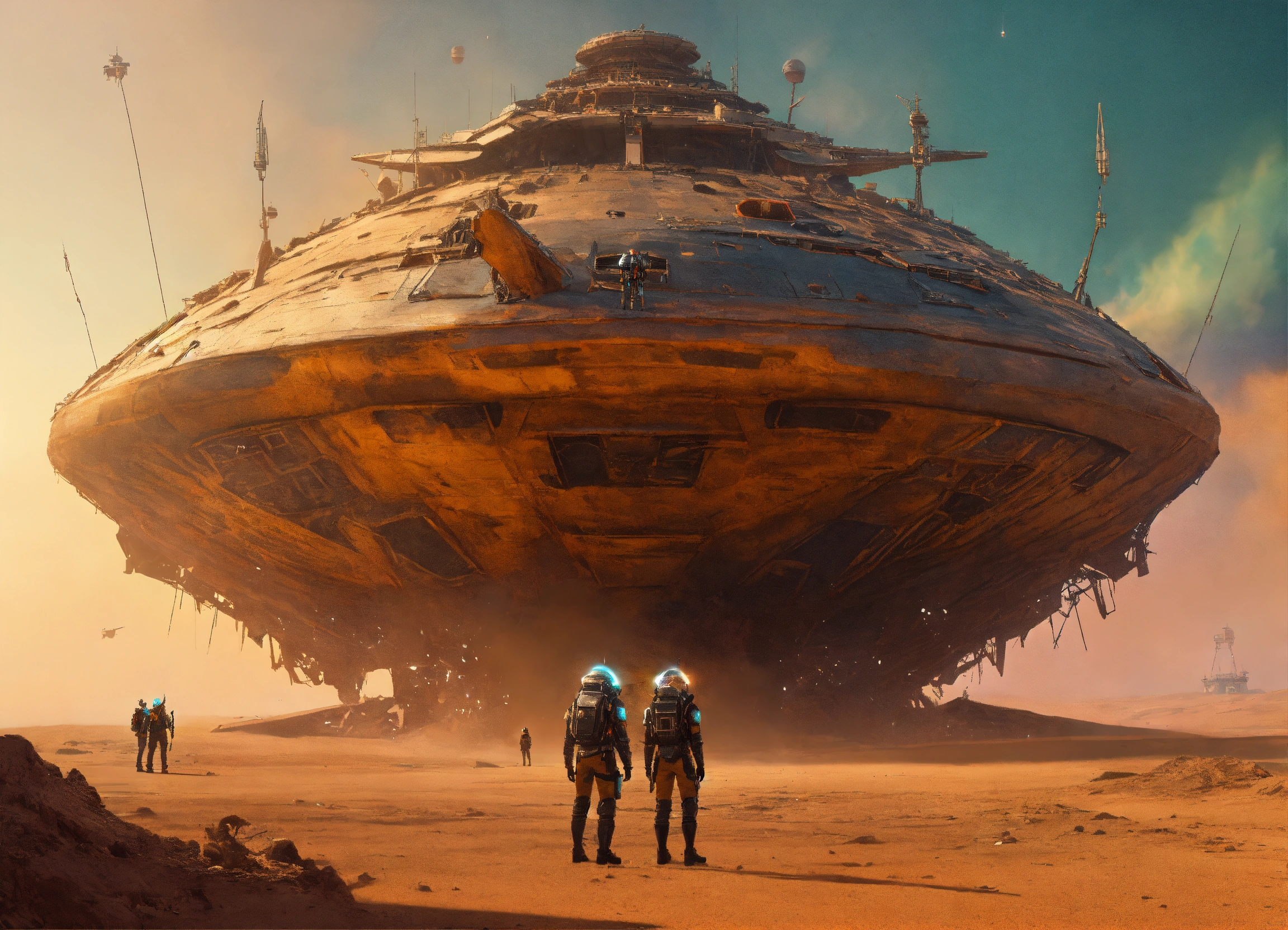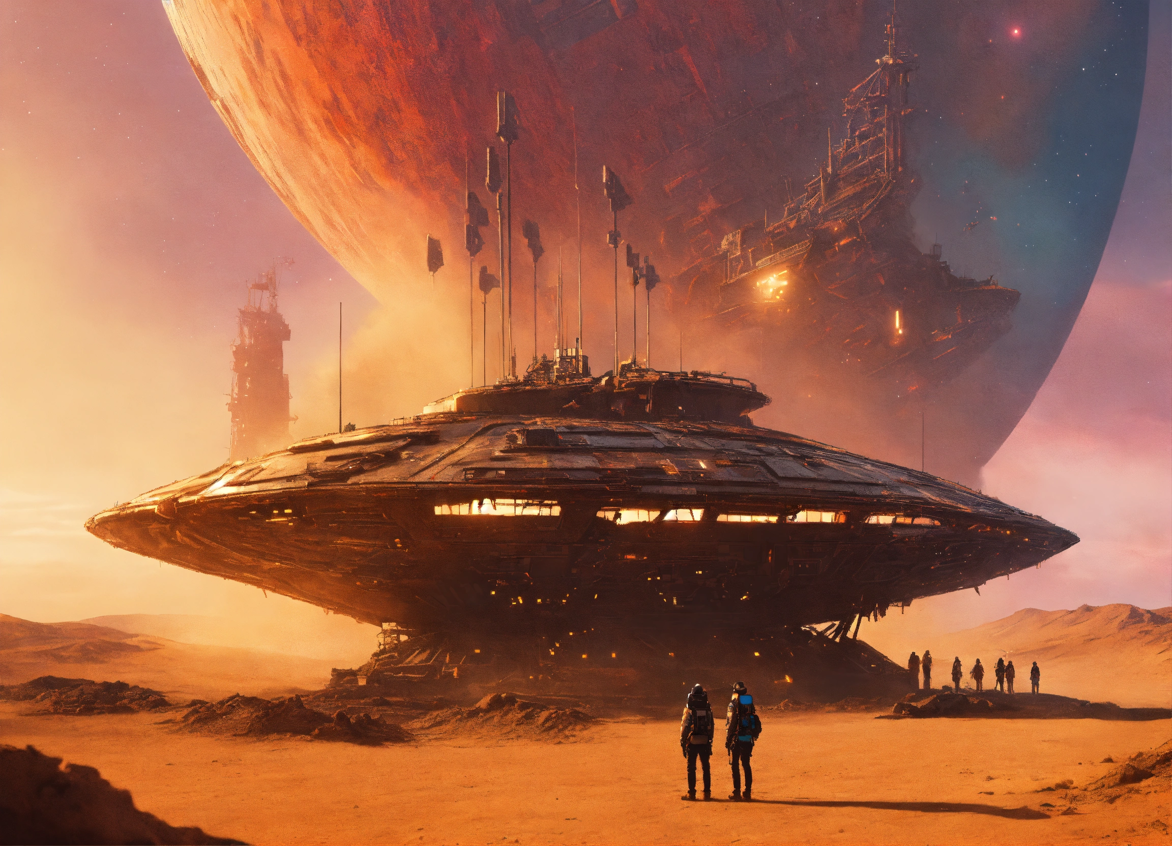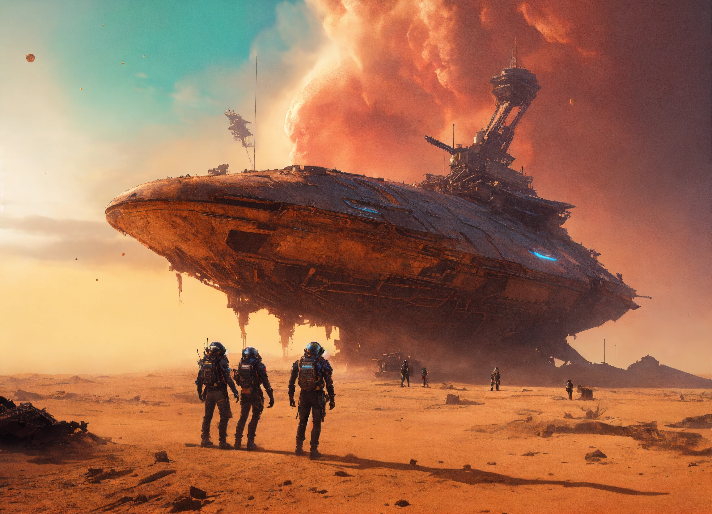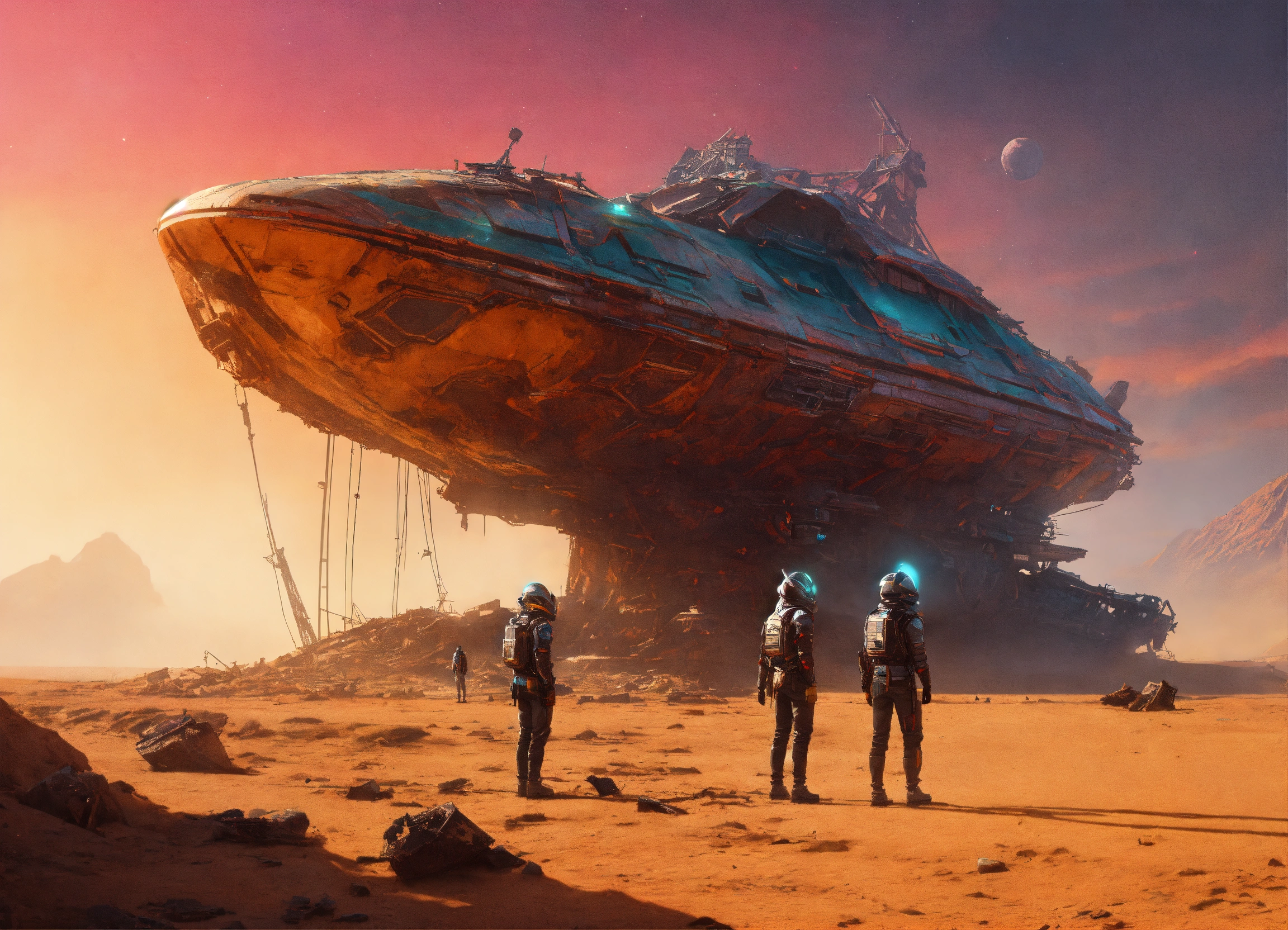 Zoom out of a 3 people standing outside a wrecked star ship wearing detailed alien ear antennas with futuristic clothing, sandstorm, colorful sky, futuristic, sci-fi, realistic, 8k