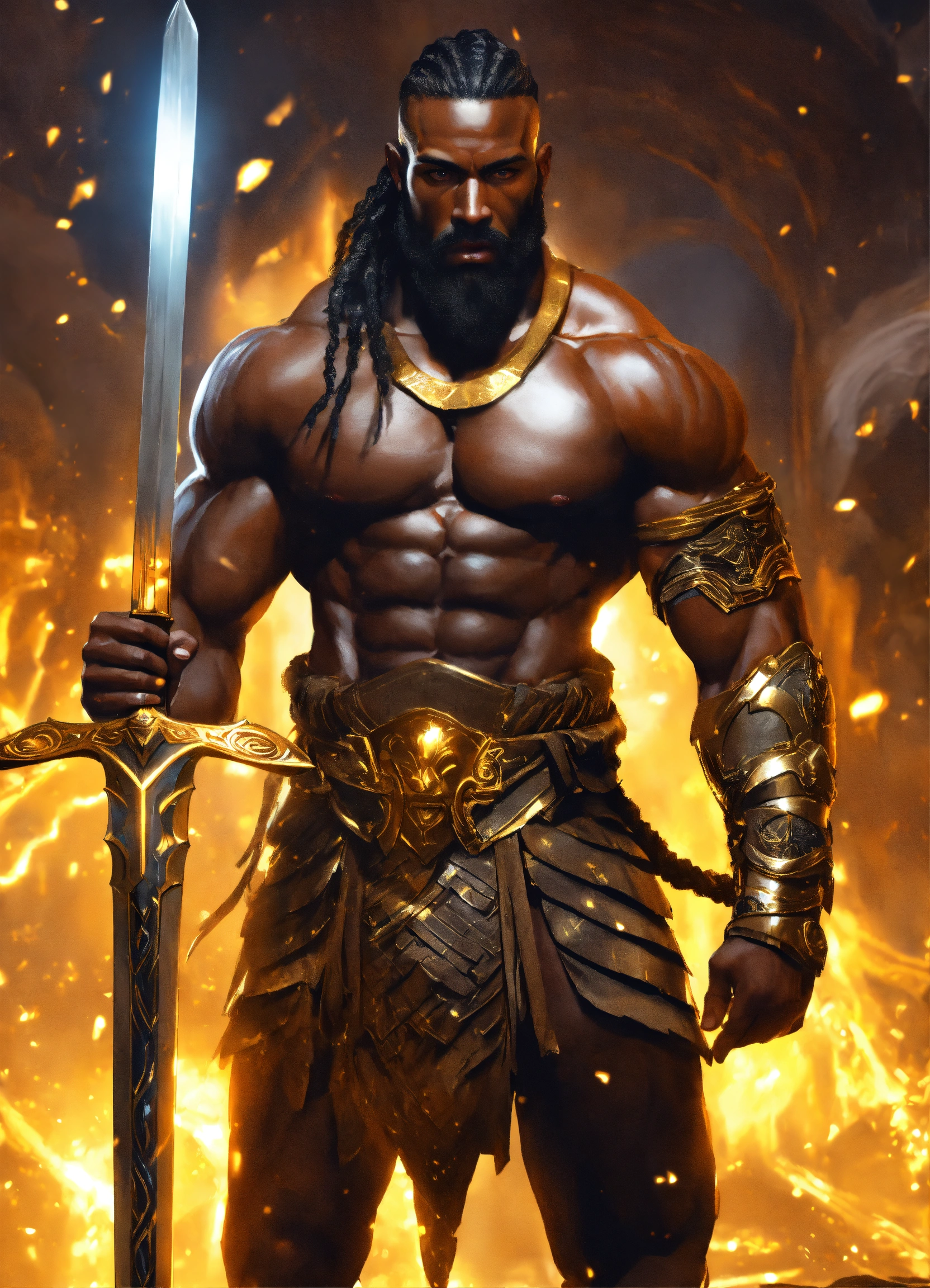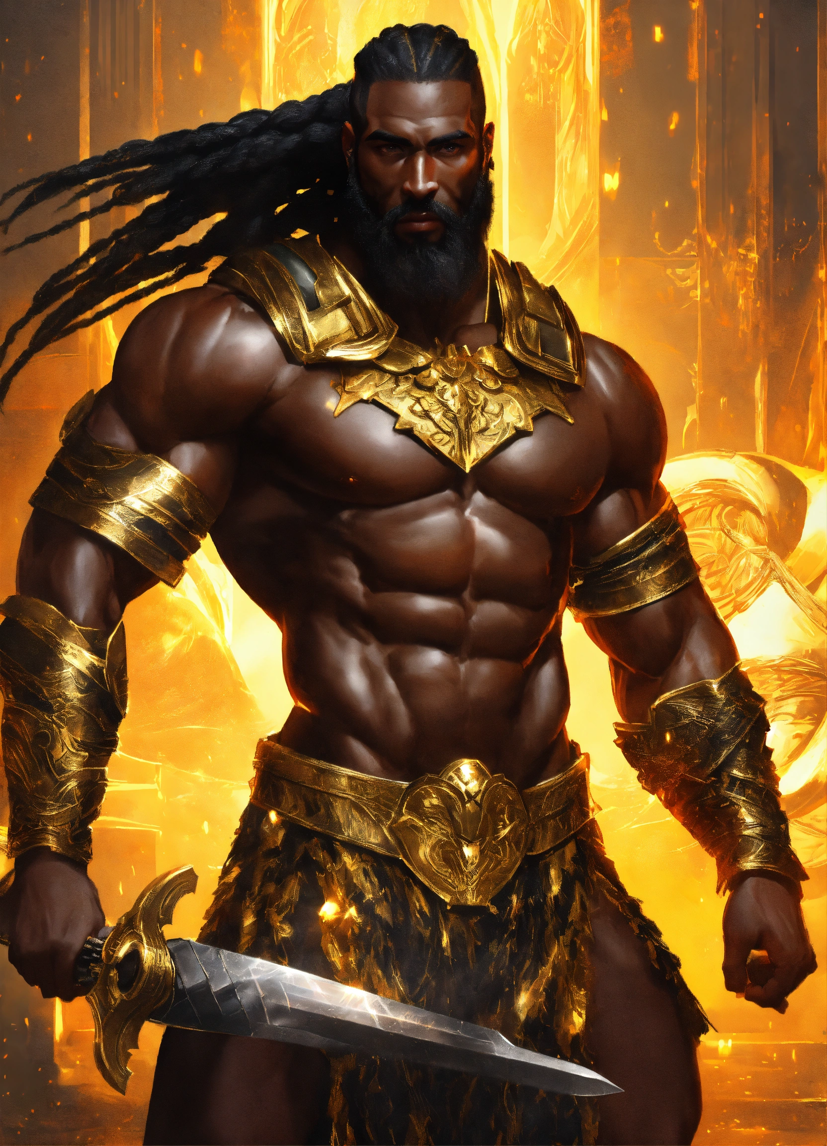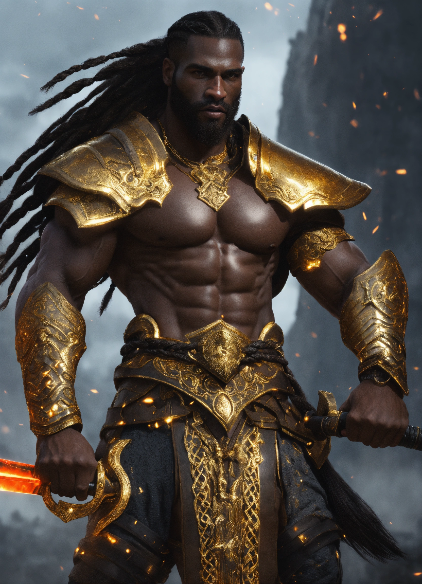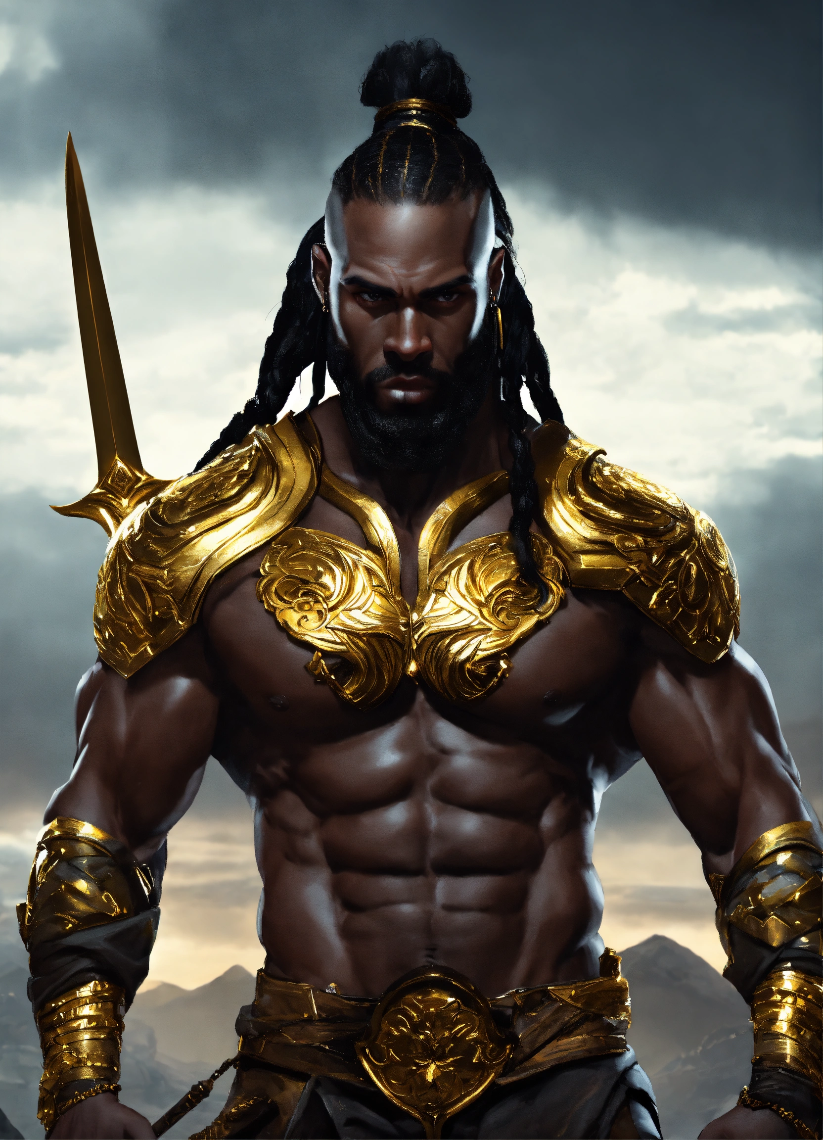 Huge handsome black god of war with sword, handsome, braided hair, huge, muscular dark skinned futuristic fantasy warrior man with gold and black armor, manly man, long braided hair, hyper realistic