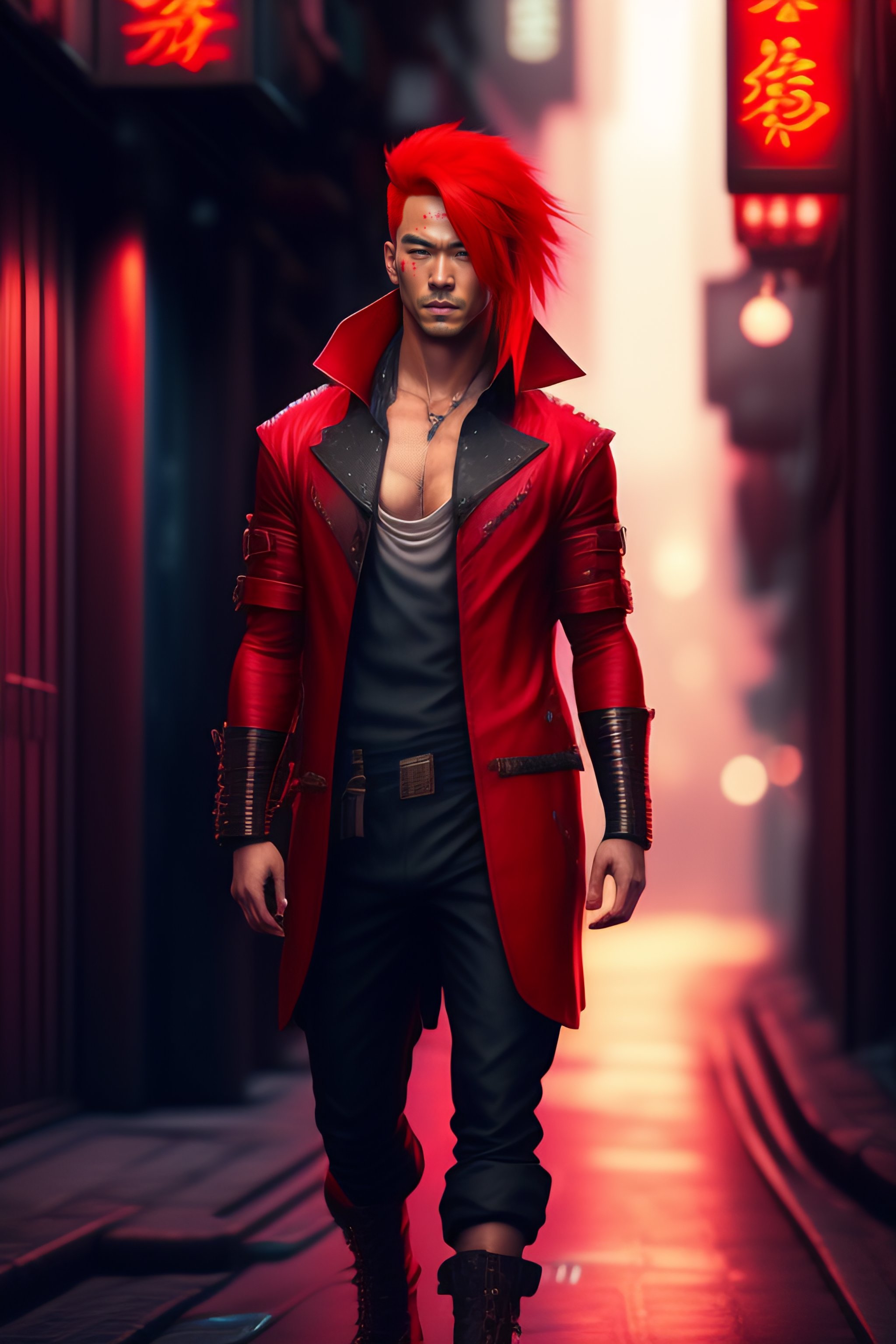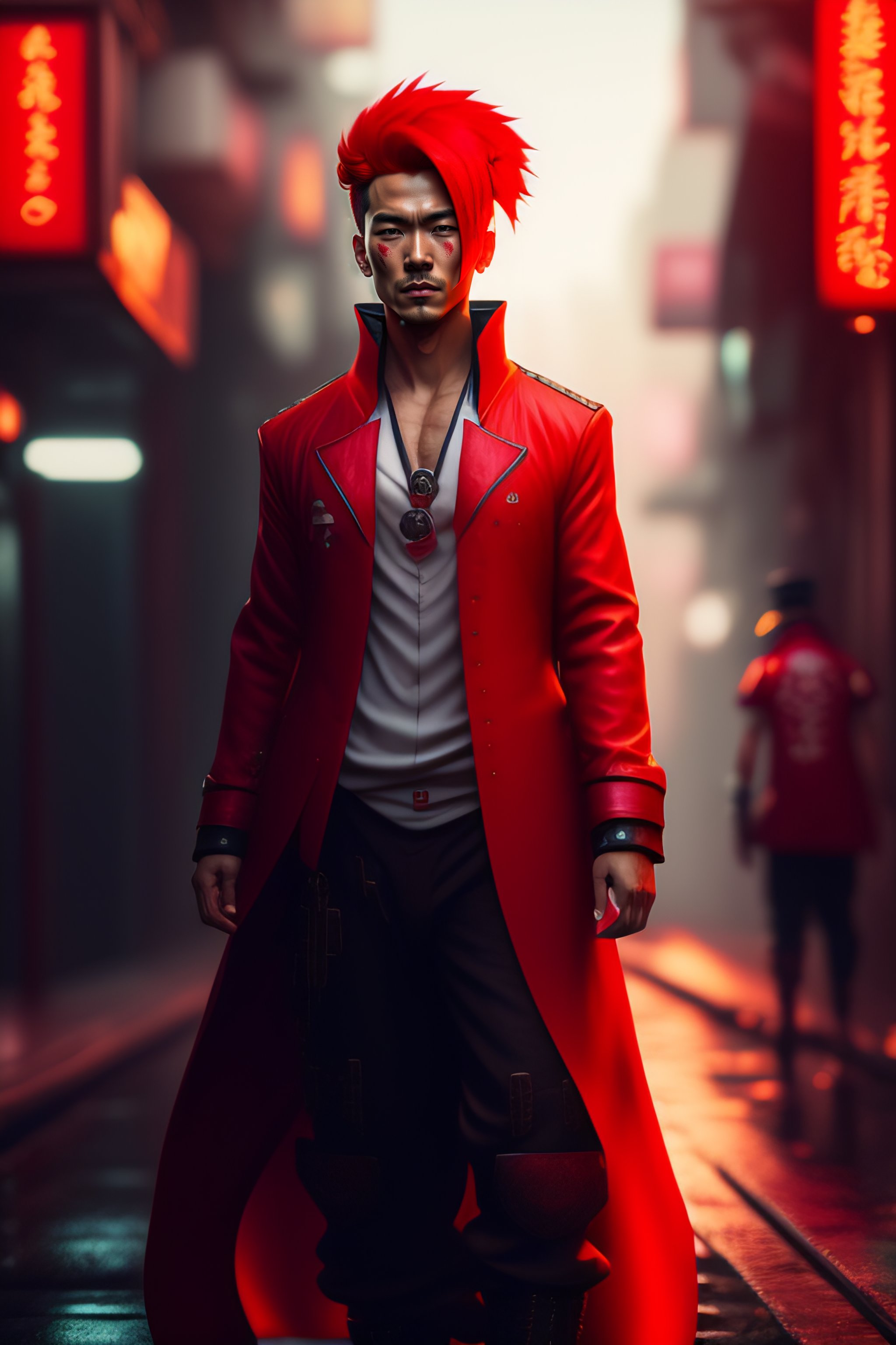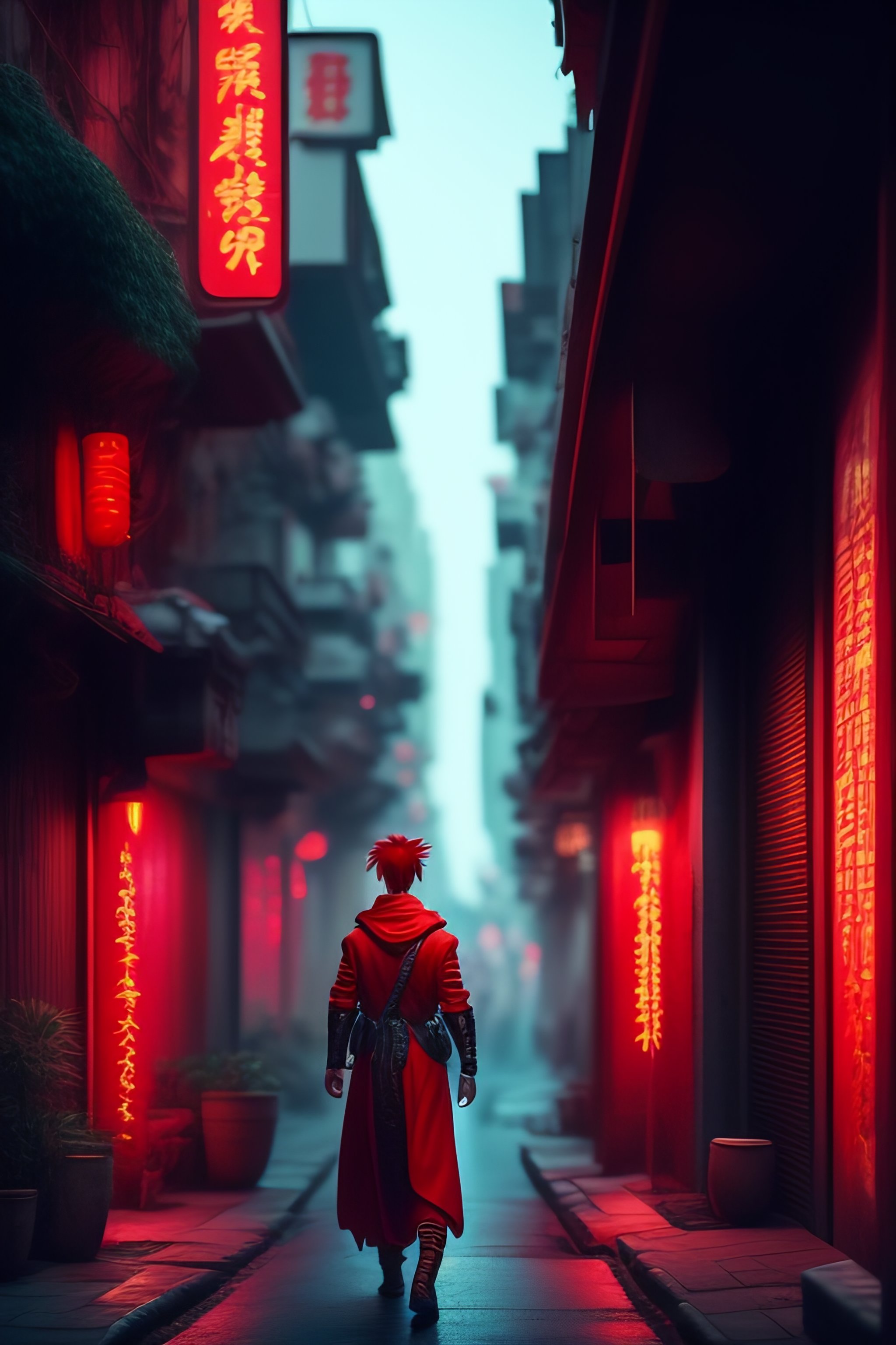 Guy with red hair and side ponytail, with one medical eye patch, in red long cloth, in a dark narrow street, kowloon walled city, anime style, 8k, hd, cyberpunk